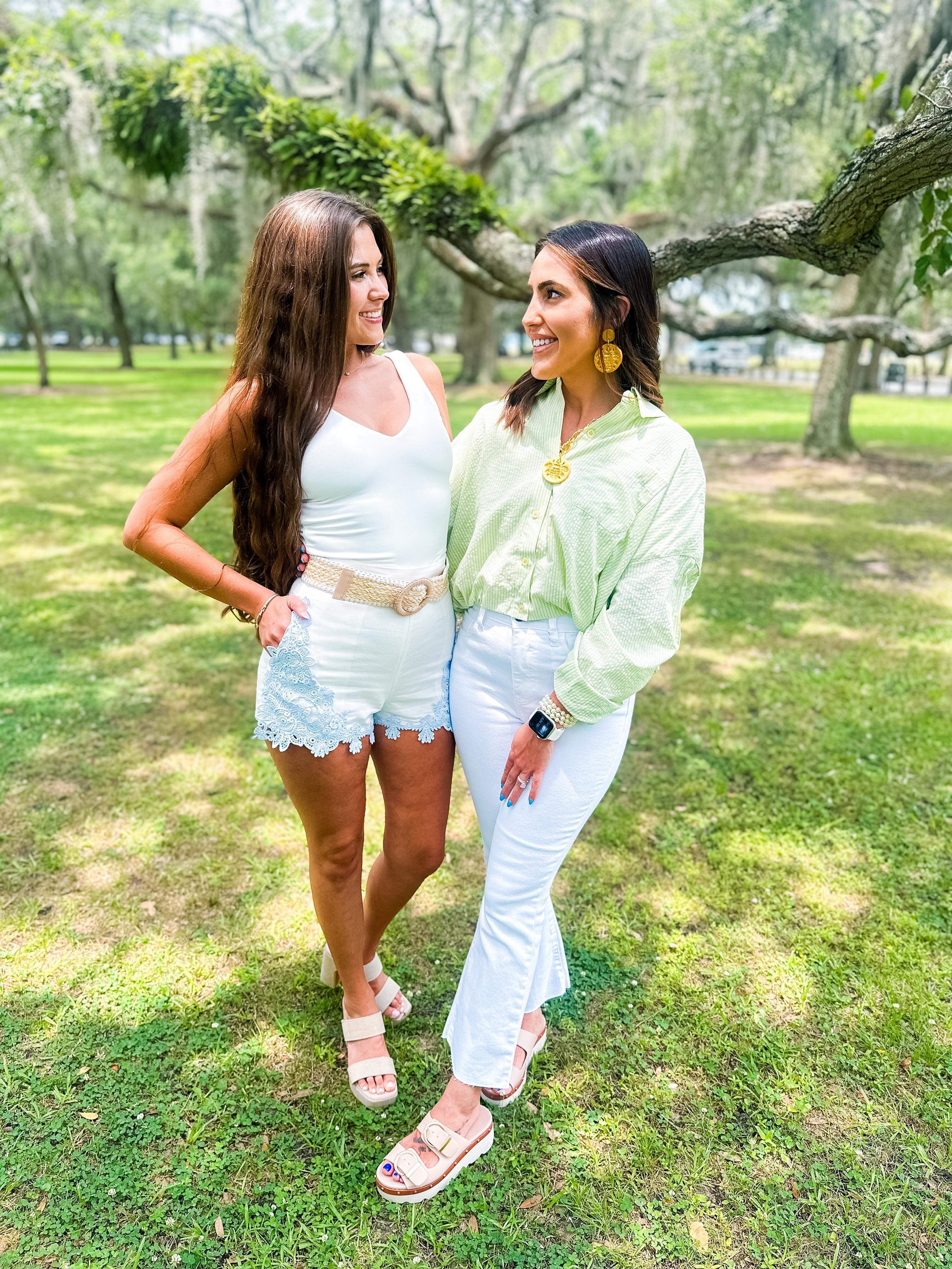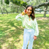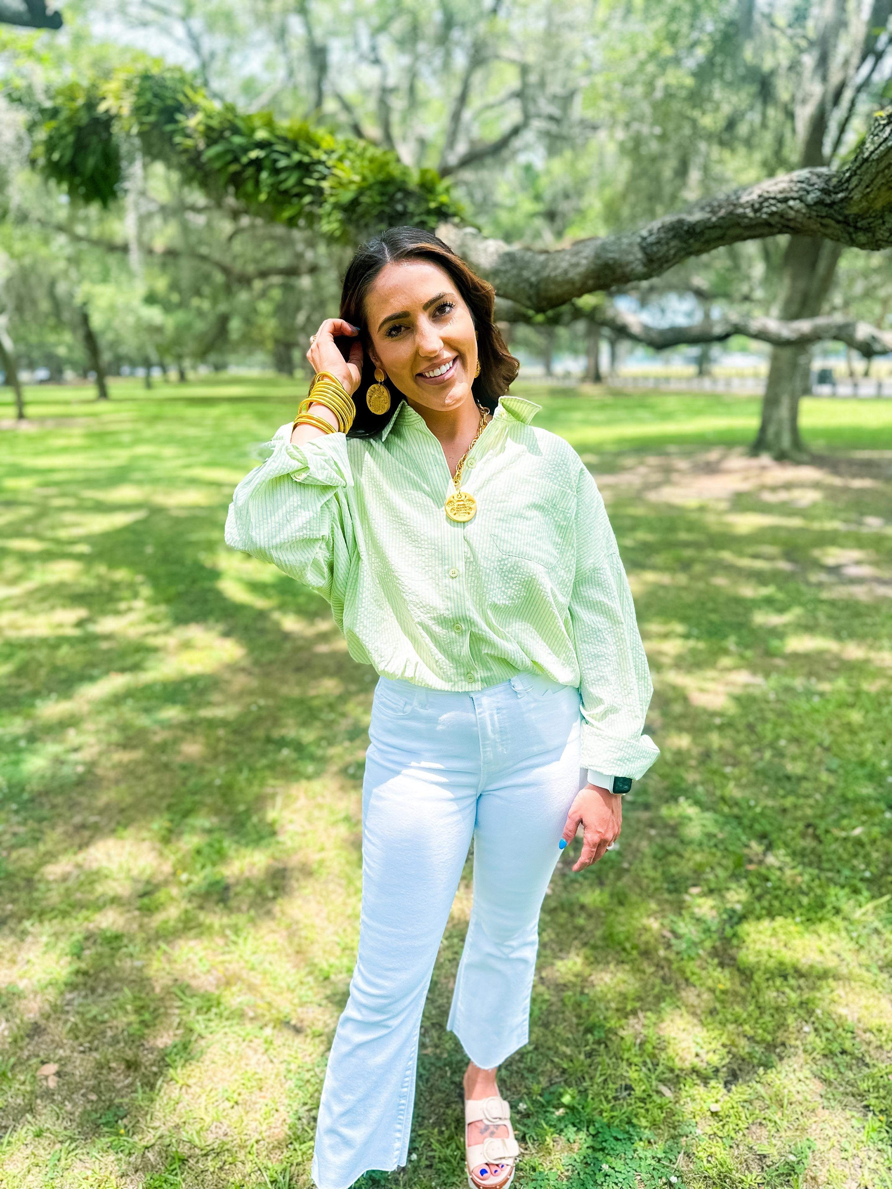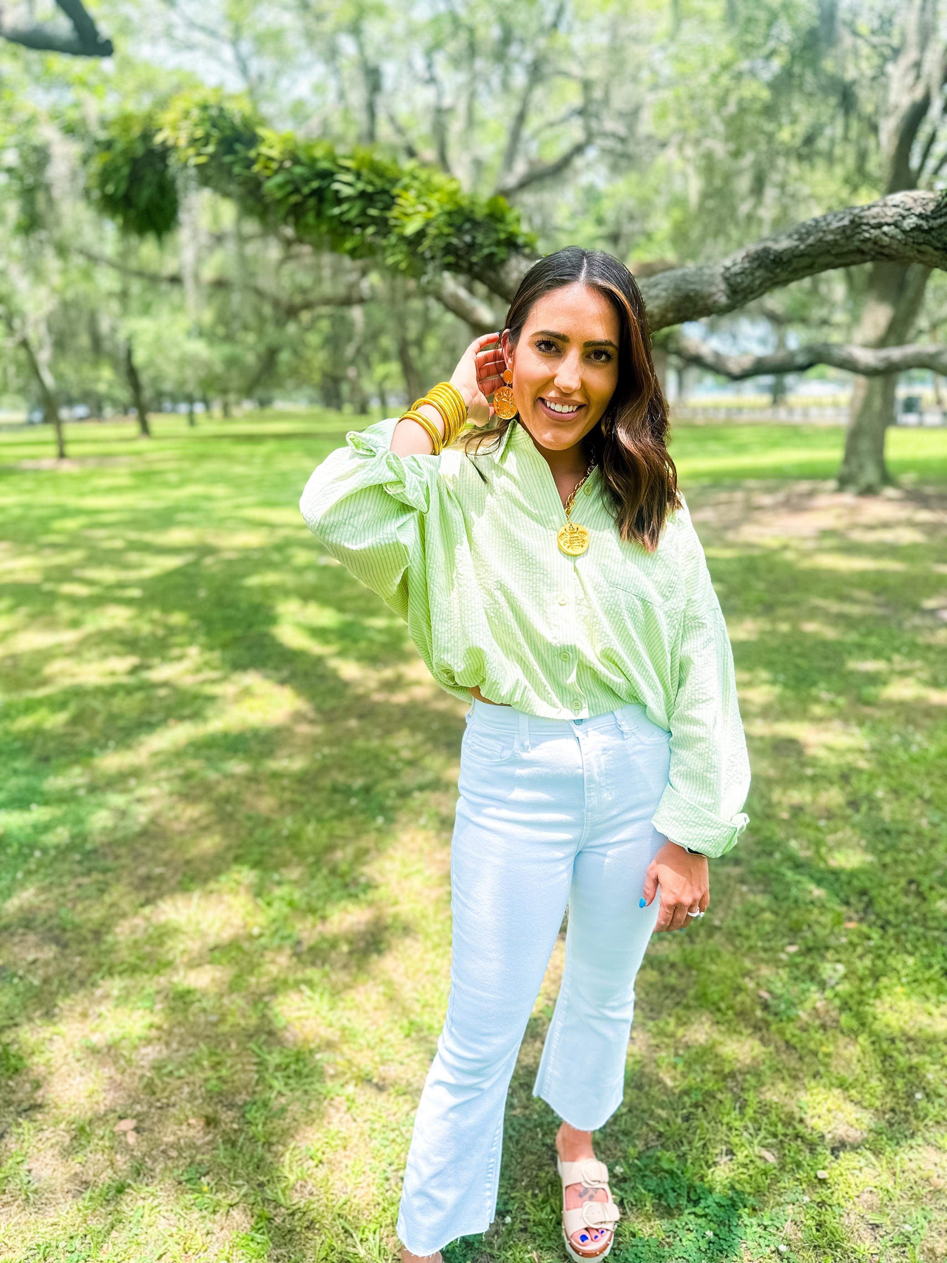Seersucker Stripe Pocket Bubble Button Up Top- Green