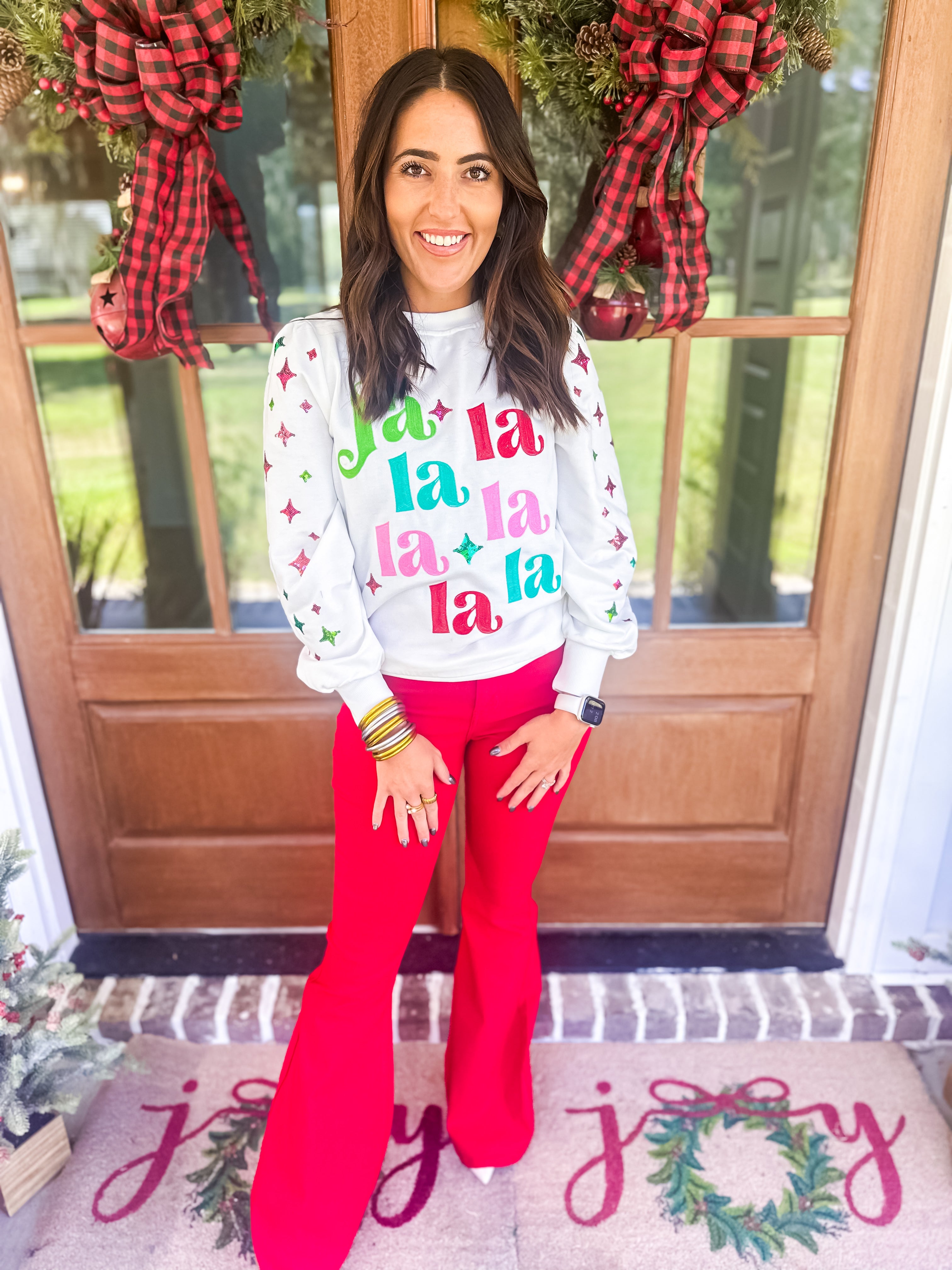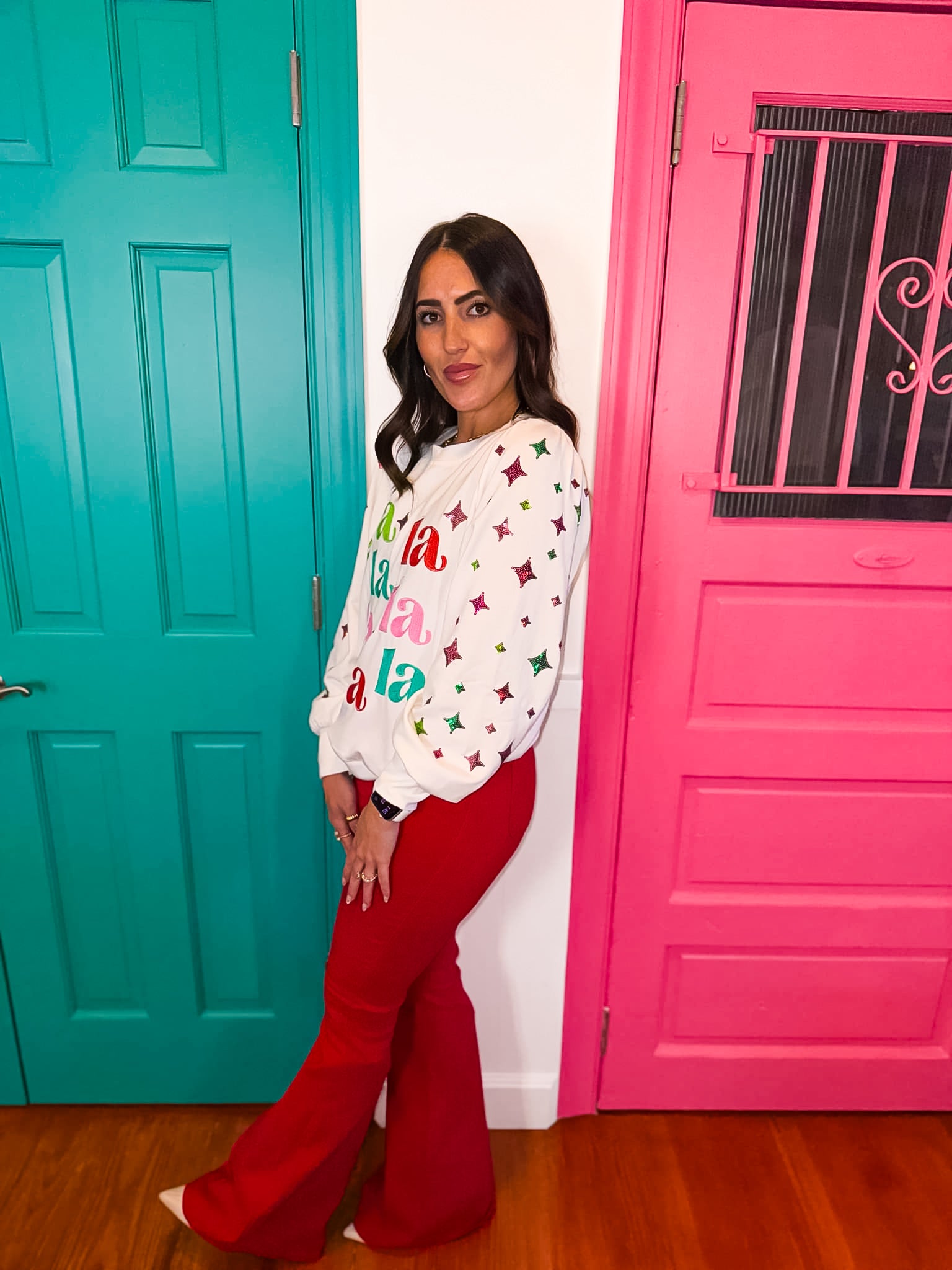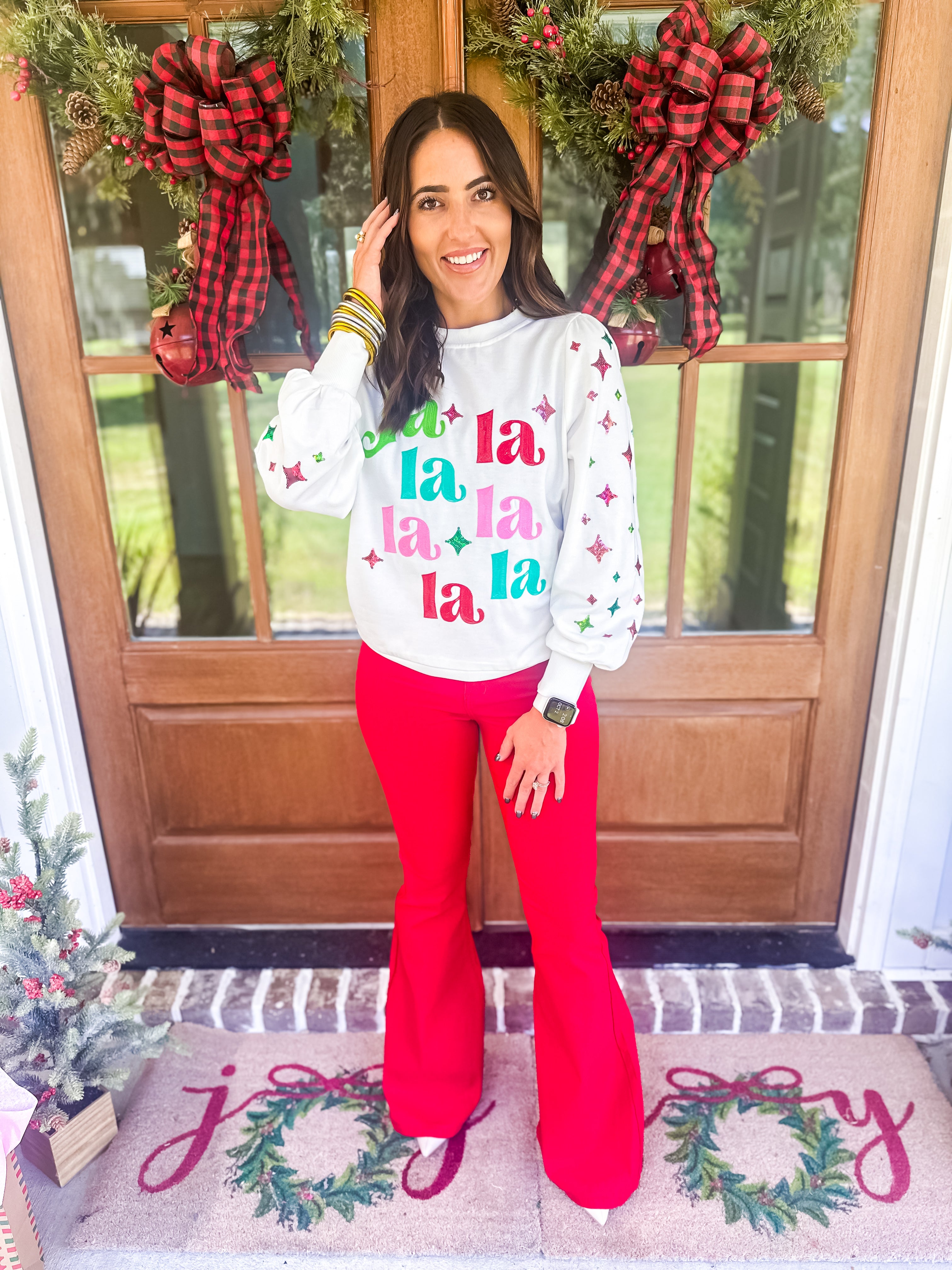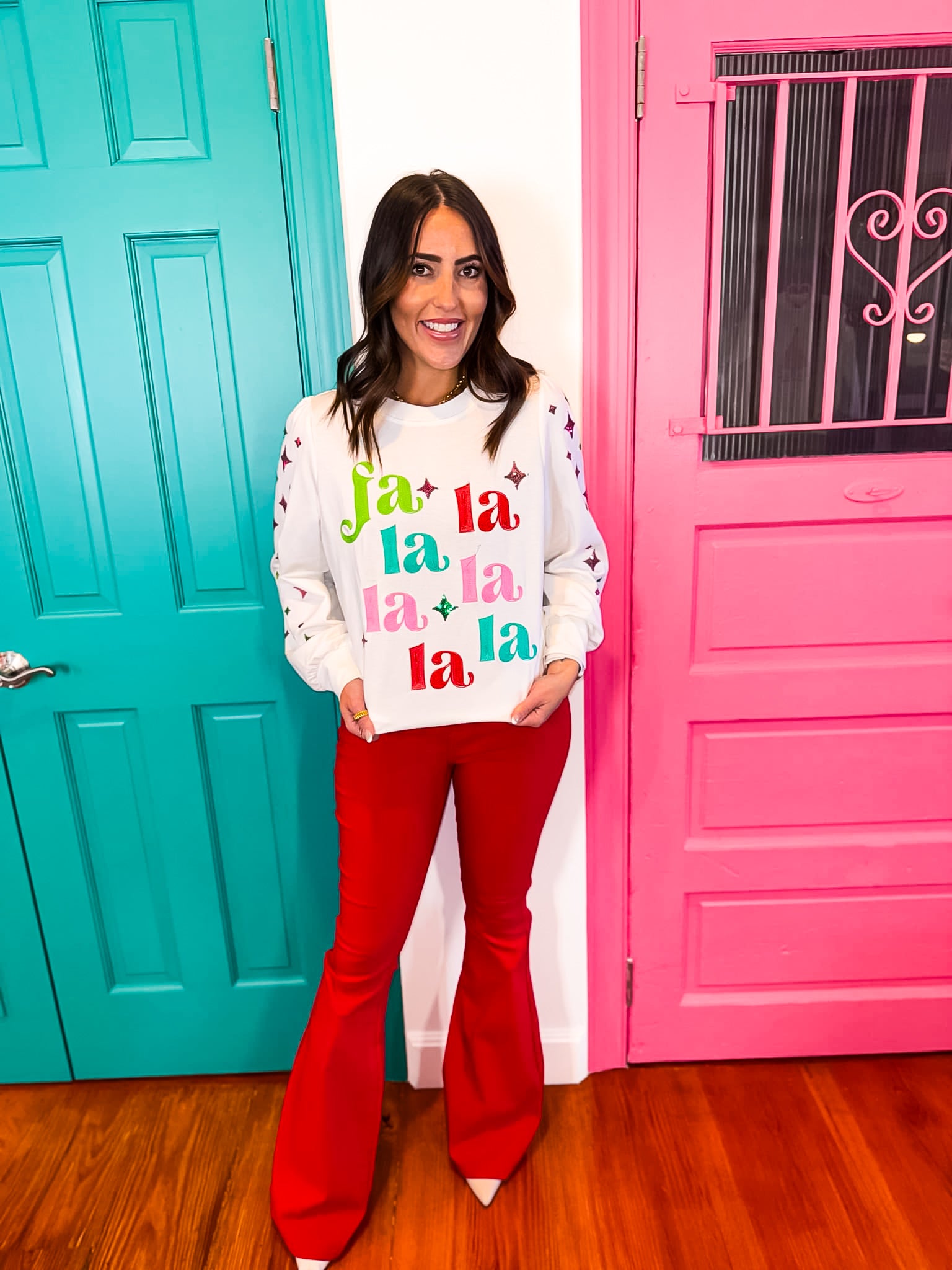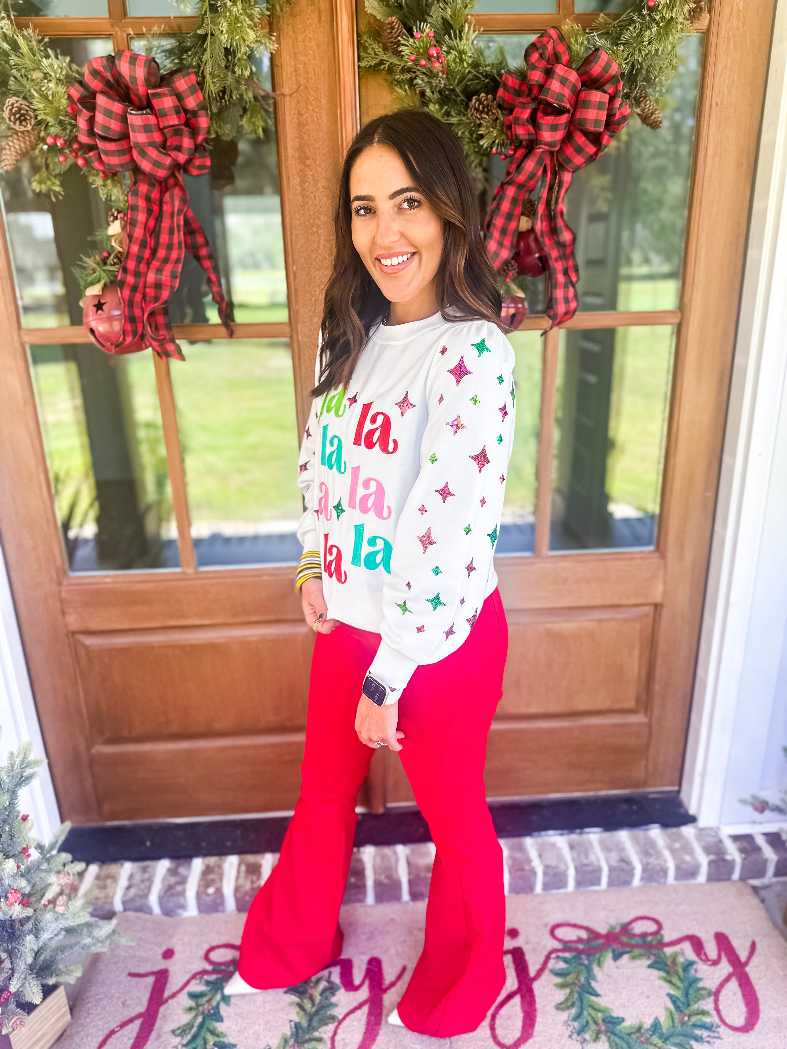 Introducing our Shelby Sweatshirt by Mary Square. Y'all - this is the softest sweatshirt around. Let's talk about how festive it is too. It is a white base sweatshirt with green red and pink stars through out with Fa La La written in the center. It features a round neckline and it is a true length sweatshirt. It is lightweight and beyond cute and comfy. You will want to wear her throughout the Holiday Season and to any and all of your events coming back.