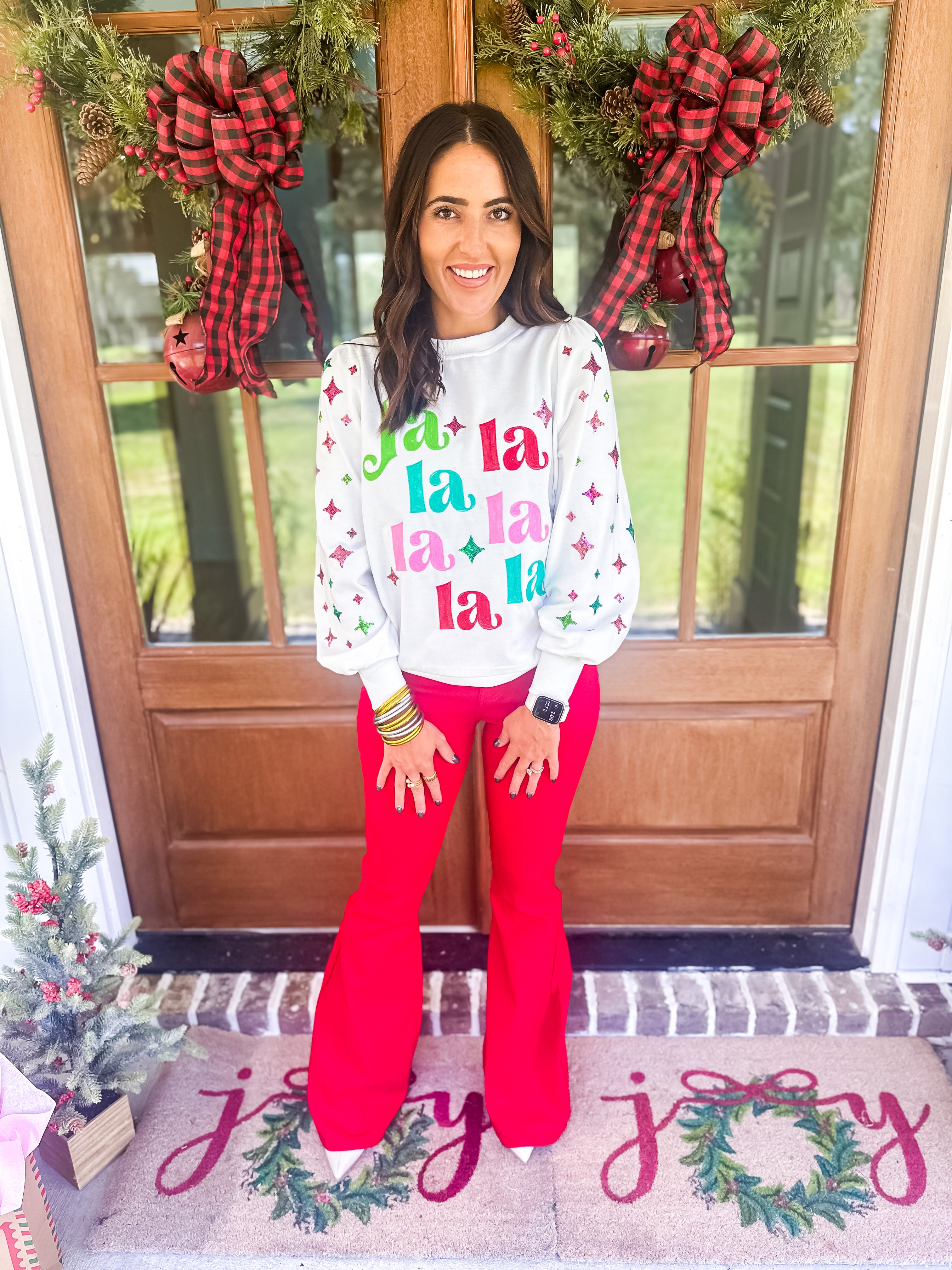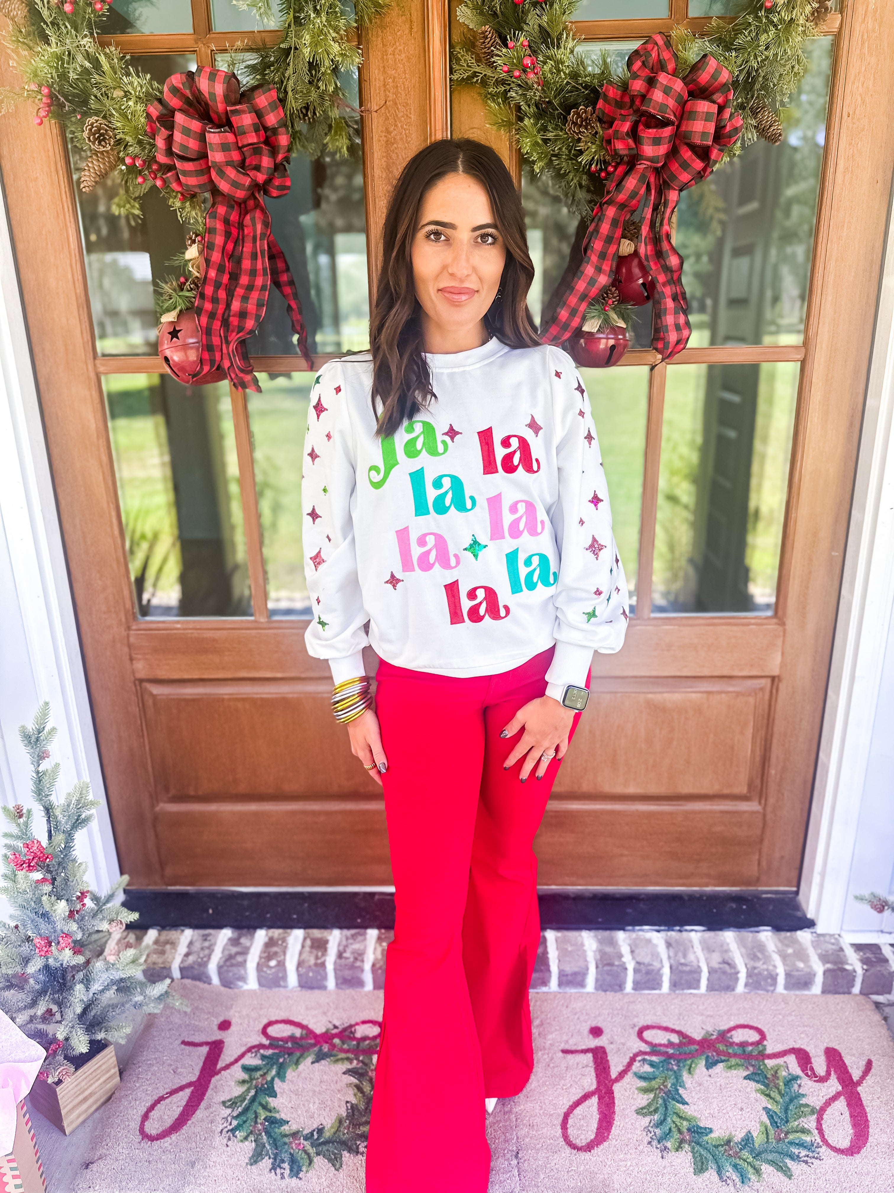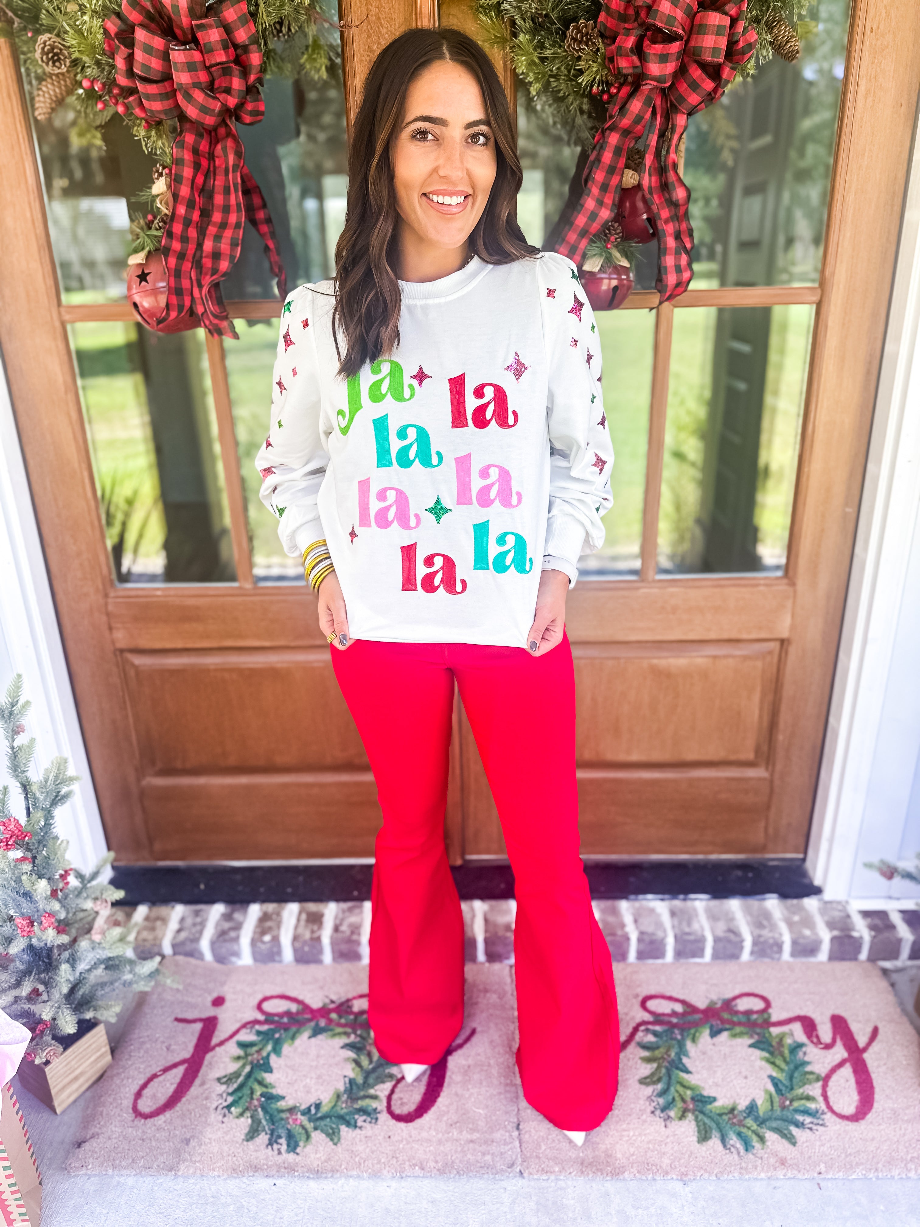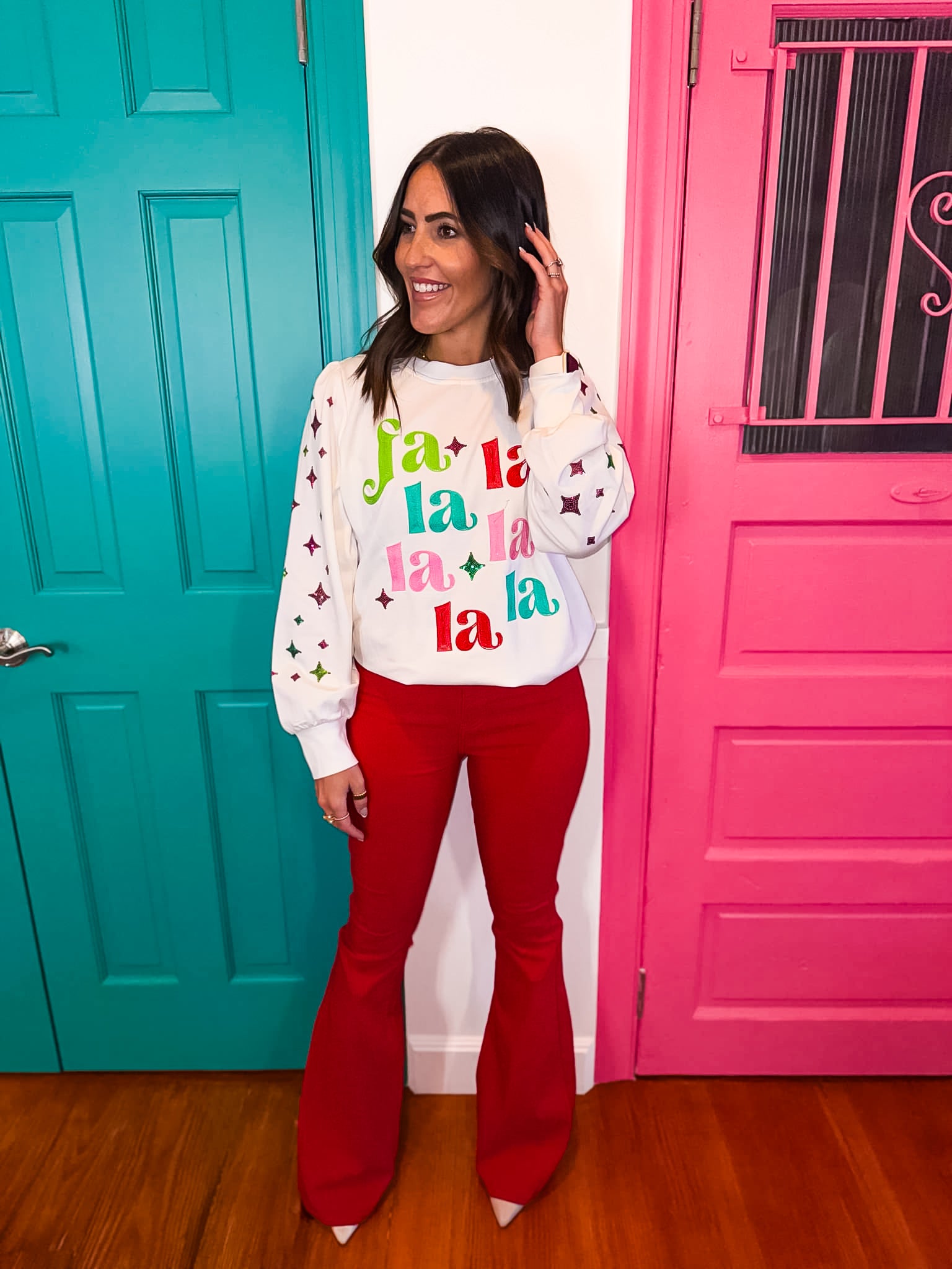 Introducing our Shelby Sweatshirt by Mary Square. Y'all - this is the softest sweatshirt around. Let's talk about how festive it is too. It is a white base sweatshirt with green red and pink stars through out with Fa La La written in the center. It features a round neckline and it is a true length sweatshirt. It is lightweight and beyond cute and comfy. You will want to wear her throughout the Holiday Season and to any and all of your events coming back.