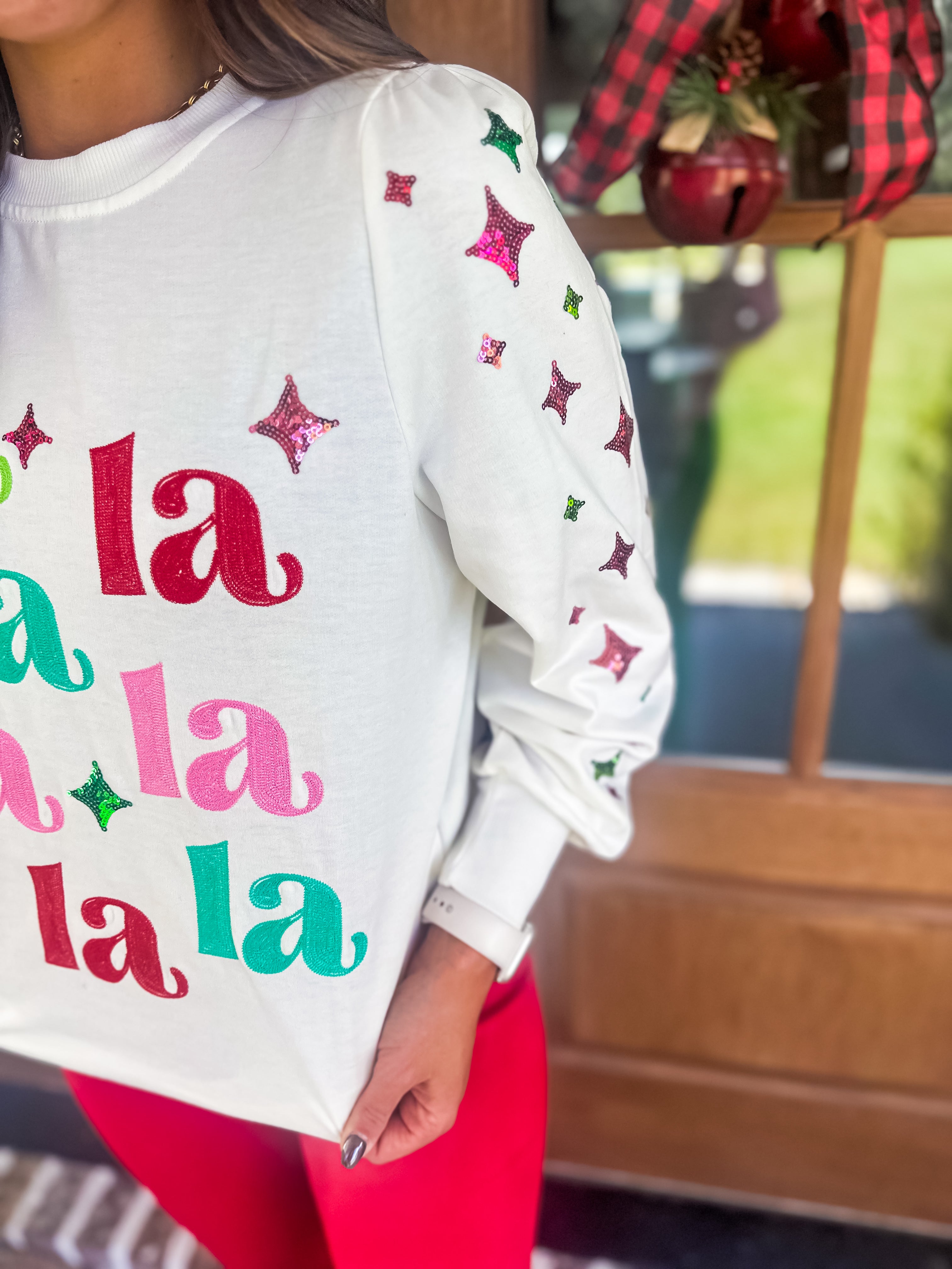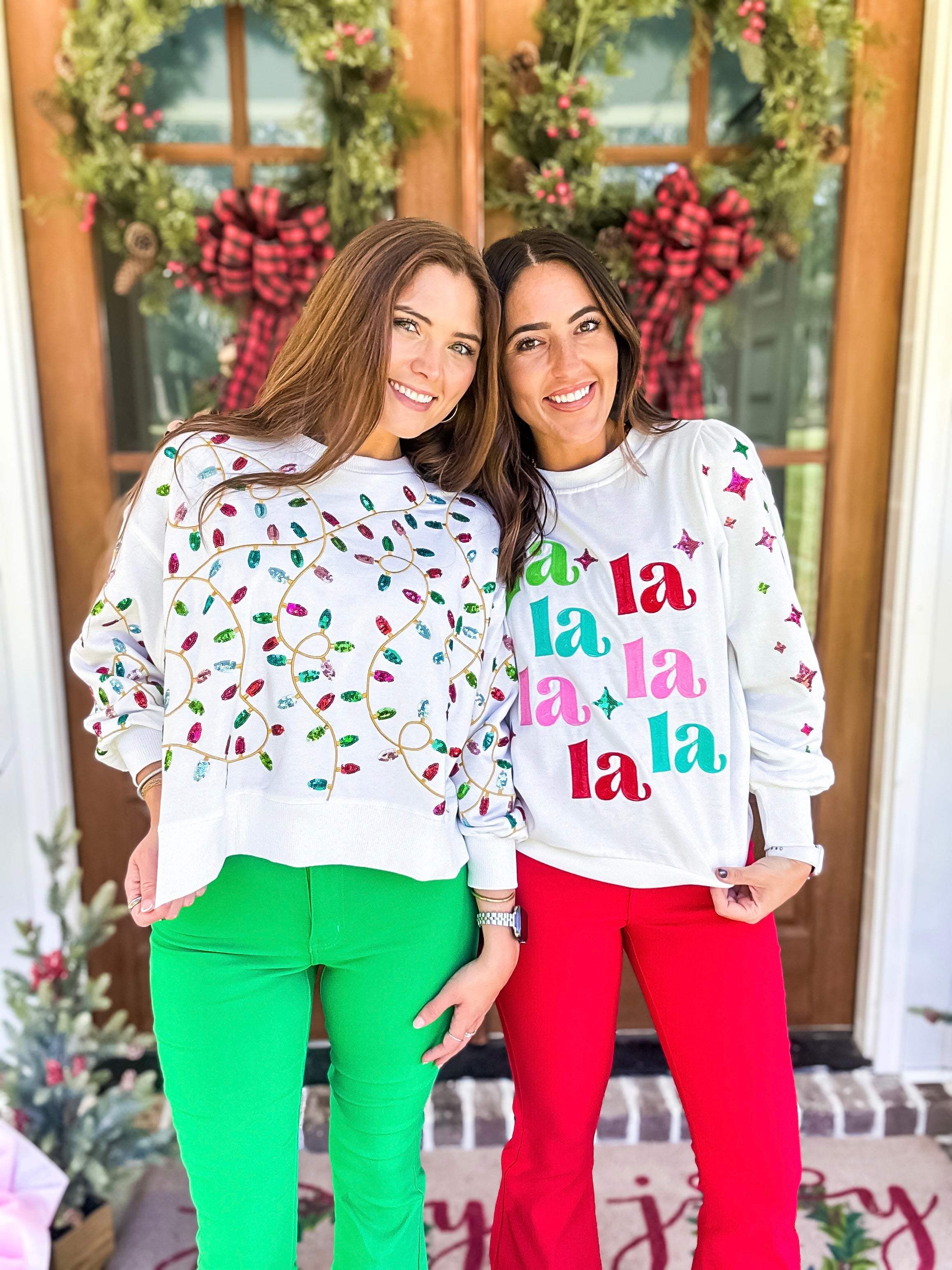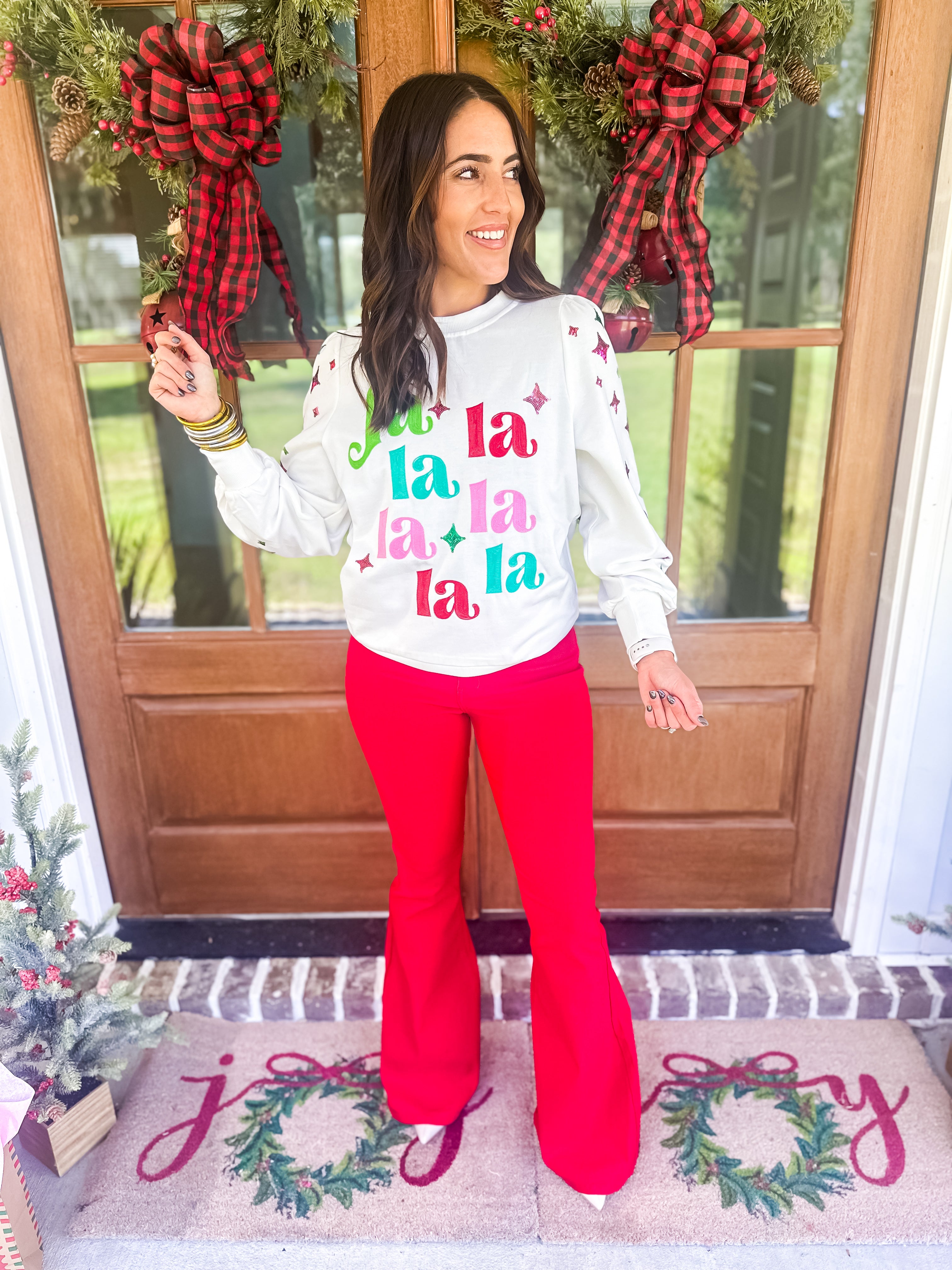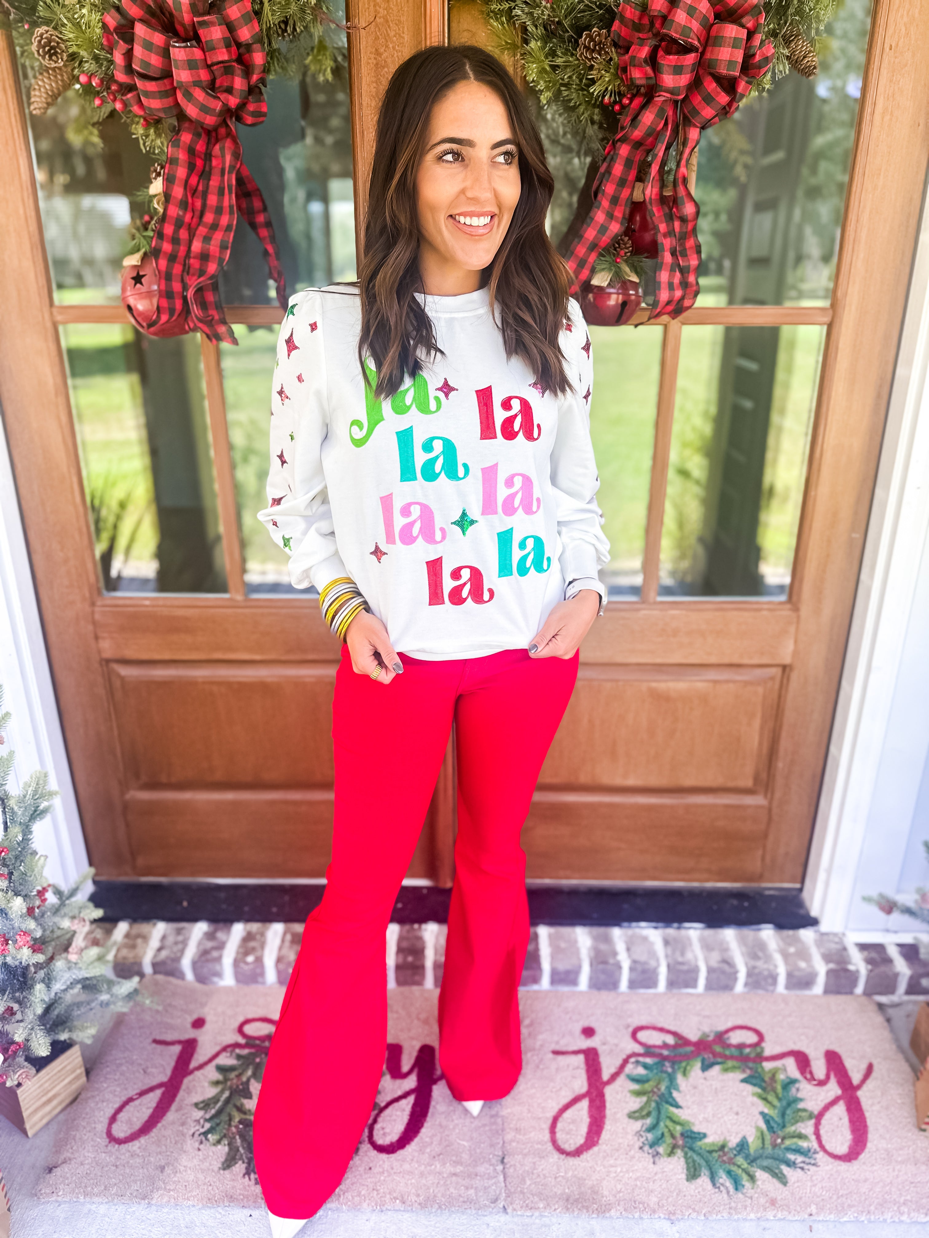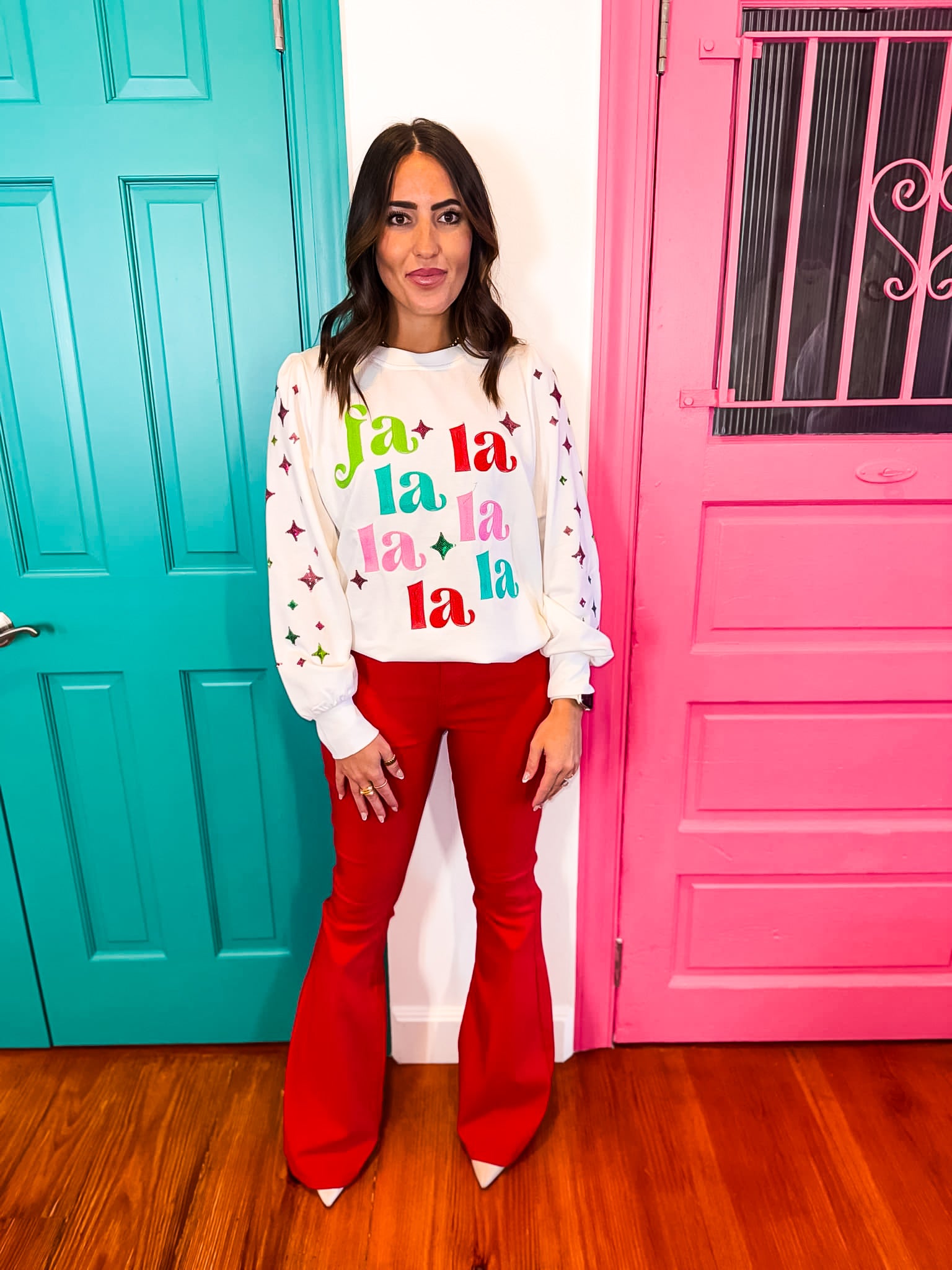 Introducing our Shelby Sweatshirt by Mary Square. Y'all - this is the softest sweatshirt around. Let's talk about how festive it is too. It is a white base sweatshirt with green red and pink stars through out with Fa La La written in the center. It features a round neckline and it is a true length sweatshirt. It is lightweight and beyond cute and comfy. You will want to wear her throughout the Holiday Season and to any and all of your events coming back.