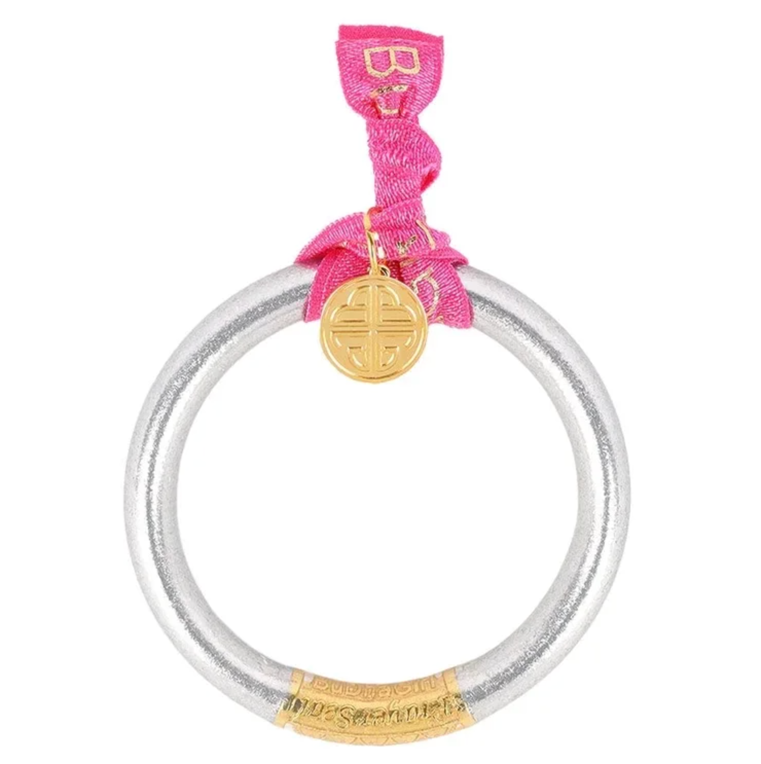 Maximalist? Minimalist? Either way, you are going to be divine. Our BuDhaGirl Tzubbie (pronounced chubbie) Silver All Weather Bangle has all the qualities of AWB: waterproof, soundless, weightless & TSA proof. This single orb is made for those who want the ultimate statement piece. A wealth of our signature lush divine custom blended gold leaf is captured in our voluminous polyvinyl carbonate tubing sealed with our signature Serenity prayer bead. Imagine setting your daily intentions with this beauty.