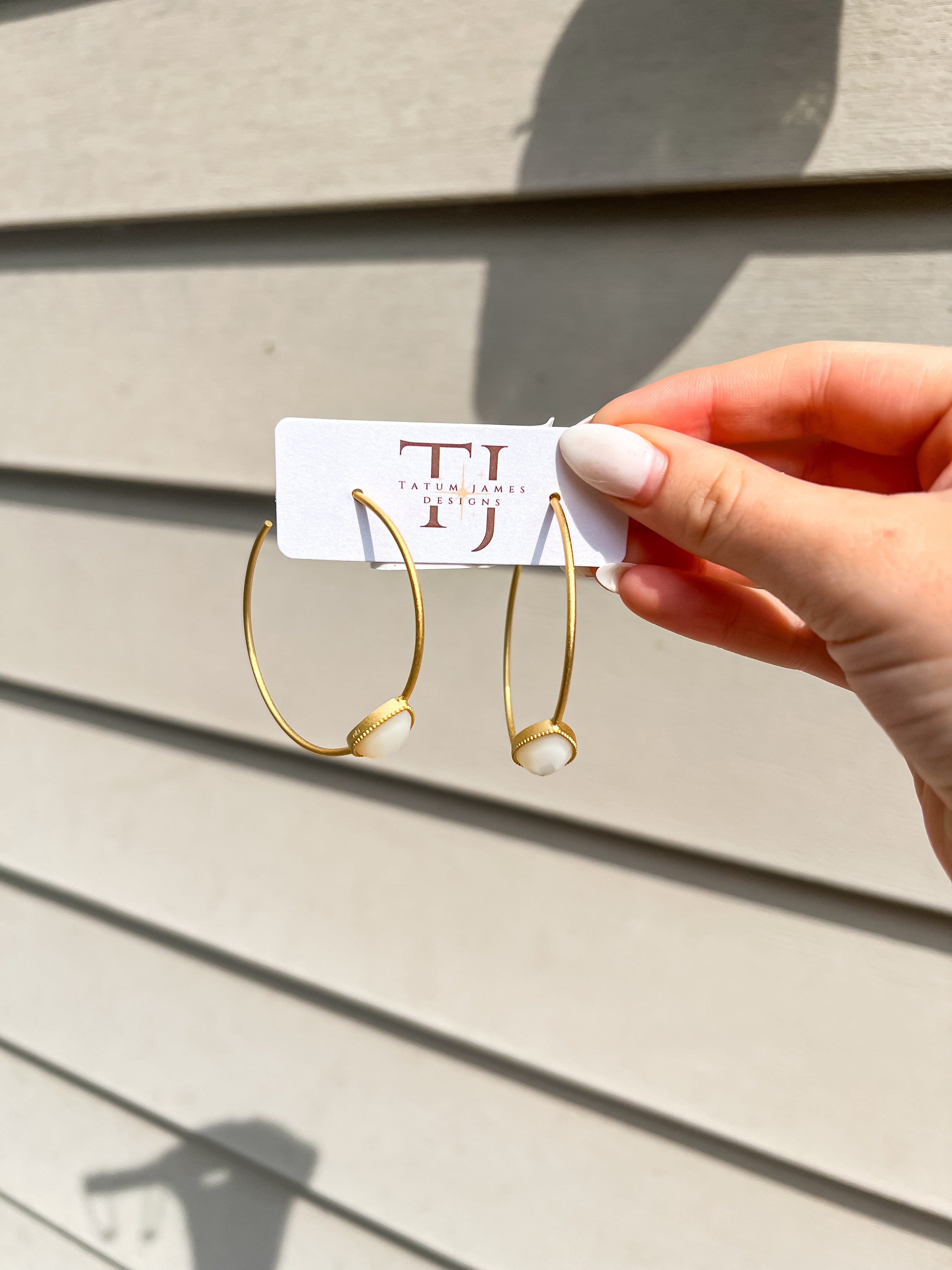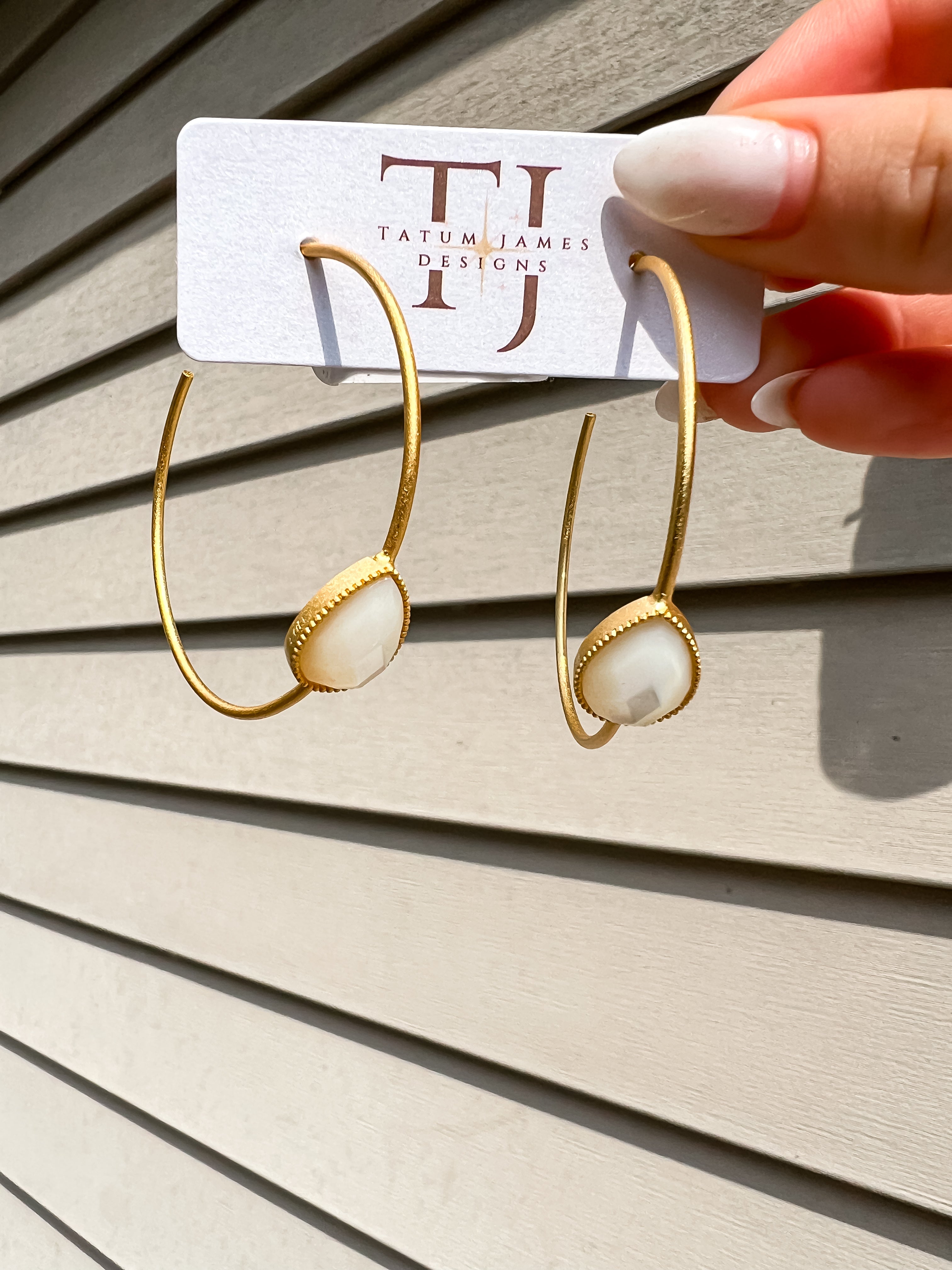 A twist on a basic hoop! These earrings share the same teardrop dotted bezel setting as our Peyton Cuff and Madison 6 Stone Cuff, so they look perfect worn together!
