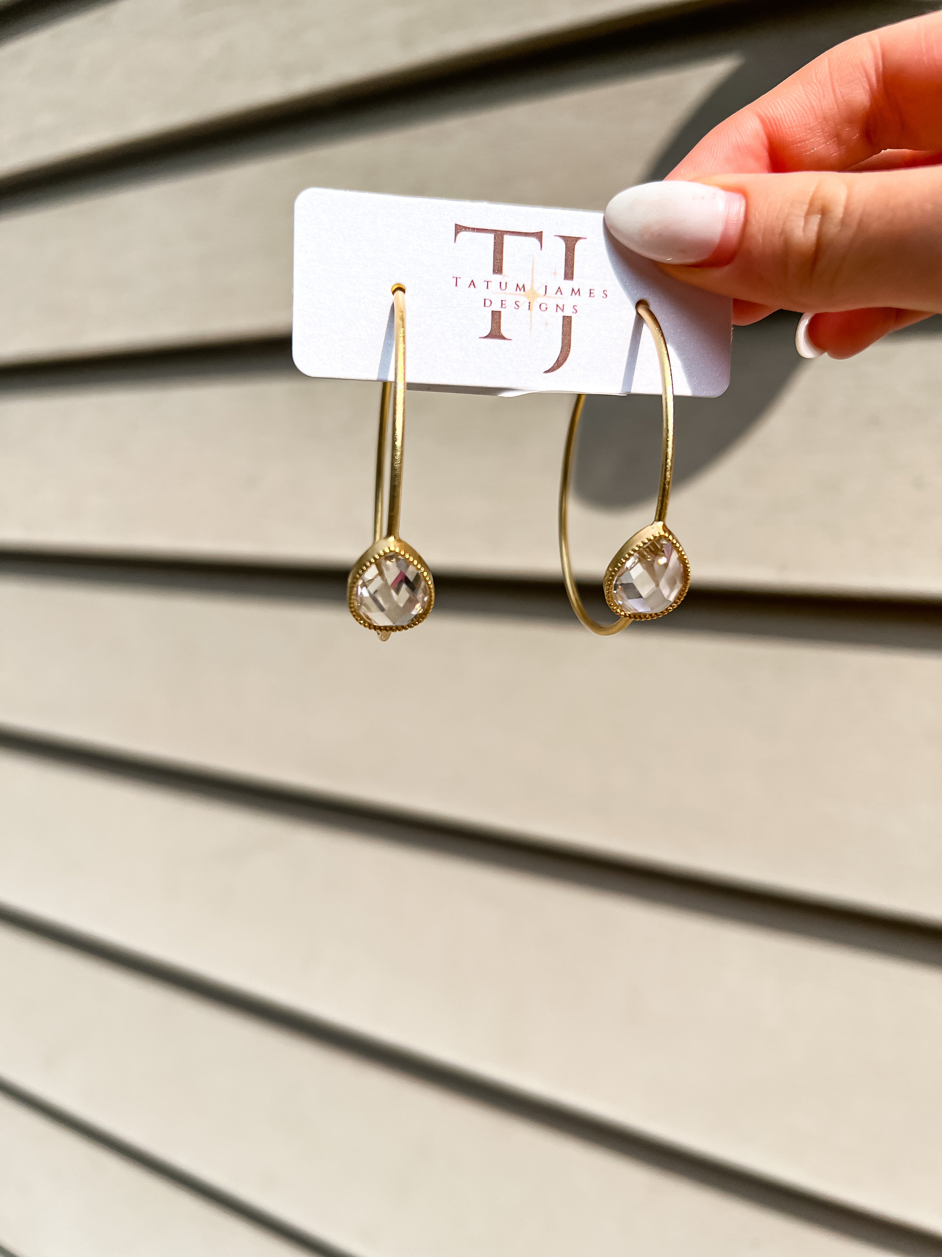 A twist on a basic hoop! These earrings share the same teardrop dotted bezel setting as our Peyton Cuff and Madison 6 Stone Cuff, so they look perfect worn together!