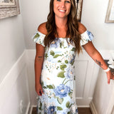You will love how the Sloane Floral Ursa Midi Dress looks on you! A light blue background with florals all over design this beautiful piece. A ruffle off the shoulder leads to a smocked back panel and ends at a midi ruffle hem. Pair the dress with white open toe heels. - Floral - Square neck - Ruffle - Midi - Color: Lt Blue Mult