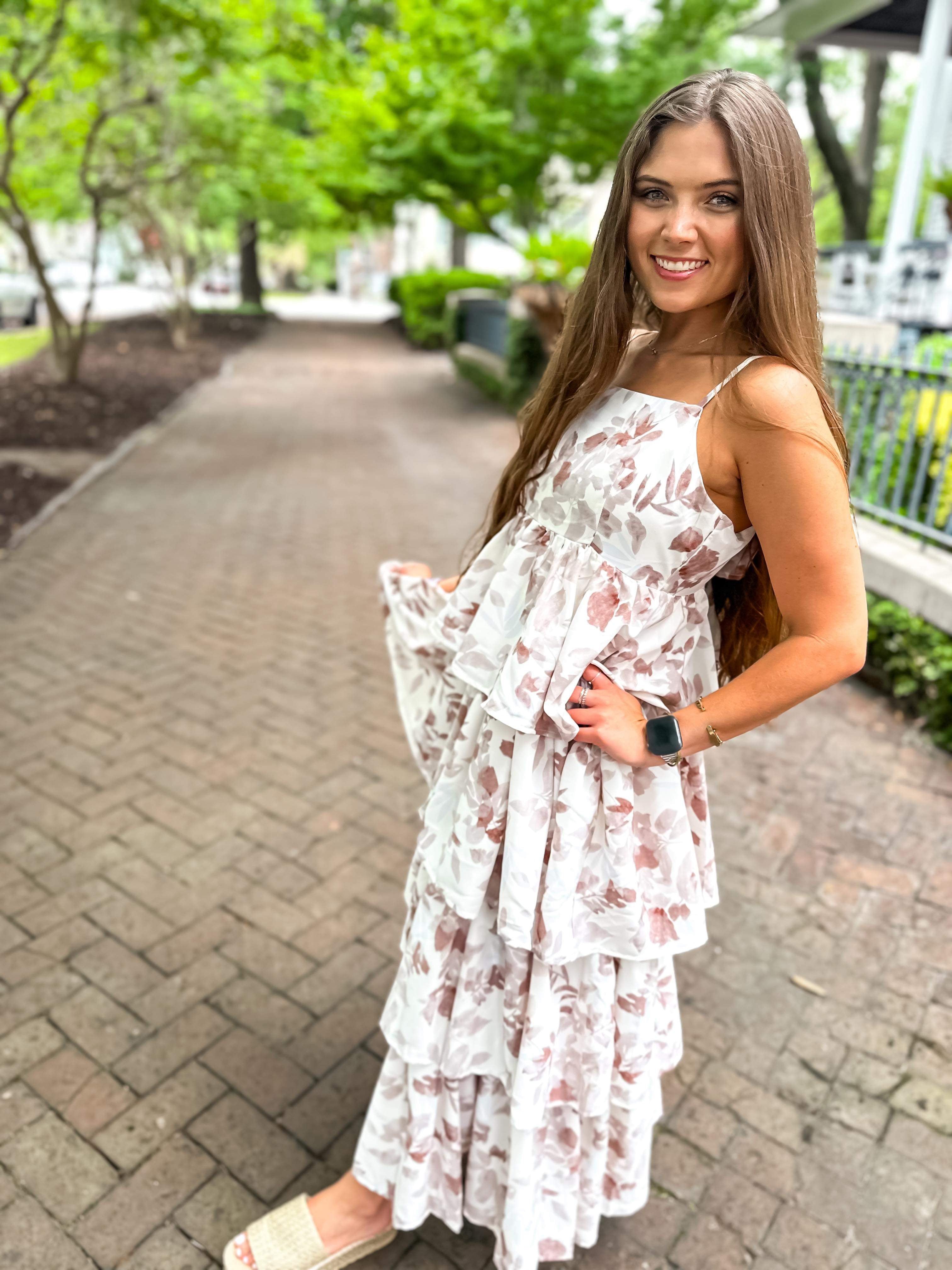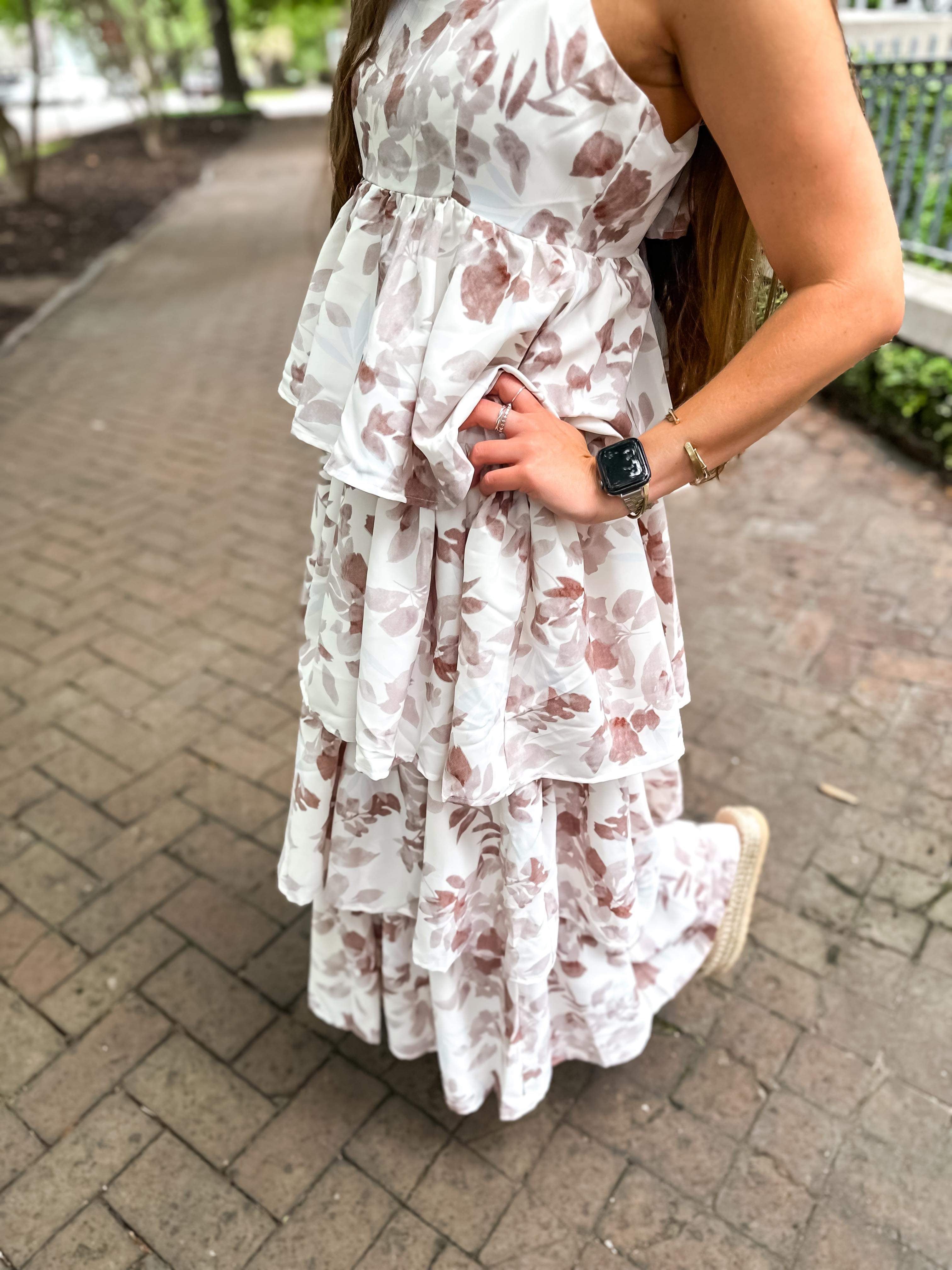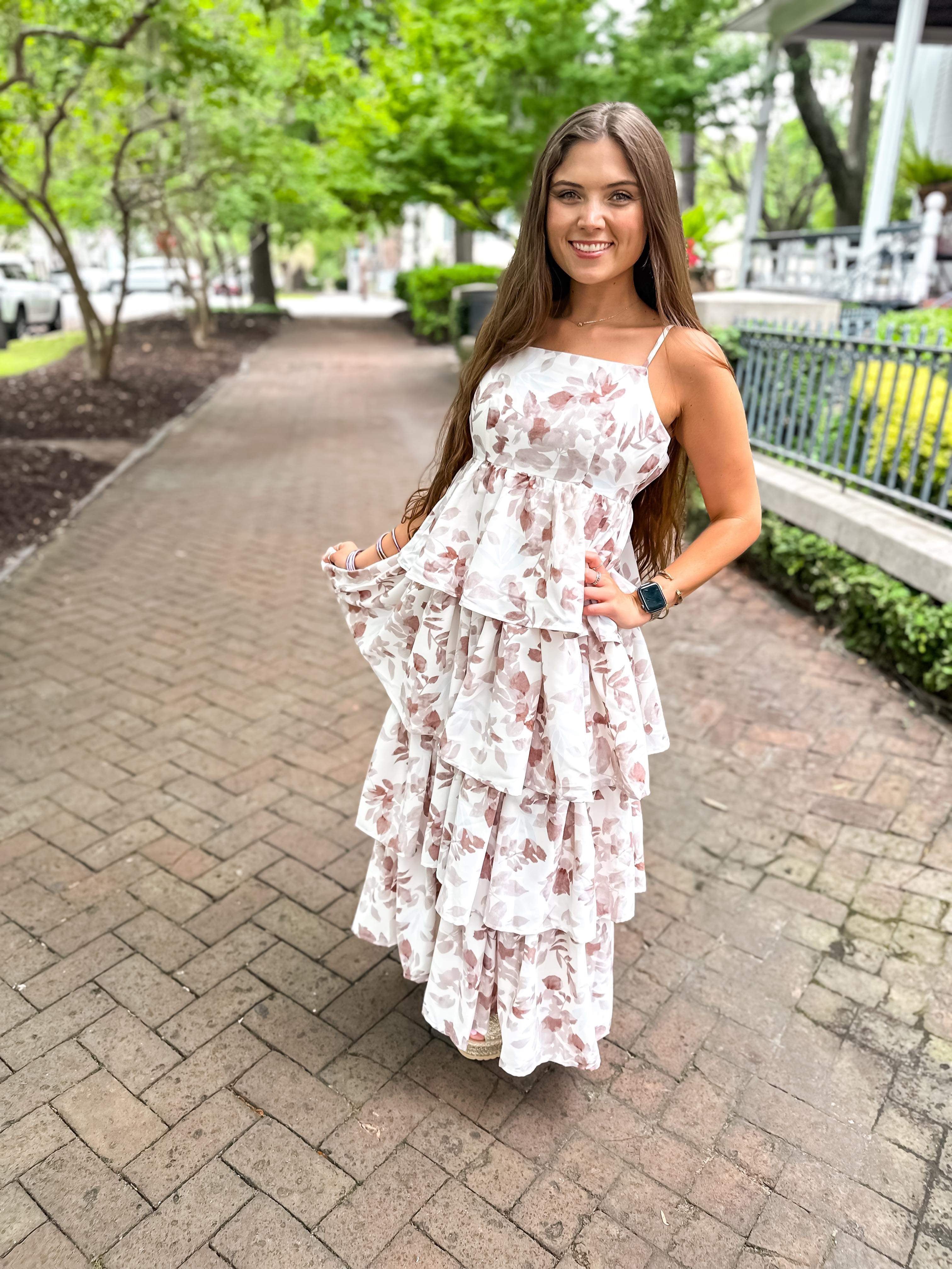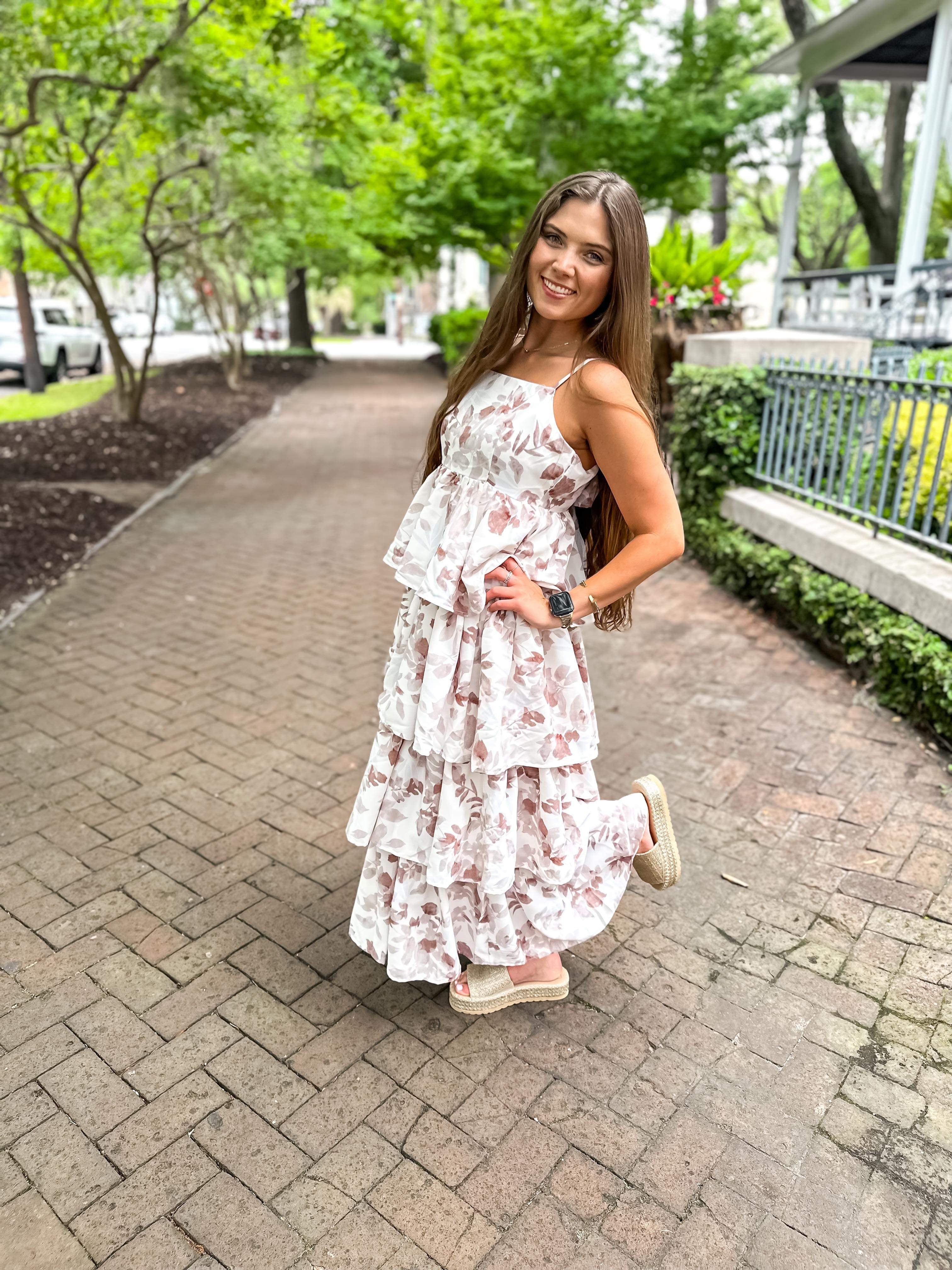 Leaf print square neck sleeveless tiered midi dress featuring self tie at back. Adjustable straps. Elastic at back. Lined. Woven. Non-sheer. Lightweight.