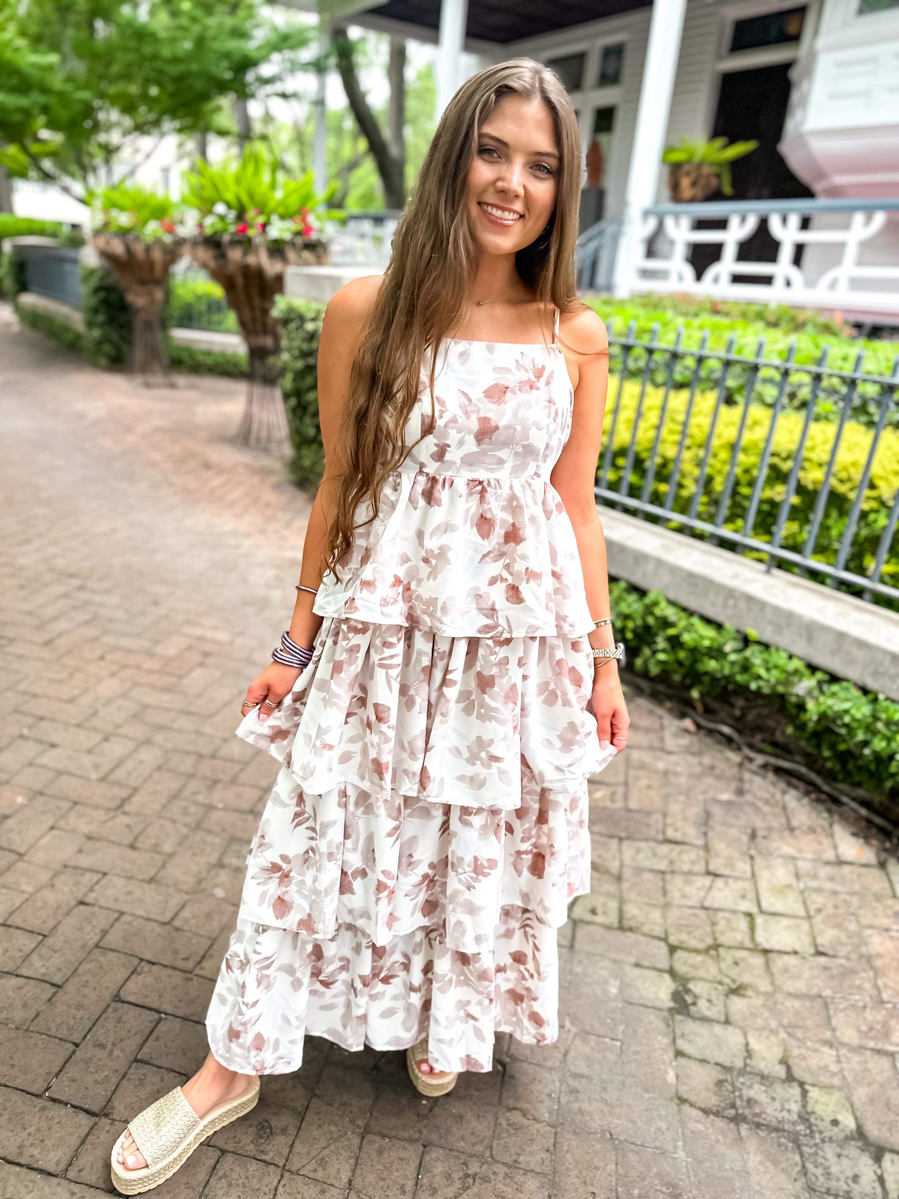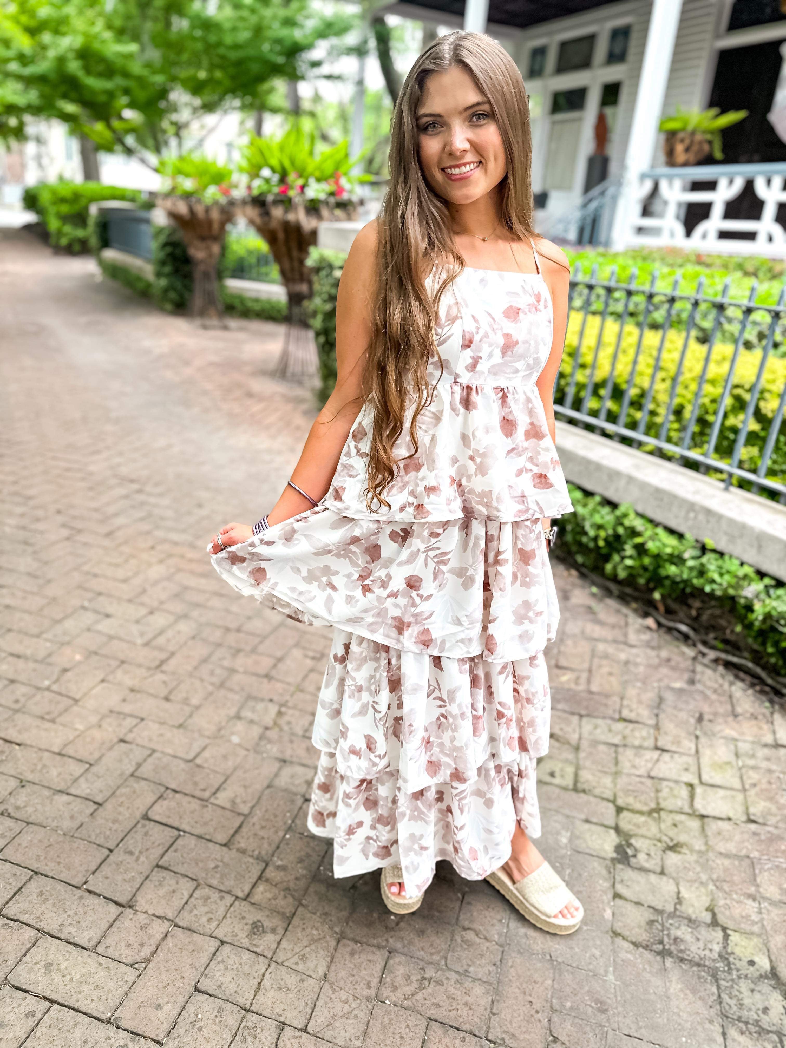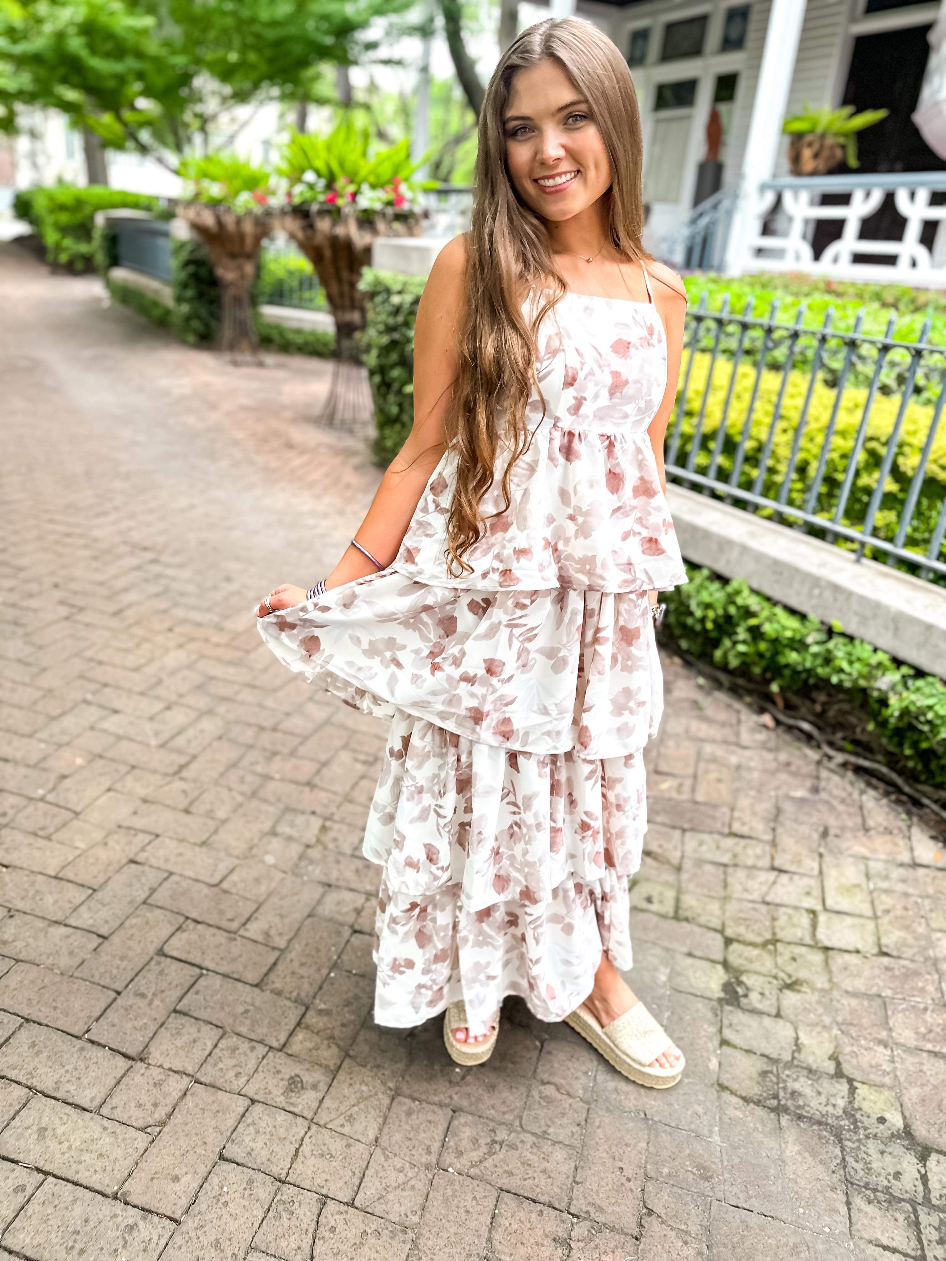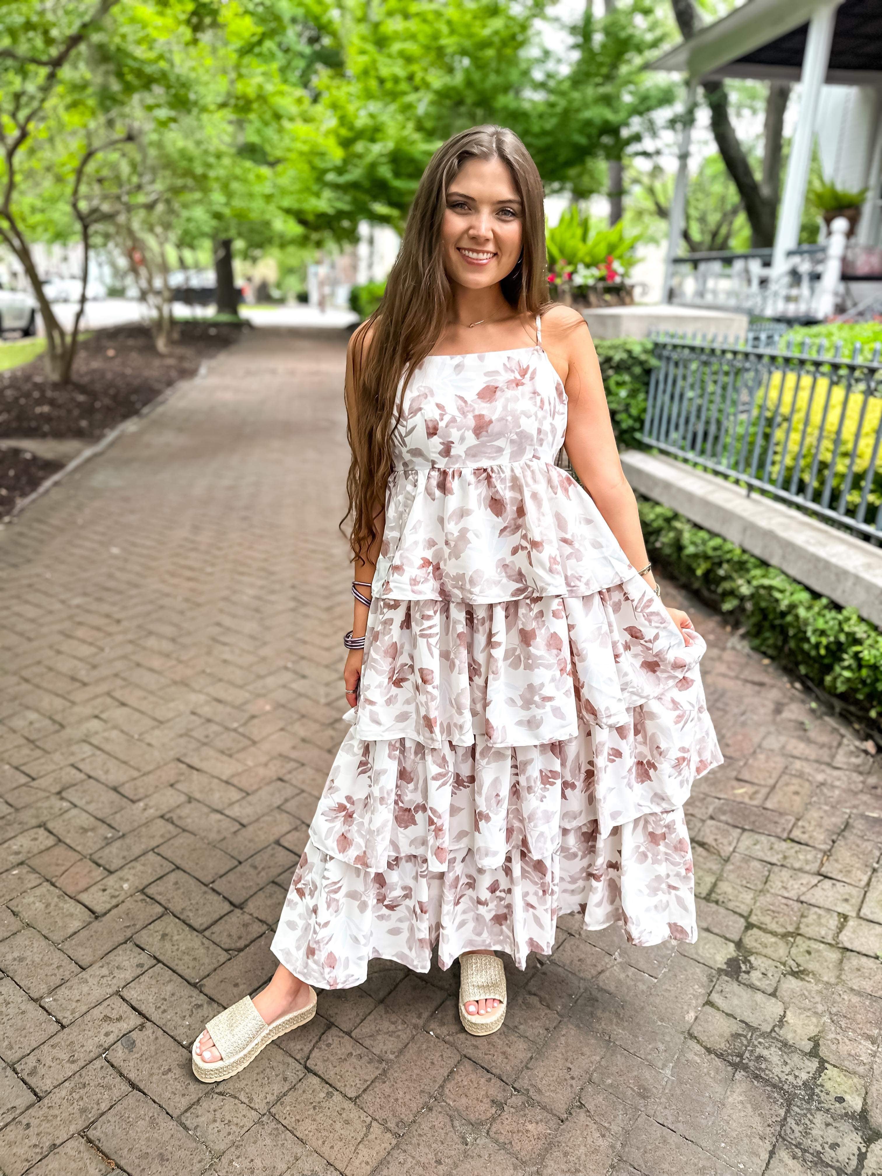 Leaf print square neck sleeveless tiered midi dress featuring self tie at back. Adjustable straps. Elastic at back. Lined. Woven. Non-sheer. Lightweight.