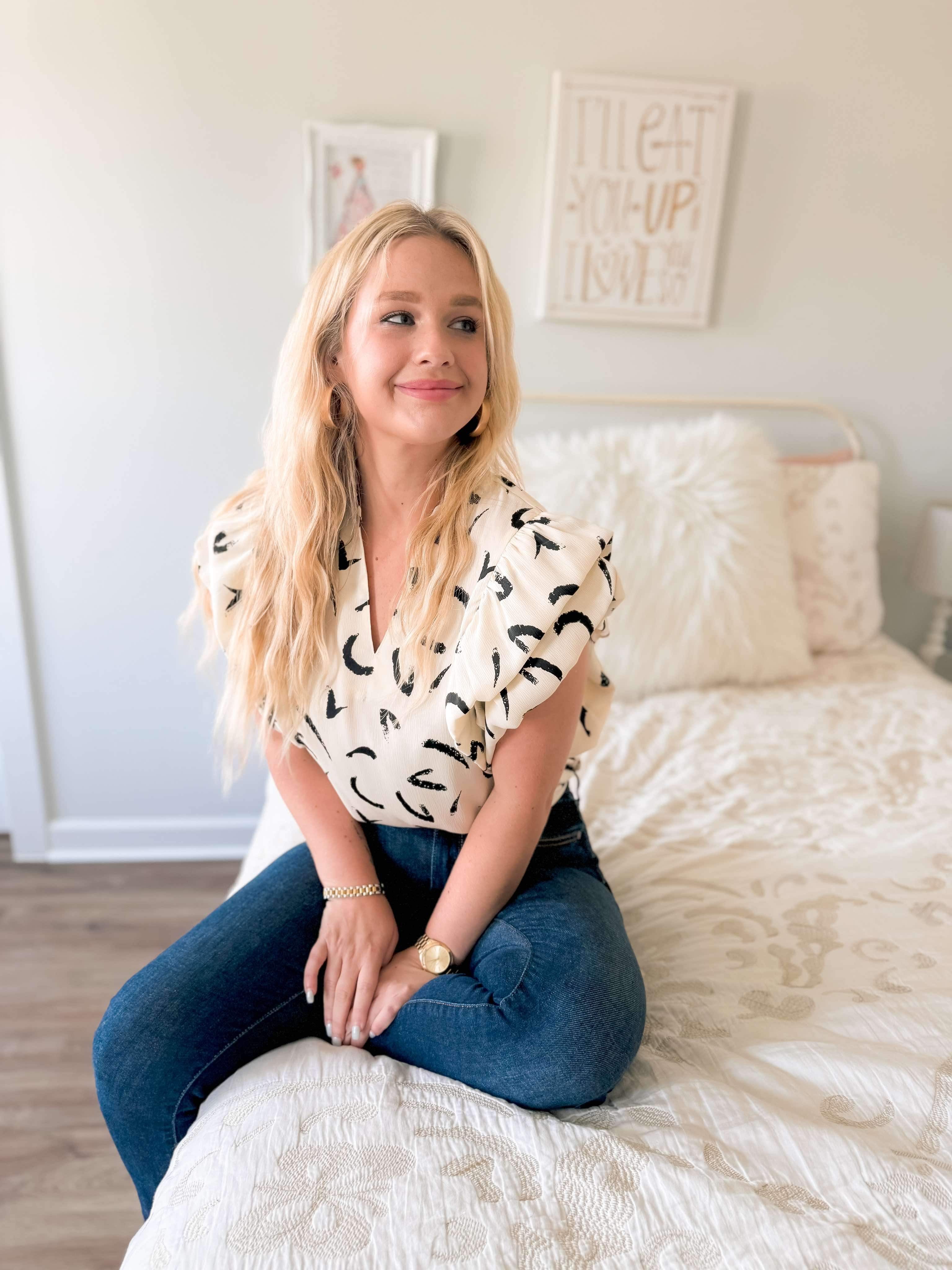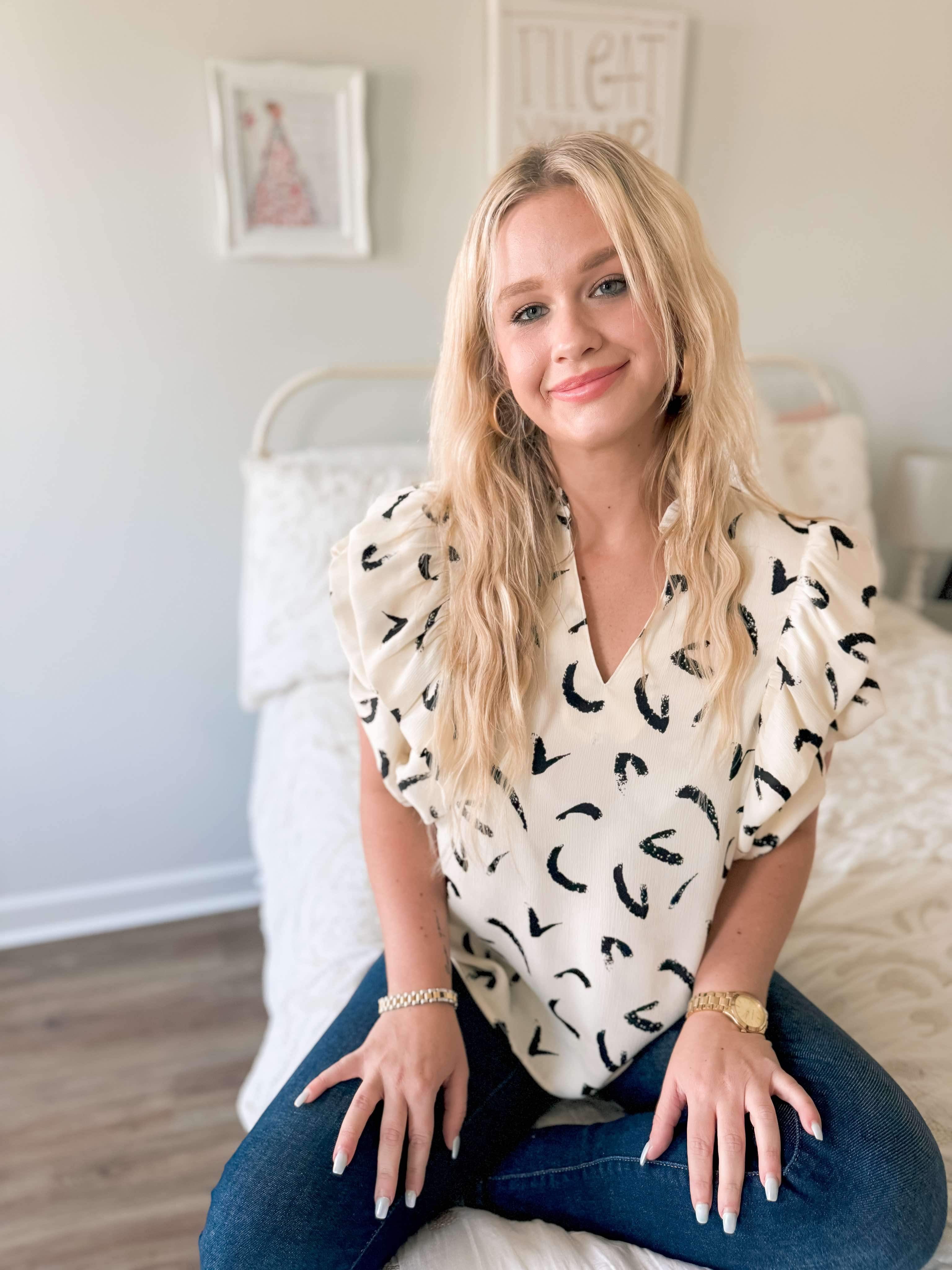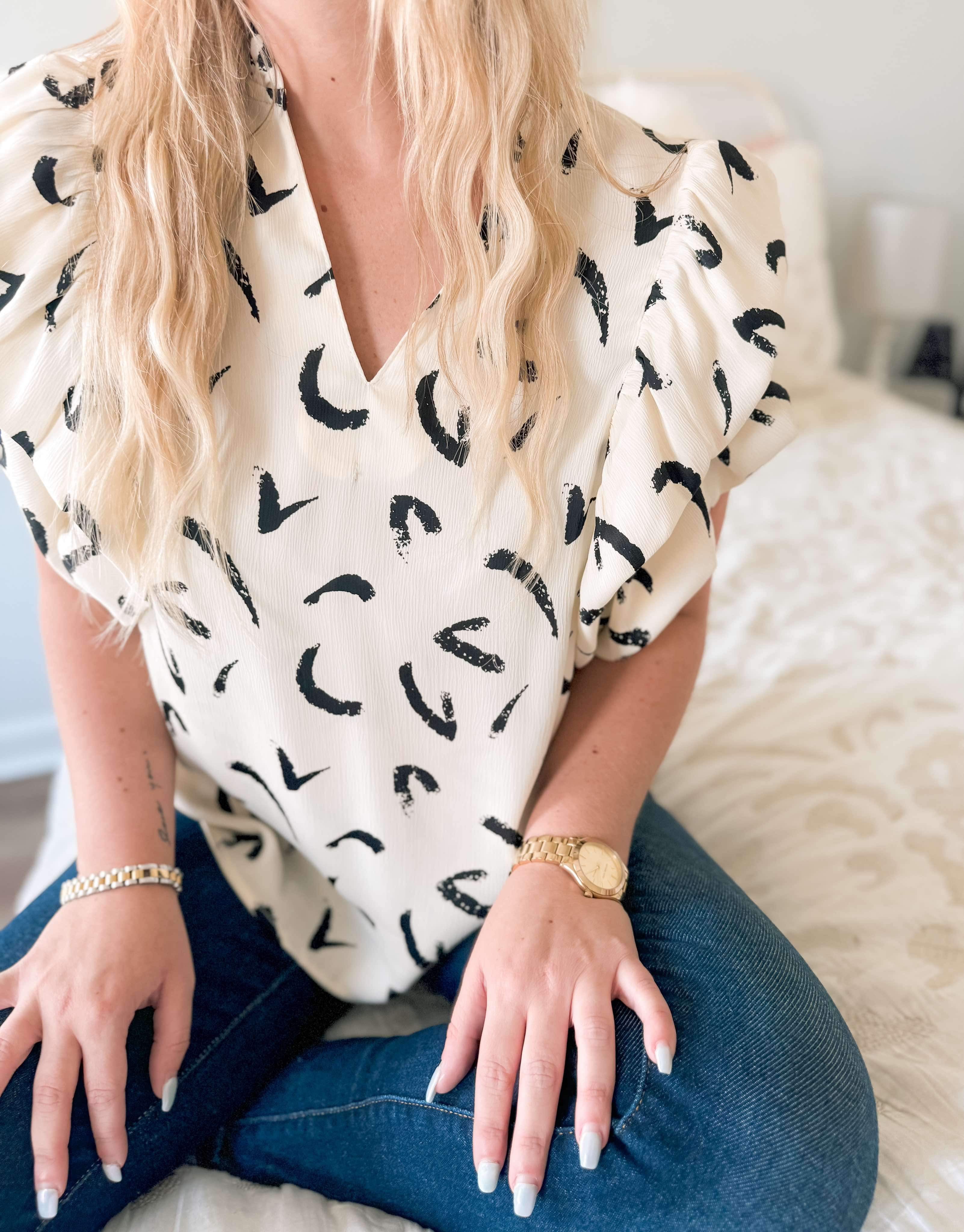 Introducing our Splash of Fall Top in cream. We are loving this top. Such a great piece to sport throughout the whole year. It is a great neutral option. It is a cream base with brush stroked black pieces. It has a ruffle neckline and a puff sleeve feature.