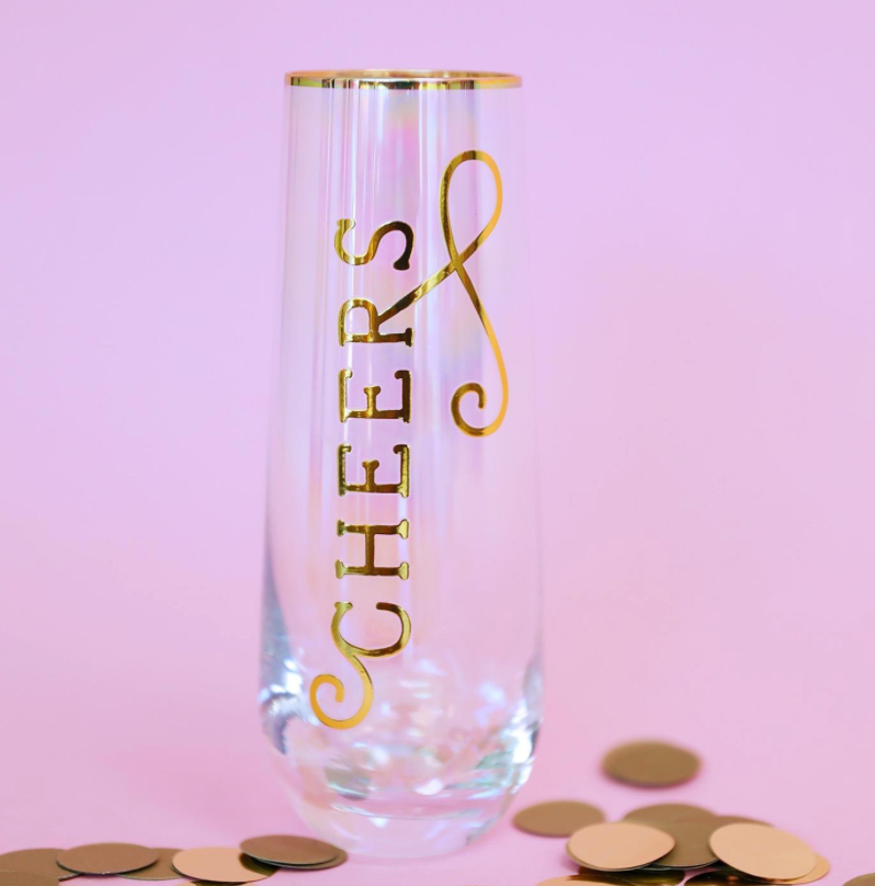 Introducing our Stemless Champagne Glass with an iridescent look. It does have beautiful script in gold that says 'Cheers'. These make great gifts for all.