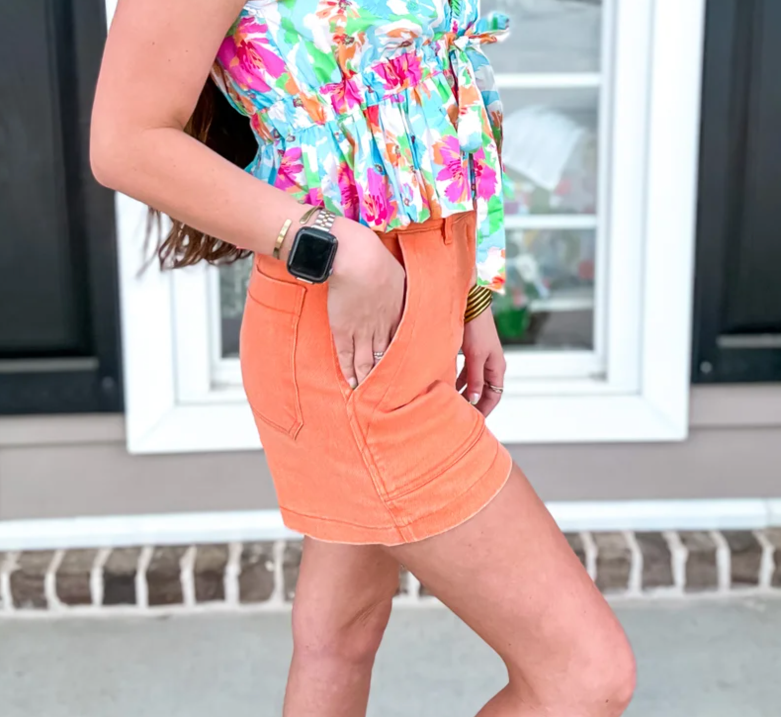 High waisted denim shorts featuring pockets at side. Button and zipper closure at front. Belted loops. Unlined. Woven. Non-sheer. Lightweight.