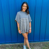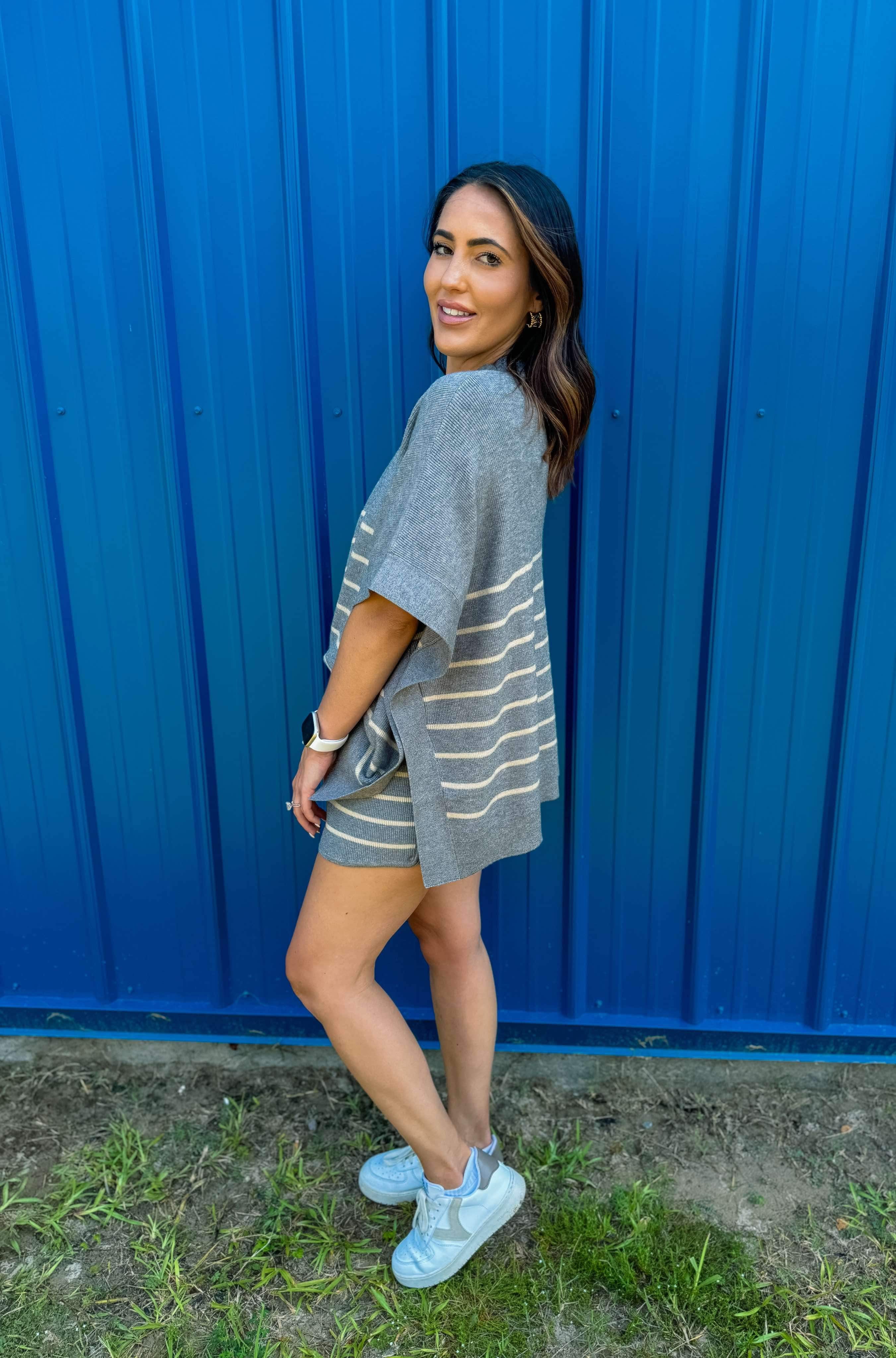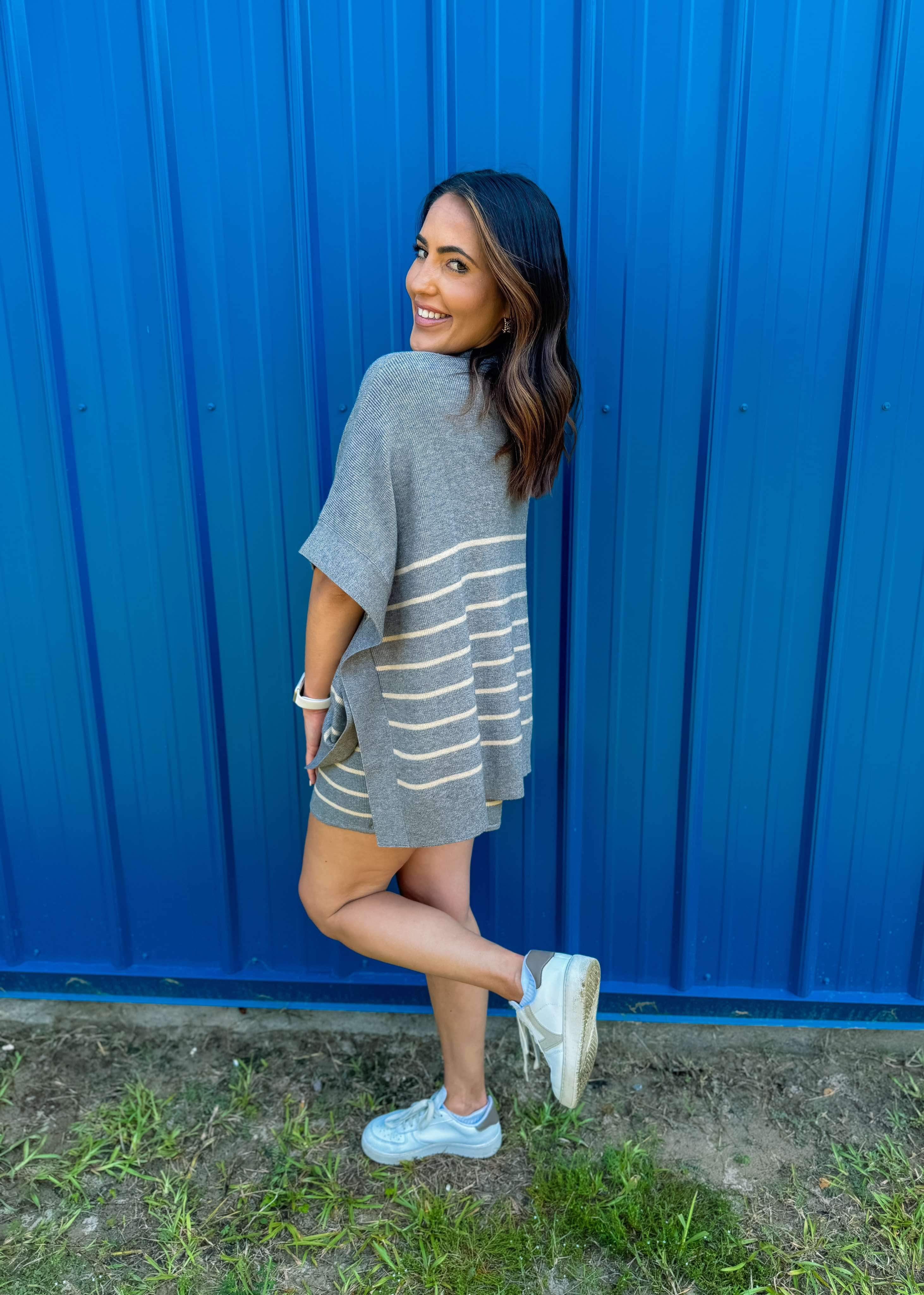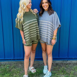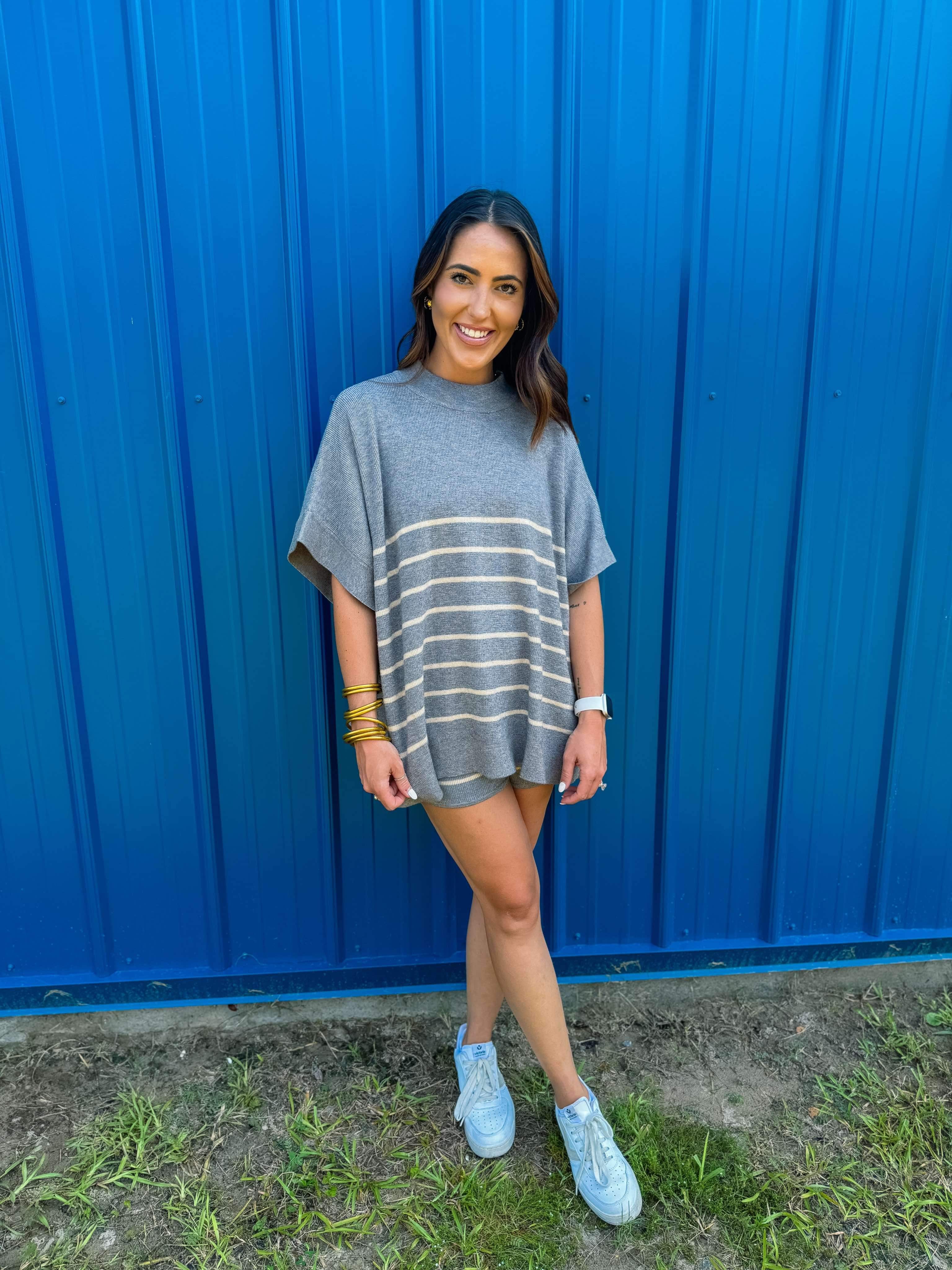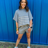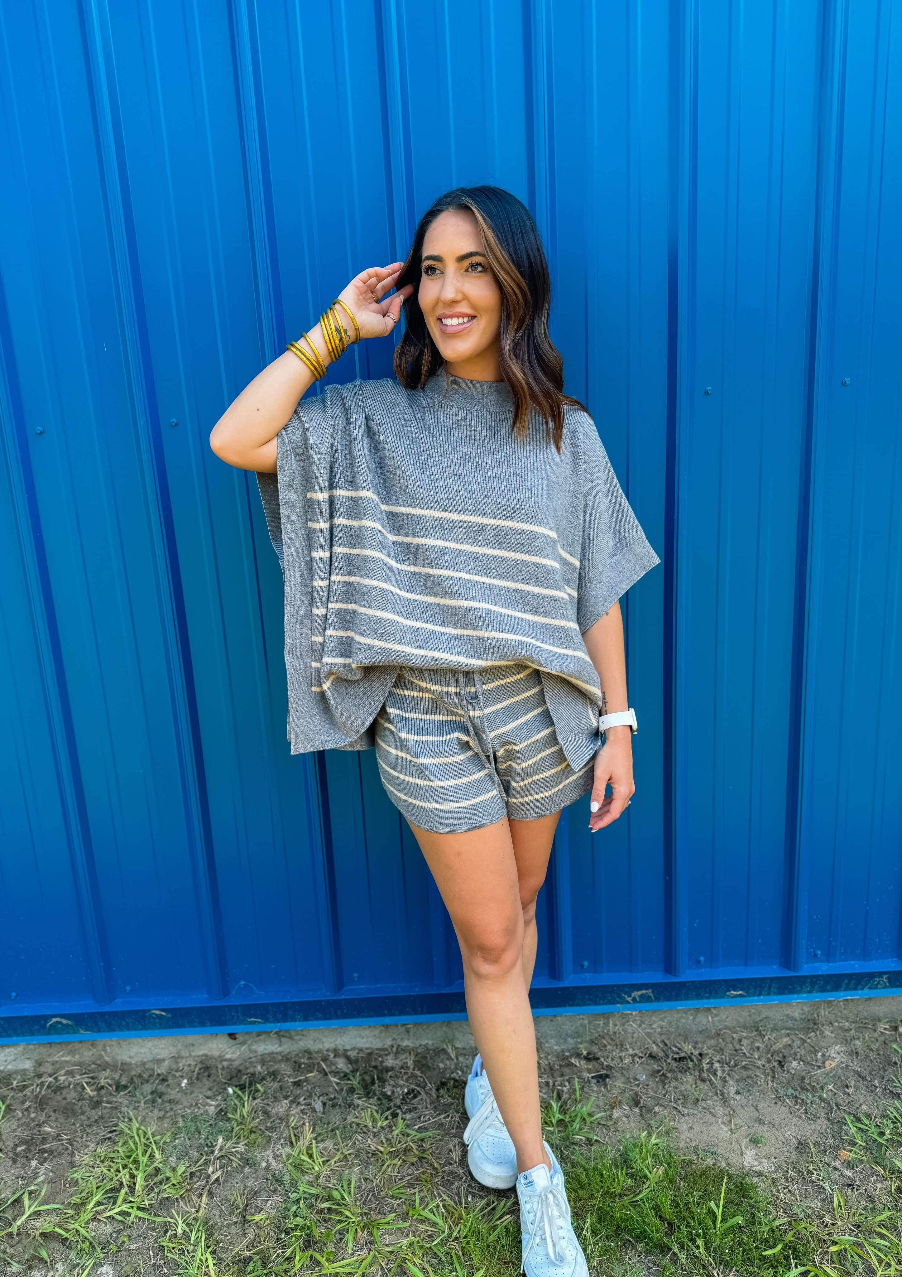 Stripe print high waisted shorts featuring self tie at front. Elastic waistband. Unlined. Knit. Non-sheer. Lightweight.