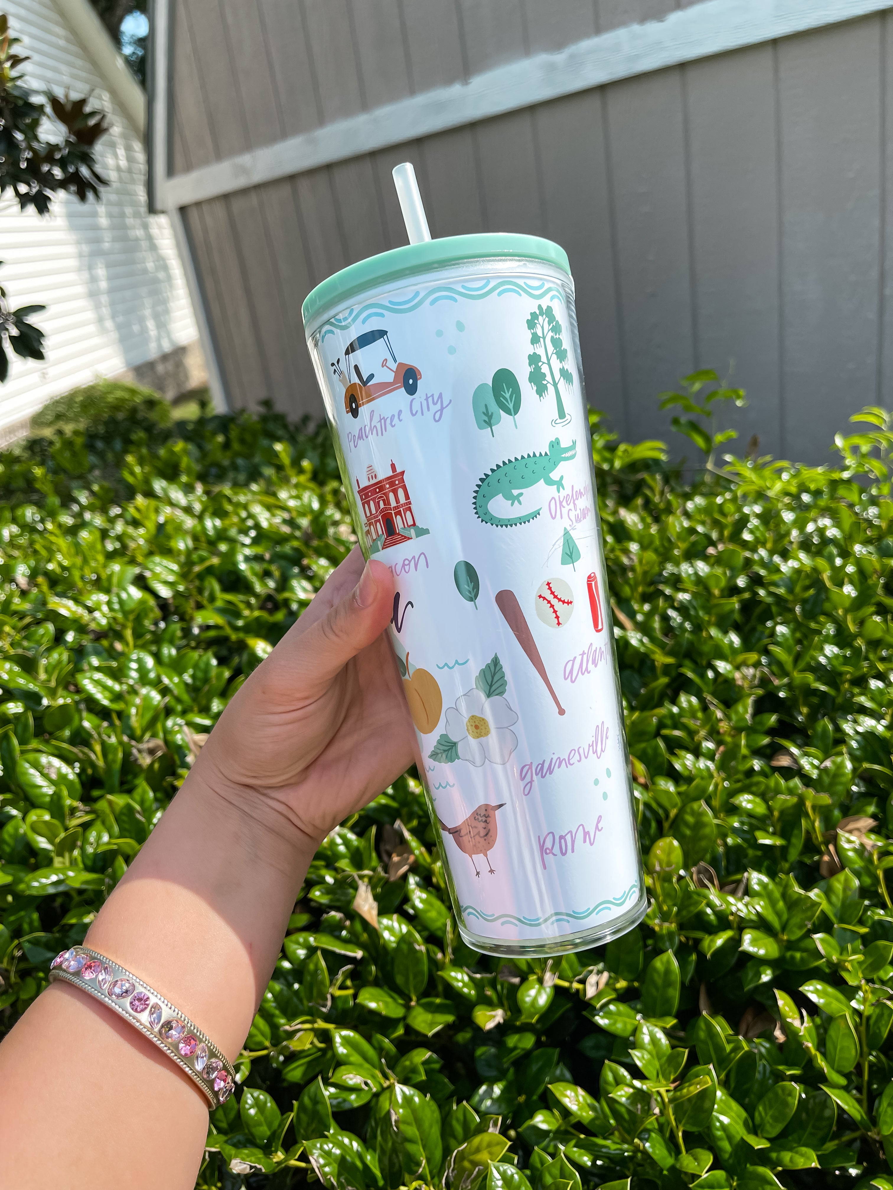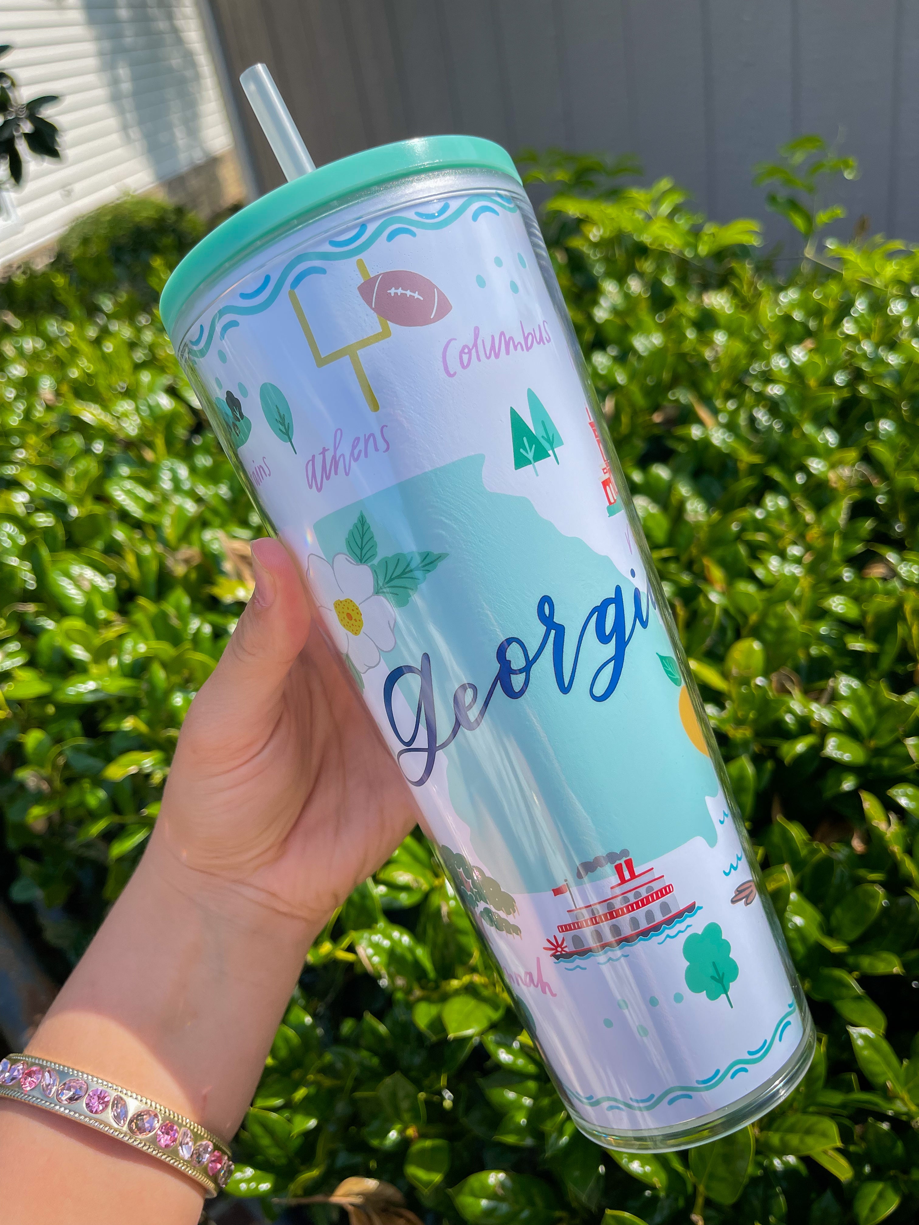 Introducing our Georgia 24oz Straw Tumbler – a perfect blend of style and practicality for those who take pride in the Peach State! Adorned with captivating hand-drawn illustrations and elegant calligraphy, this tumbler is more than just a beverage holder; it's a celebration of Georgia's rich culture and history.