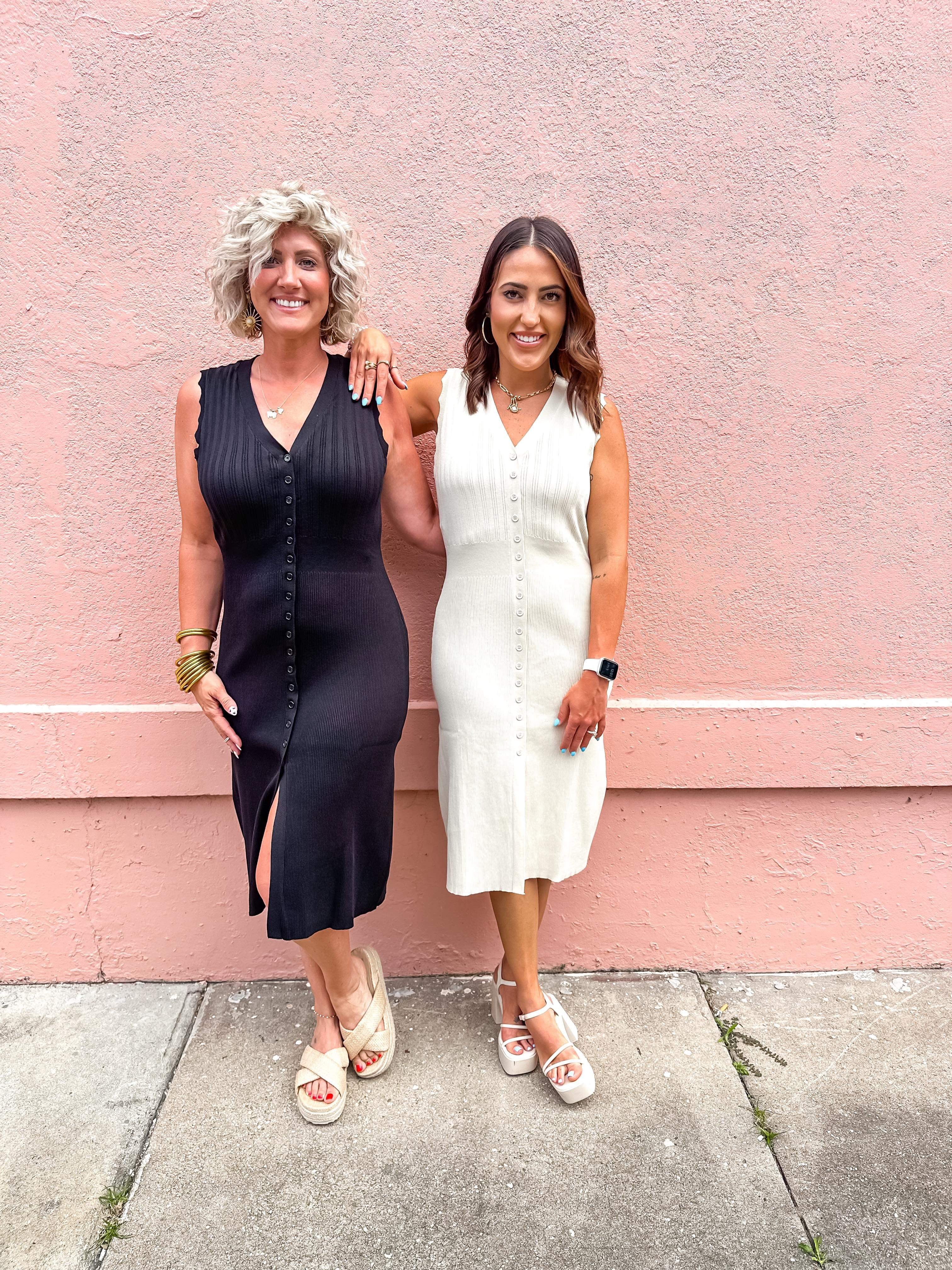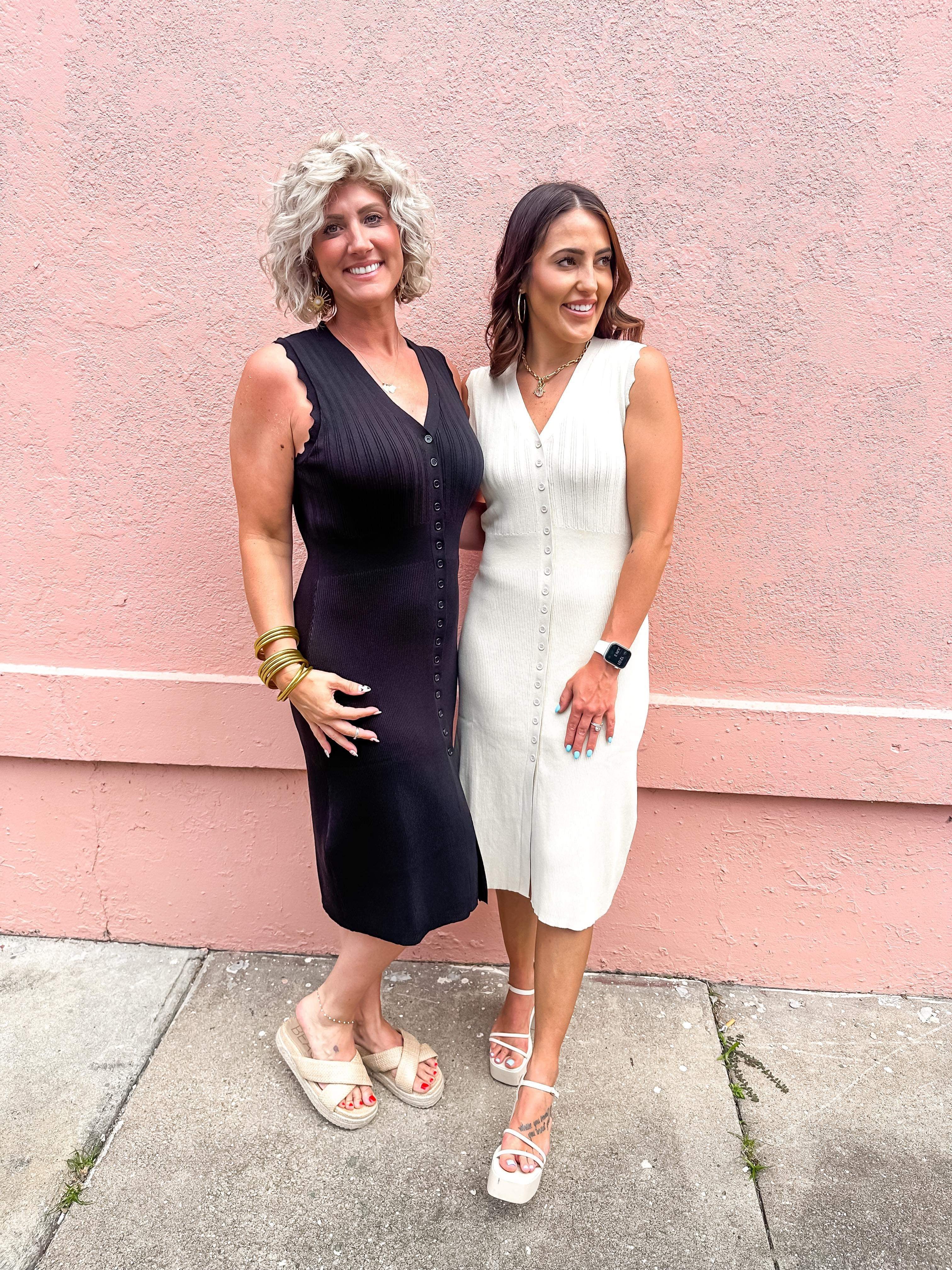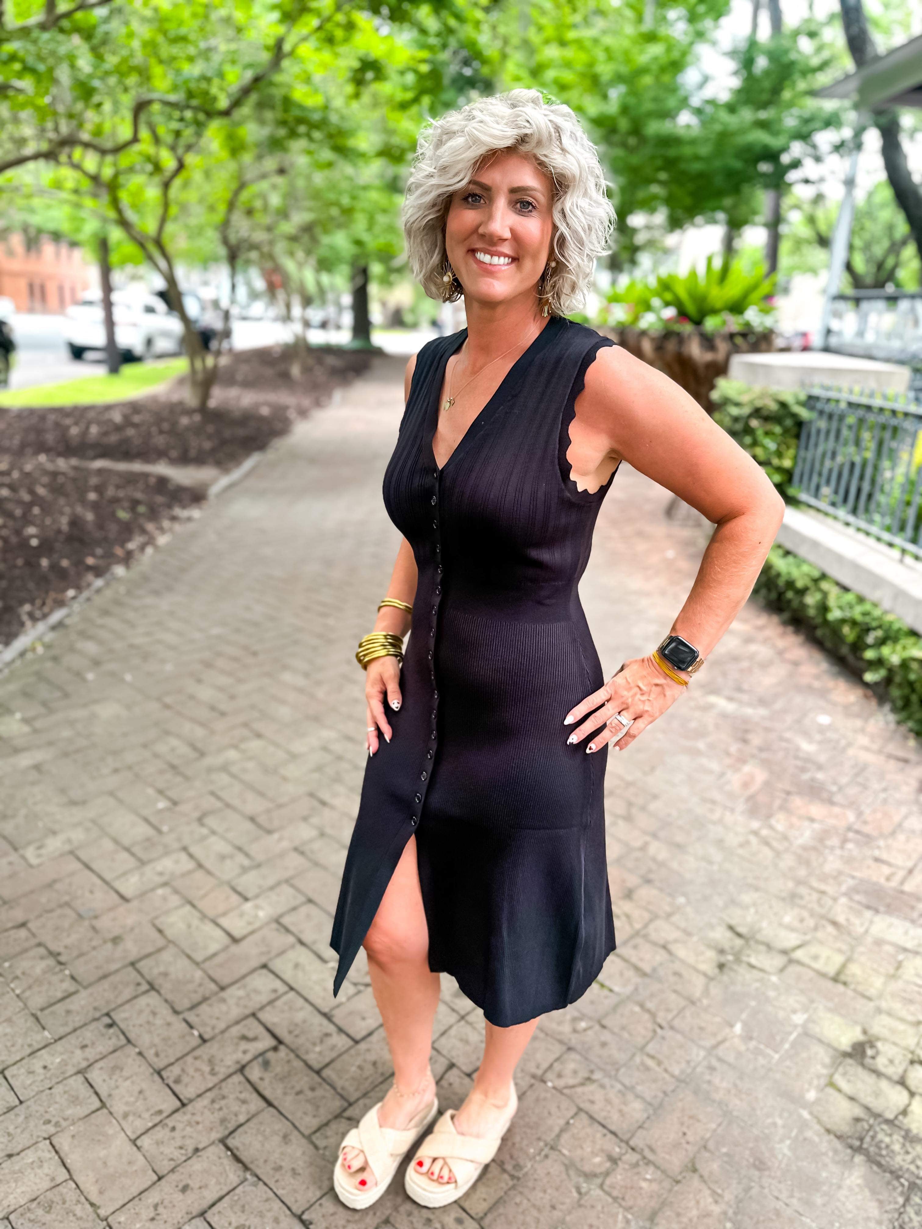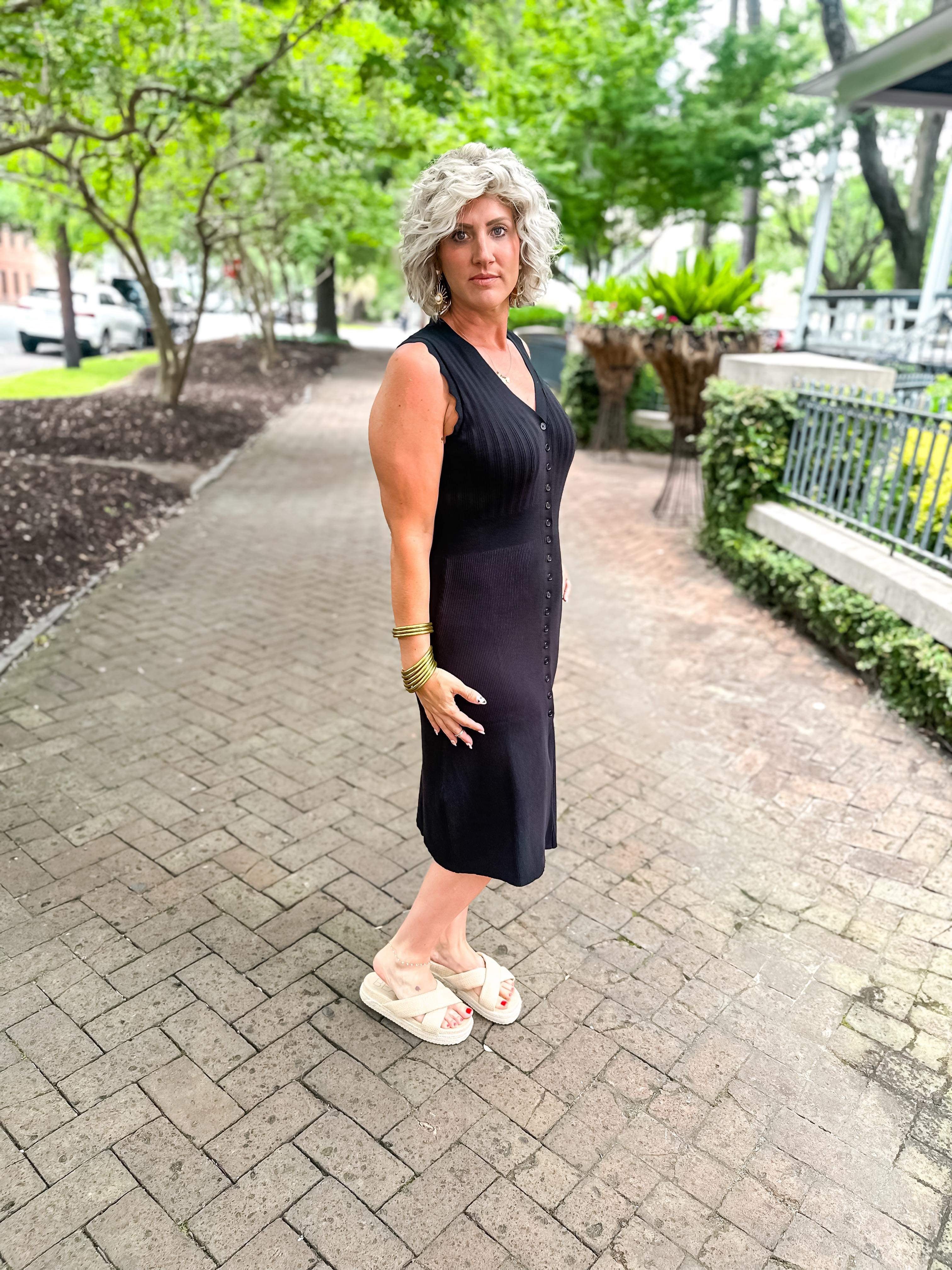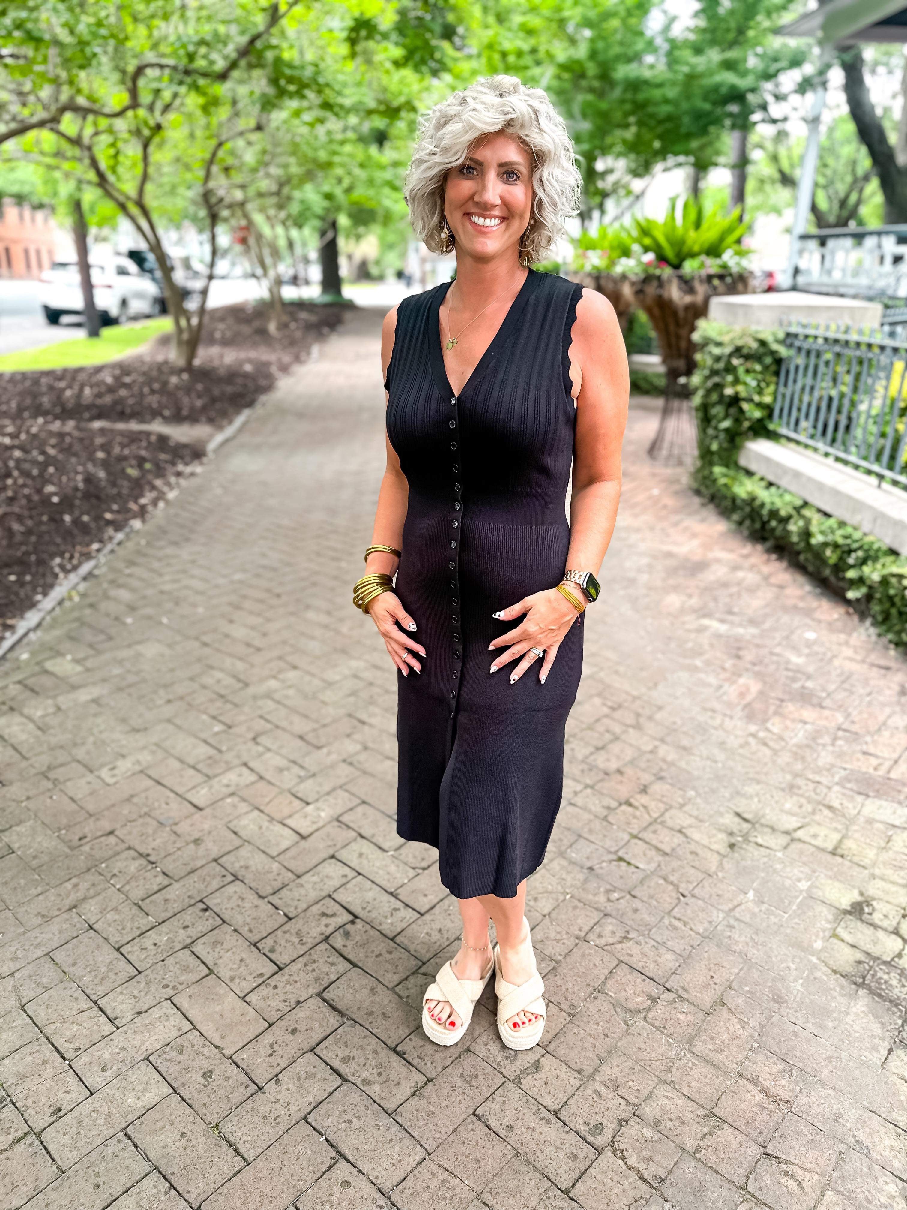 Solid ribbed v-neck sleeveless button down midi dress featuring wavy trim detail. Unlined. Knit. Non-sheer. Lightweight.