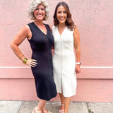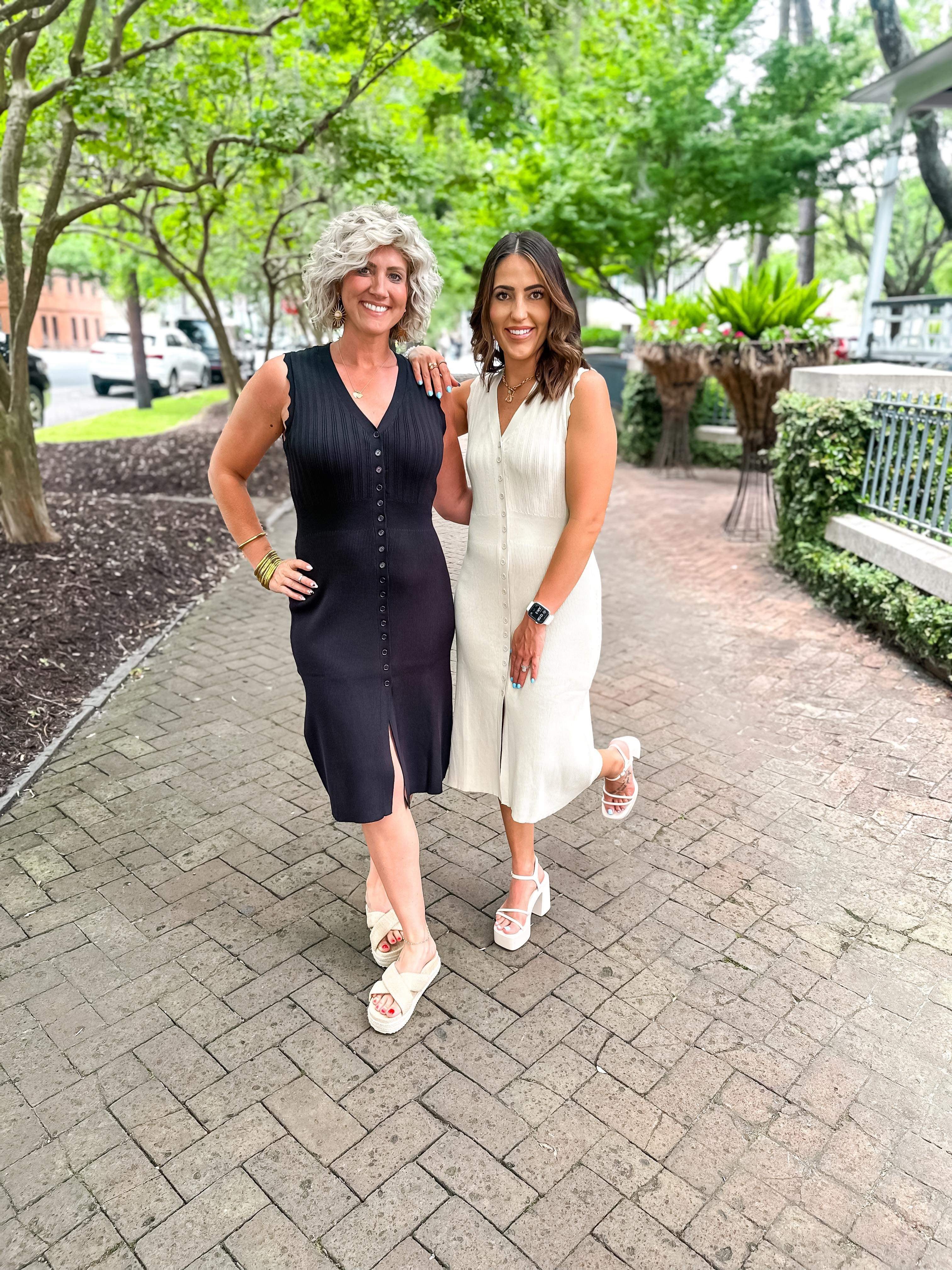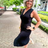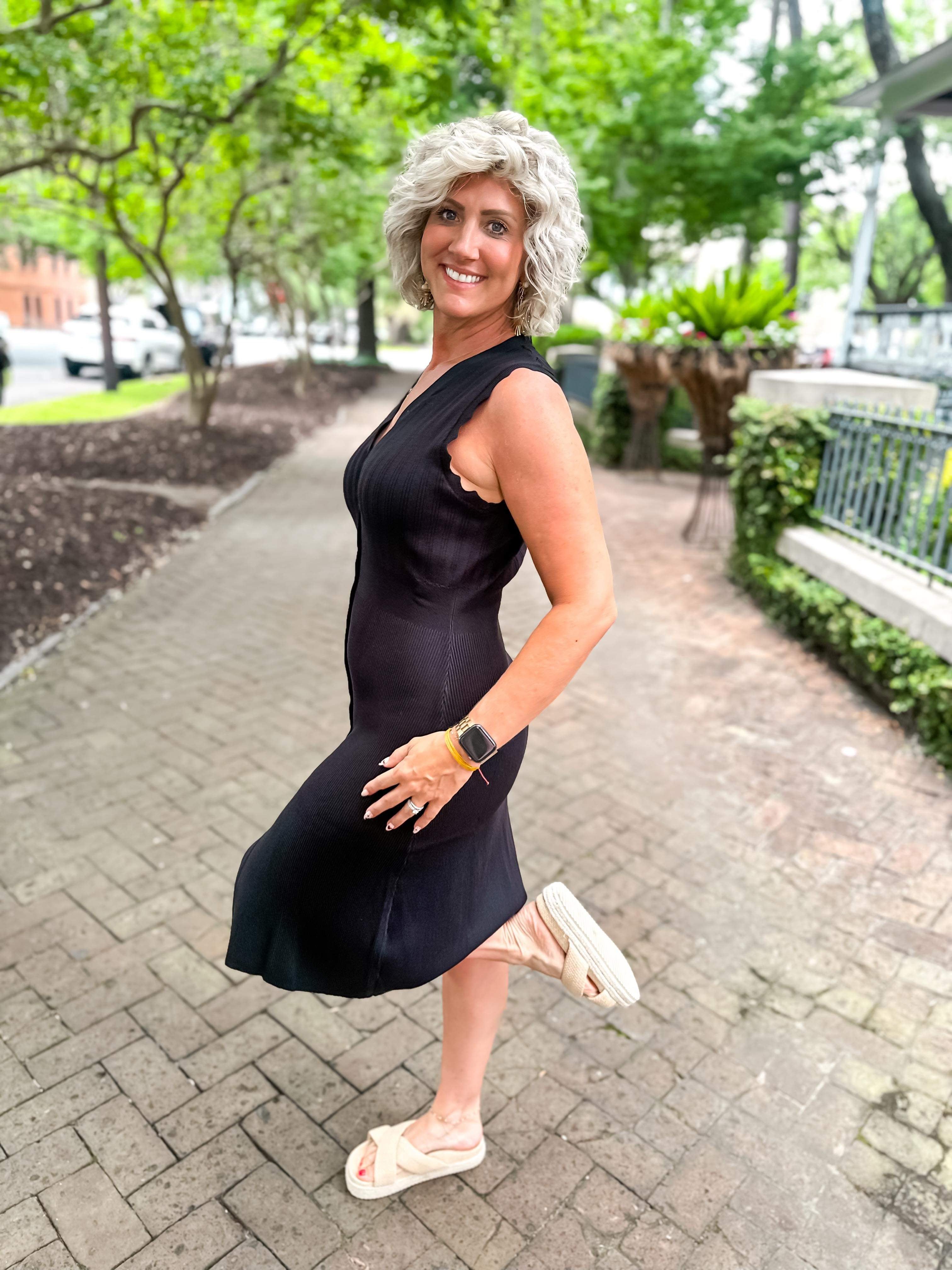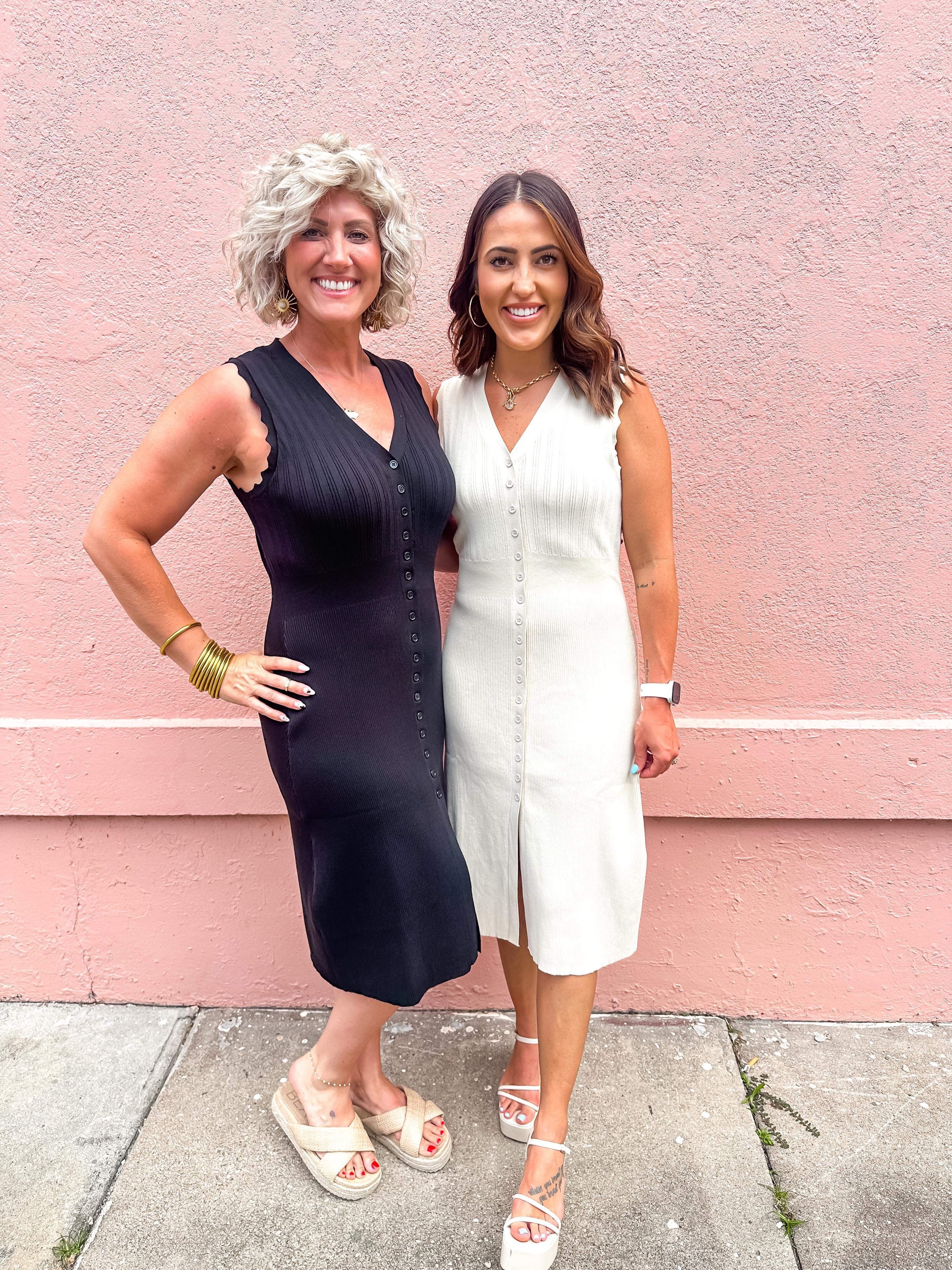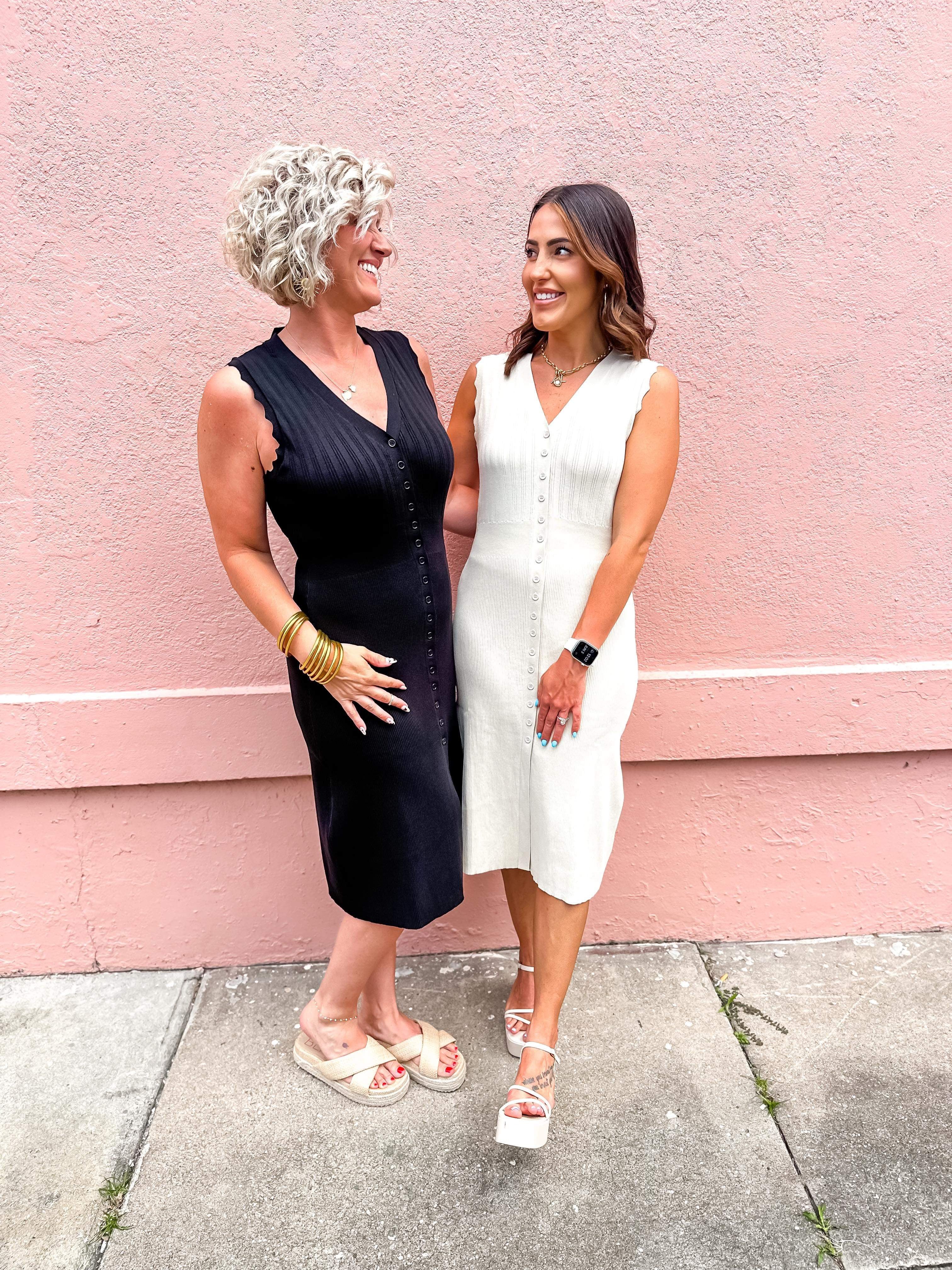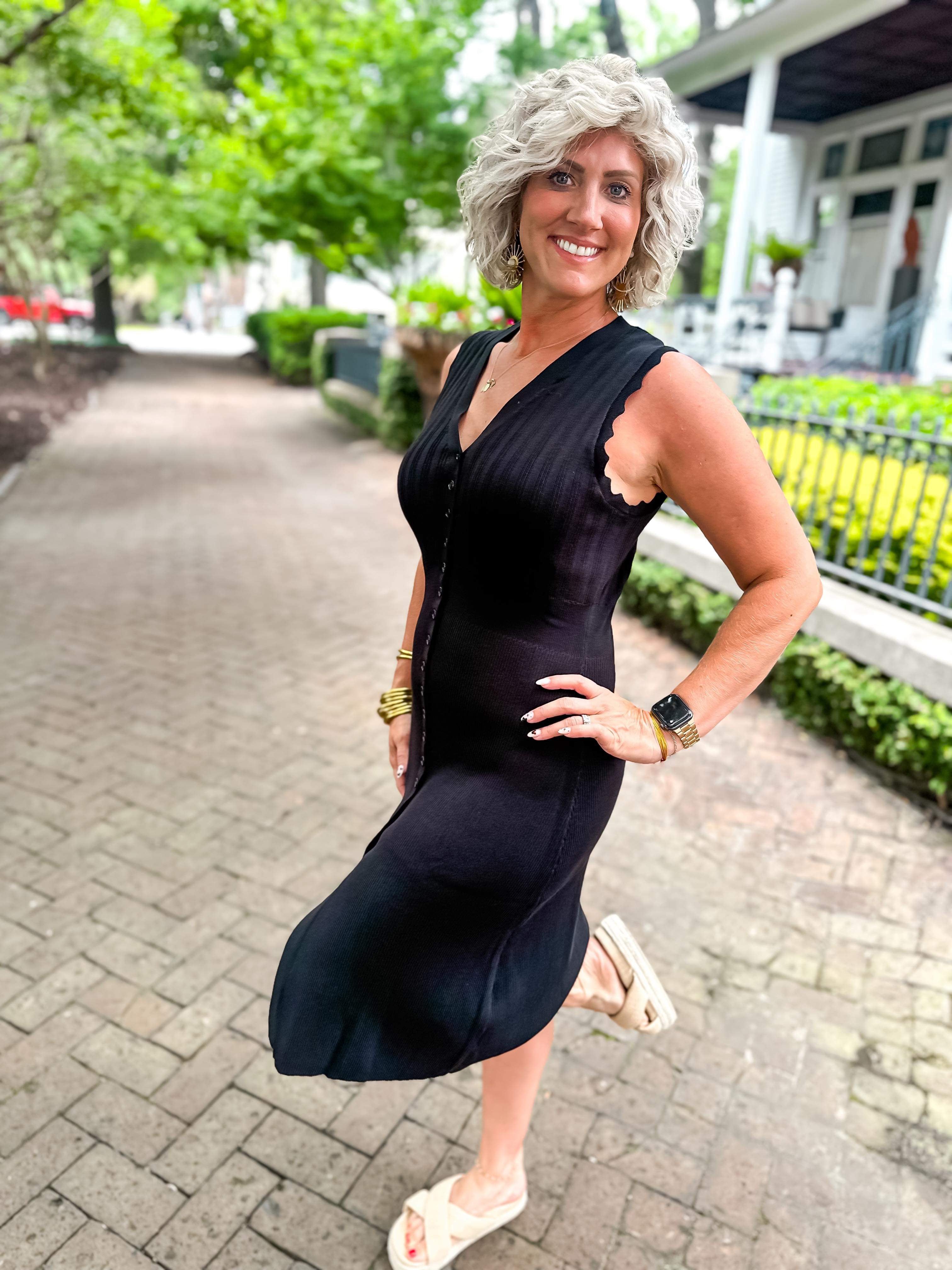 Solid ribbed v-neck sleeveless button down midi dress featuring wavy trim detail. Unlined. Knit. Non-sheer. Lightweight.