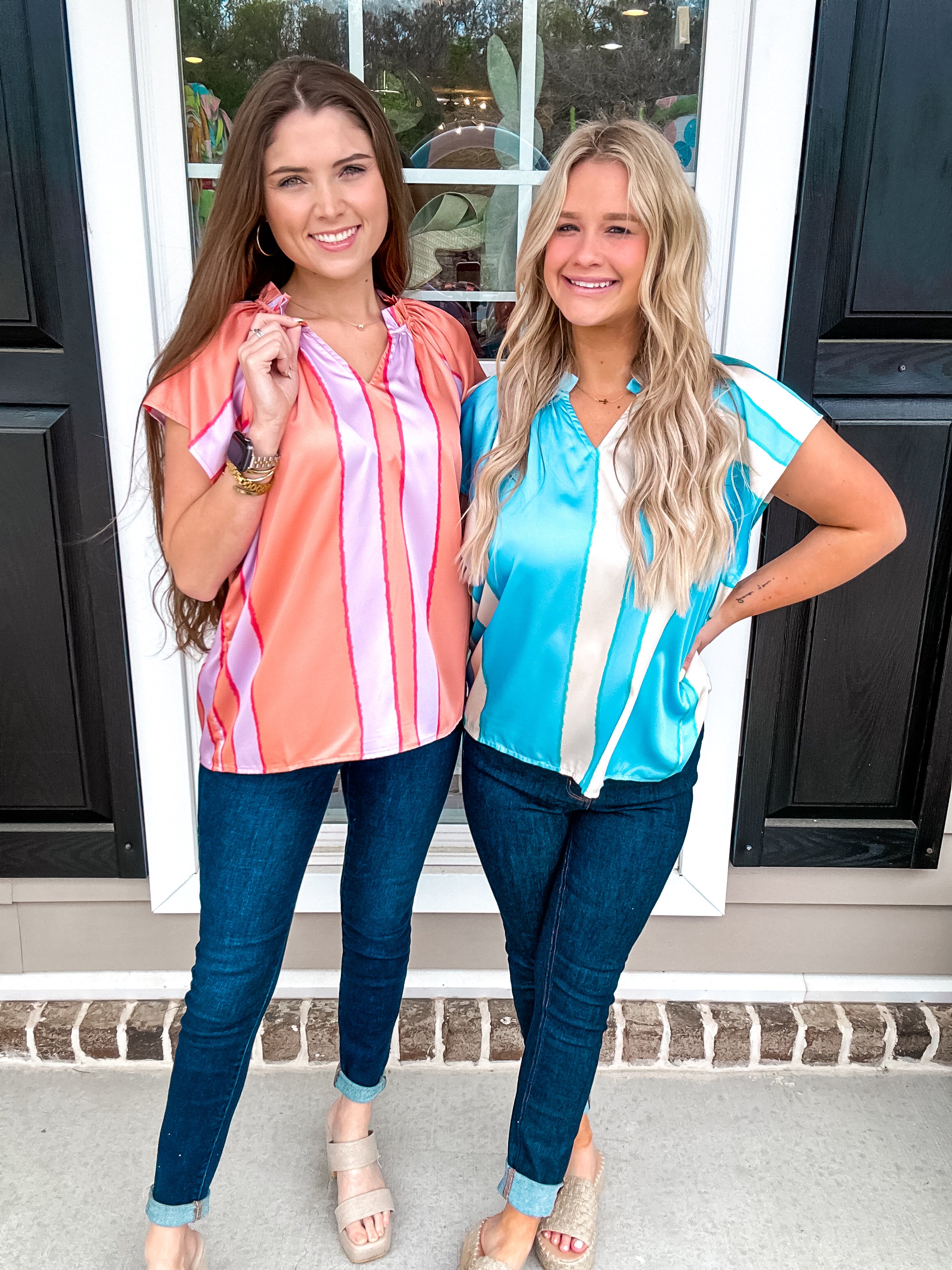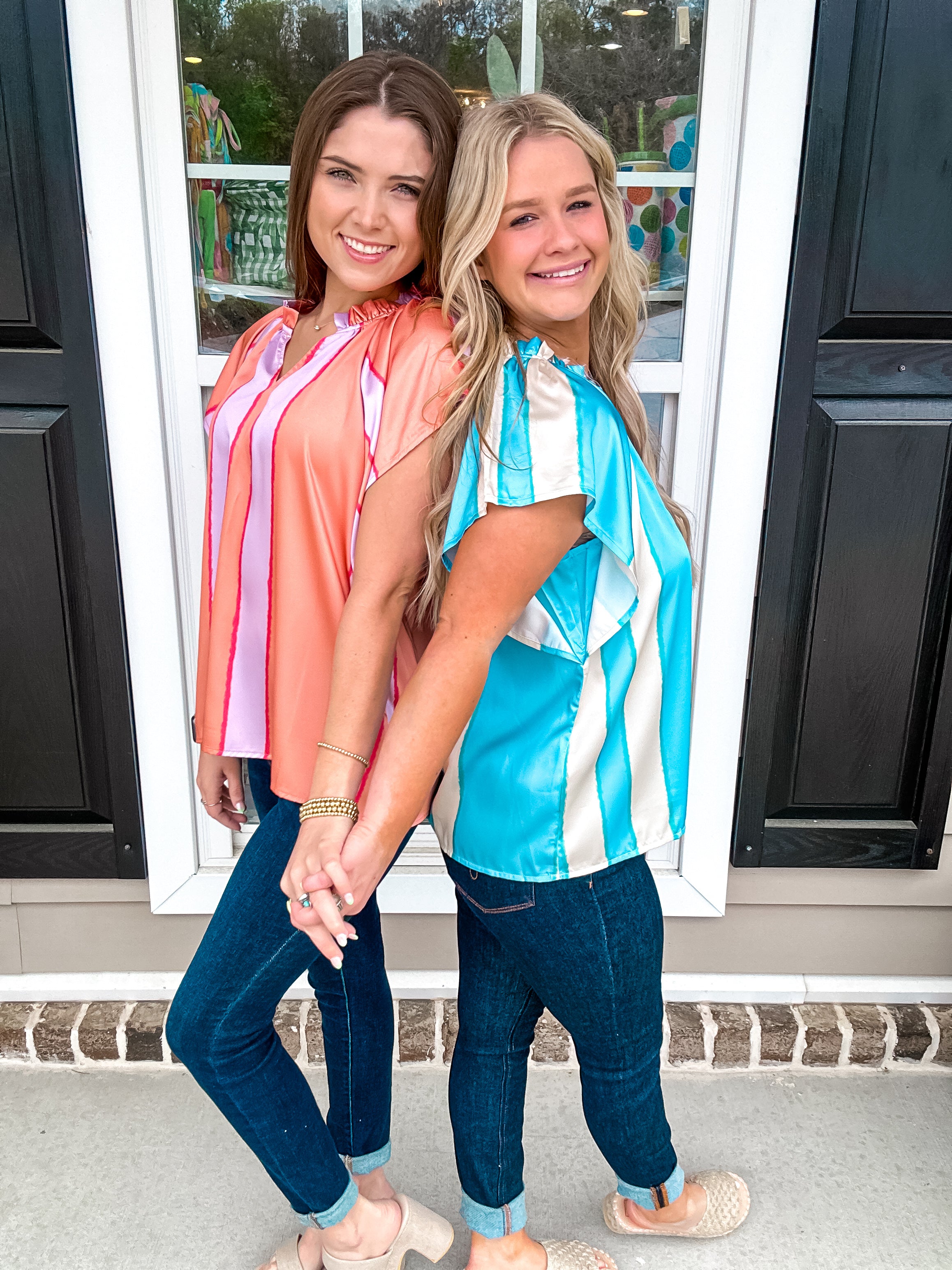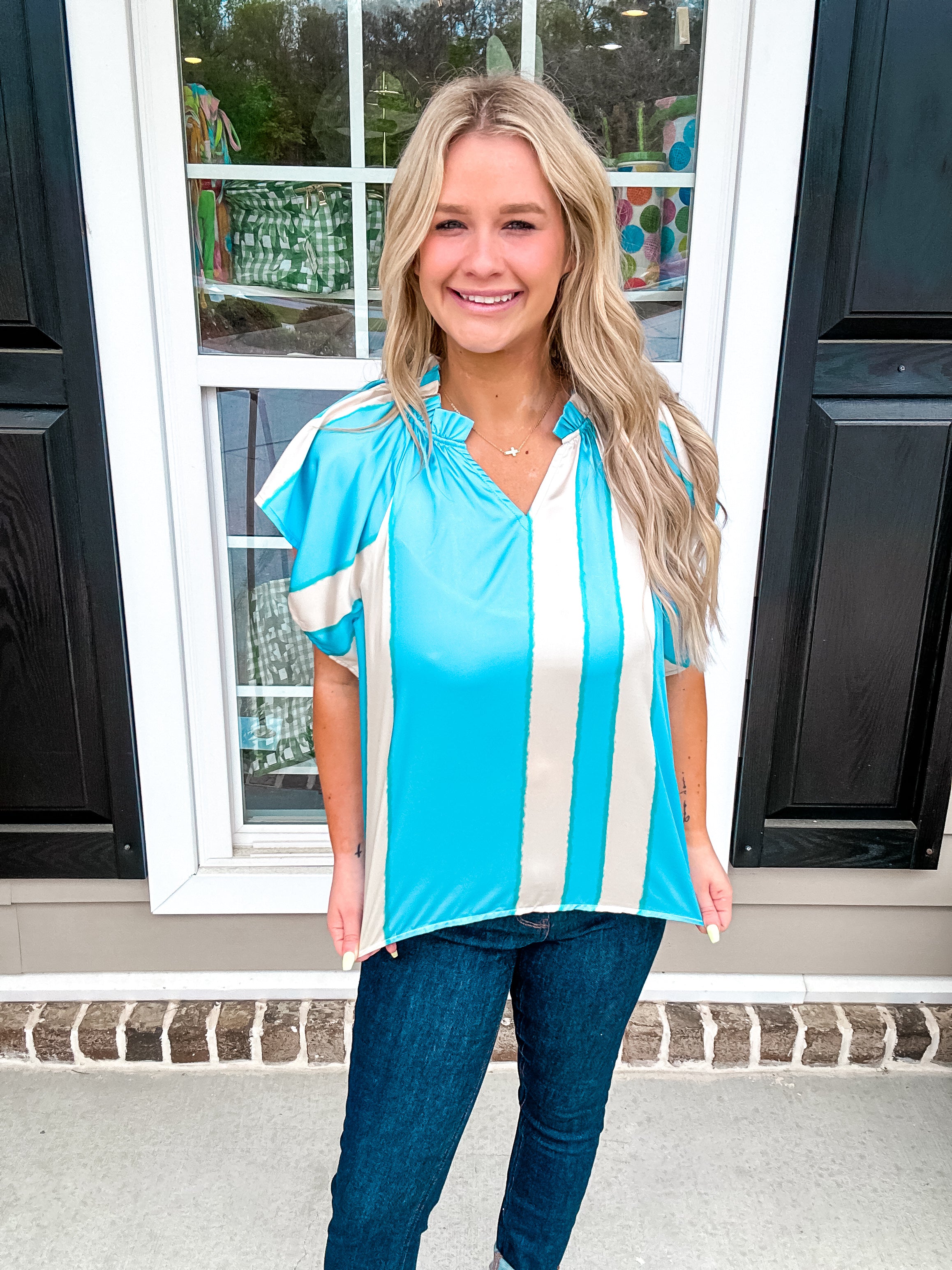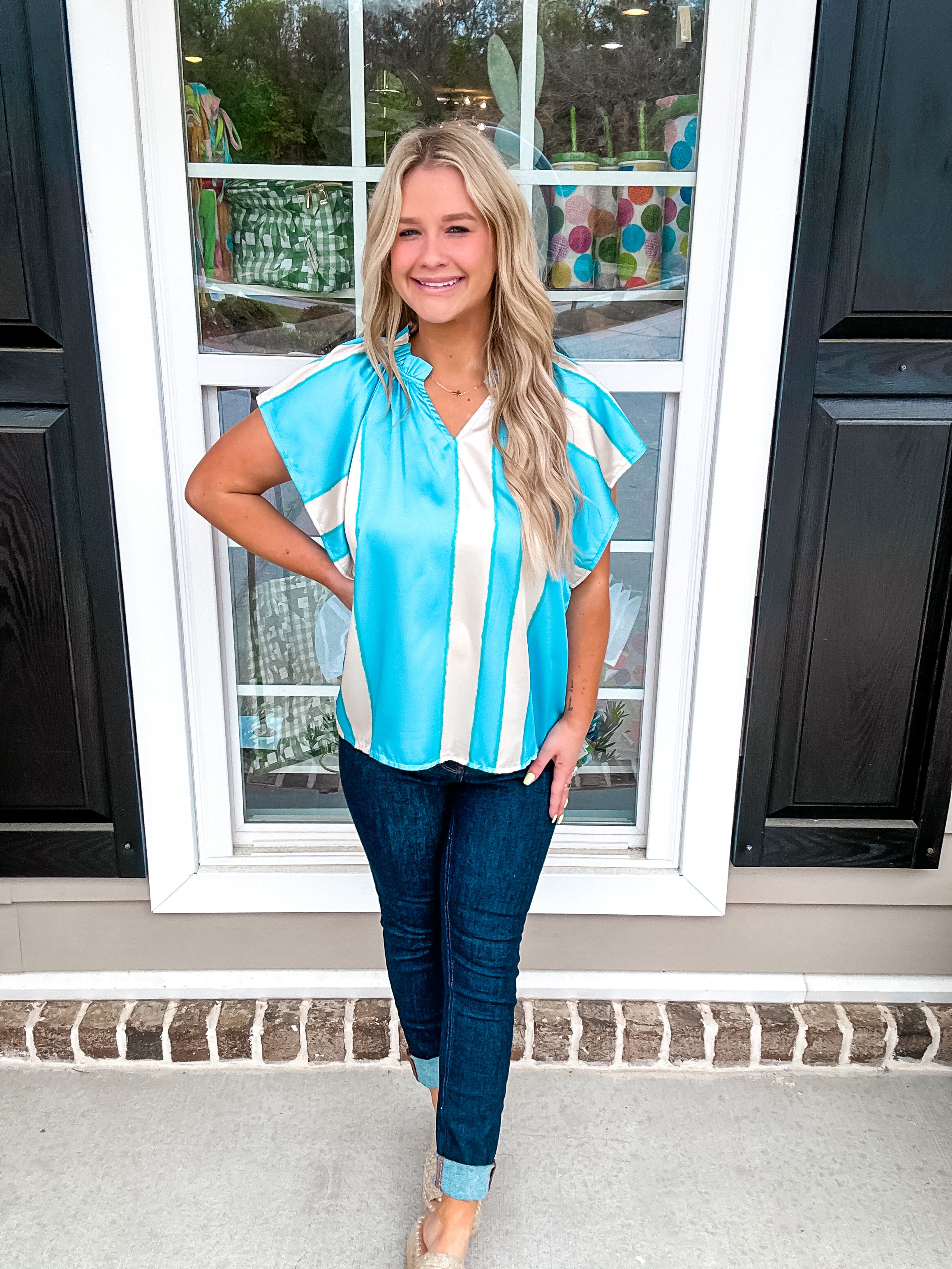 Color blocked stripe pintuck short sleeve top featuring ruffle detail at neckline. Unlined. Woven. Lightweight.