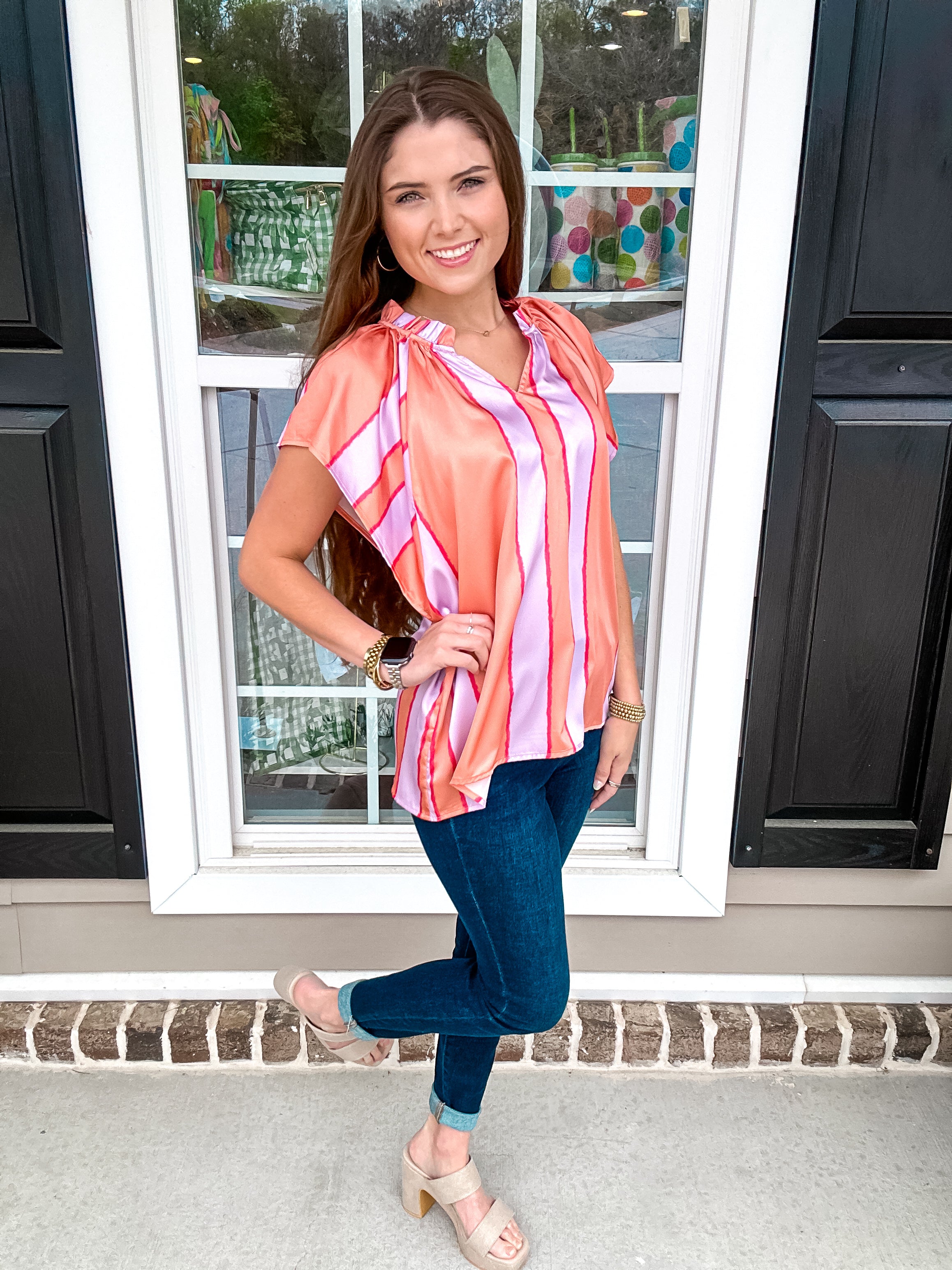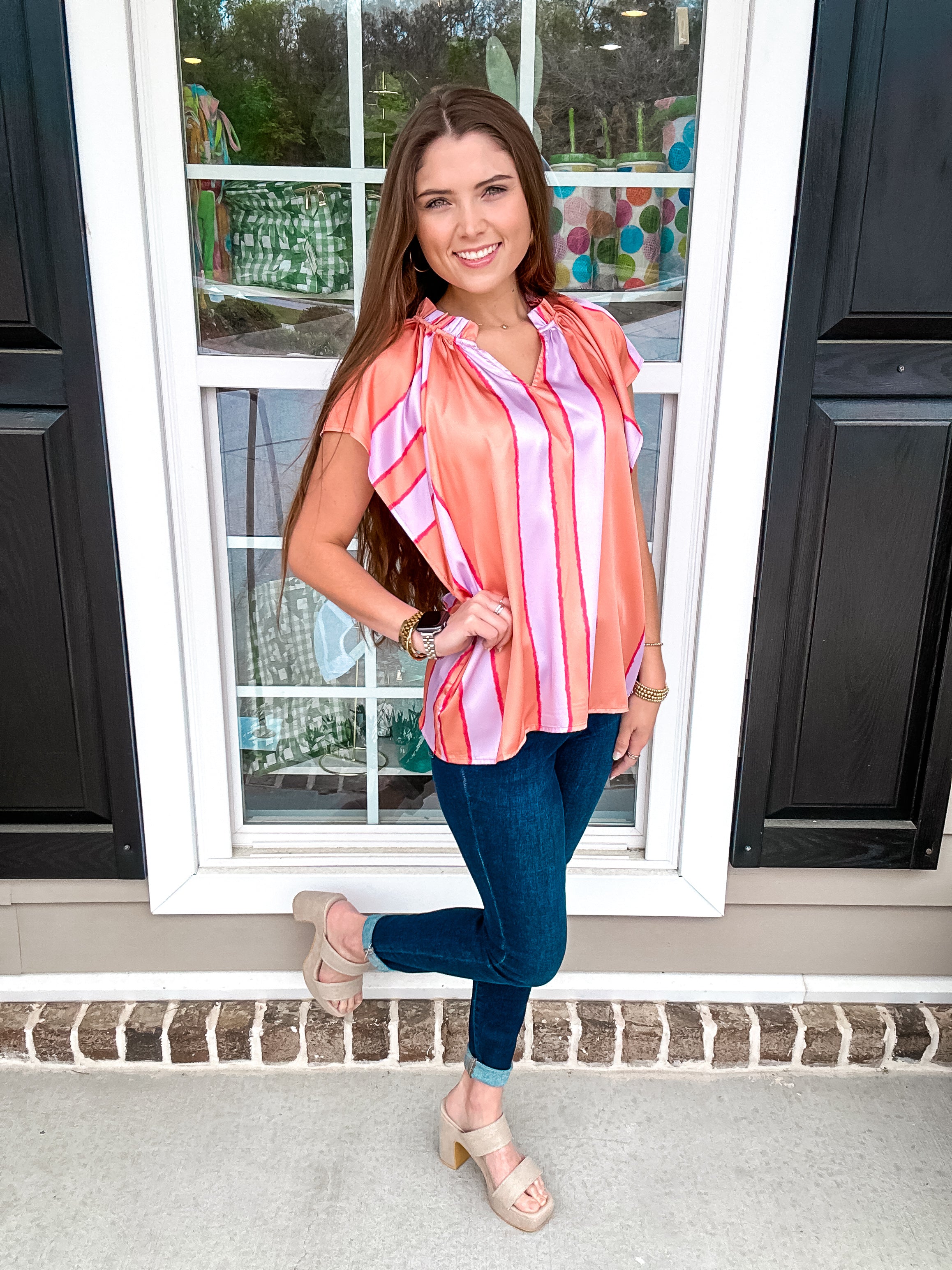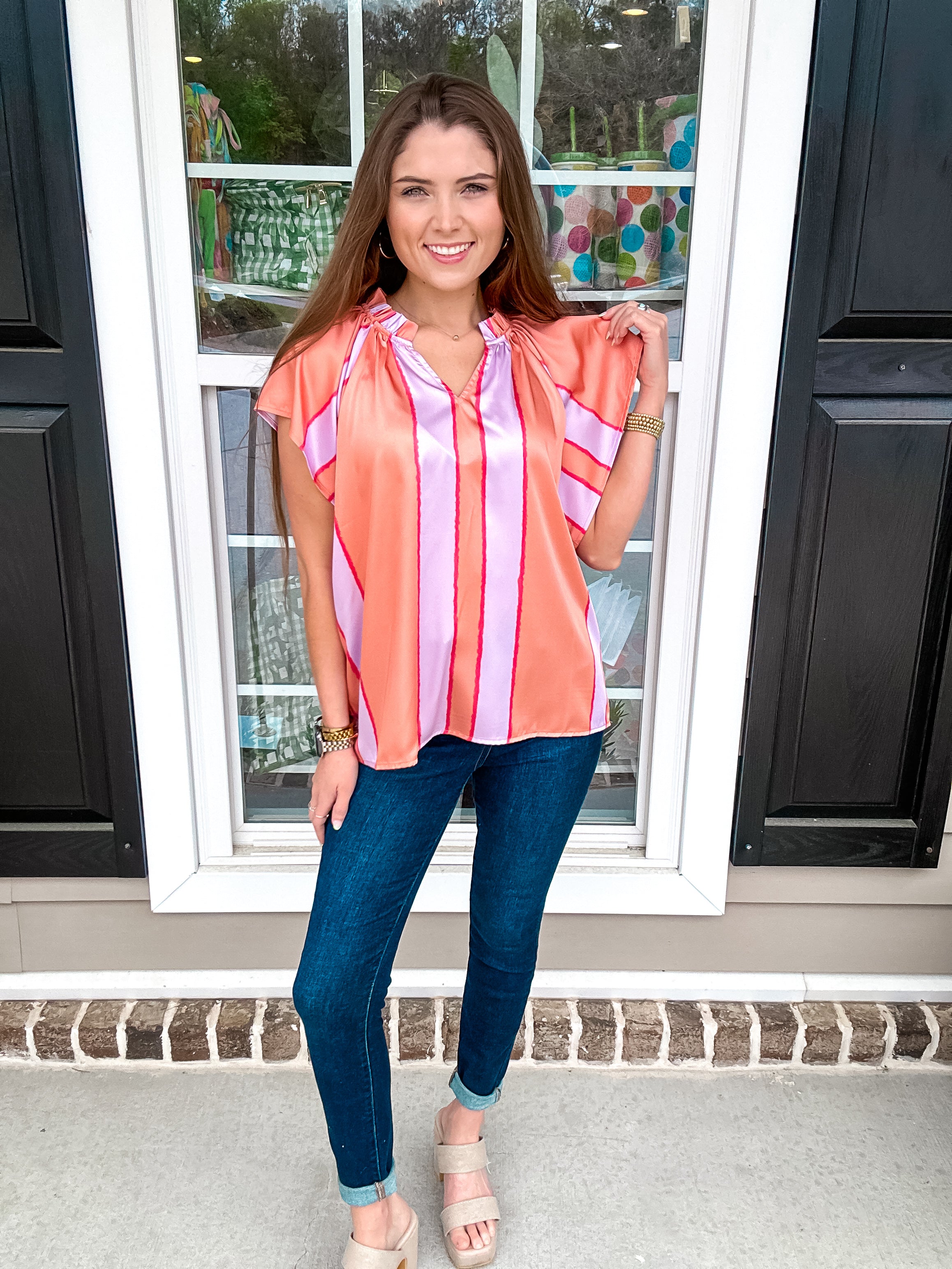 Color blocked stripe pintuck short sleeve top featuring ruffle detail at neckline. Unlined. Woven. Lightweight.