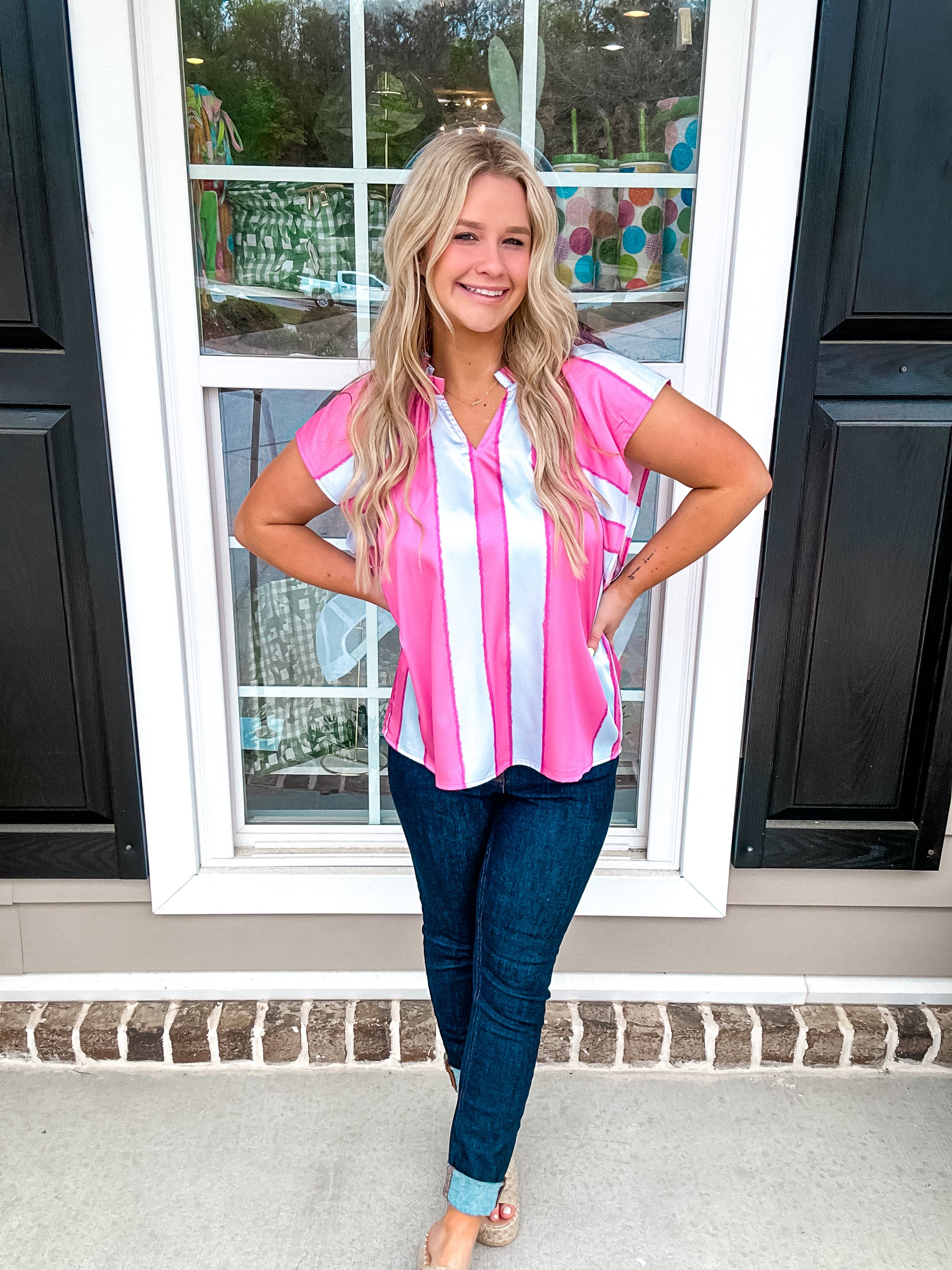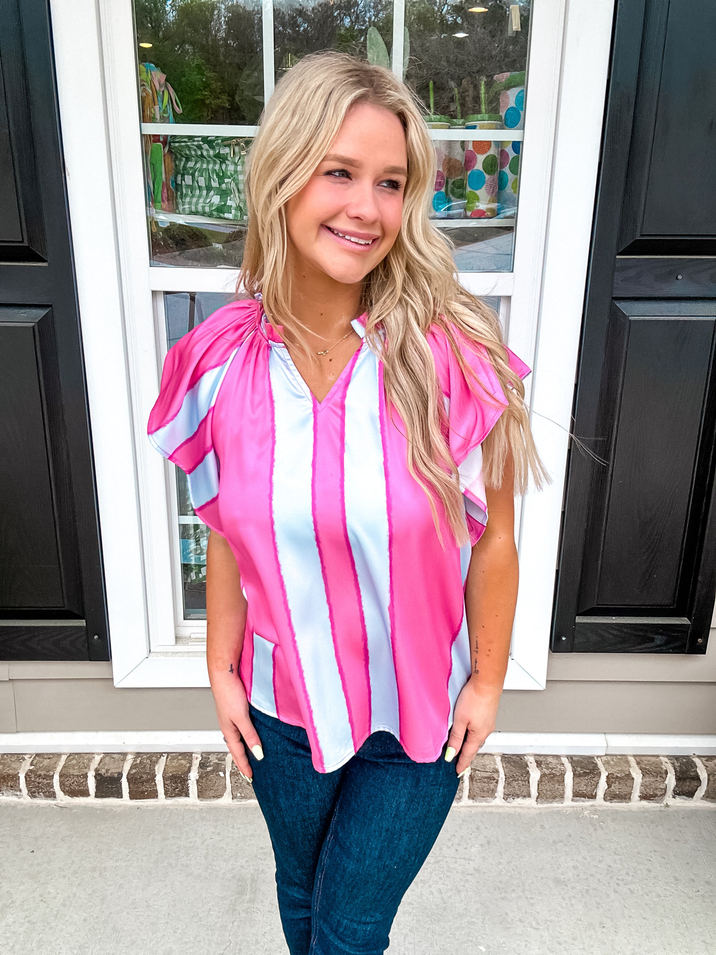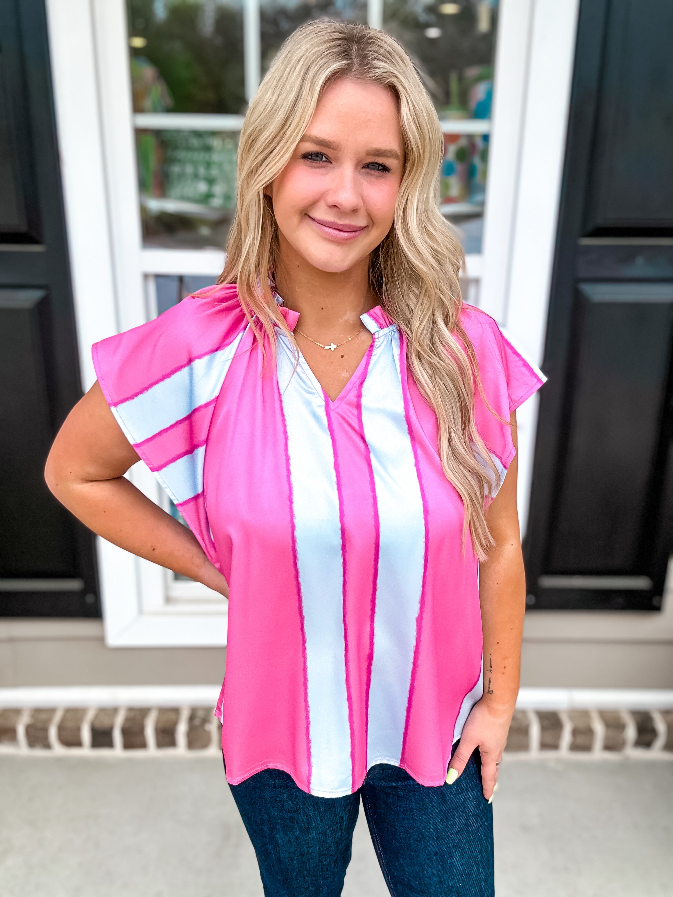 Color blocked stripe pintuck short sleeve top featuring ruffle detail at neckline. Unlined. Woven. Lightweight.