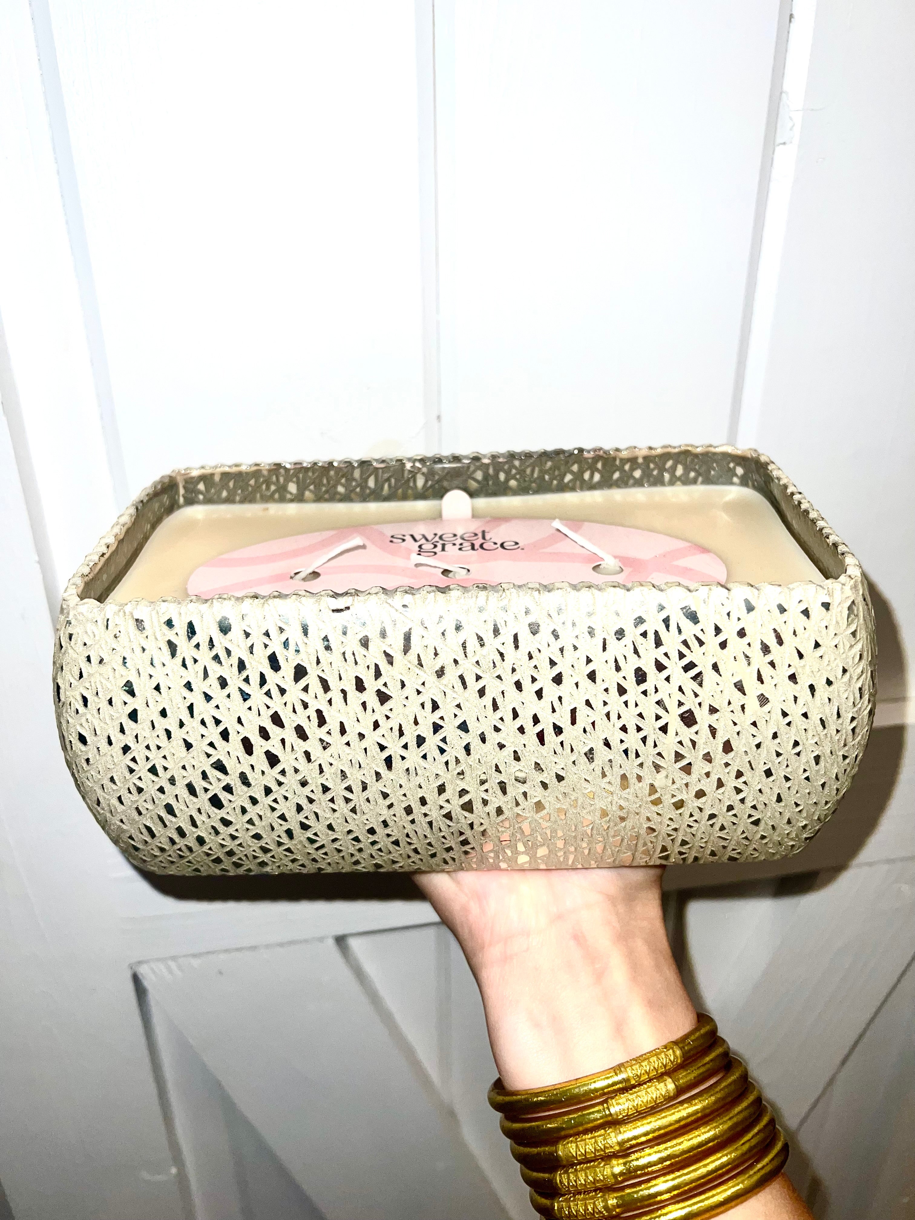 Add a touch of brilliance with Sweet Grace Candle #069. With its rounded rectangle shape and striking silver mosaic finish, this candle catches and reflects the light for a shimmering effect that elevates any room. Filled with 39.5 oz of our exclusive soy-blend wax and three wicks for an even burn, it offers up to 93 hours of the iconic Sweet Grace fragrance you love.