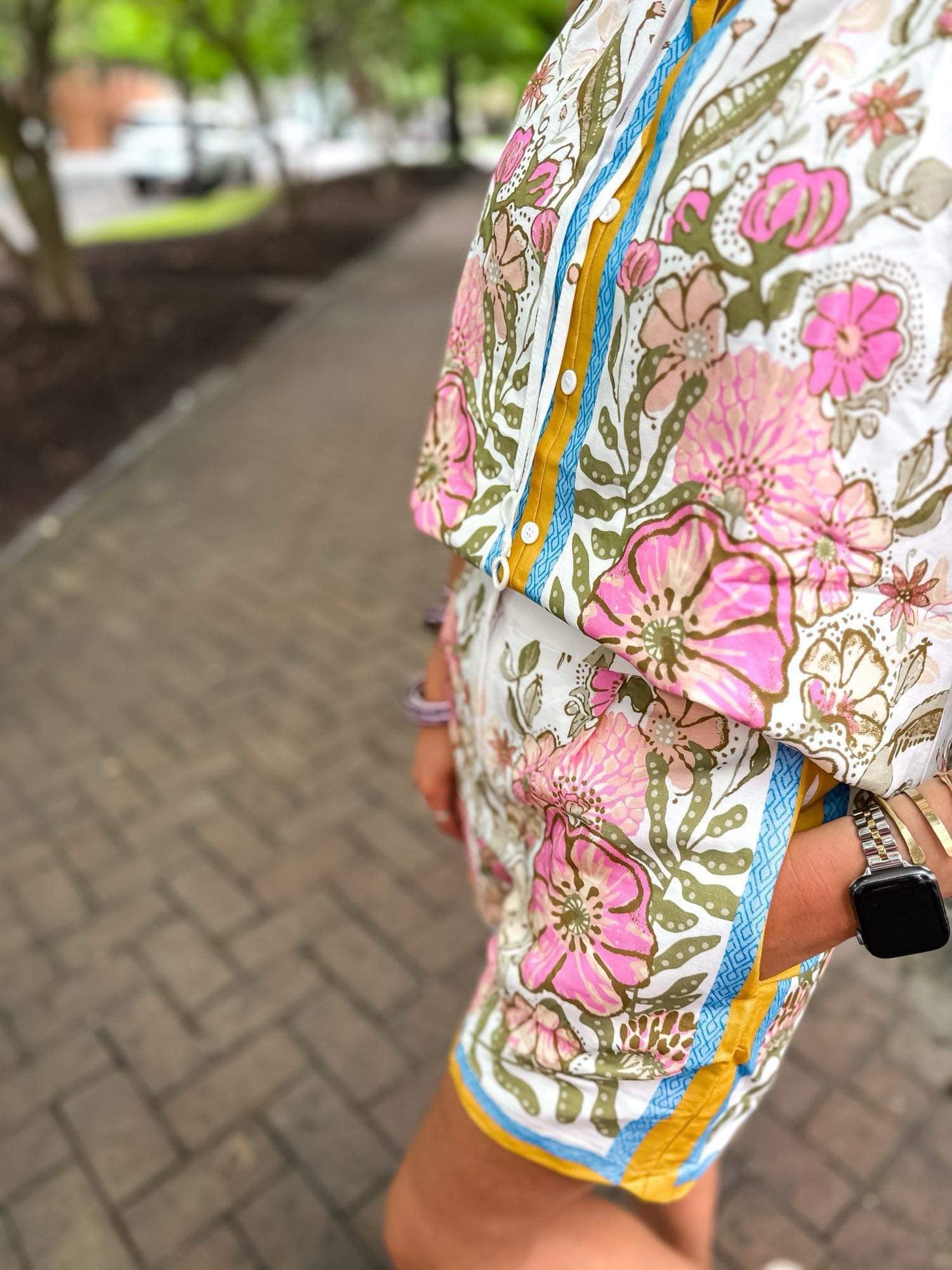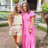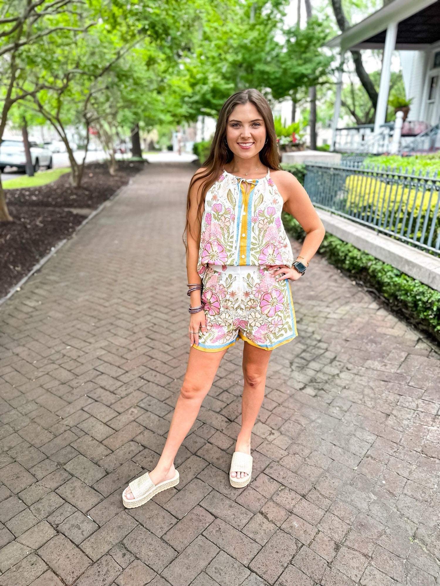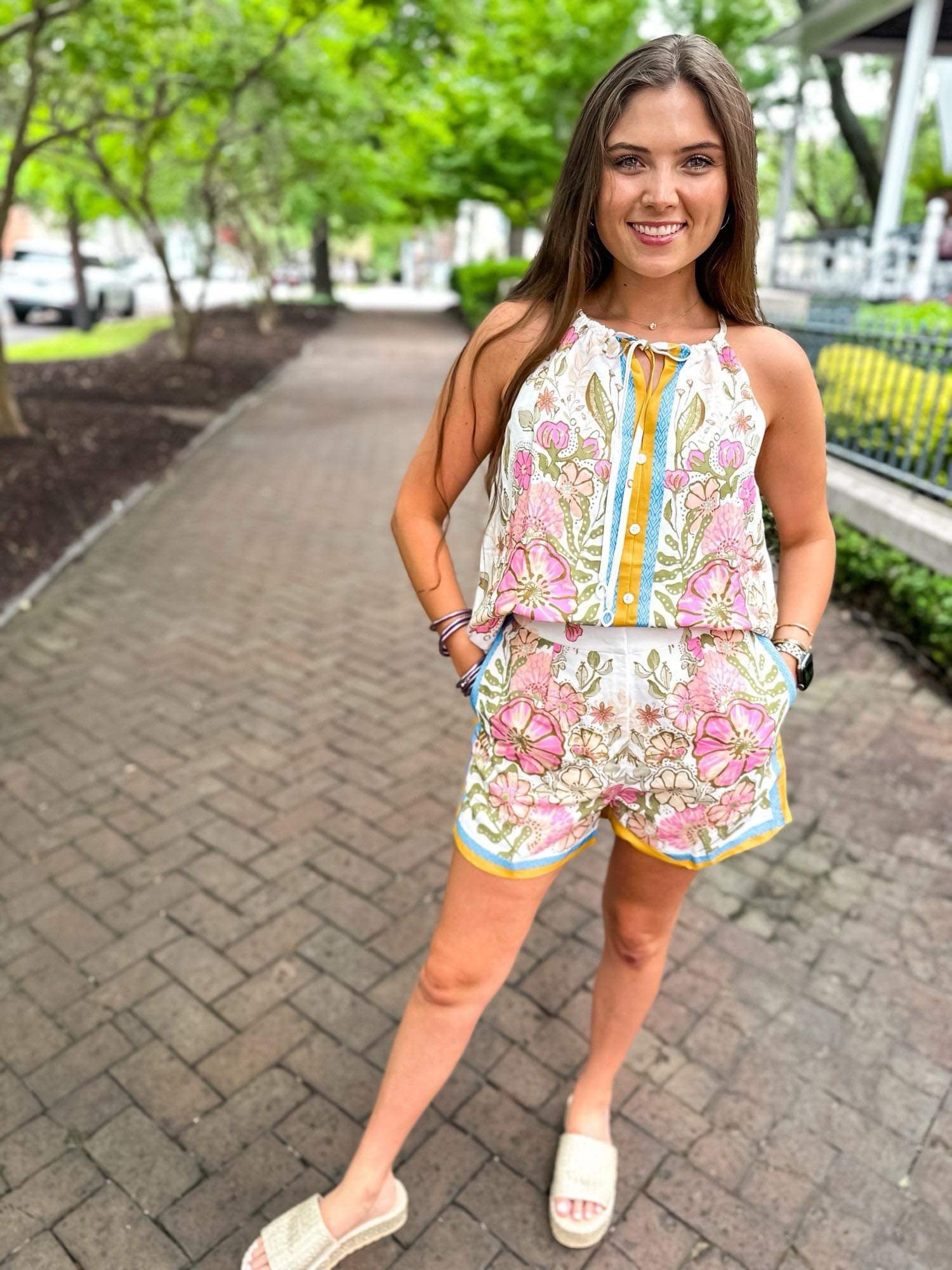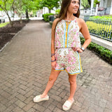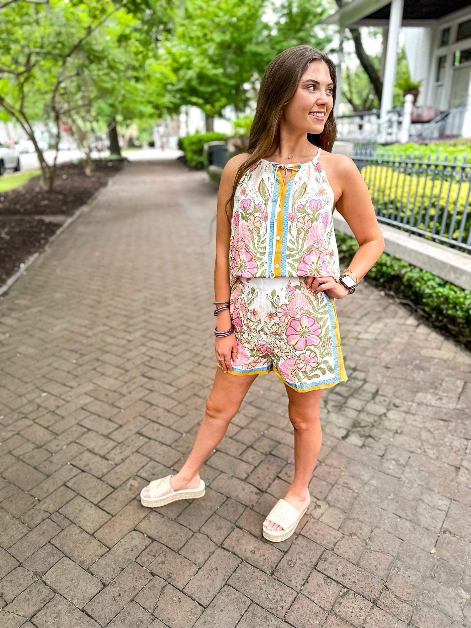 This set is perfect for summer and made of a lightweight fabric for the warm weather. The top is a tank style and is sold with the matching shorts. The se fits true to size and the shorts have elastic in the band, along with a zipper and button clasp.