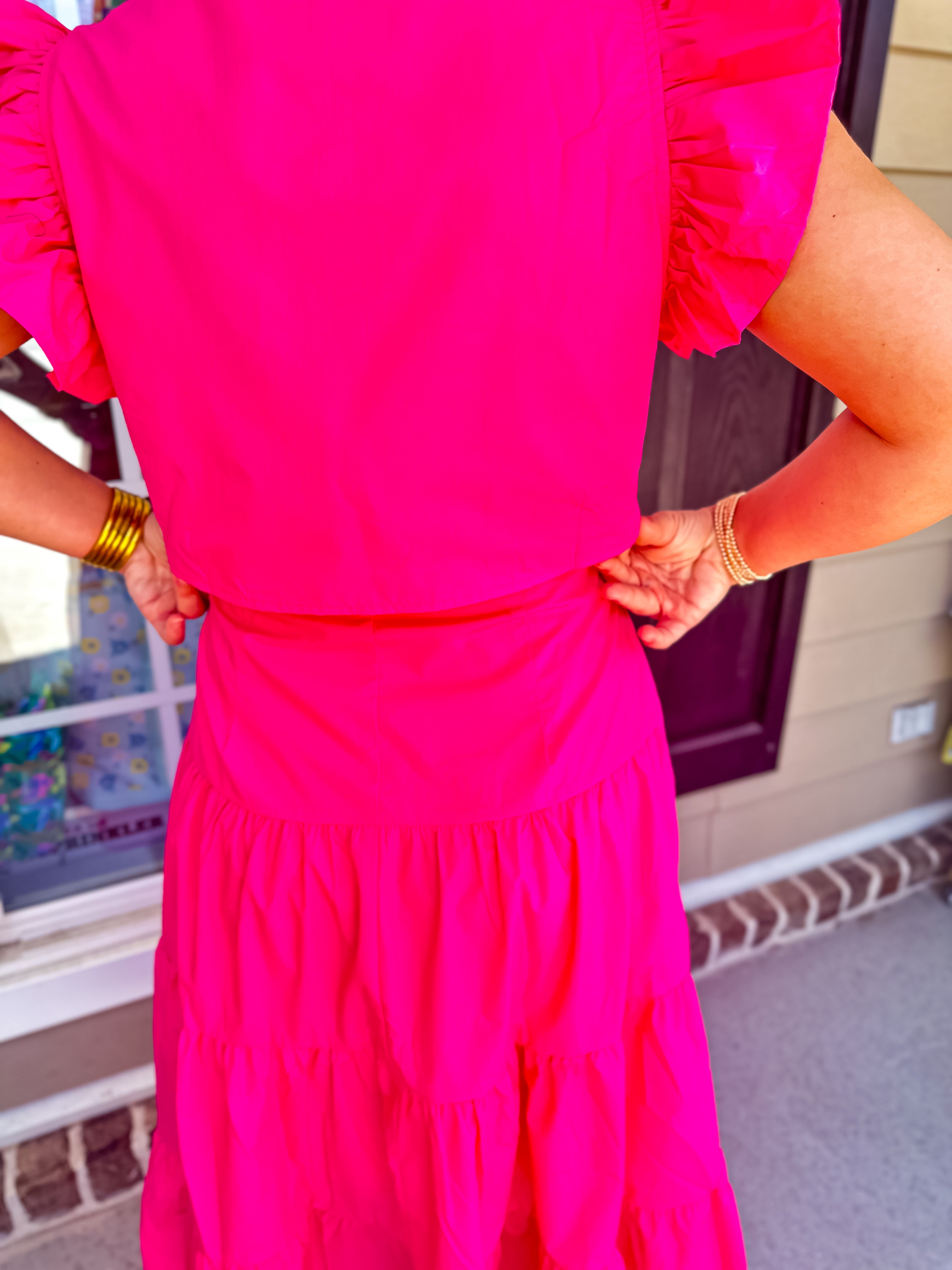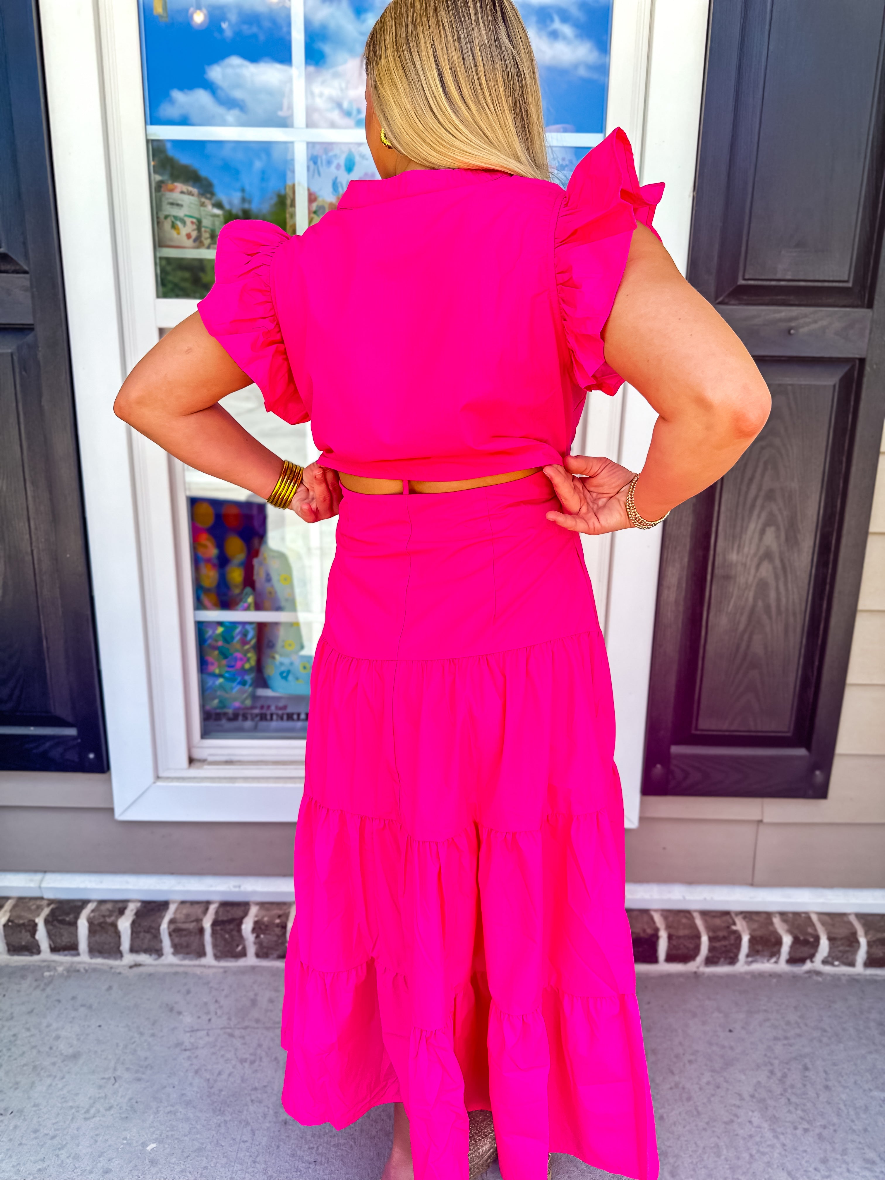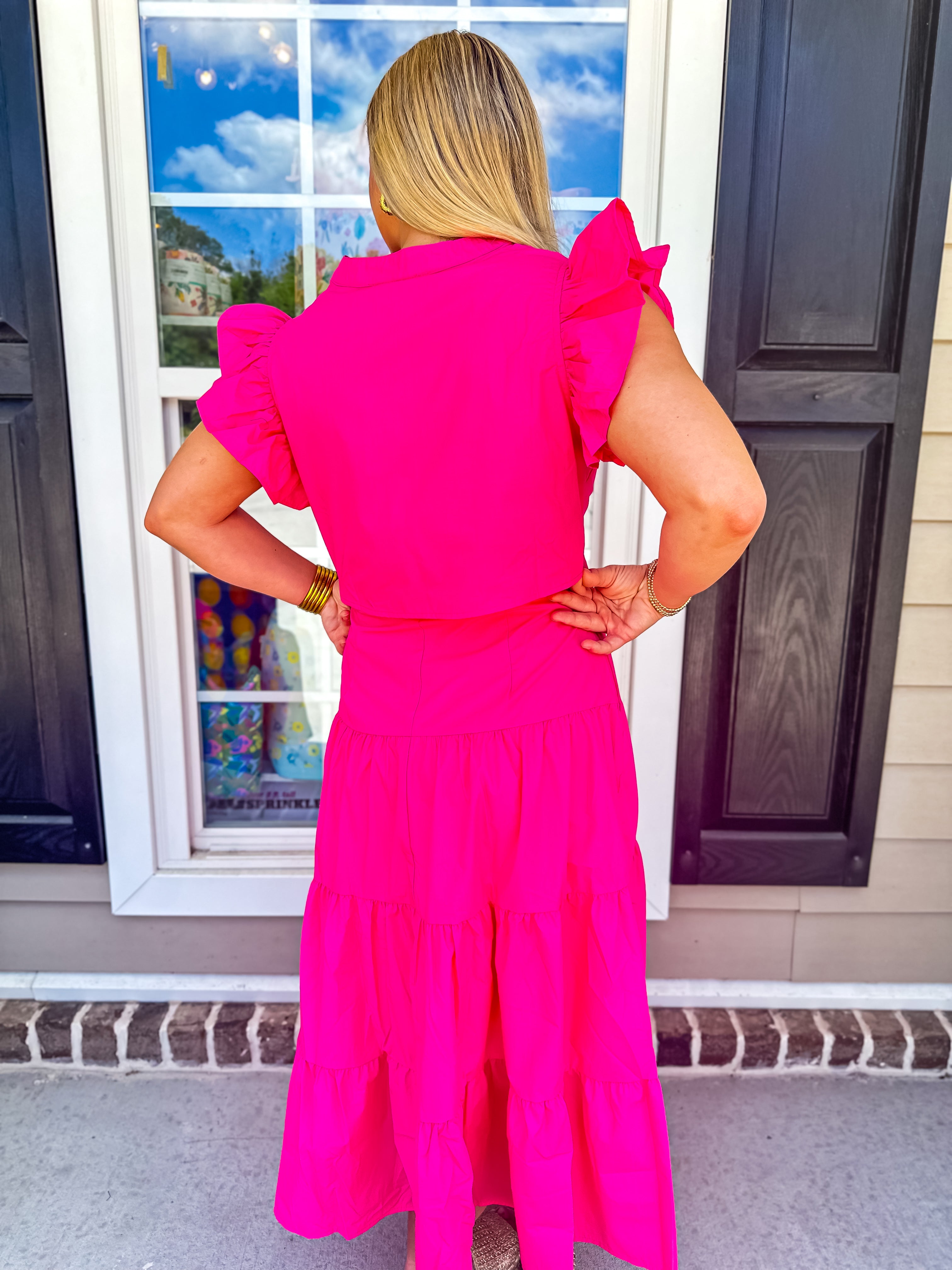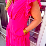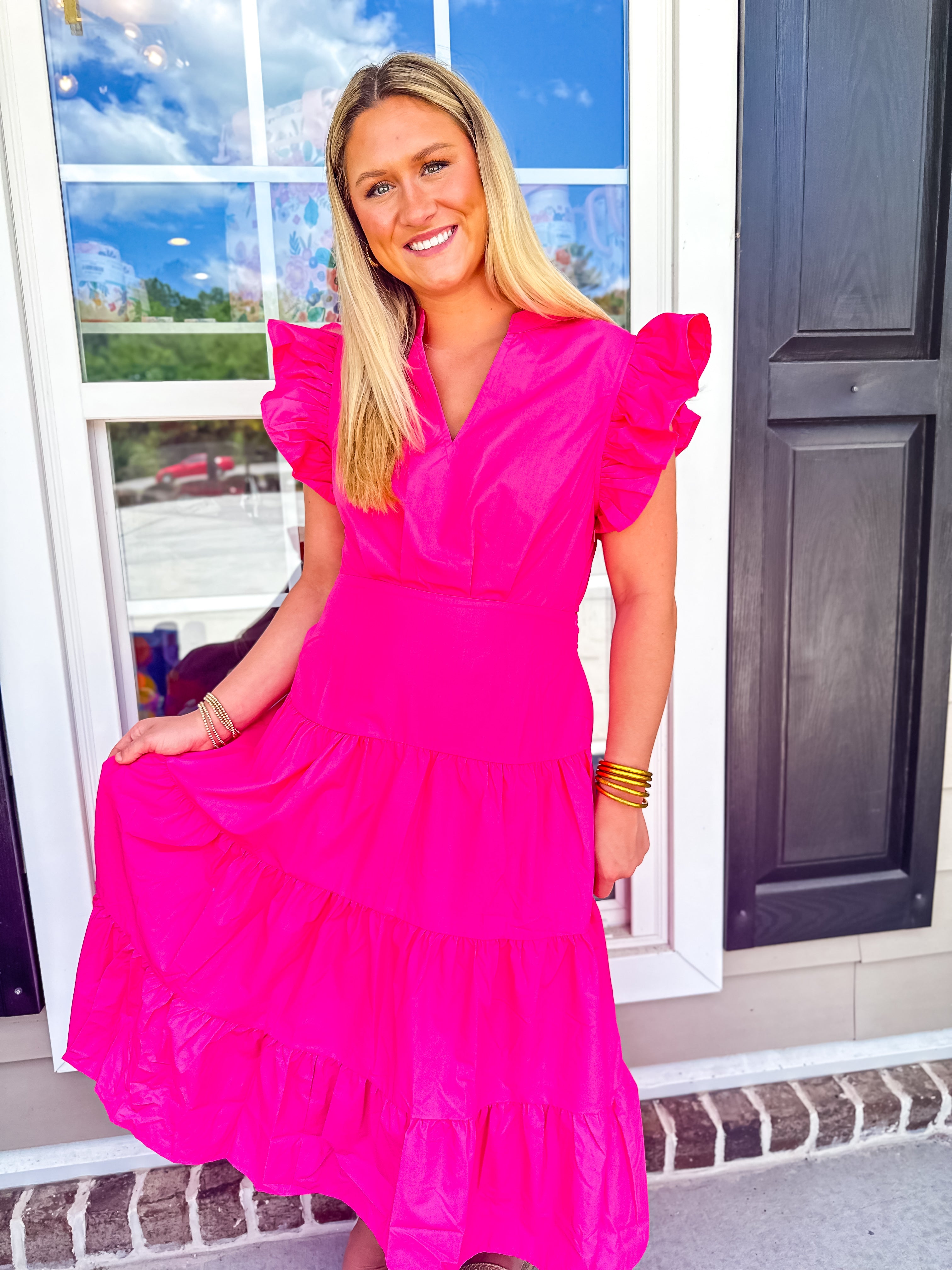 Solid v-neck ruffle sleeve midi dress featuring open back detail at back. Pocket at sides. Zipper closure at side. Lined. Woven. Non-sheer. Lightweight.