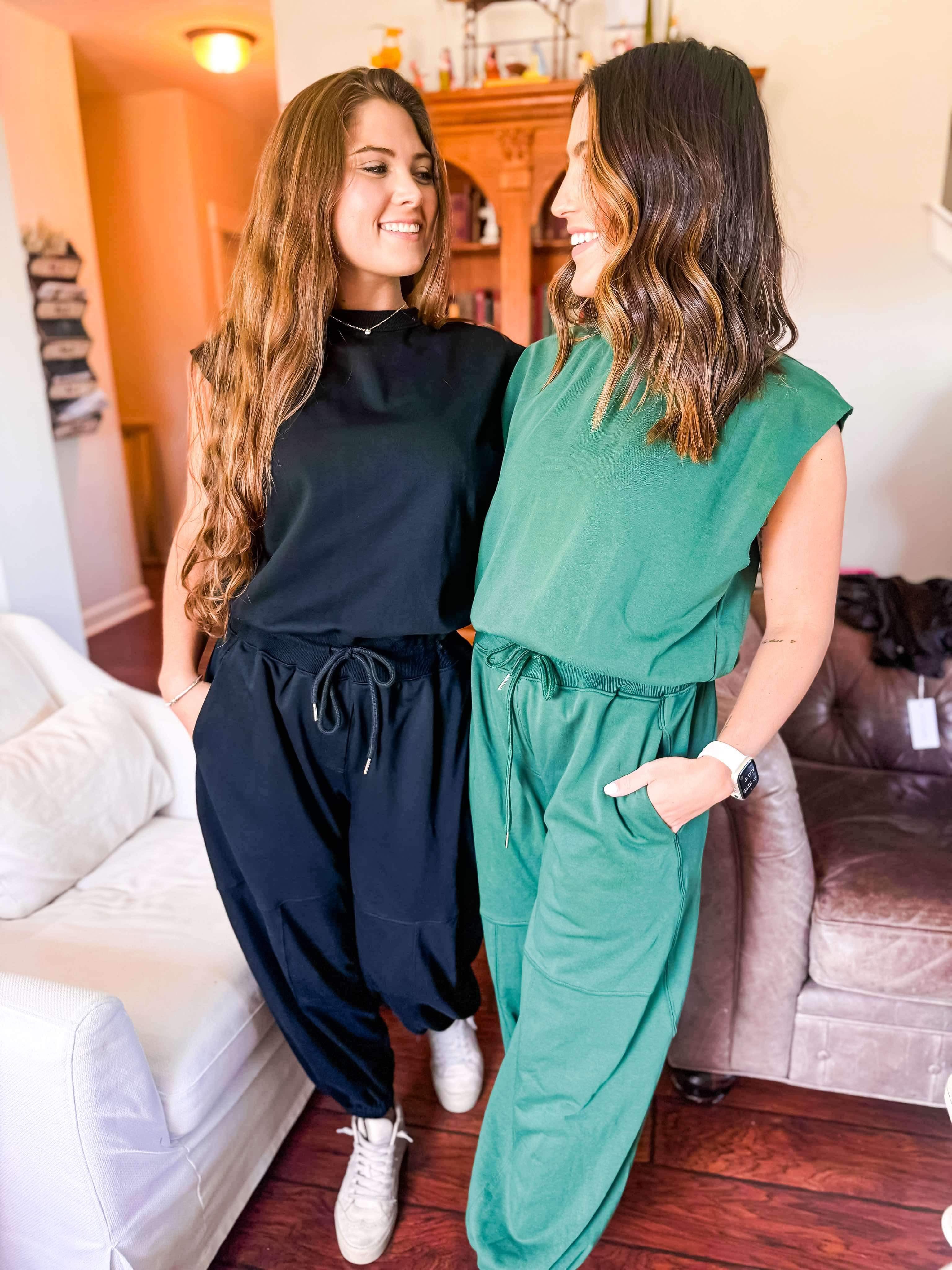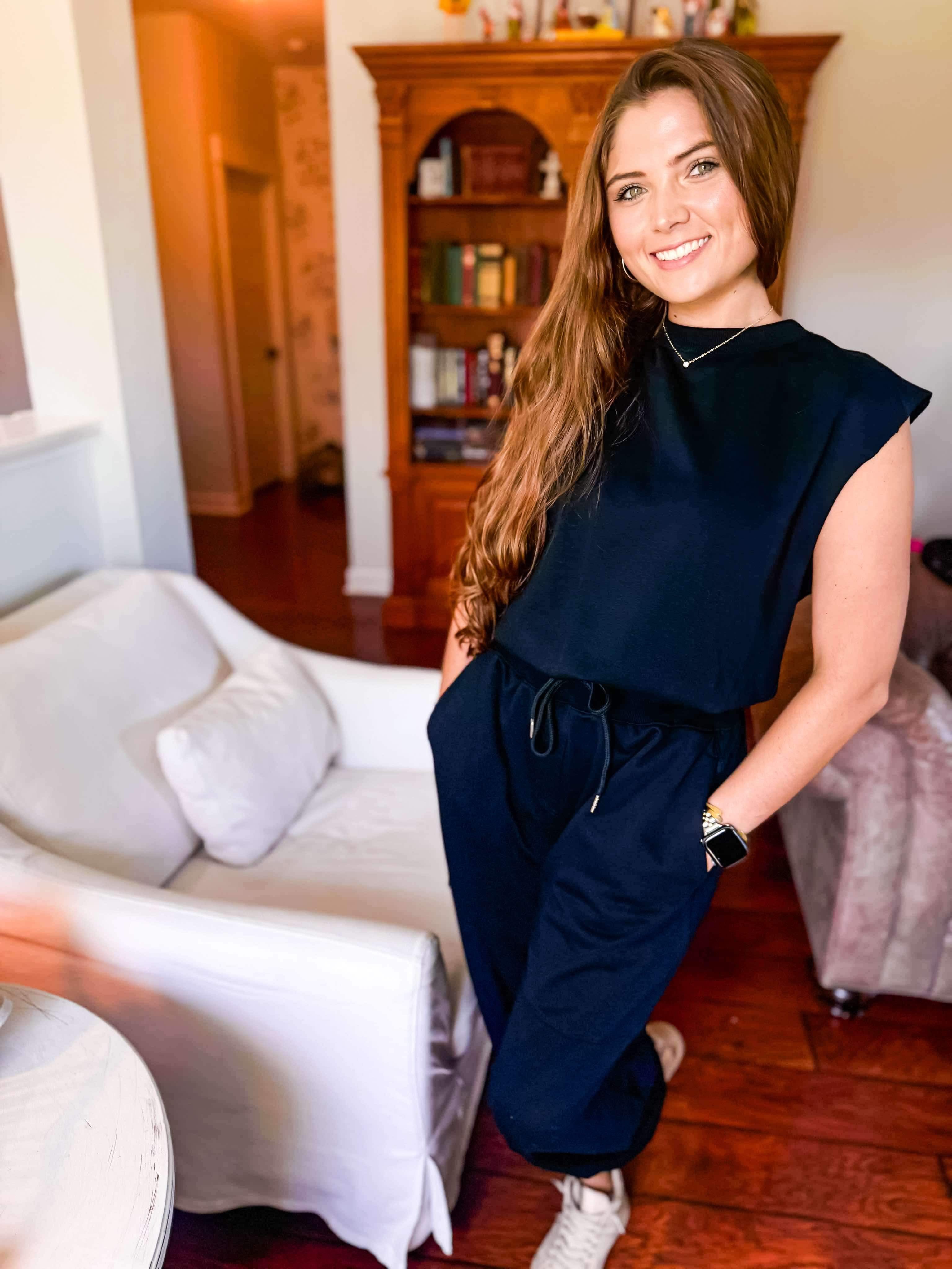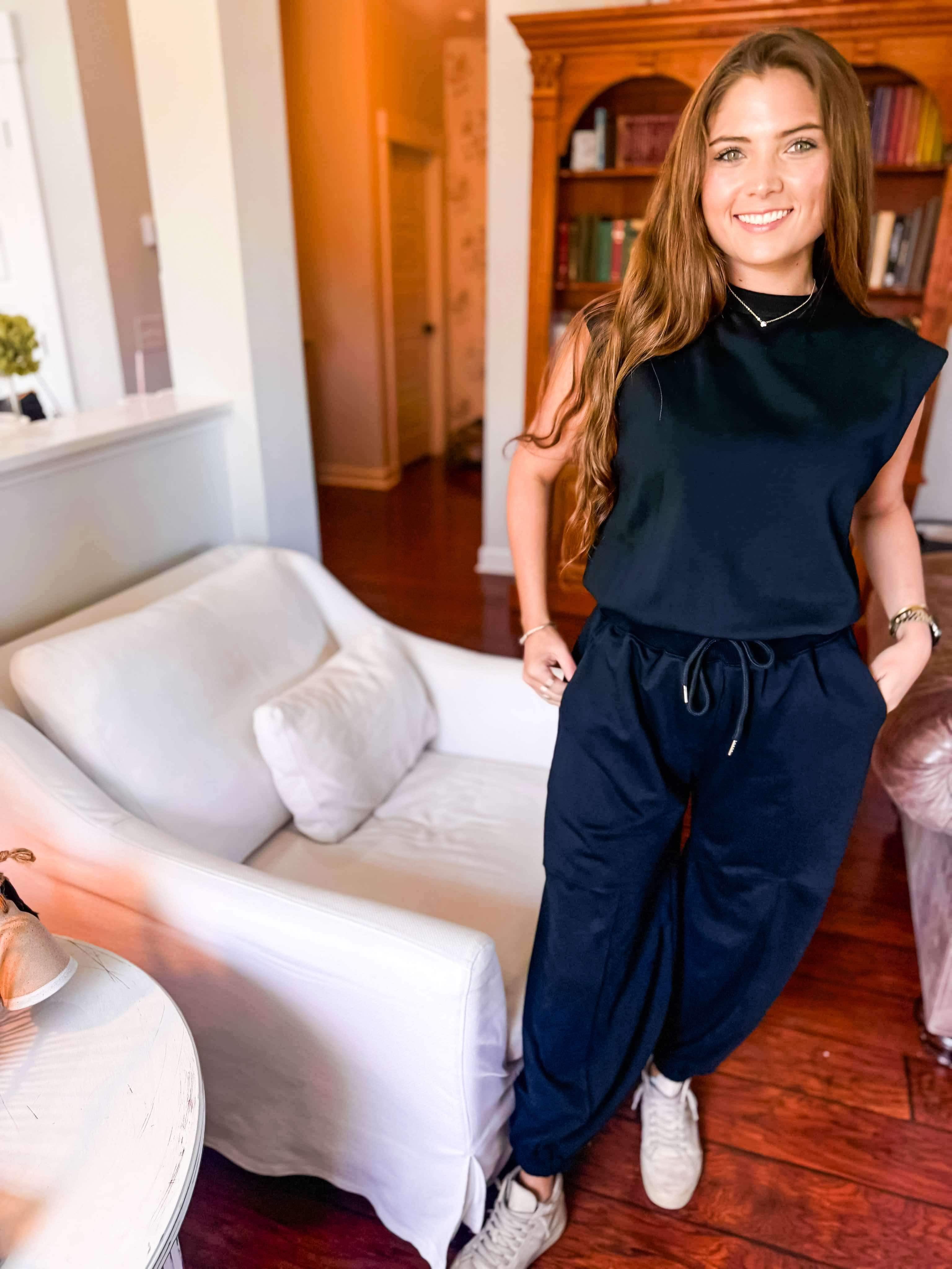 Solid round neck sleeveless oversized jumpsuit featuring self tie at waist.
