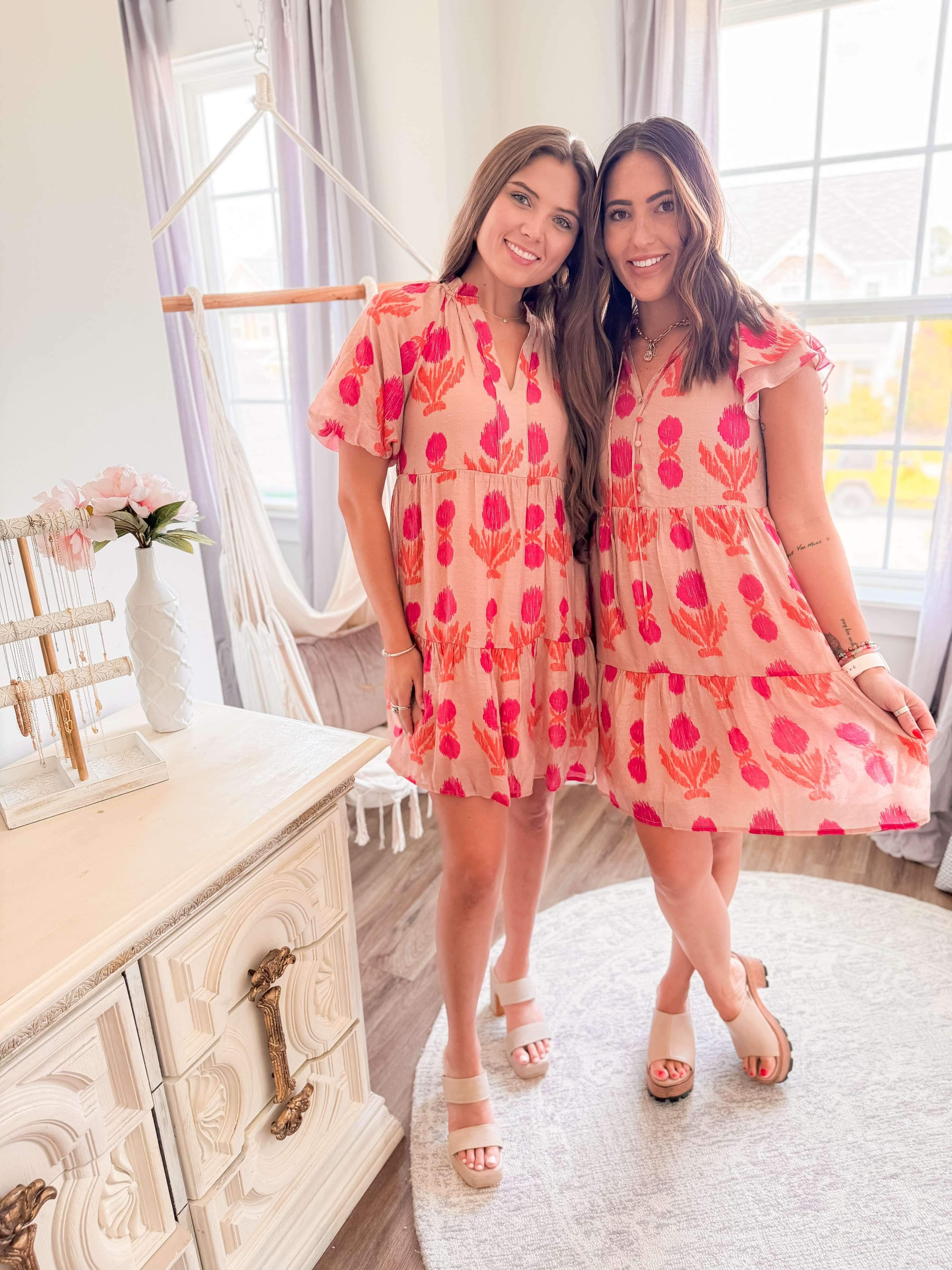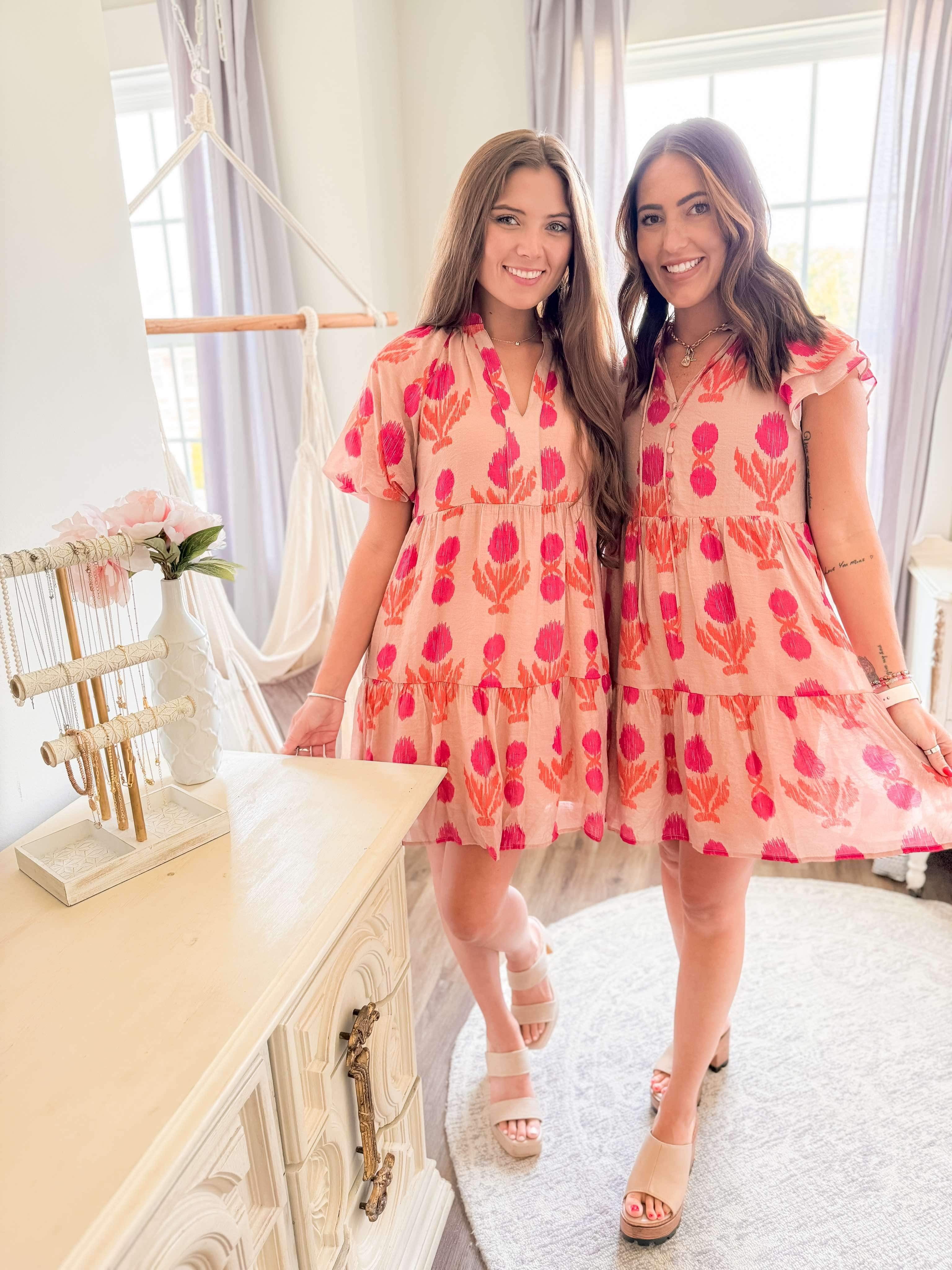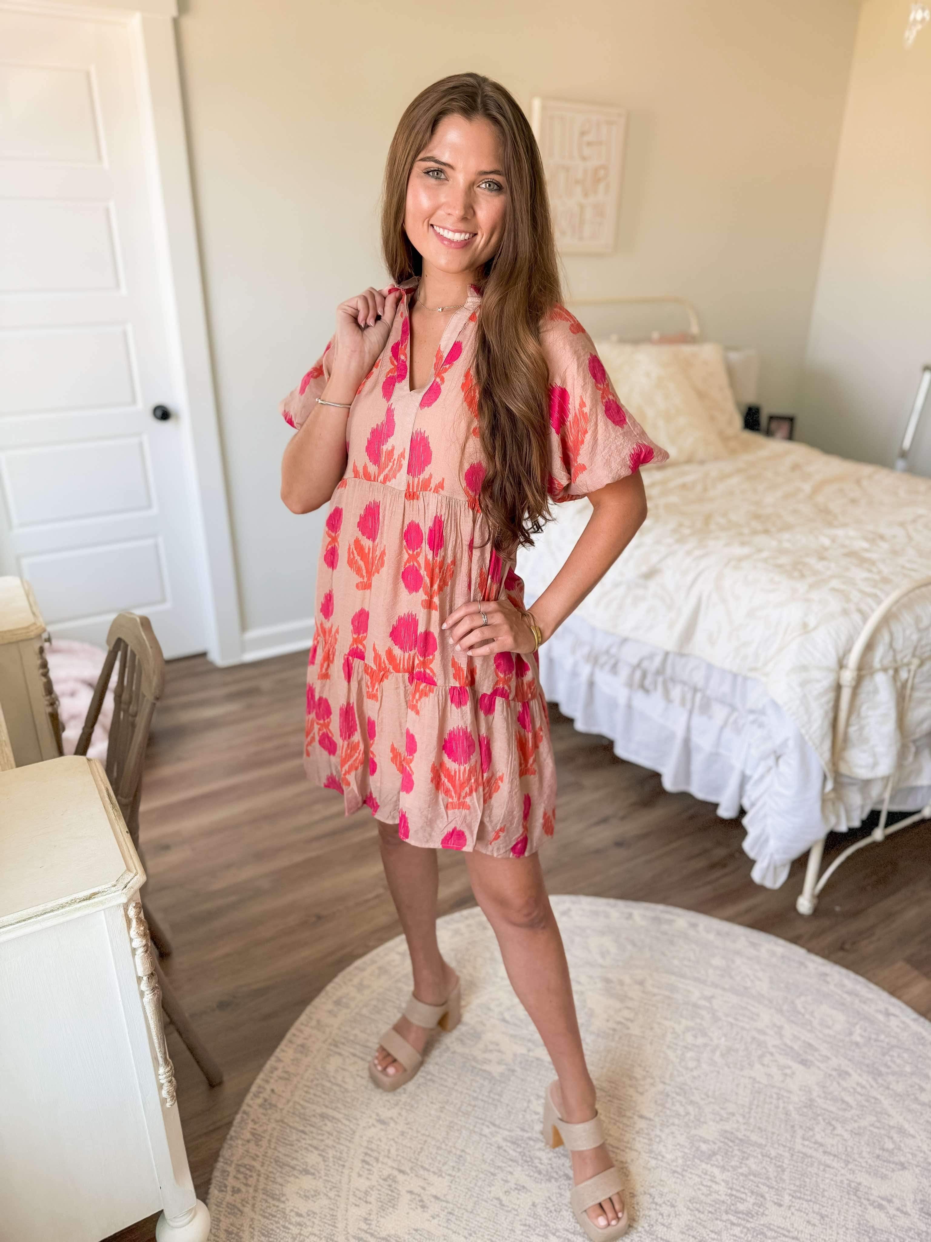 Introducing Tell Them Bring Another Dress in Taupe. This dress is just everything you have dreamt of. It features a puff sleeve detailing and a ruffle collar detailing as well. We are loving the taupe base with the orange and pink print throughout to give it a little fun during the fall! It has dropped tiers throughout the base of the dress to give it a cute flirty look.