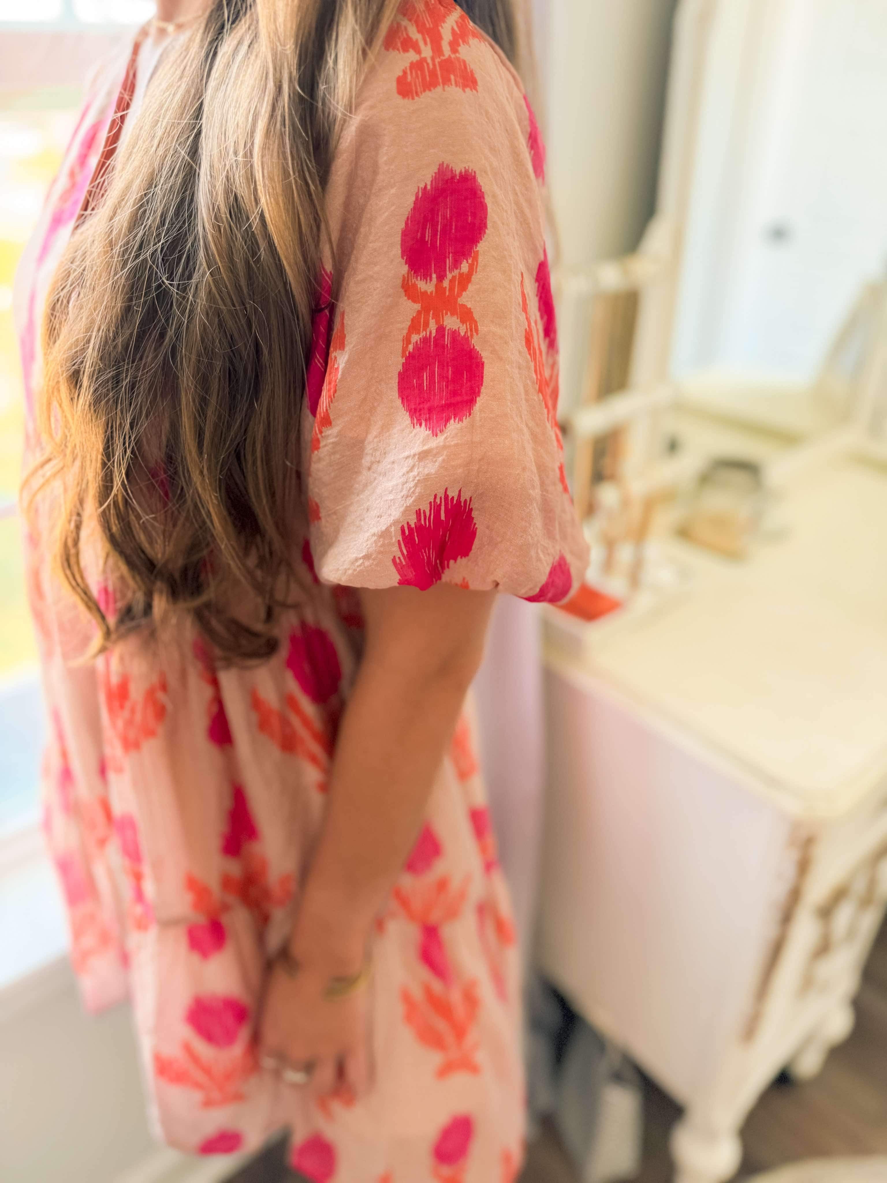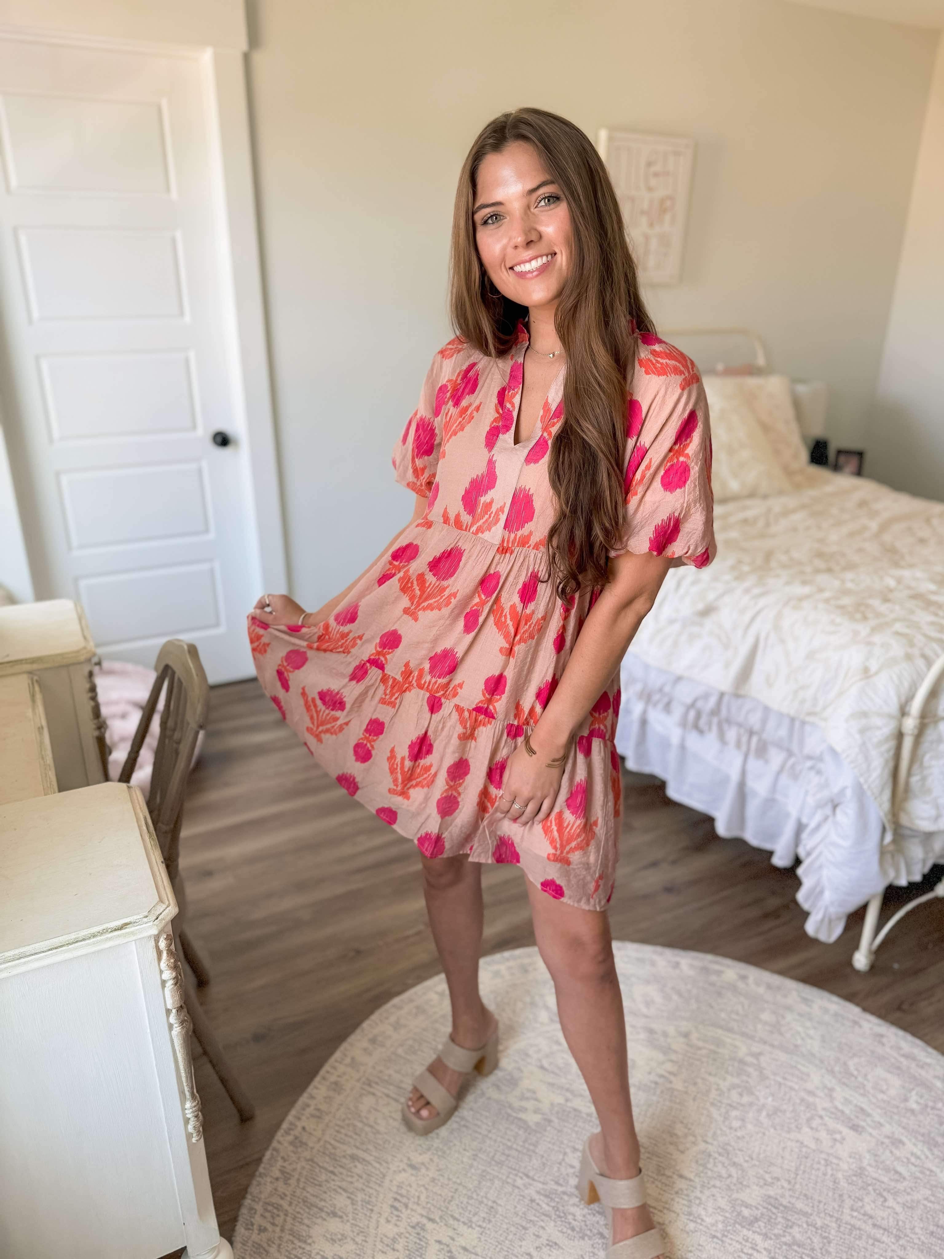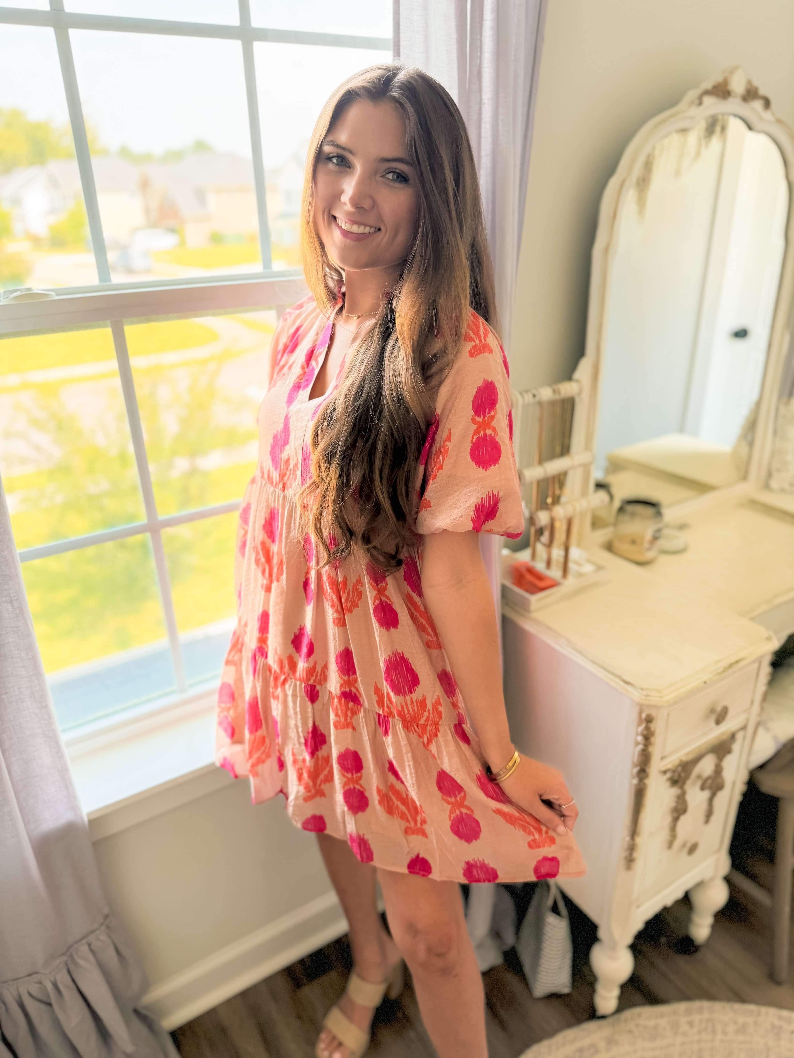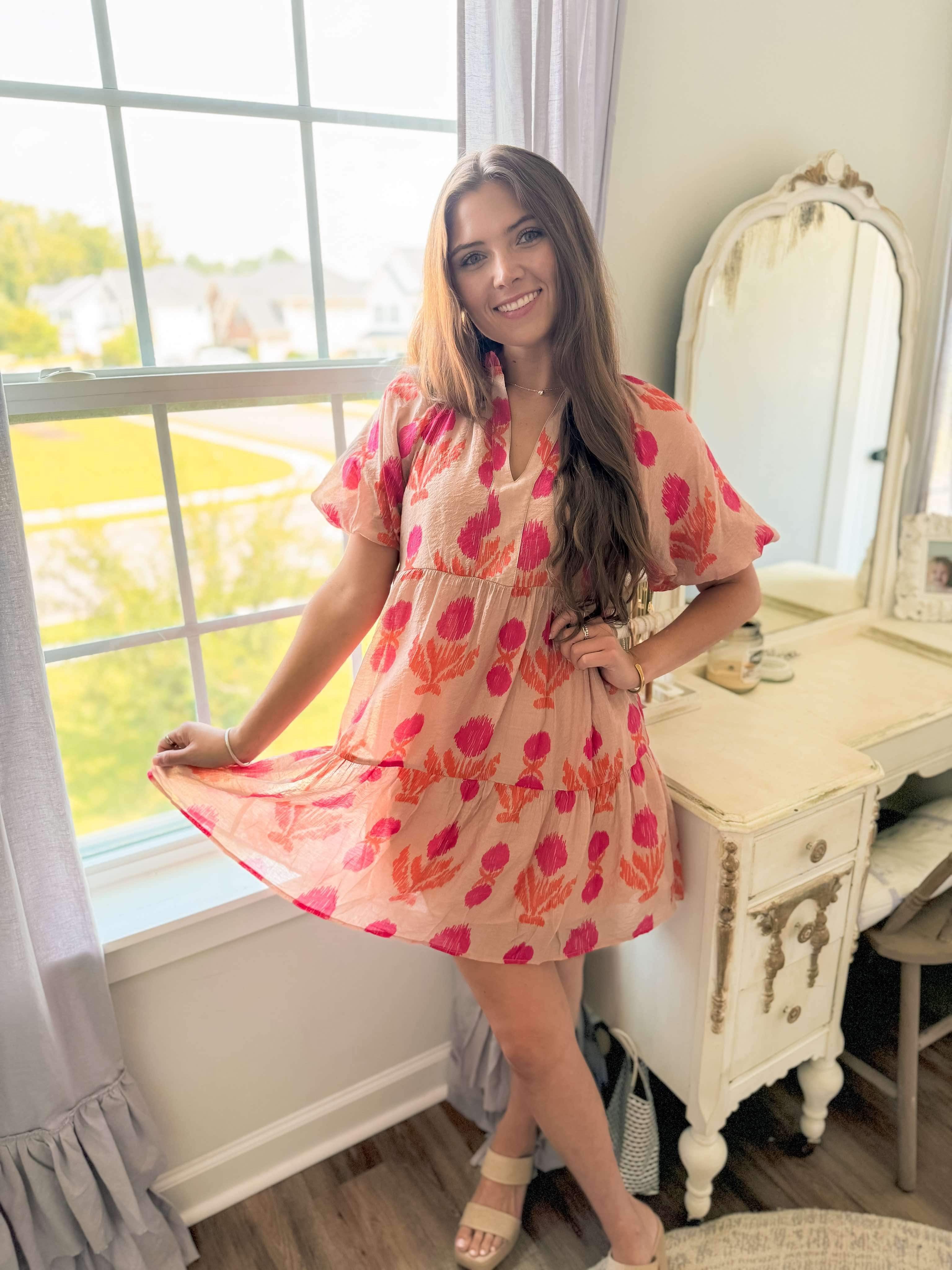 Introducing Tell Them Bring Another Dress in Taupe. This dress is just everything you have dreamt of. It features a puff sleeve detailing and a ruffle collar detailing as well. We are loving the taupe base with the orange and pink print throughout to give it a little fun during the fall! It has dropped tiers throughout the base of the dress to give it a cute flirty look.