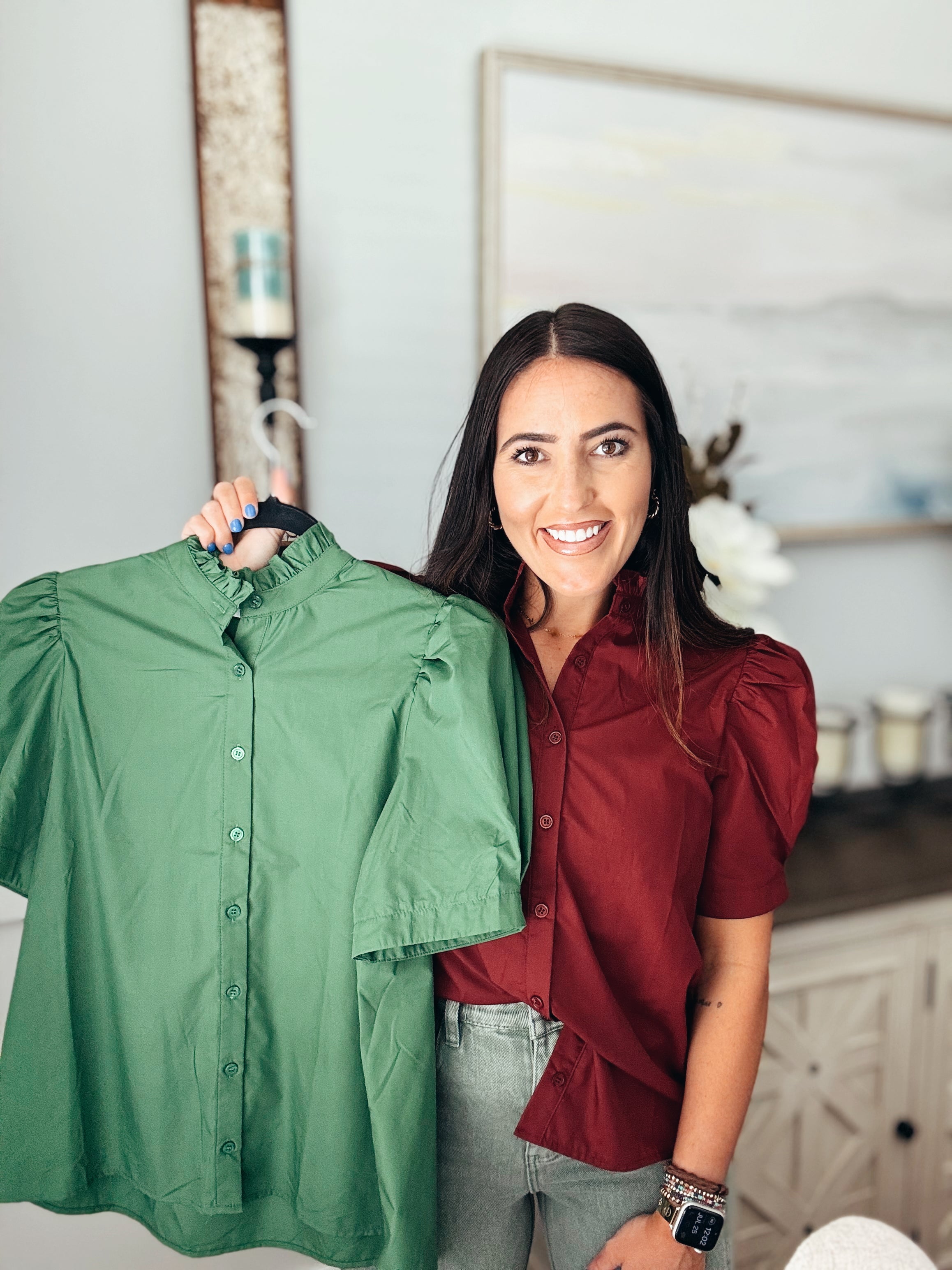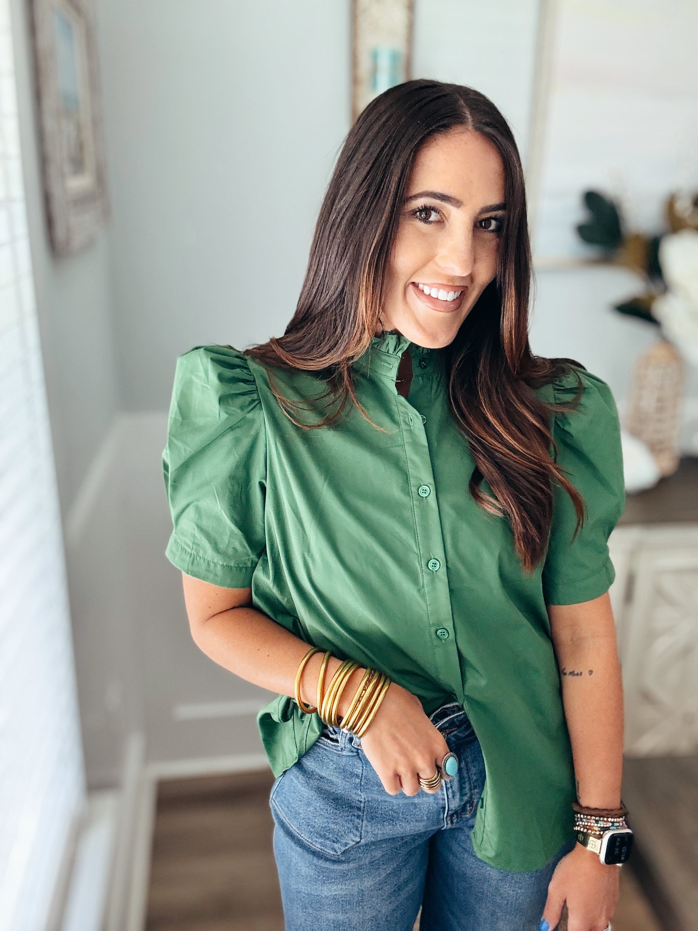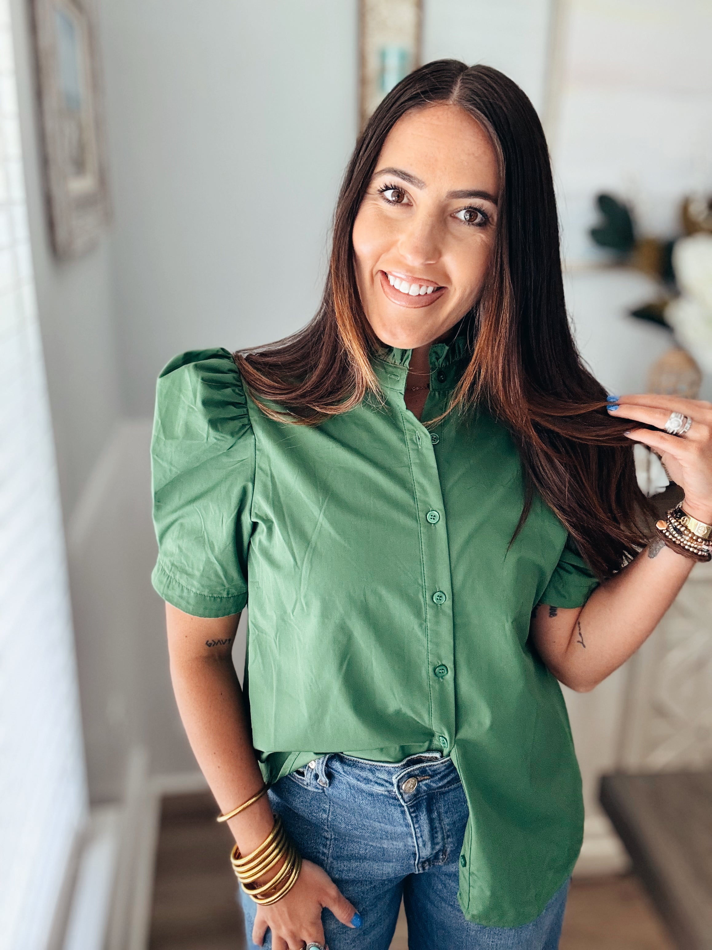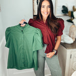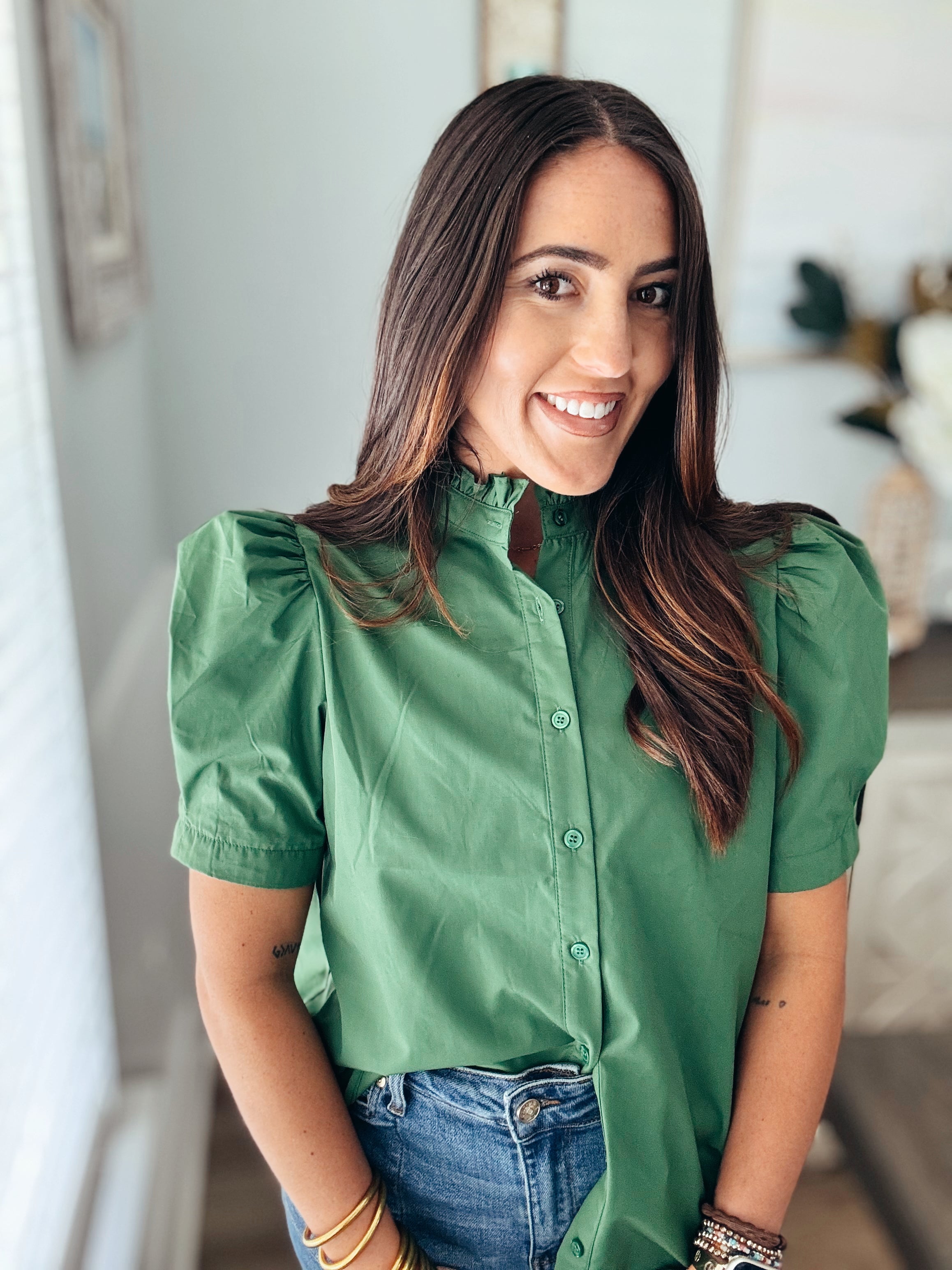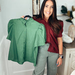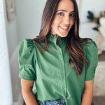 Solid puff shoulder short sleeve button front closure top featuring ruffle finish band collar. Unlined. Woven. Non-sheer. Lightweight.
