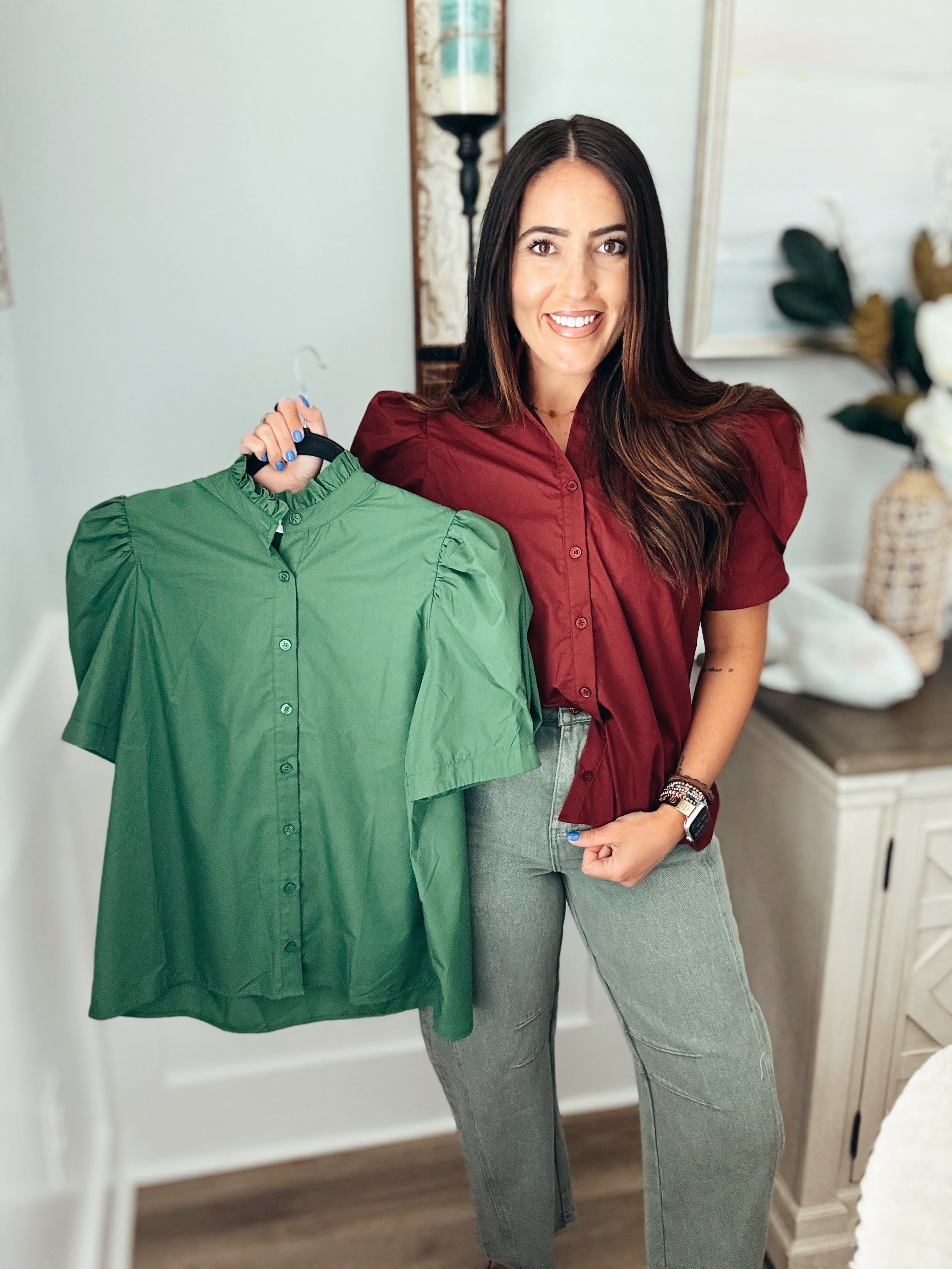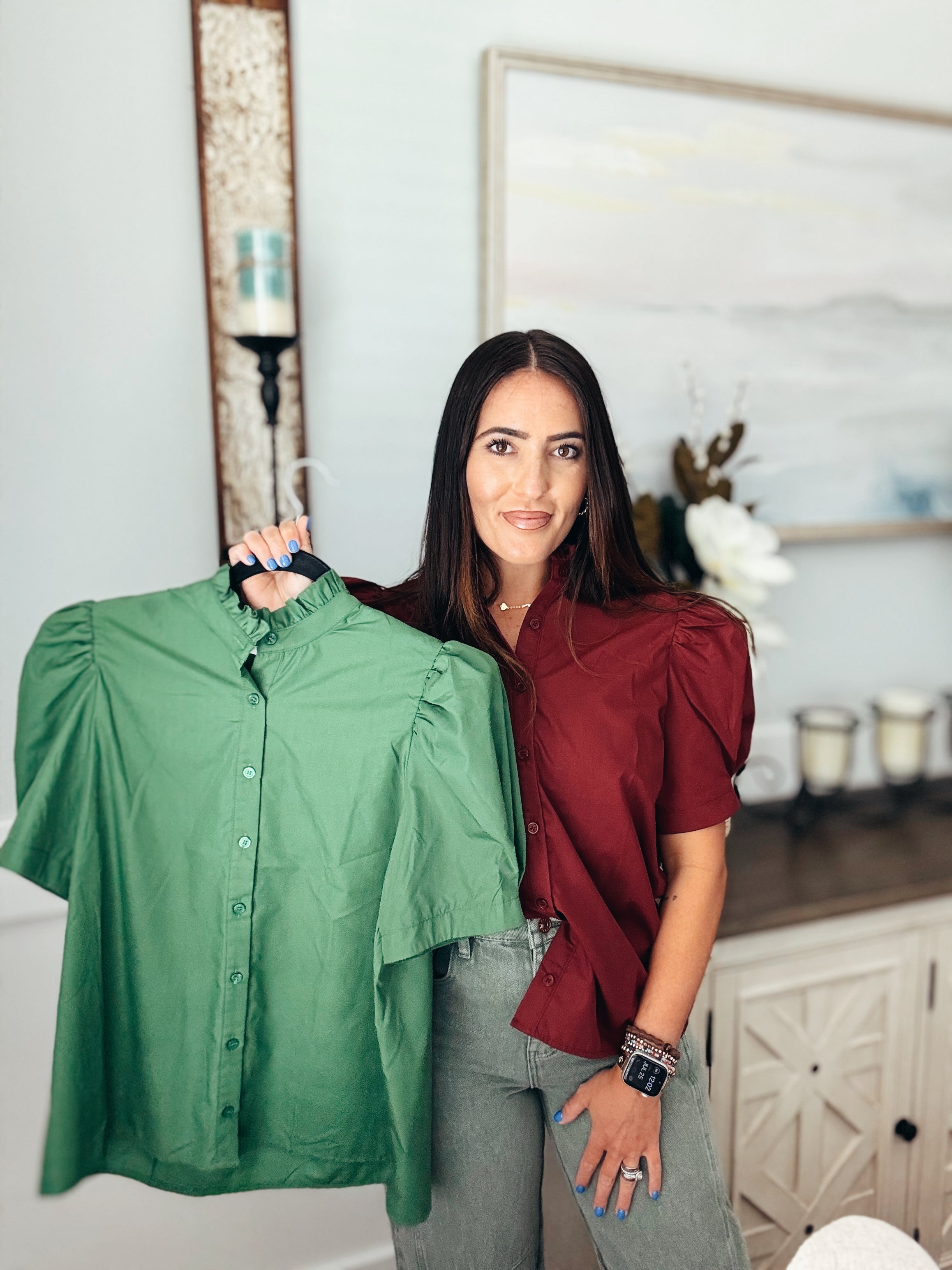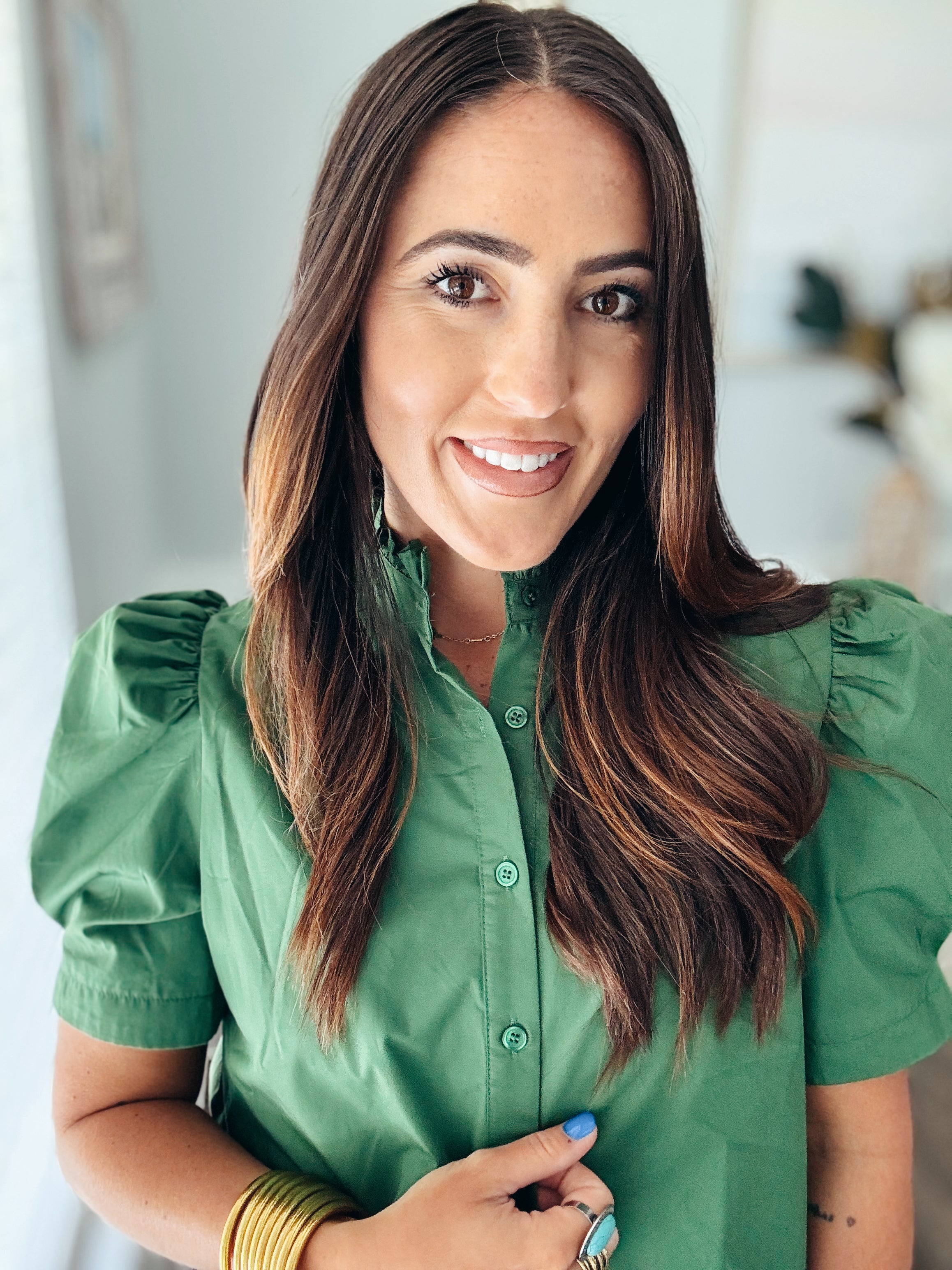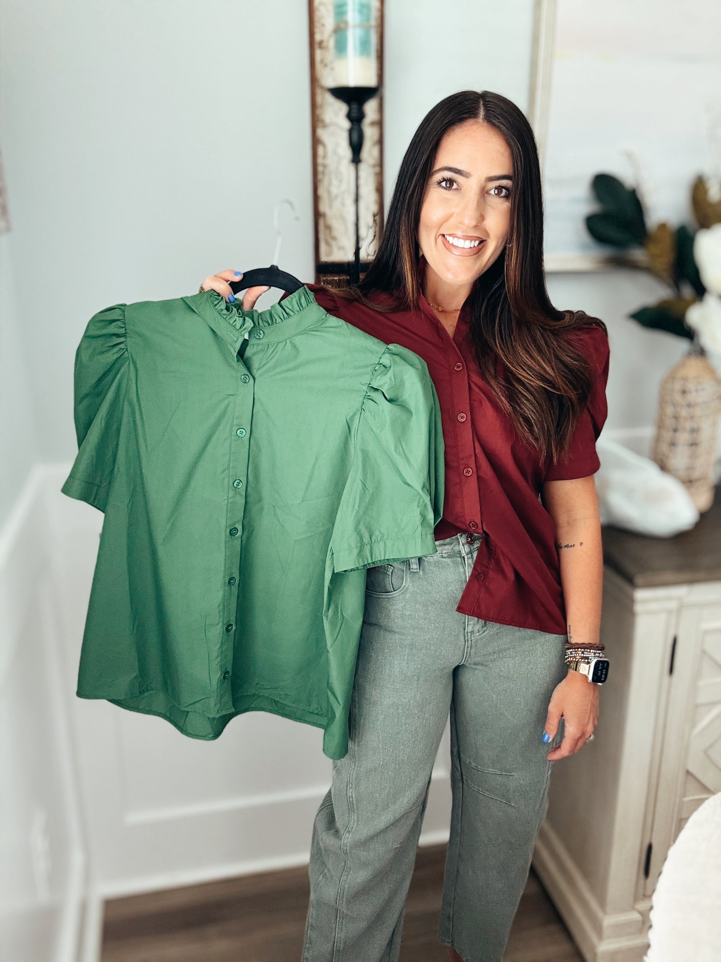 Solid puff shoulder short sleeve button front closure top featuring ruffle finish band collar. Unlined. Woven. Non-sheer. Lightweight.