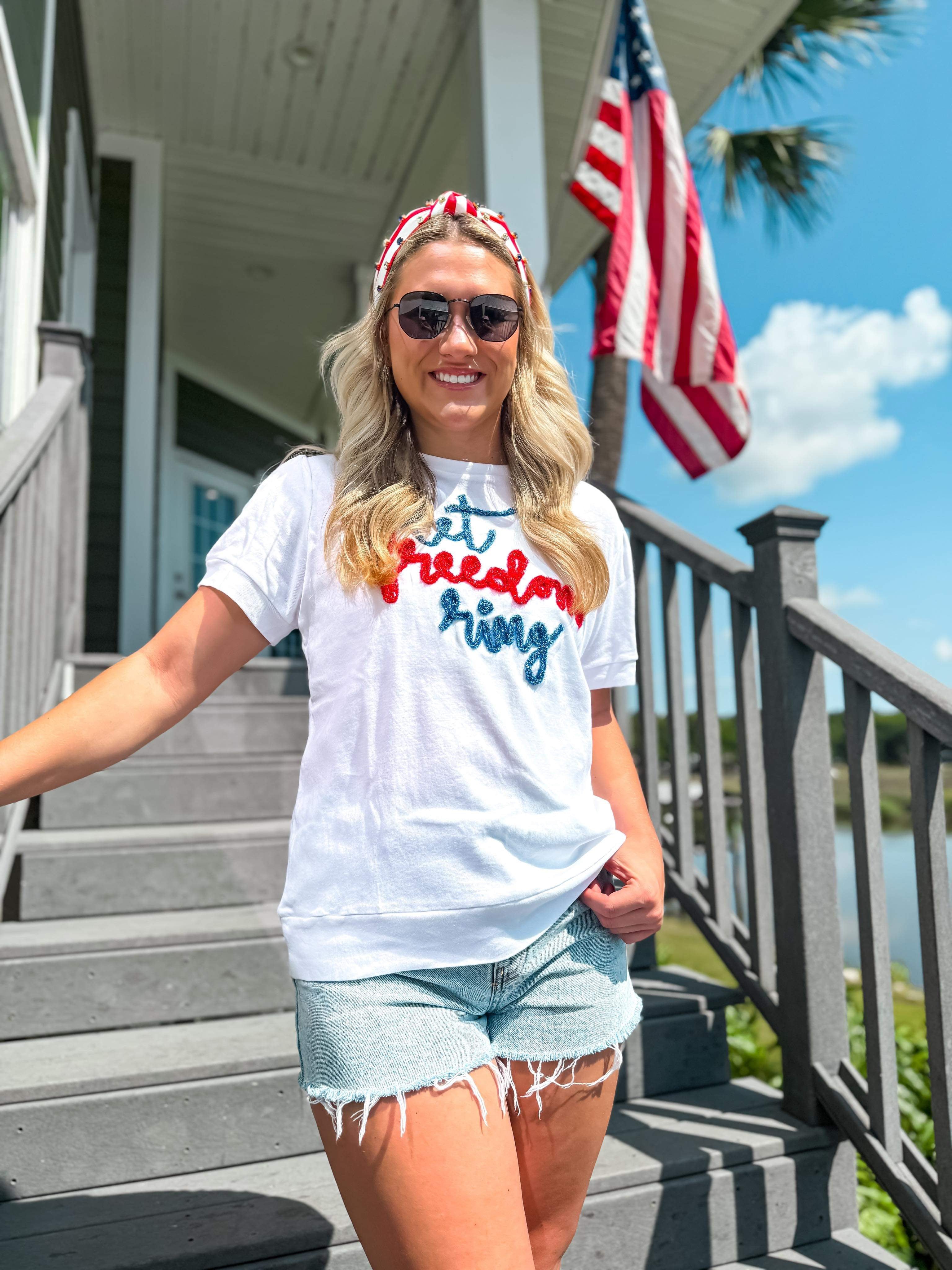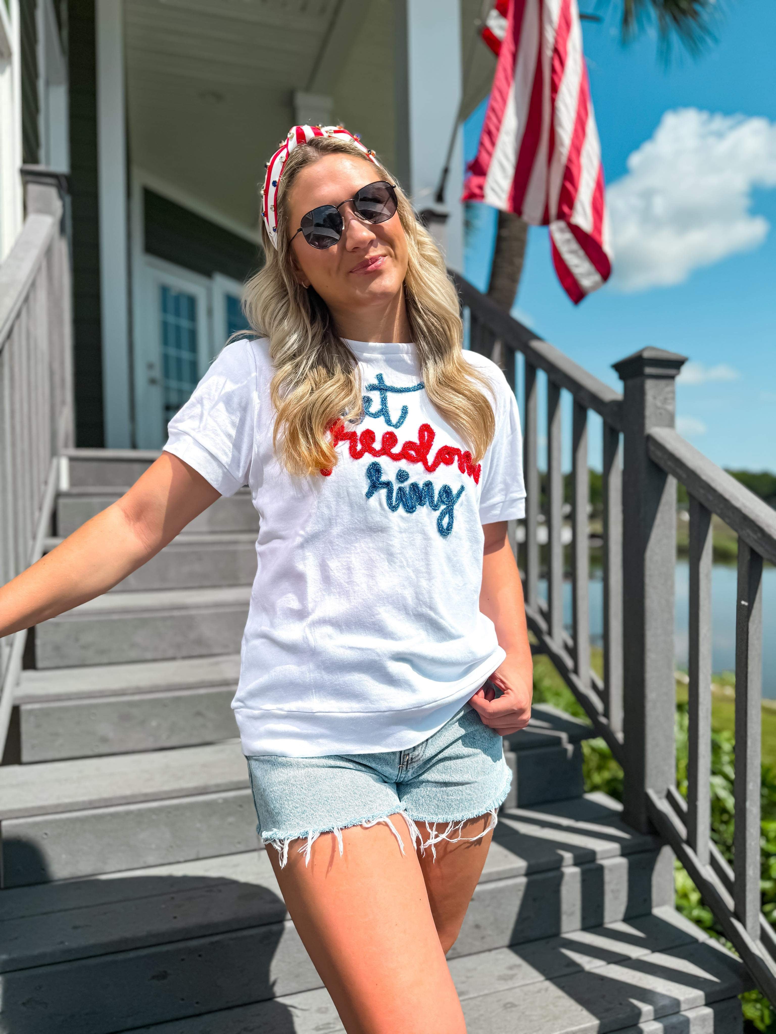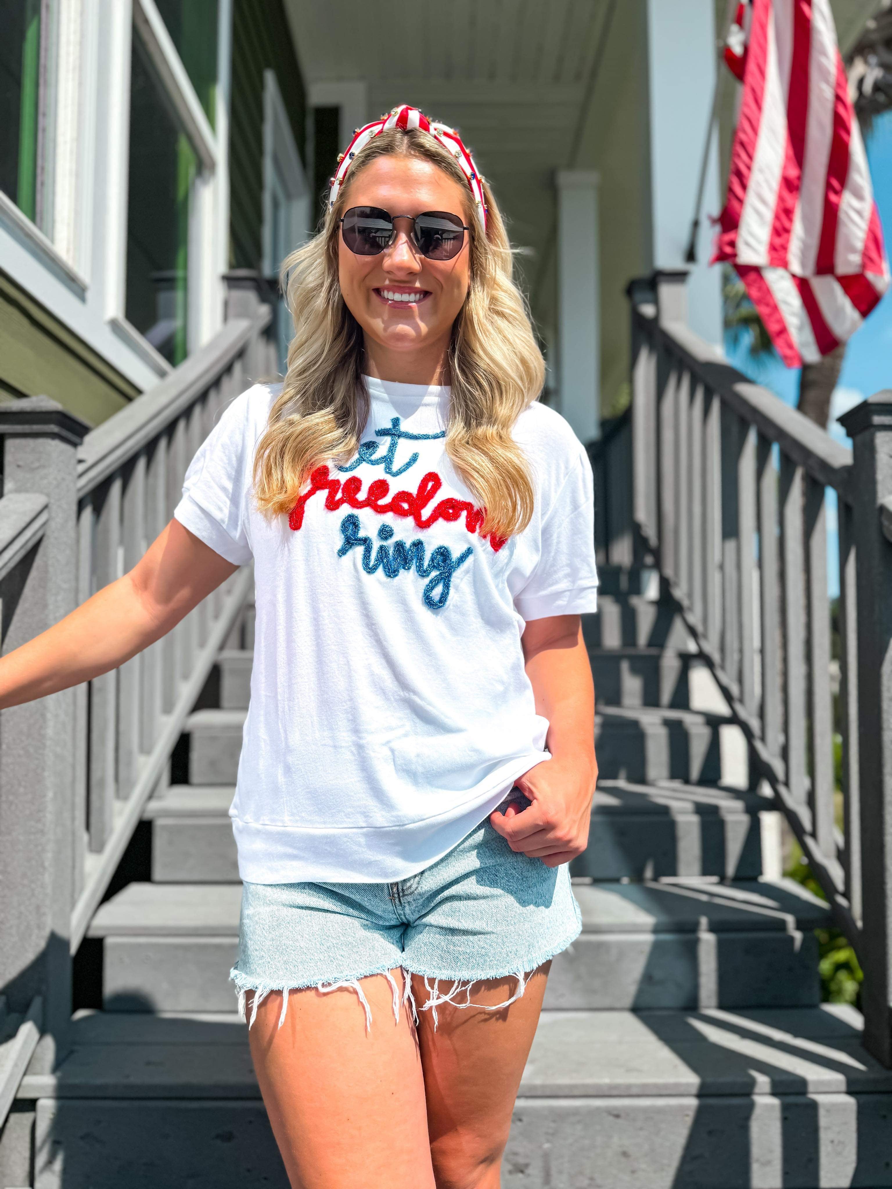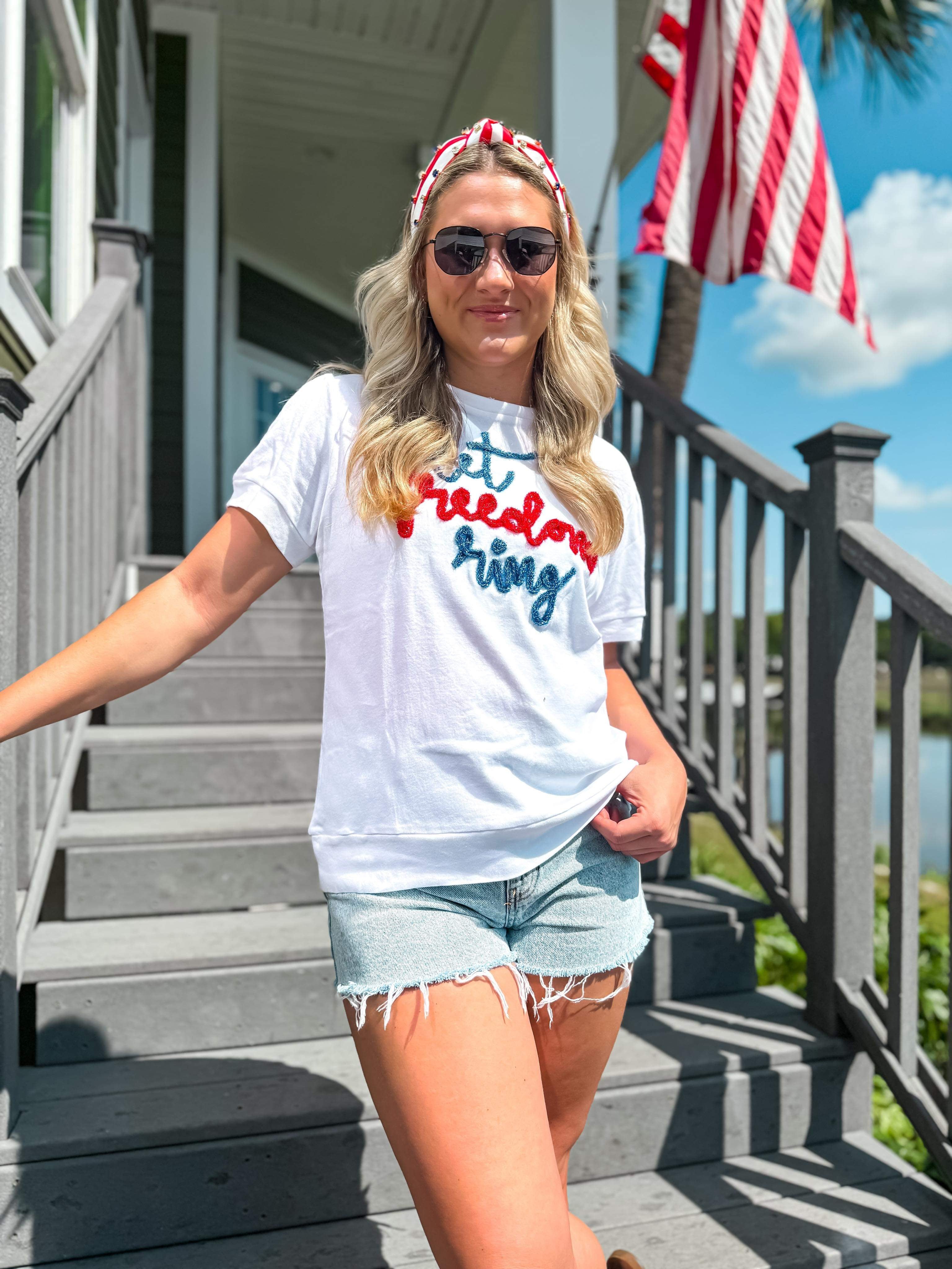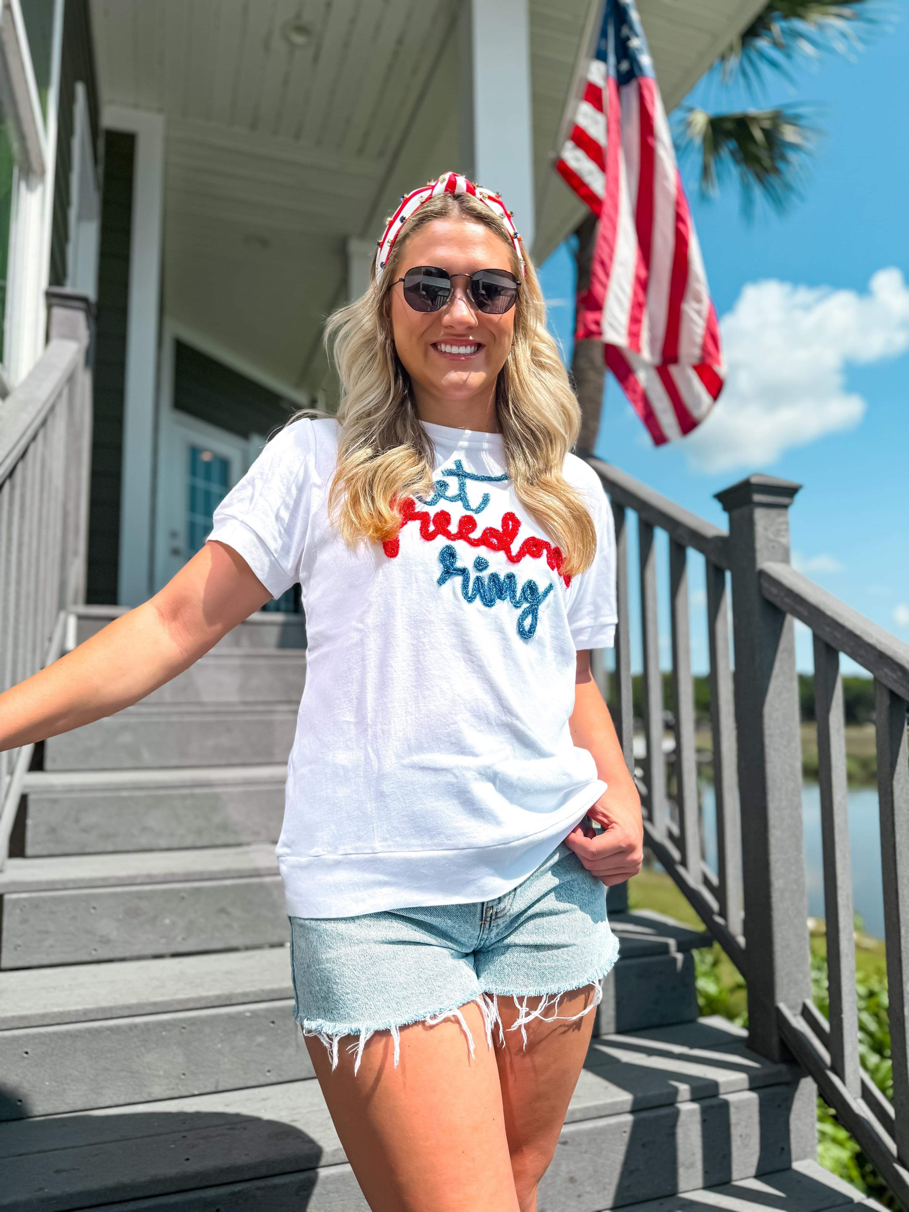 This tee is perfect for your 4th of July festivities! Pair with red denim or your favorite blue jean shorts to complete the look!