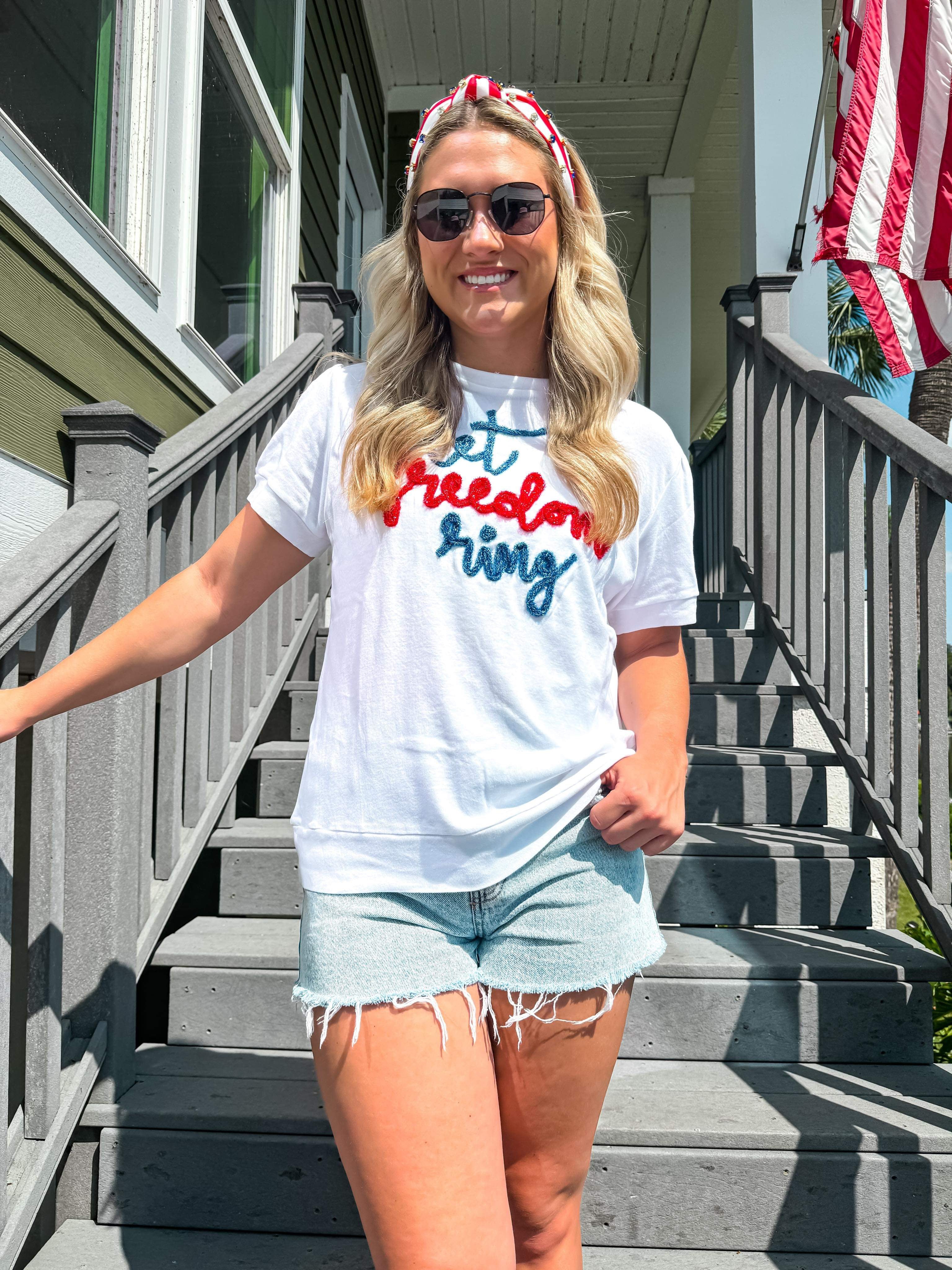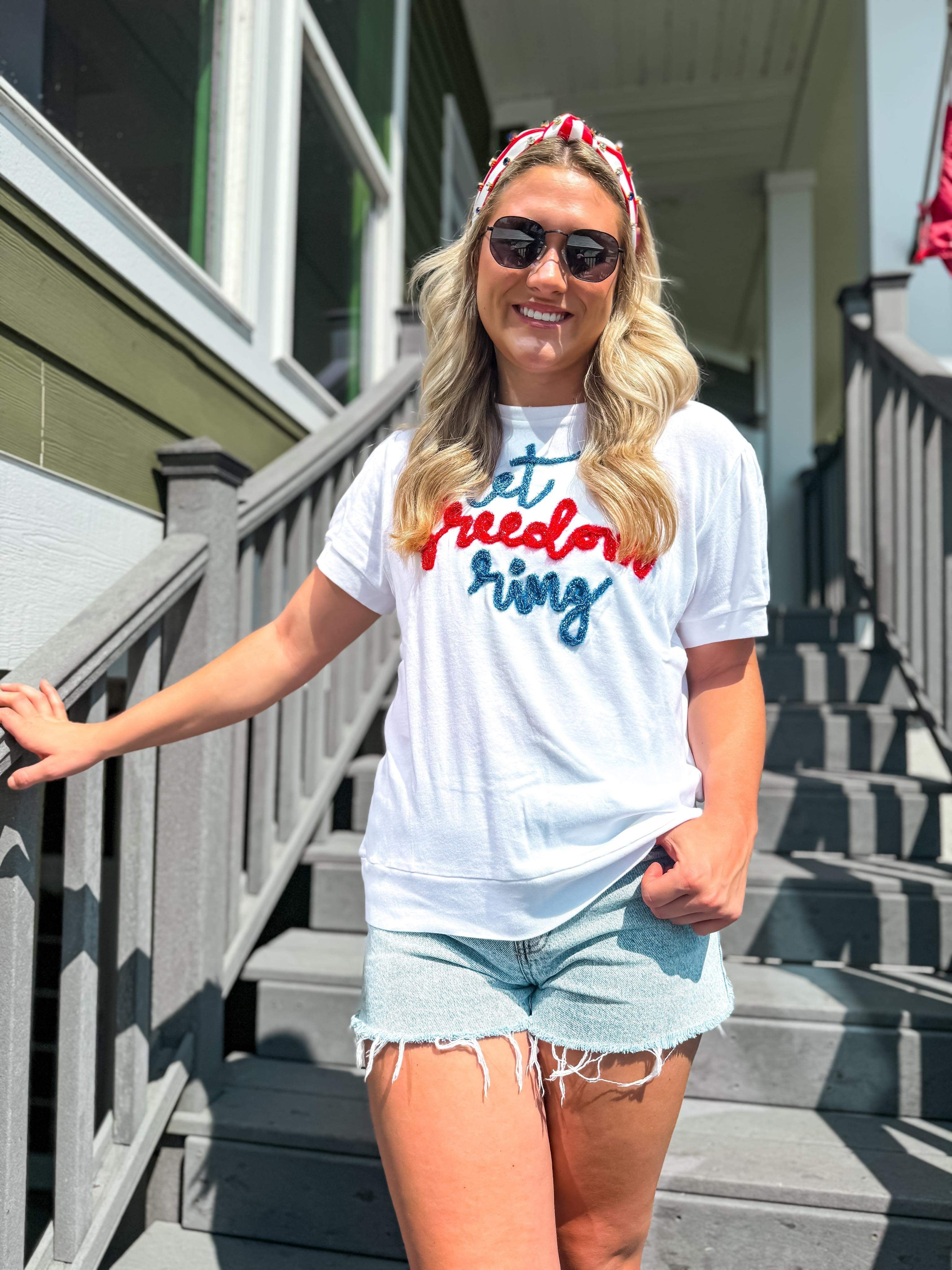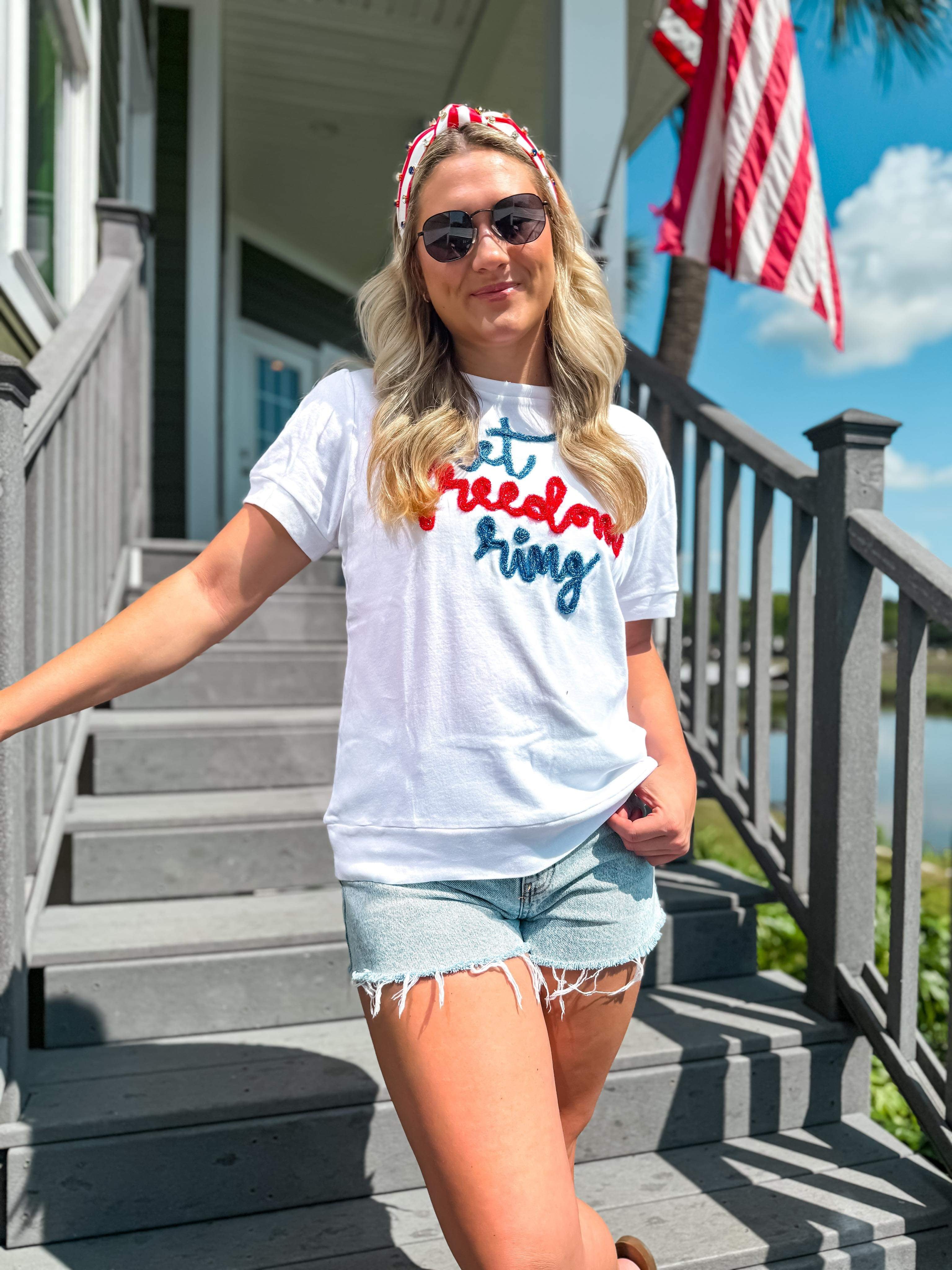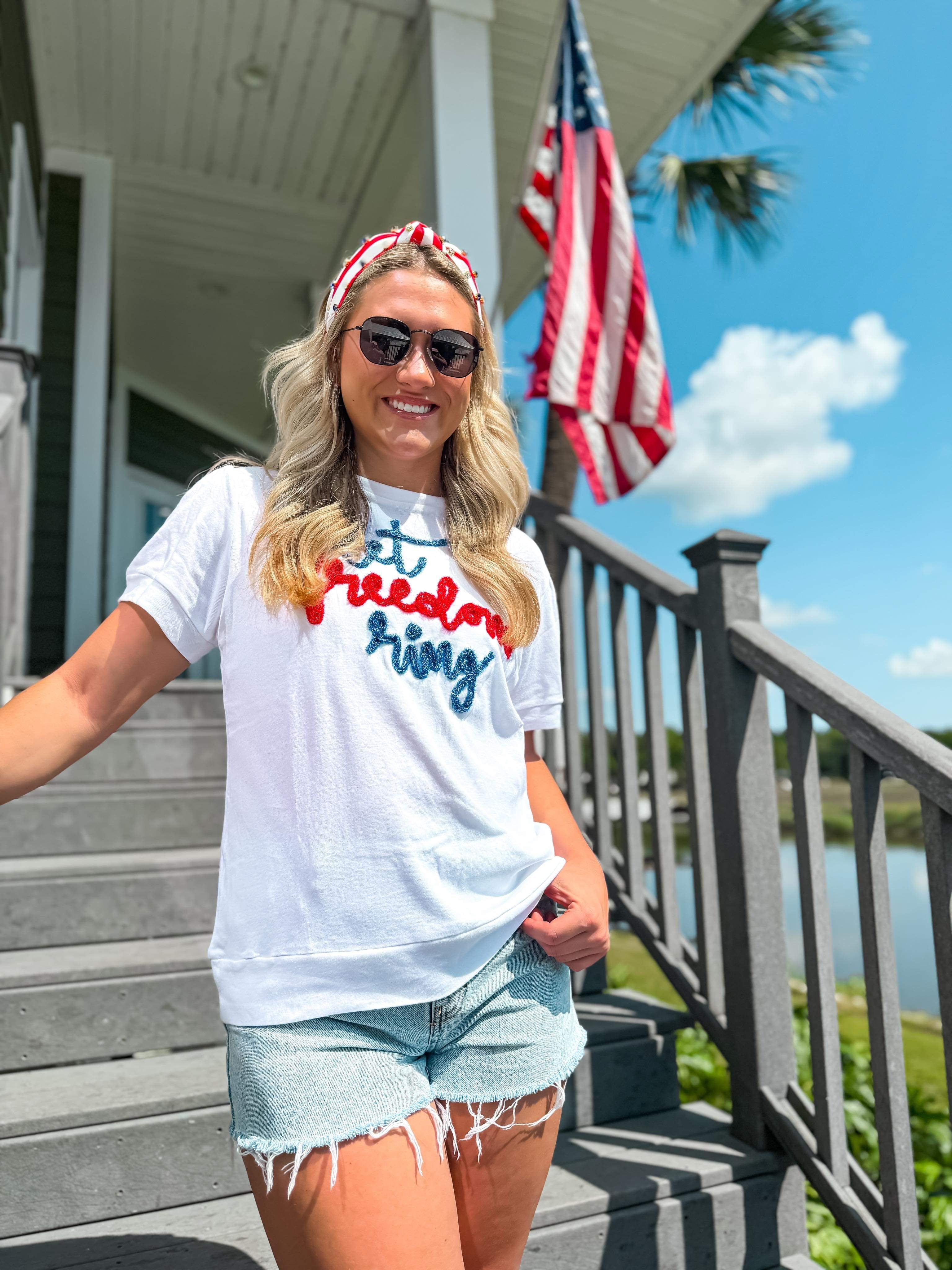 This tee is perfect for your 4th of July festivities! Pair with red denim or your favorite blue jean shorts to complete the look!