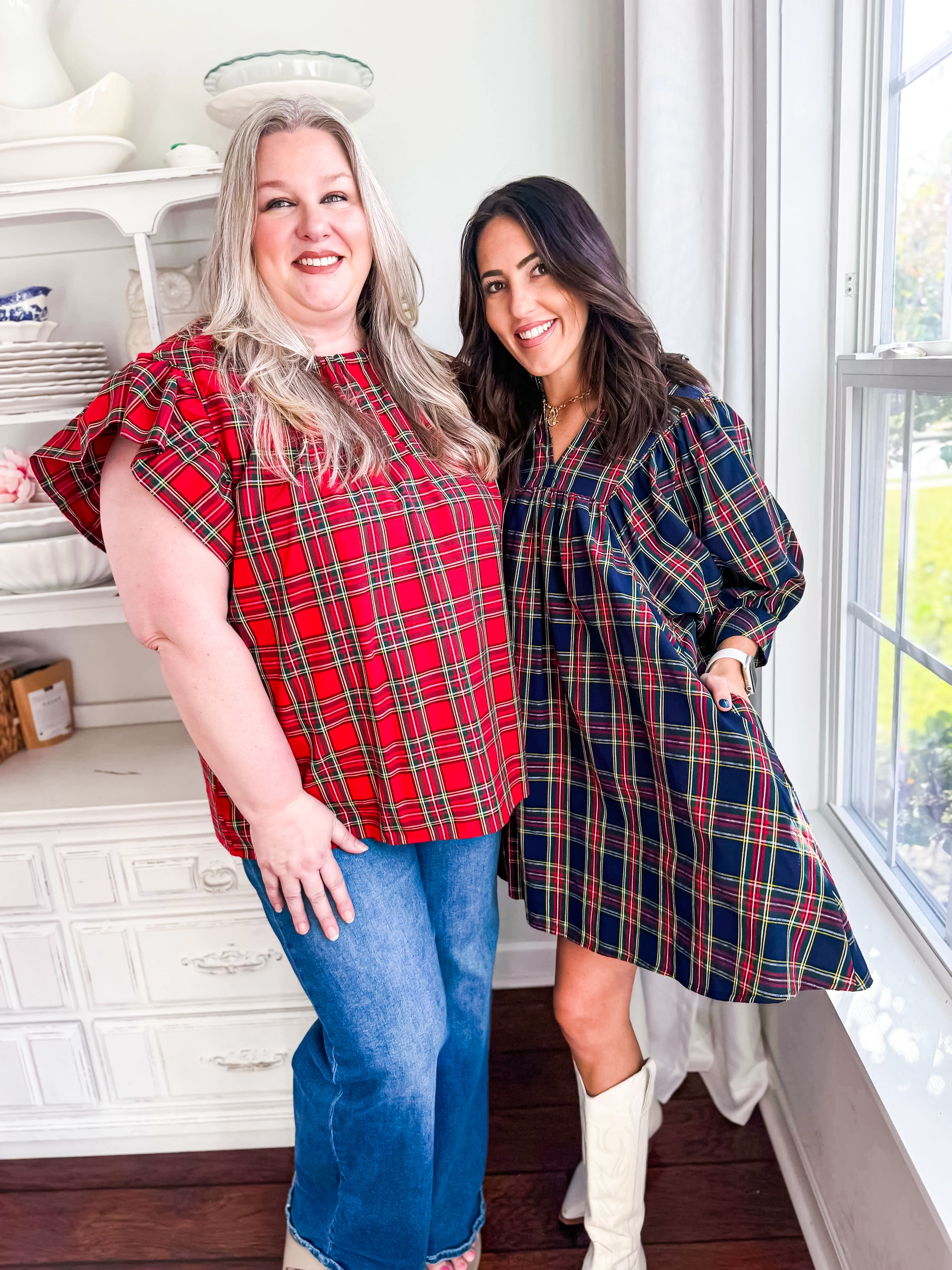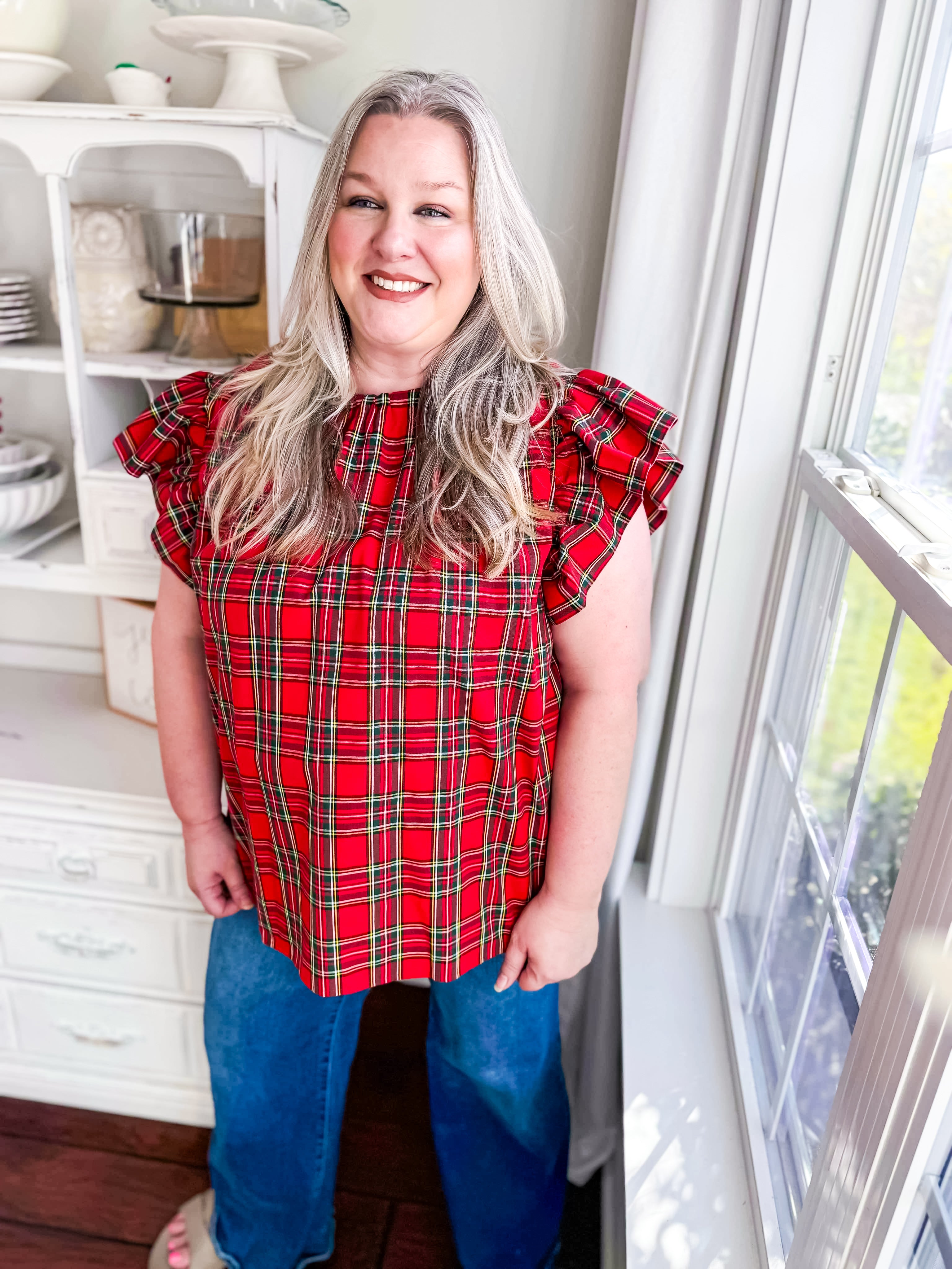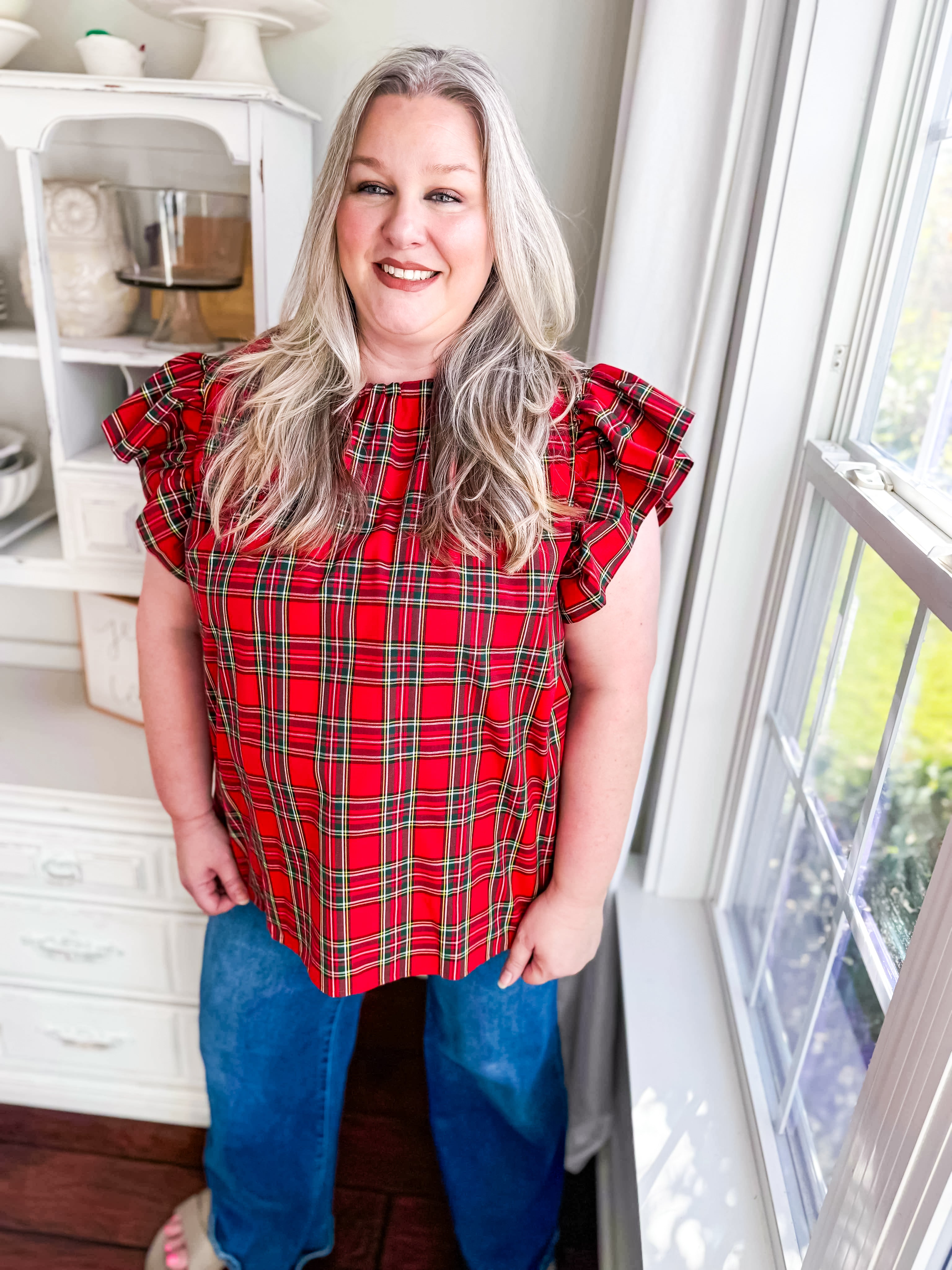 Plaid print ruffled sleeve top featuring adjustable self-tie detail at neckline. Unlined. Woven. Non-sheer. Lightweight.