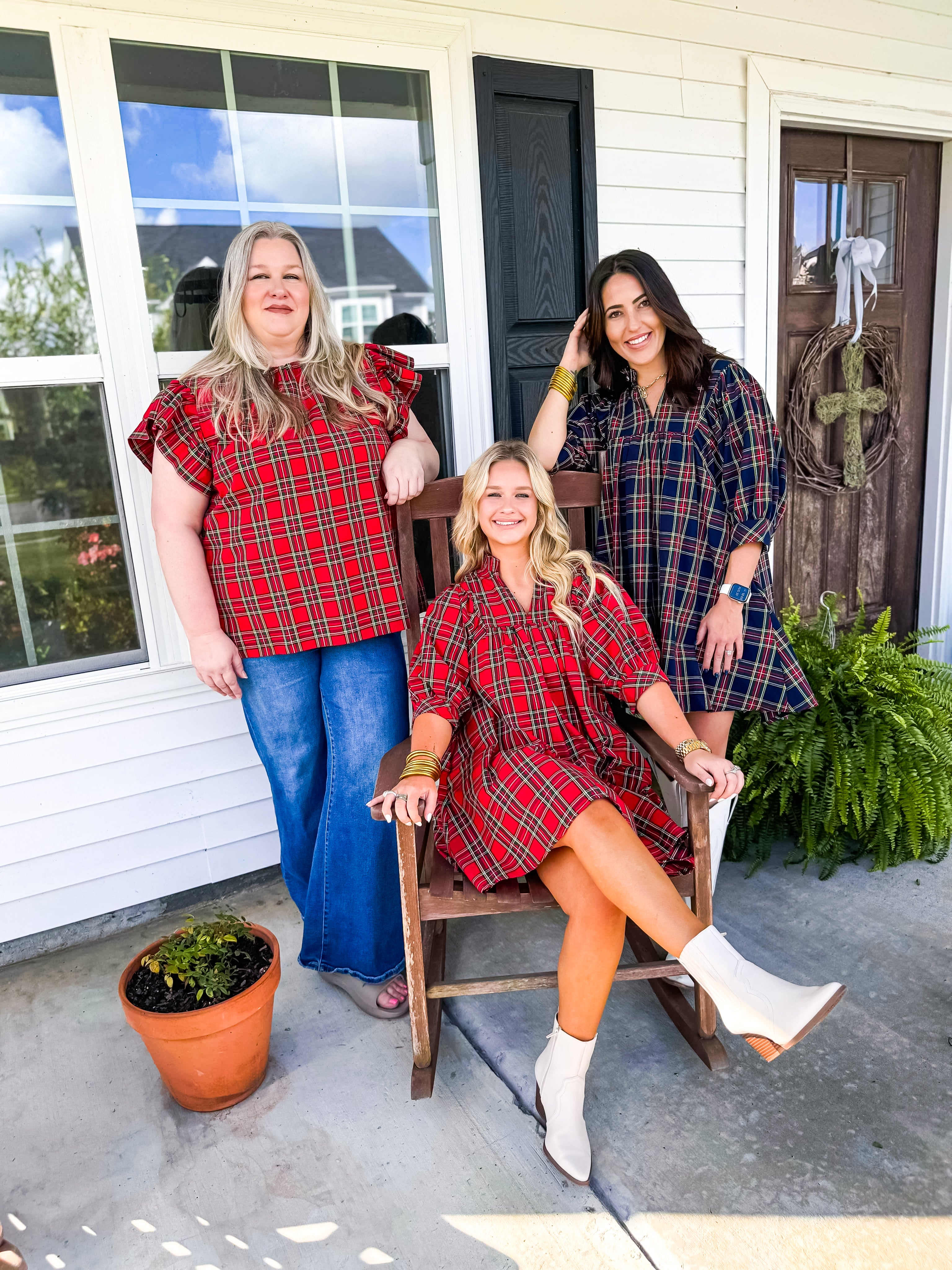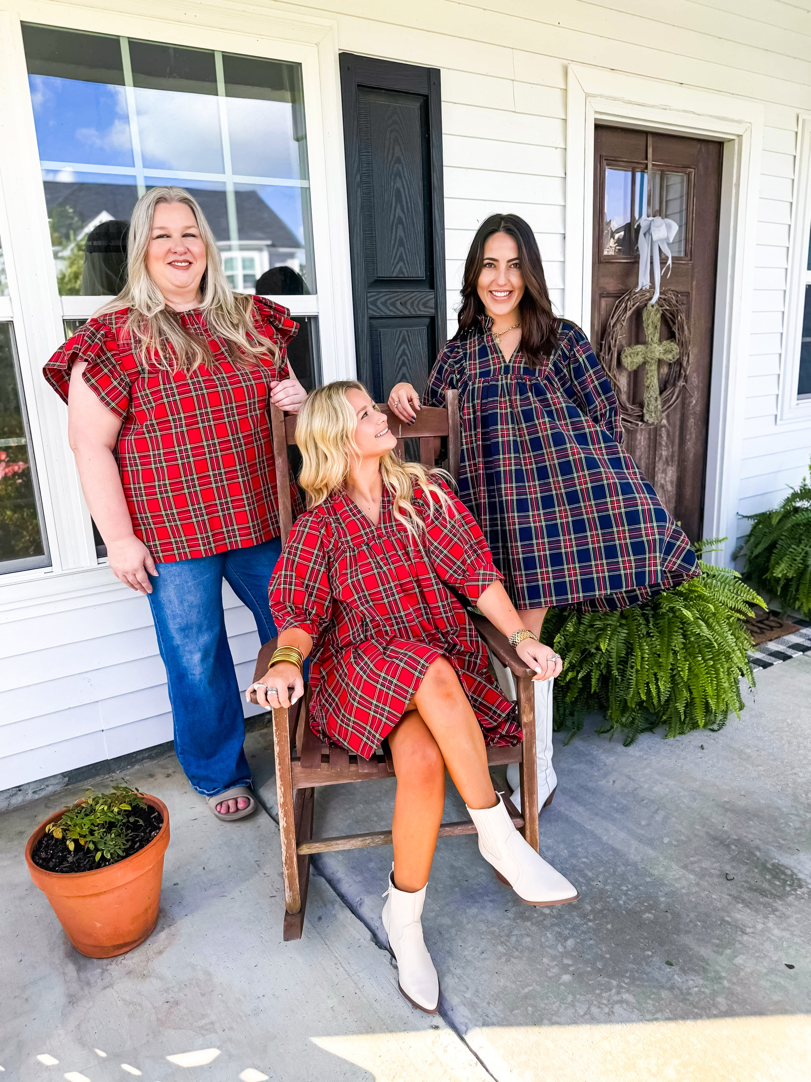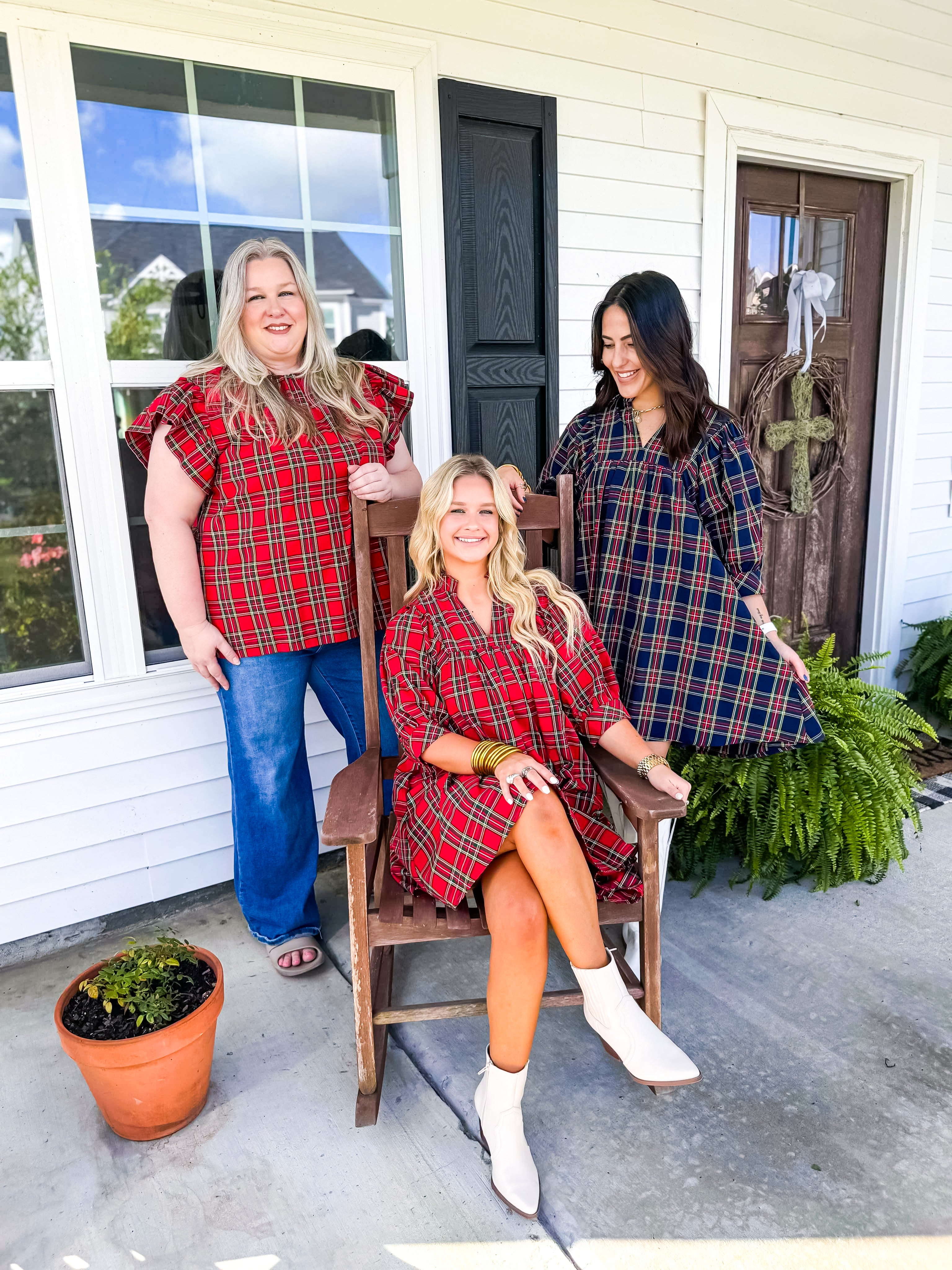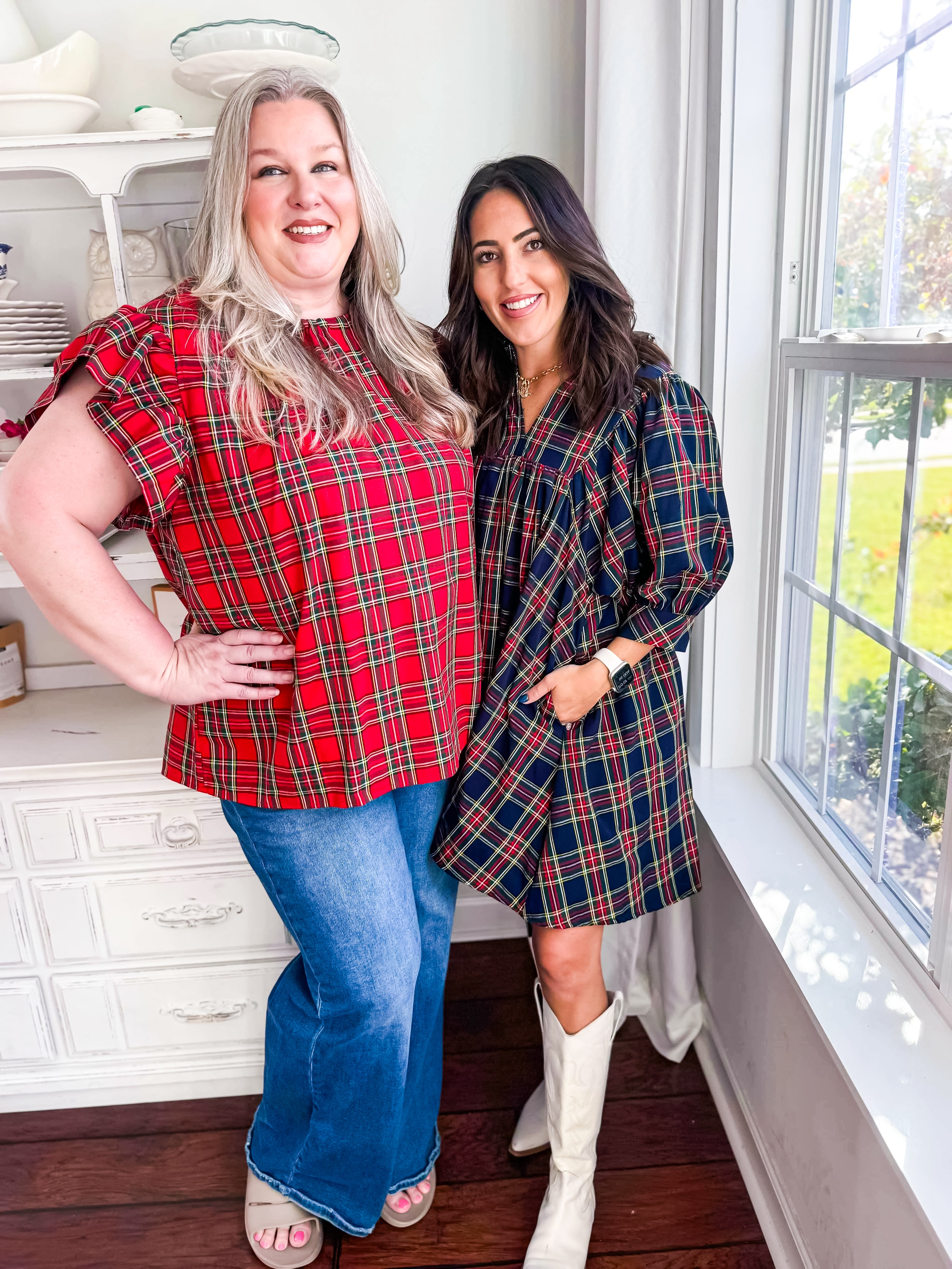 Plaid print ruffled sleeve top featuring adjustable self-tie detail at neckline. Unlined. Woven. Non-sheer. Lightweight.