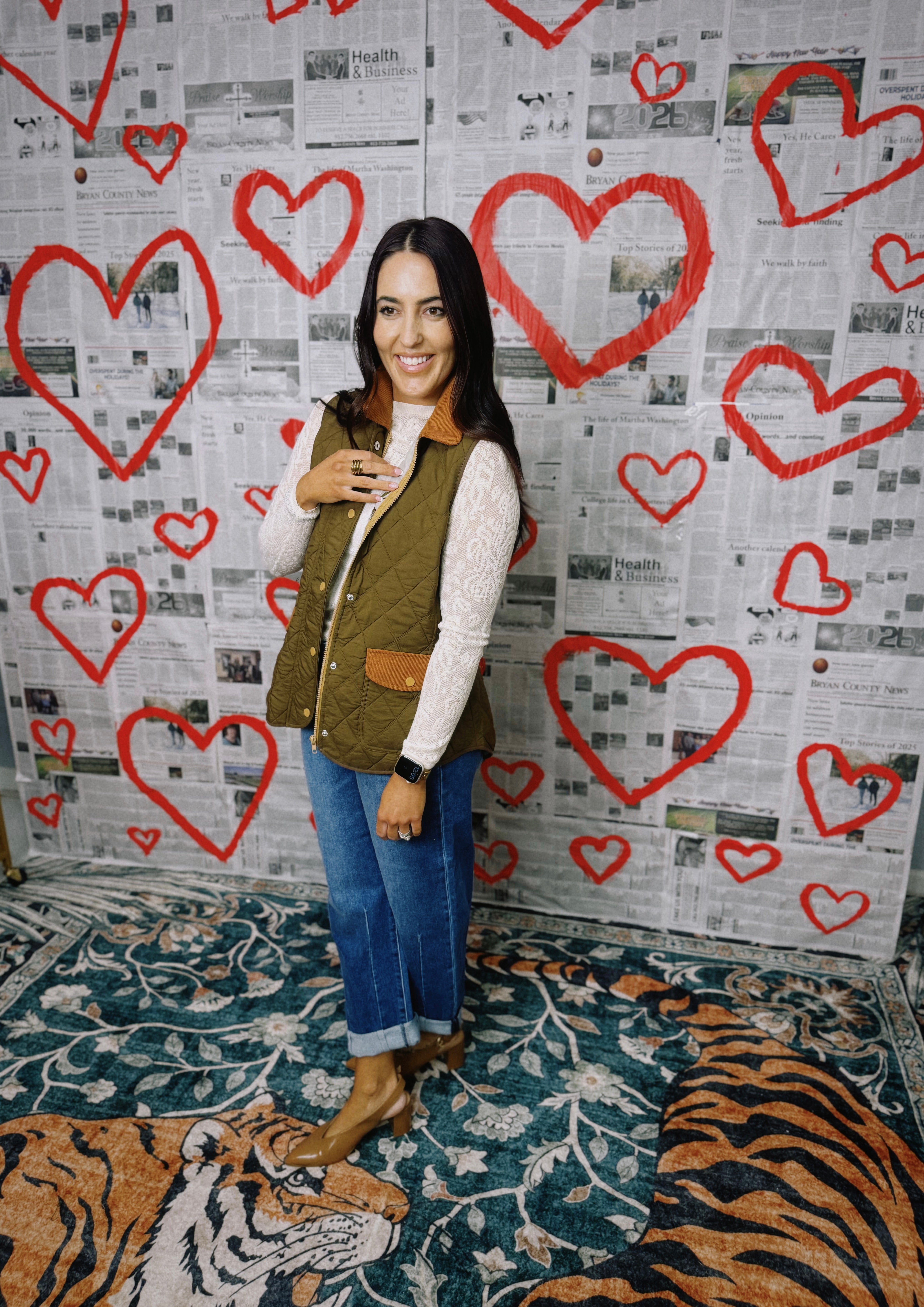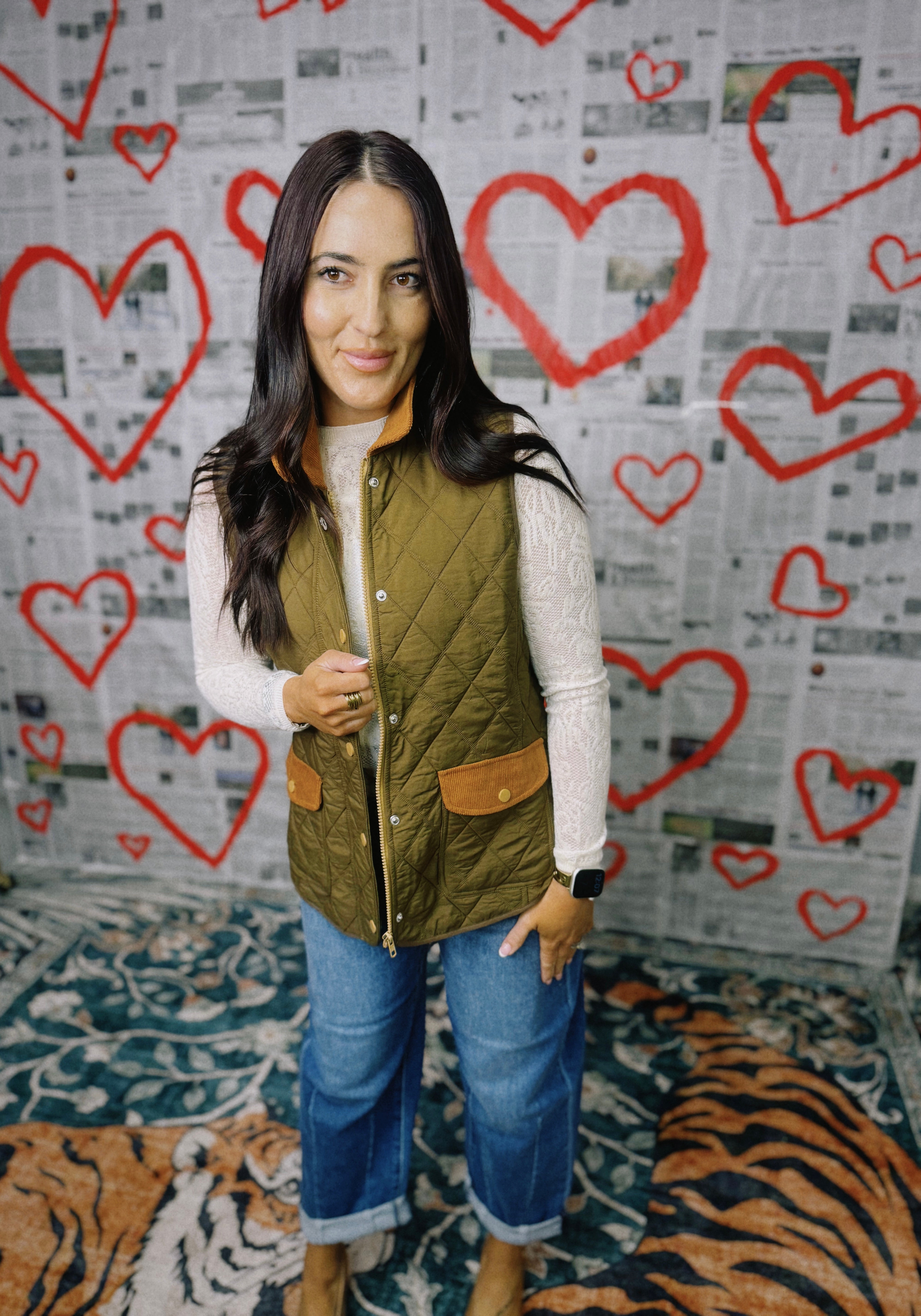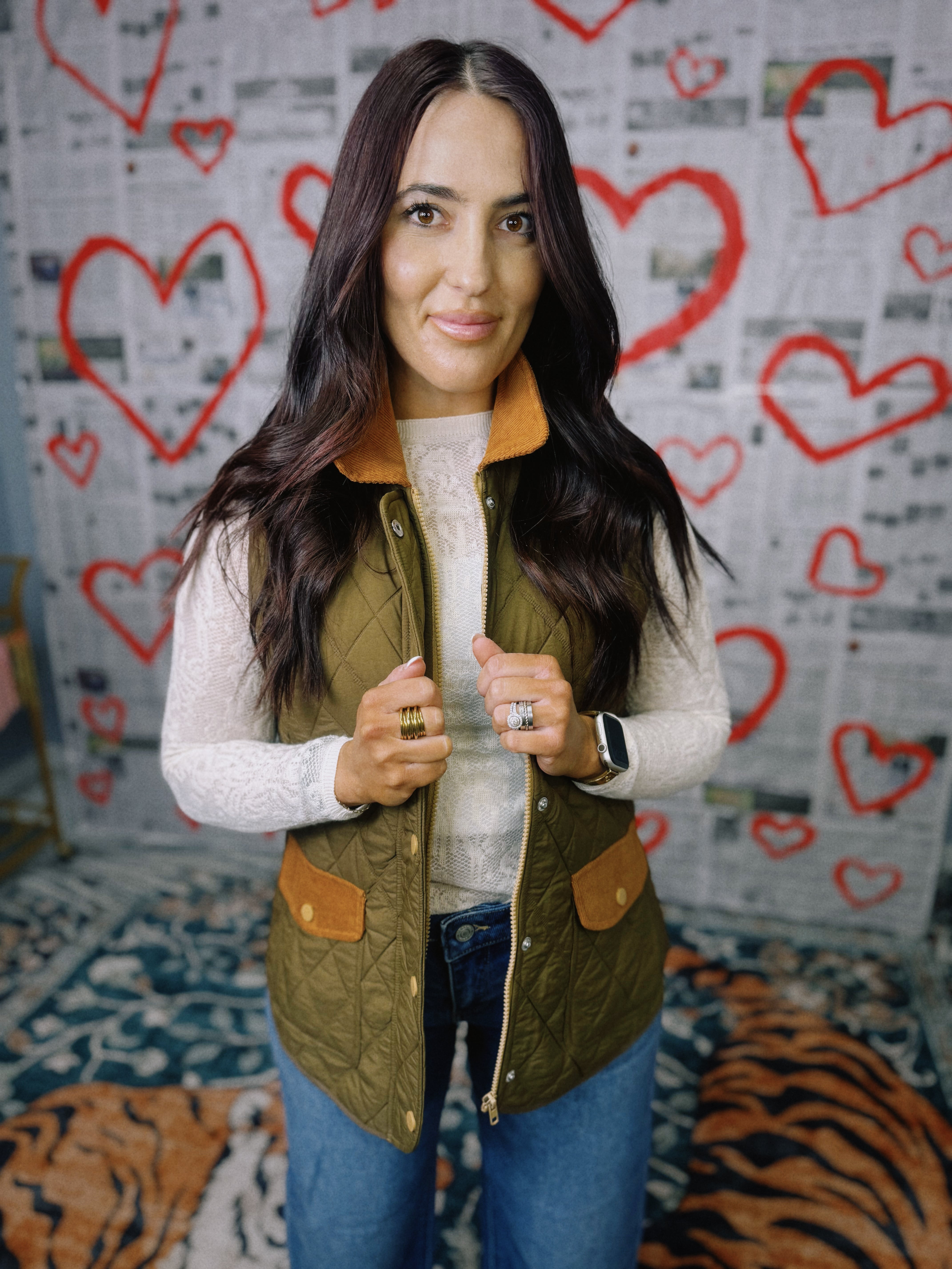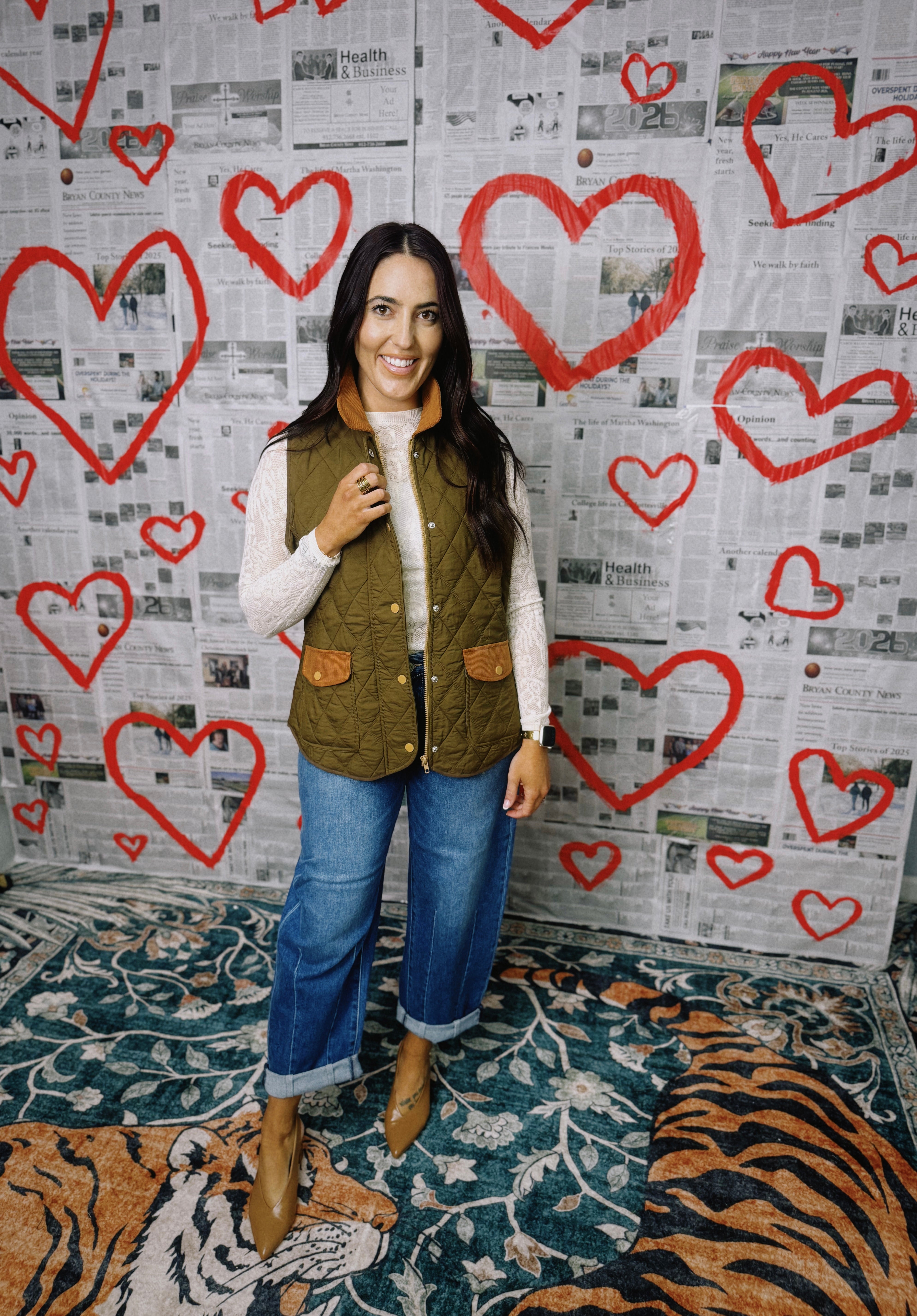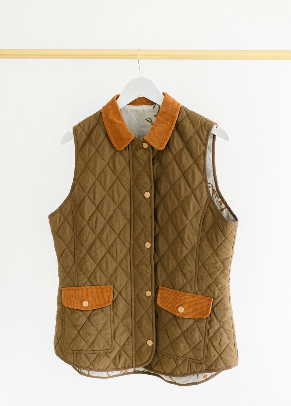 You're going to wear this quilted barn-style vest for years to come. Designed in a rich olive green with contrasting cognac corduroy trim, it’s the perfect layering piece for crisp mornings and cozy weekends. The diamond quilting provides lightweight warmth and structure, while the button-front closure and flap pockets add a polished, timeless touch. The inside is lined with a beautiful custom pattern that brings all of the colors together and adds a fun pop! This vest matches perfectly with our Campbell Skort in Cognac and pairs so well with many of our blouses.