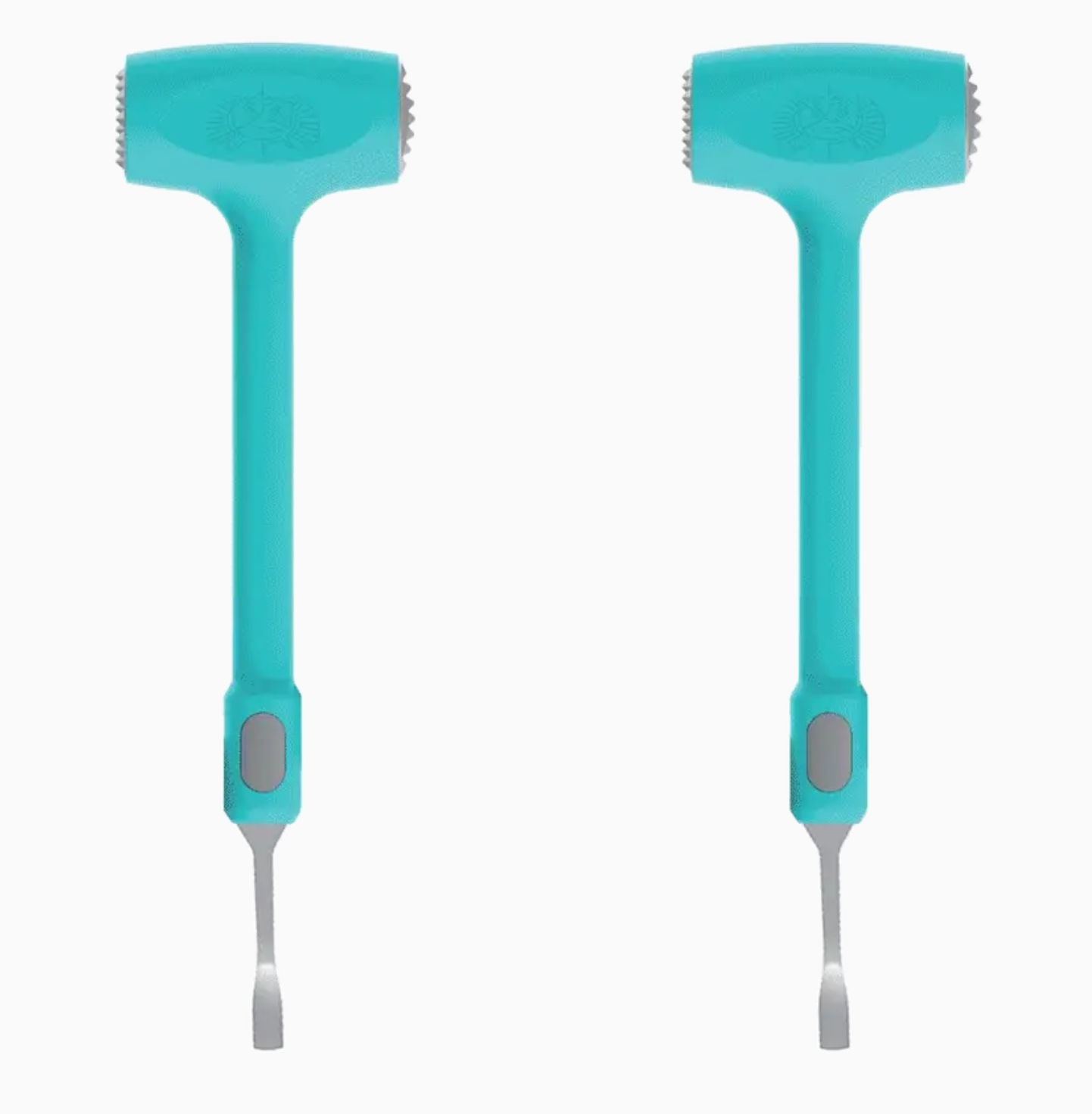 This innovative crab mallet combines 2 convenient tools into 1, with a two-sided hammer, and seafood spoon/pick. Hammer open larger claws then with the push of a button easily unfold the seafood pick to reach hard to get claw or leg meat. This lightweight versatile design is ideal for blue, snow, dungeness, stone crabs, and lobster. INCLUDES 2 MALLETS.