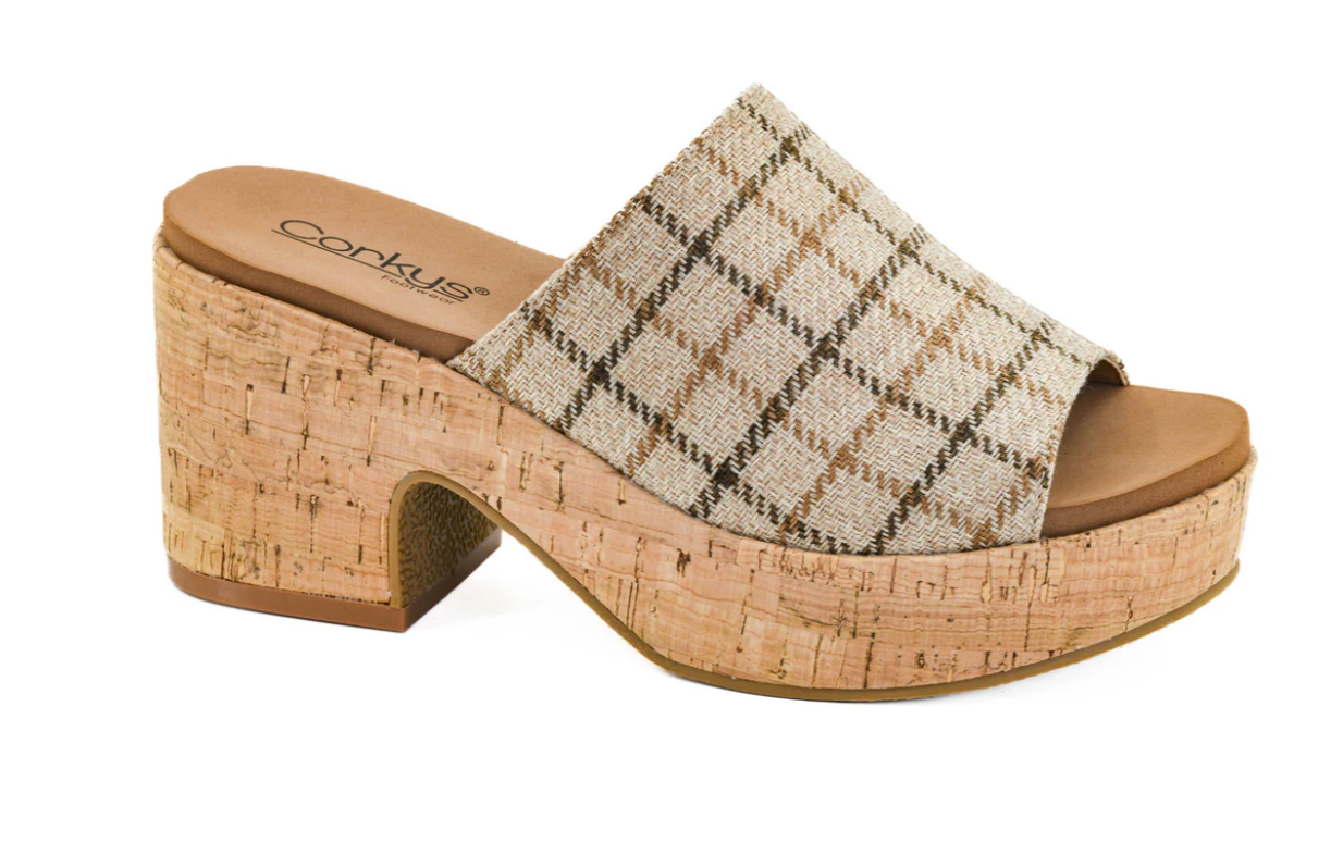 Step into effortless style and comfort with the Totally Buggin Wedge in Camel Plaid by Corkys. Featuring a cork block wedge and contouring foam footbed, these slides provide all-day support and cushioning. The neutral plaid top strap adds a versatile touch, making them easy to pair with dresses for a chic look or with denim and a blouse for casual days. Perfect for seasonal transitions, these wedges combine fashion and function to keep you comfortable and stylish wherever you go.