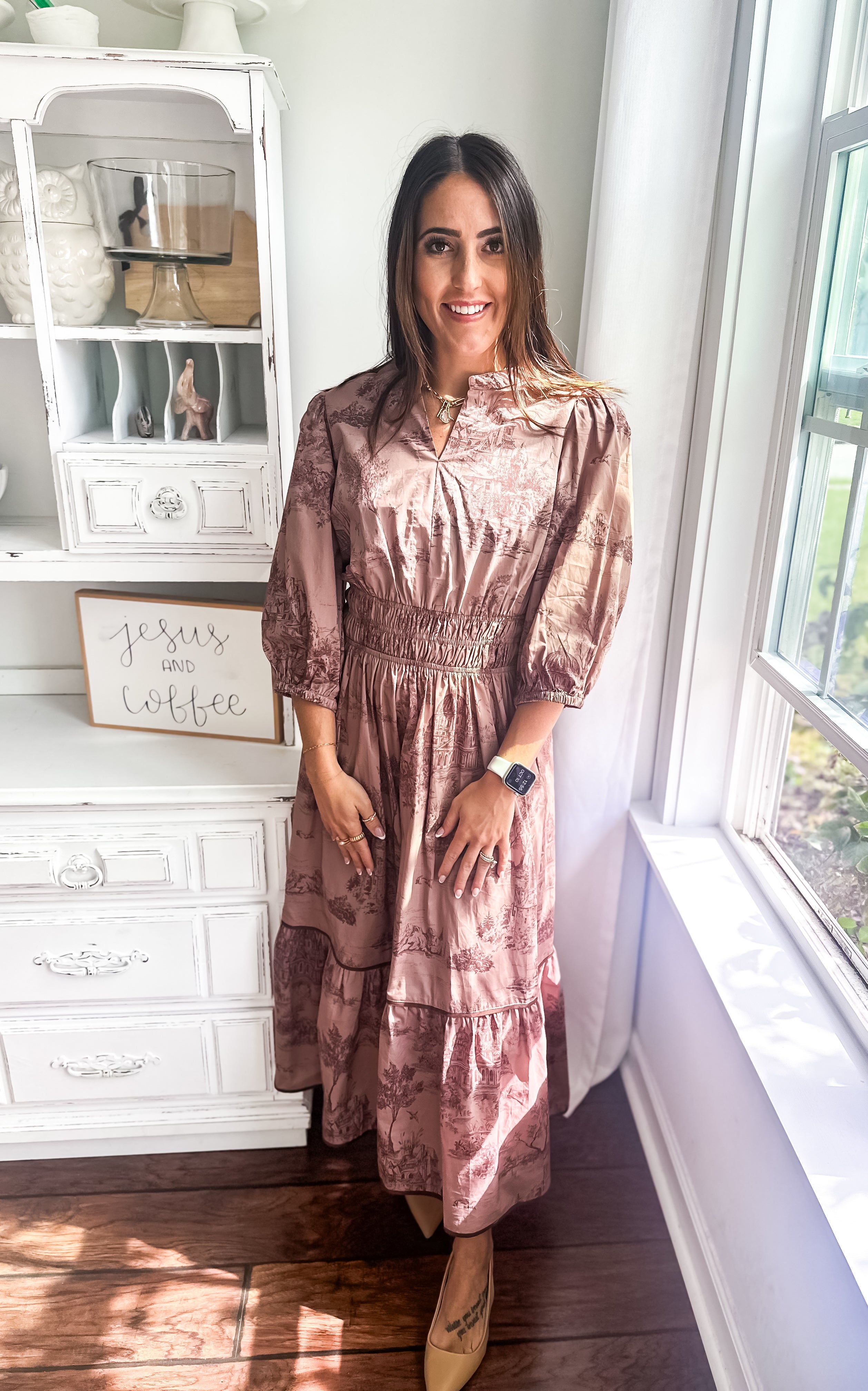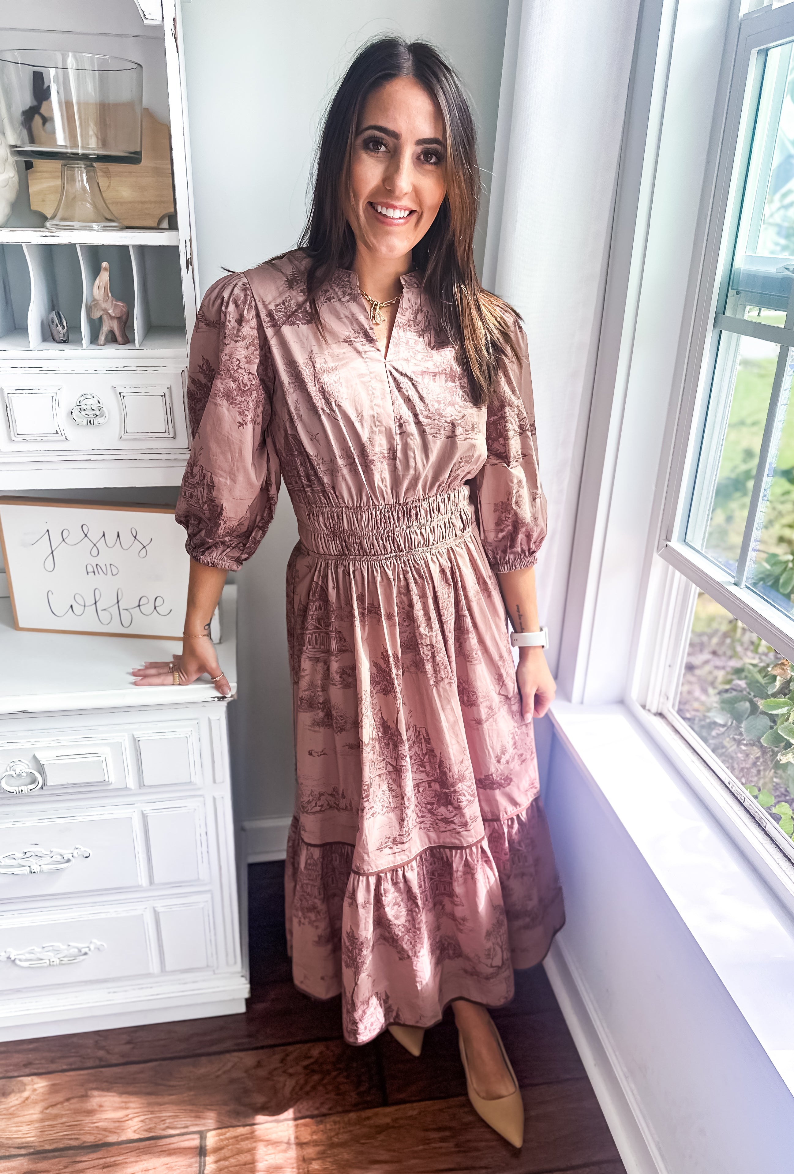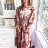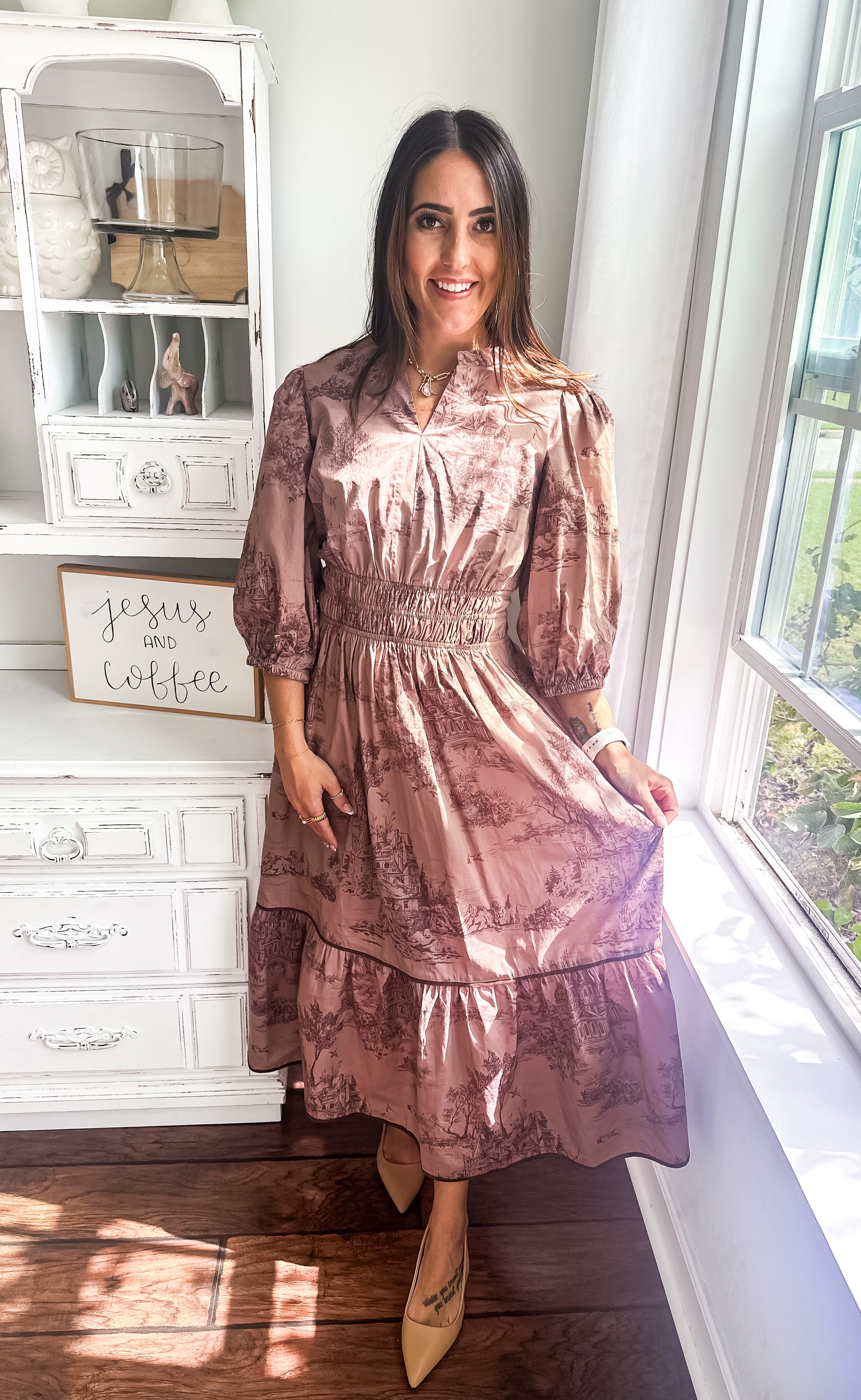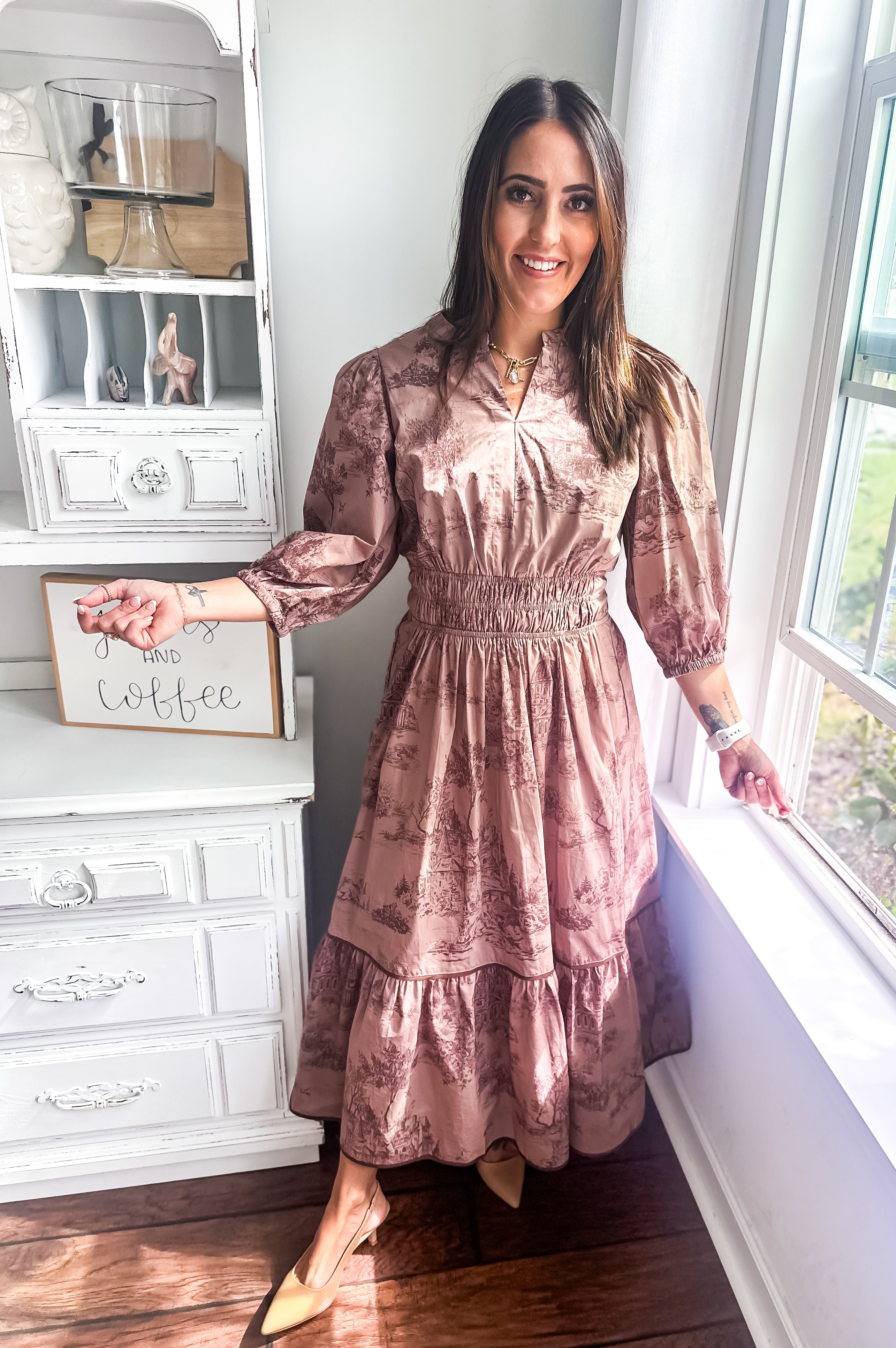 Discover effortless elegance with this midi dress, featuring a beautiful latte-colored landscape print. This dress showcases a tiered design that creates a flattering silhouette, enhanced by stylish contrast piping details for a touch of sophistication. With no lining, the lightweight fabric drapes gracefully, ensuring comfort and ease of movement. Perfect for any occasion, this versatile midi dress is a chic addition to your wardrobe, ideal for dressing up or down with ease.
