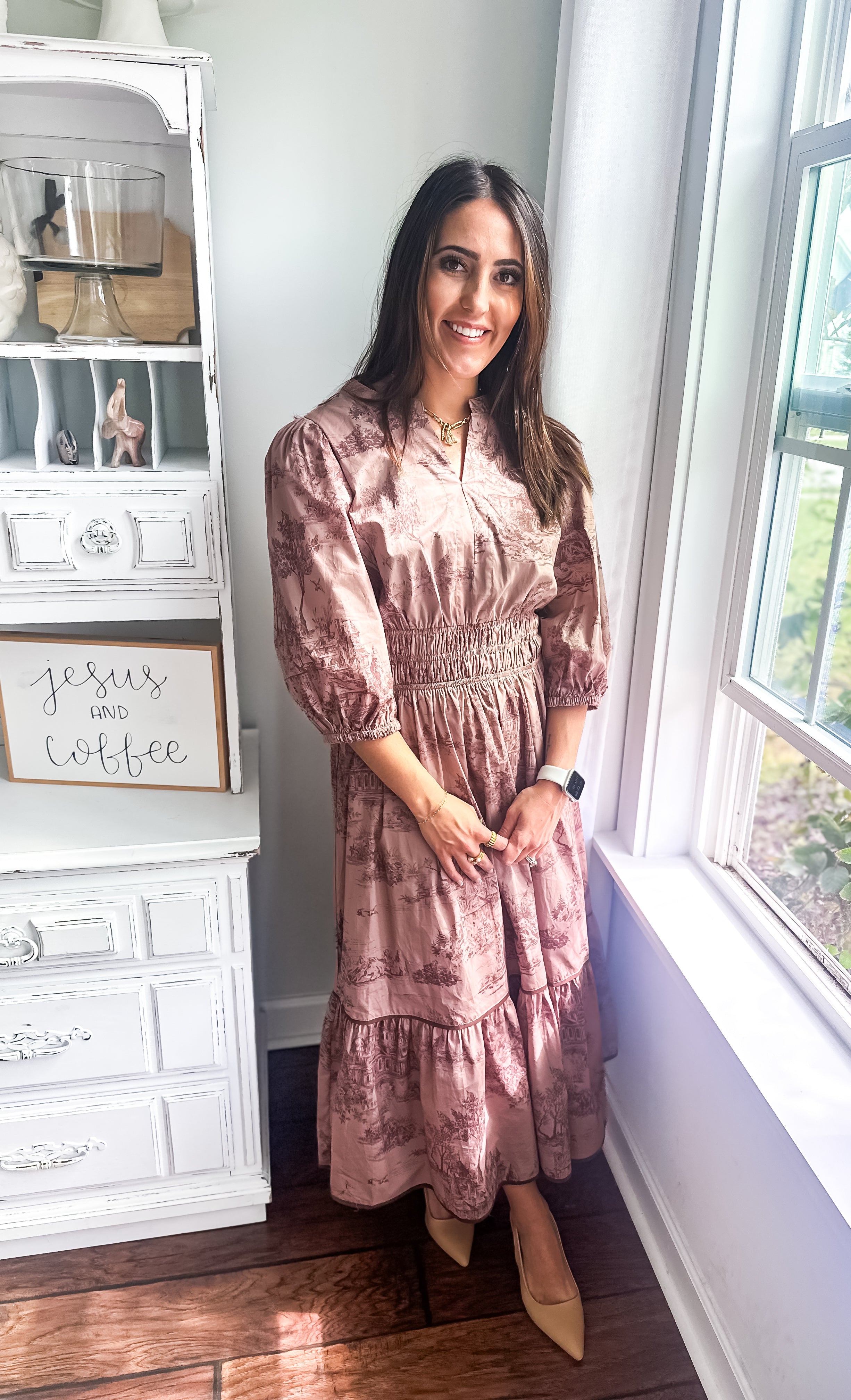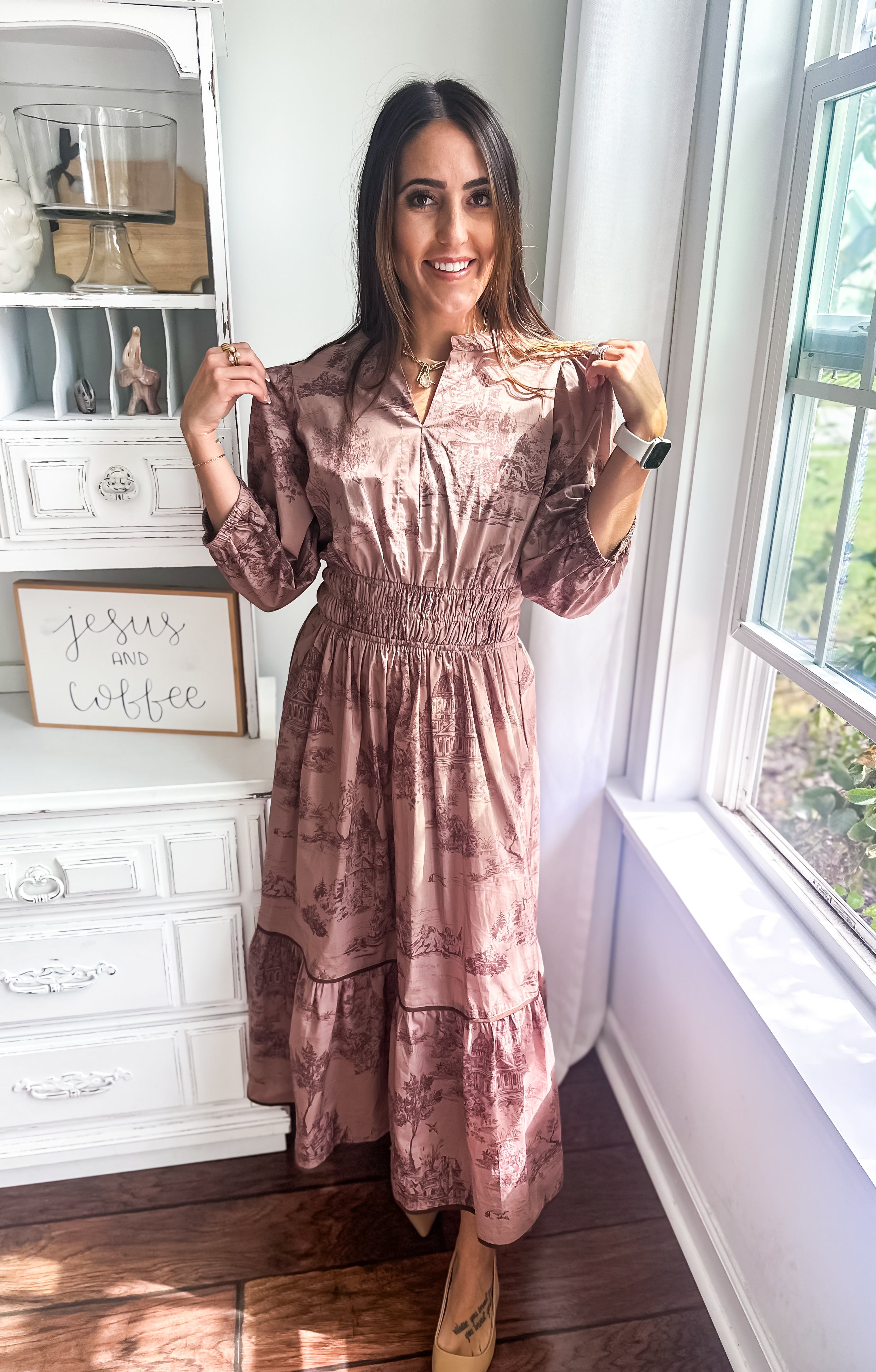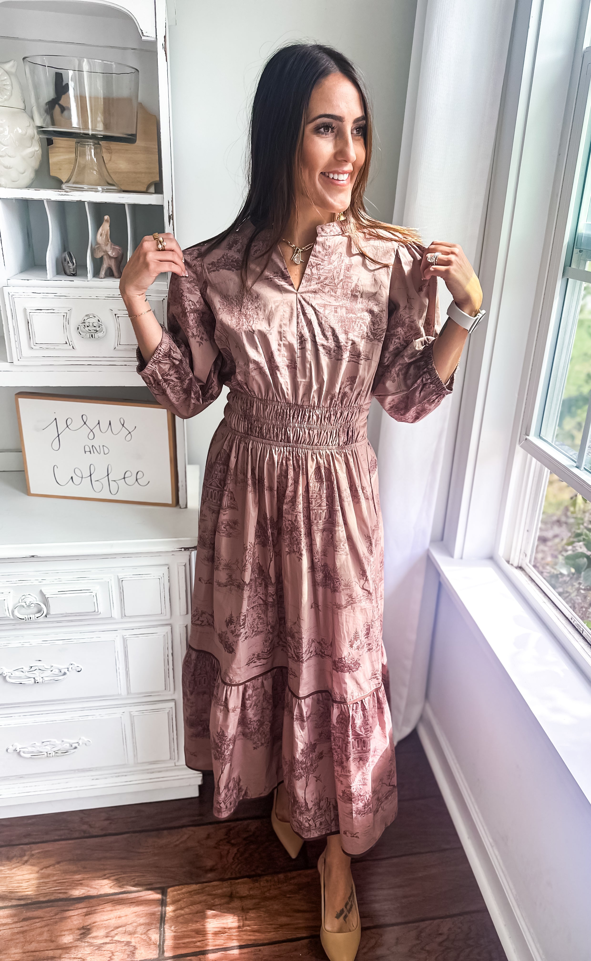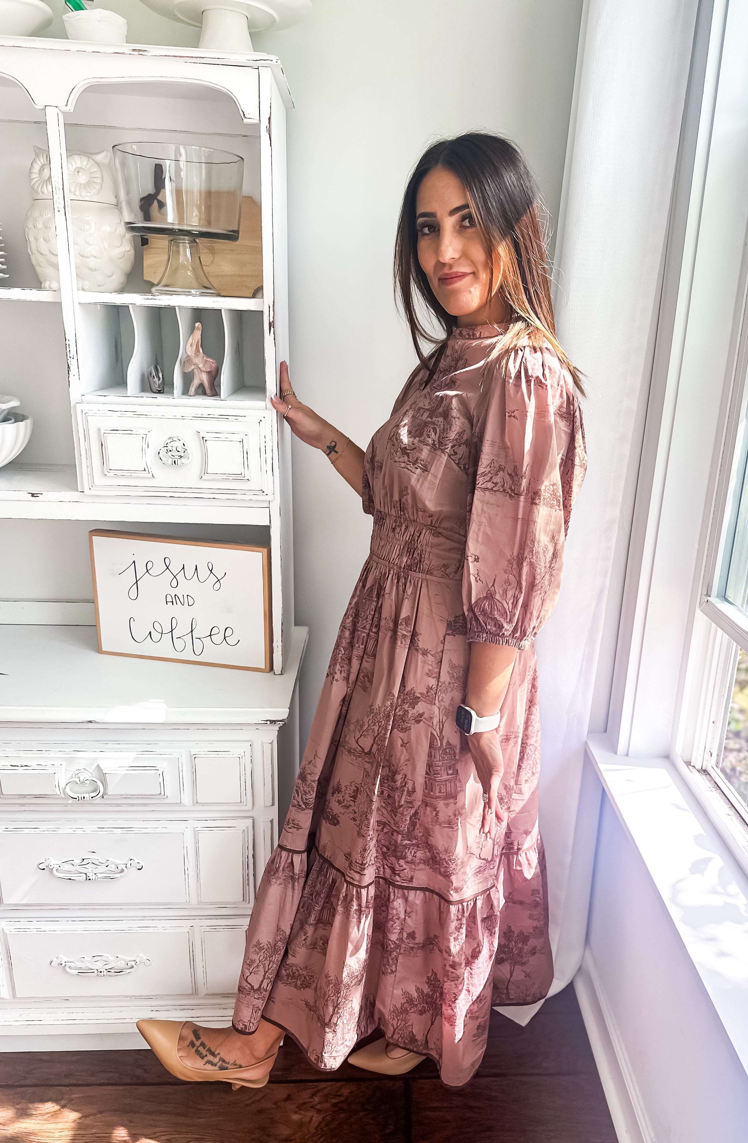 Discover effortless elegance with this midi dress, featuring a beautiful latte-colored landscape print. This dress showcases a tiered design that creates a flattering silhouette, enhanced by stylish contrast piping details for a touch of sophistication. With no lining, the lightweight fabric drapes gracefully, ensuring comfort and ease of movement. Perfect for any occasion, this versatile midi dress is a chic addition to your wardrobe, ideal for dressing up or down with ease.