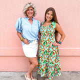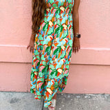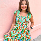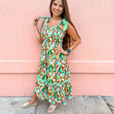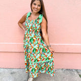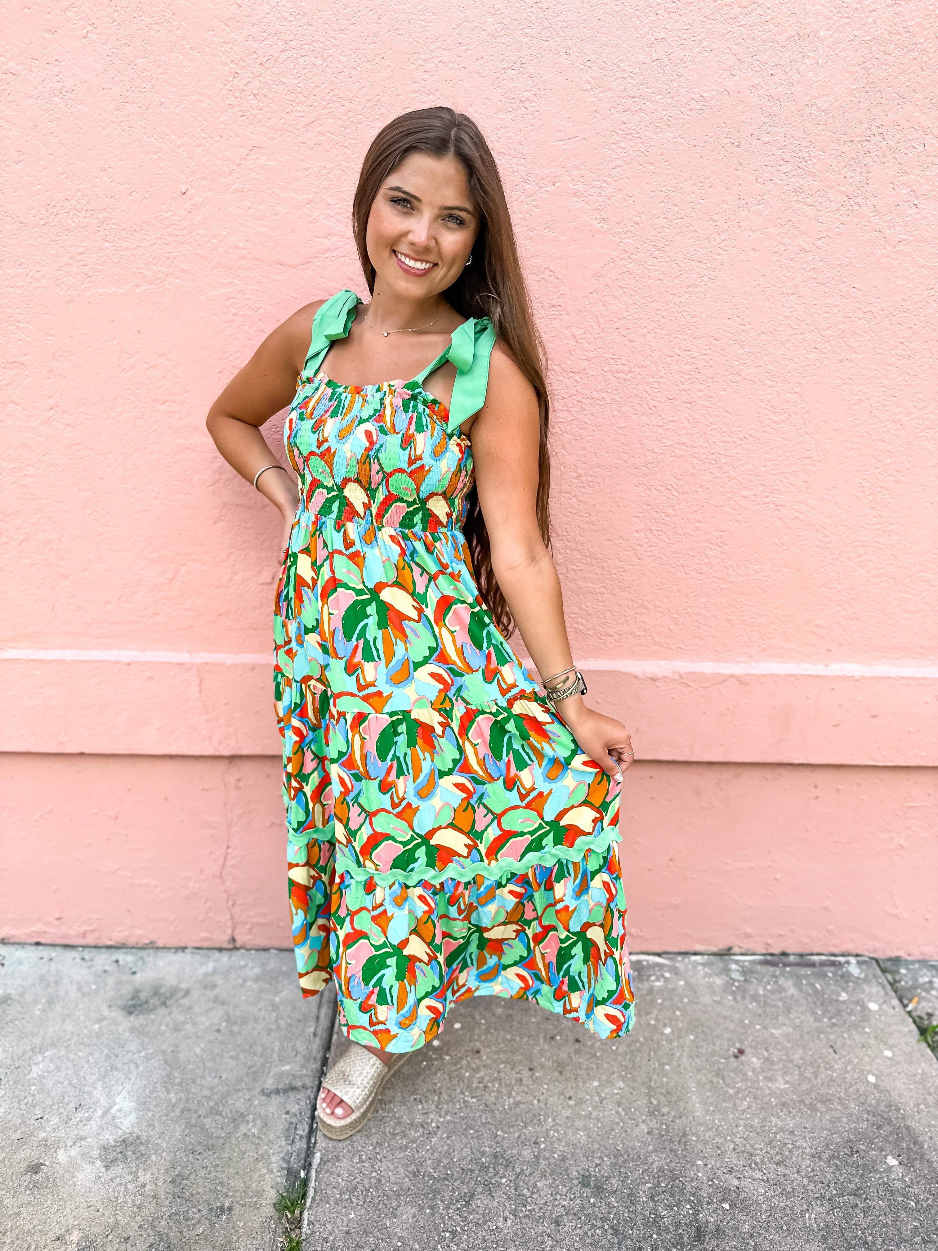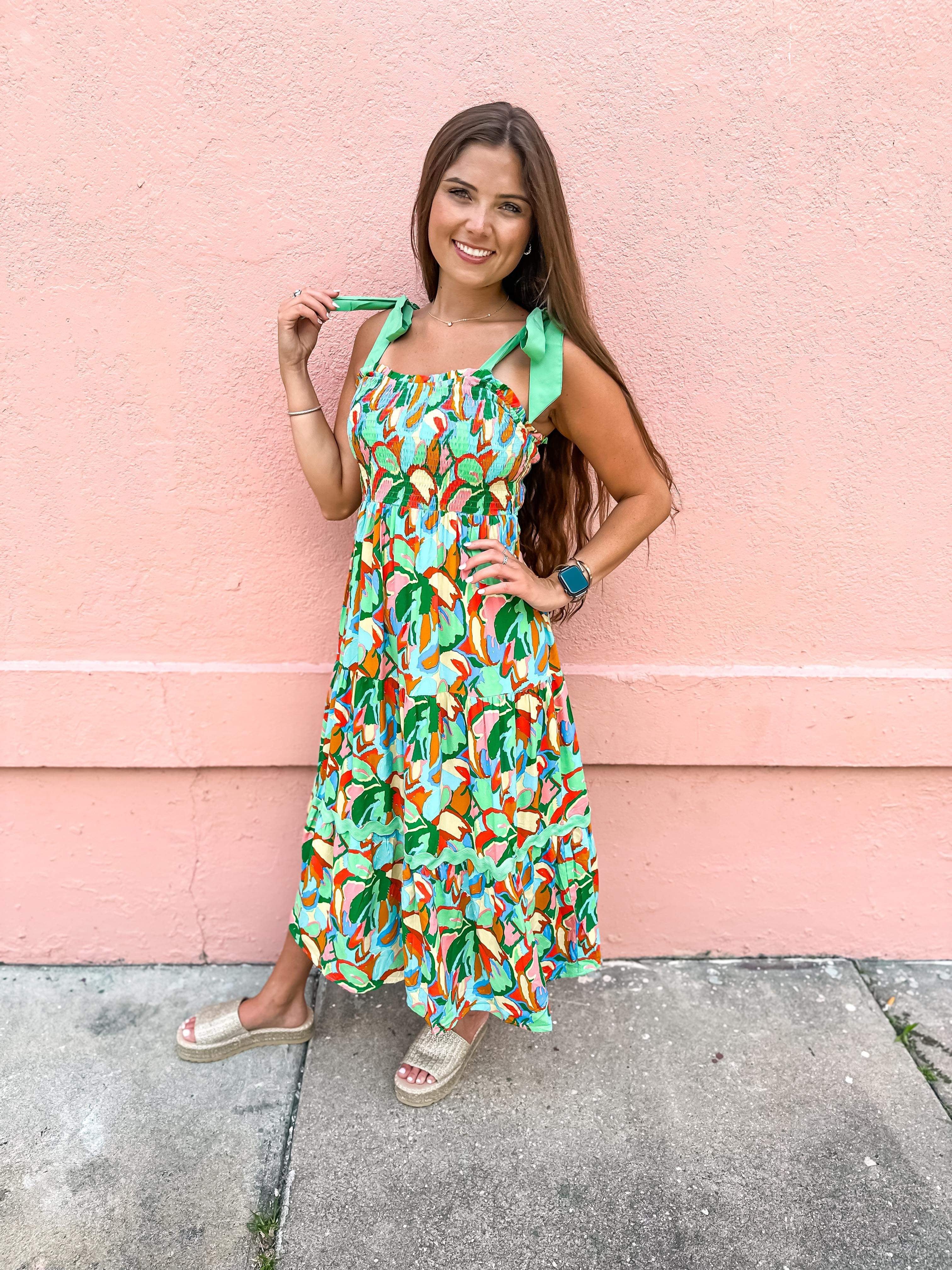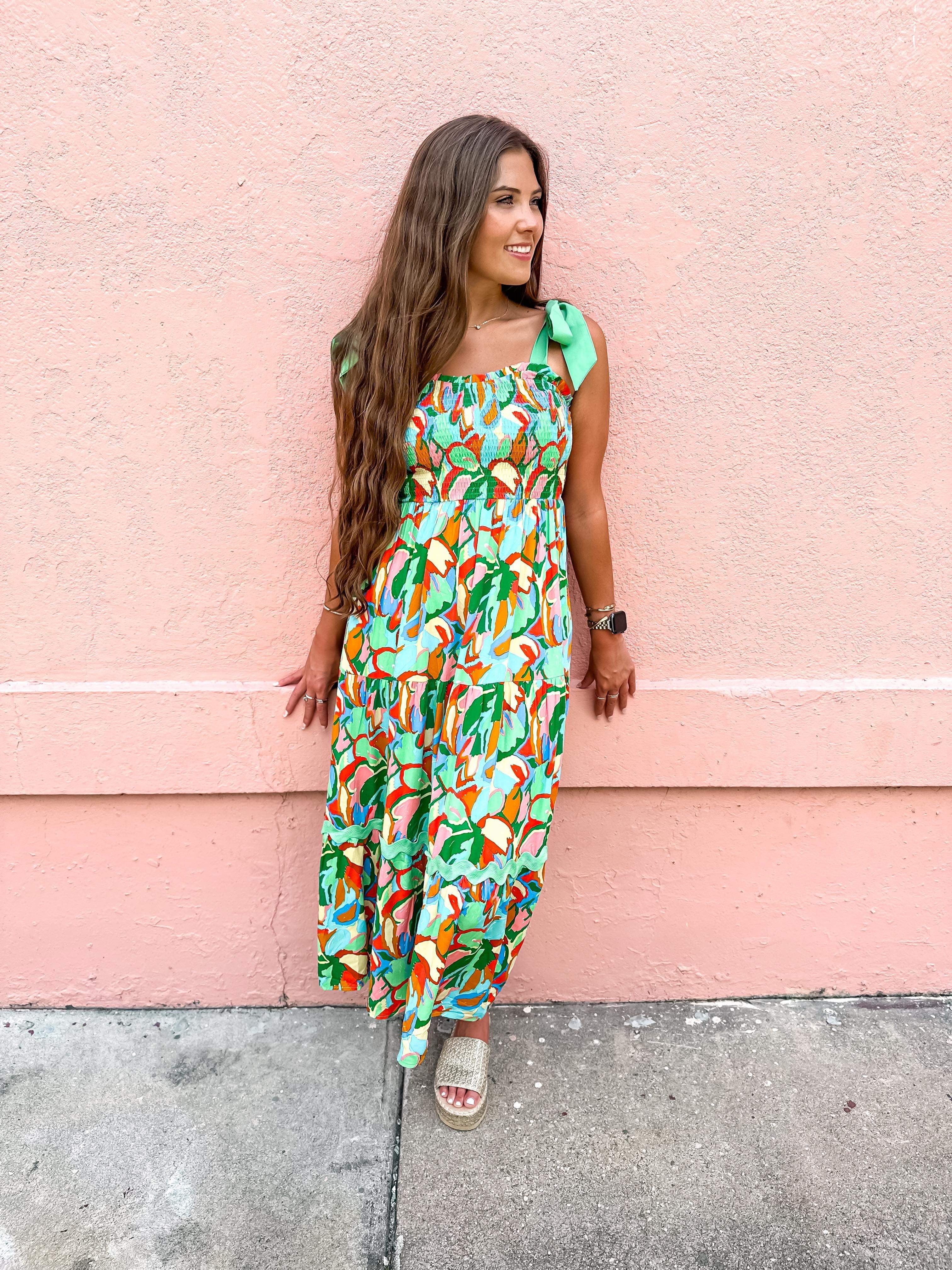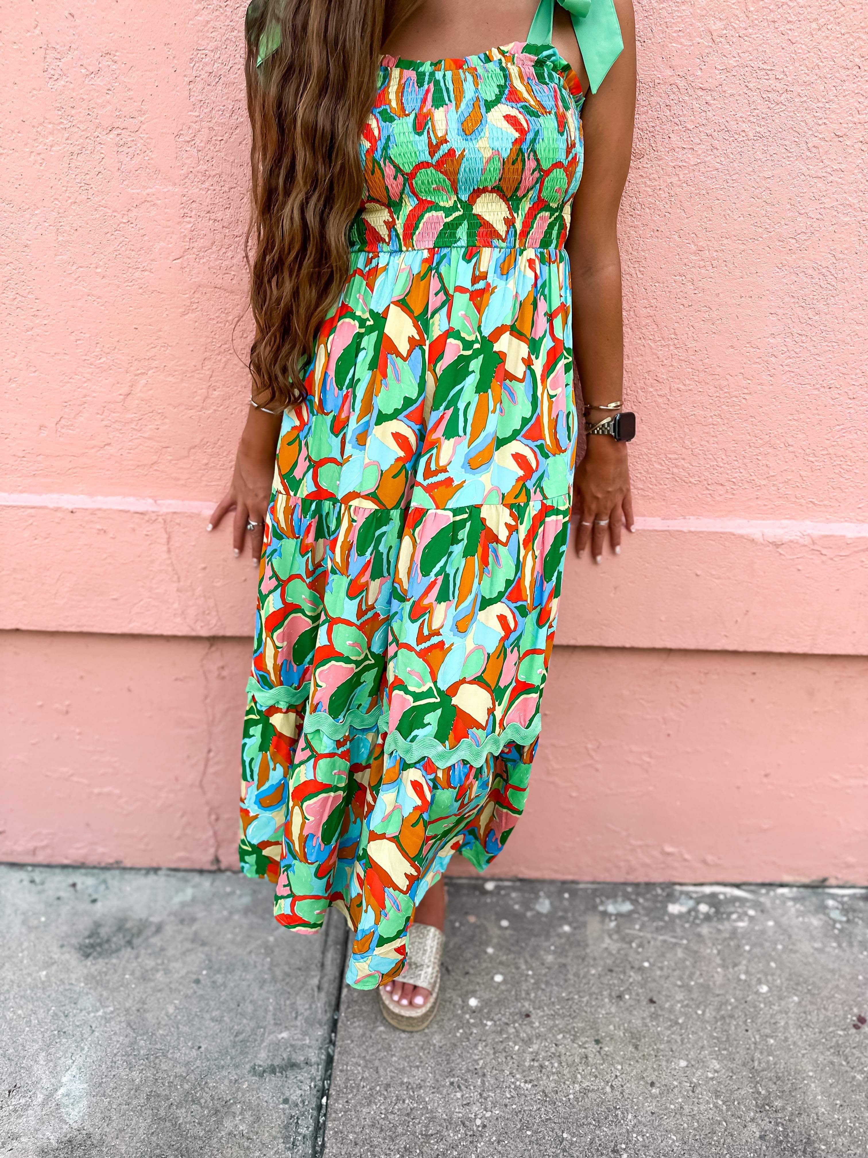 Abstract Print A-Line Maxi Dress with Contrast Ties & Ric Rac Trim
