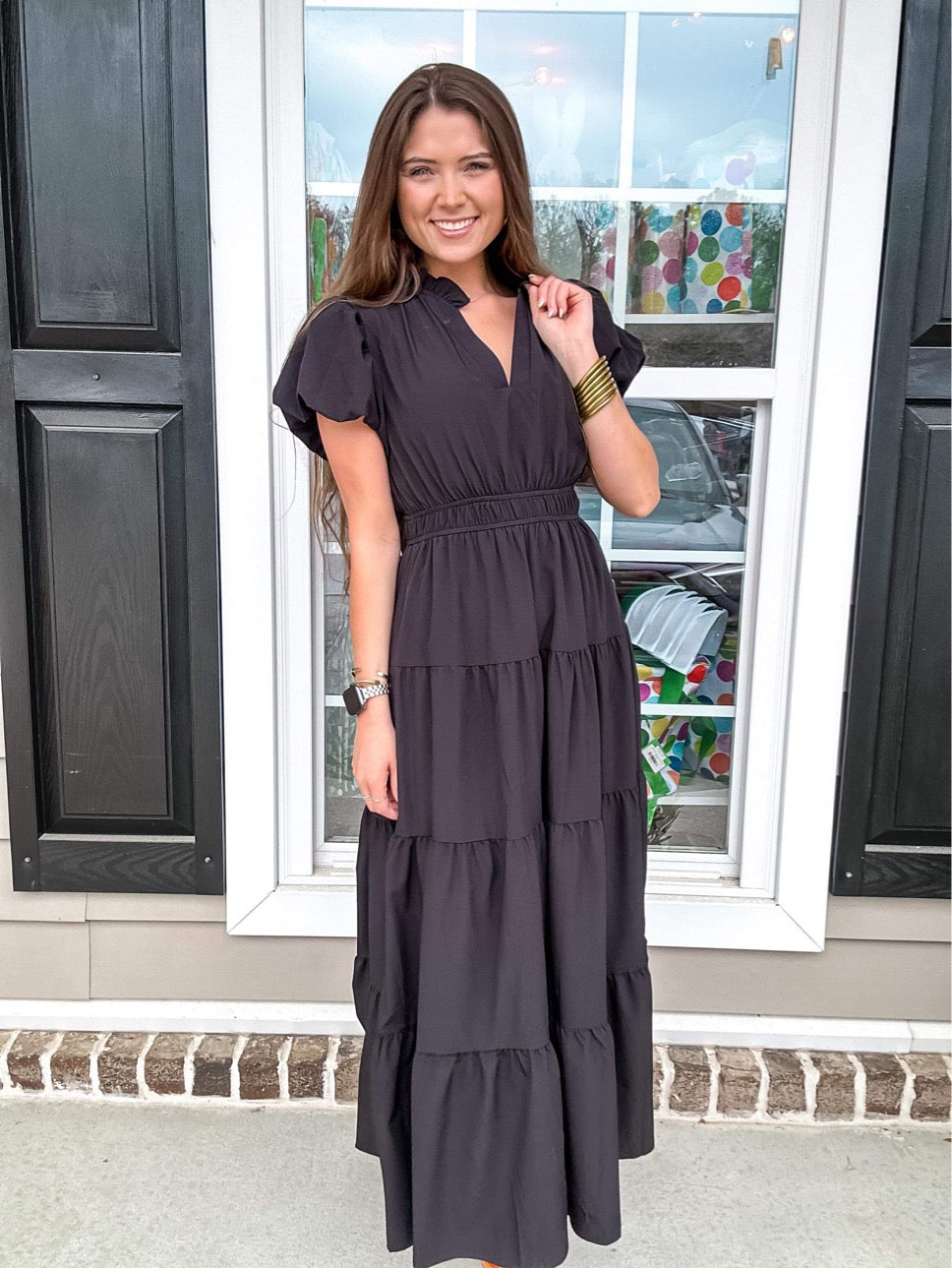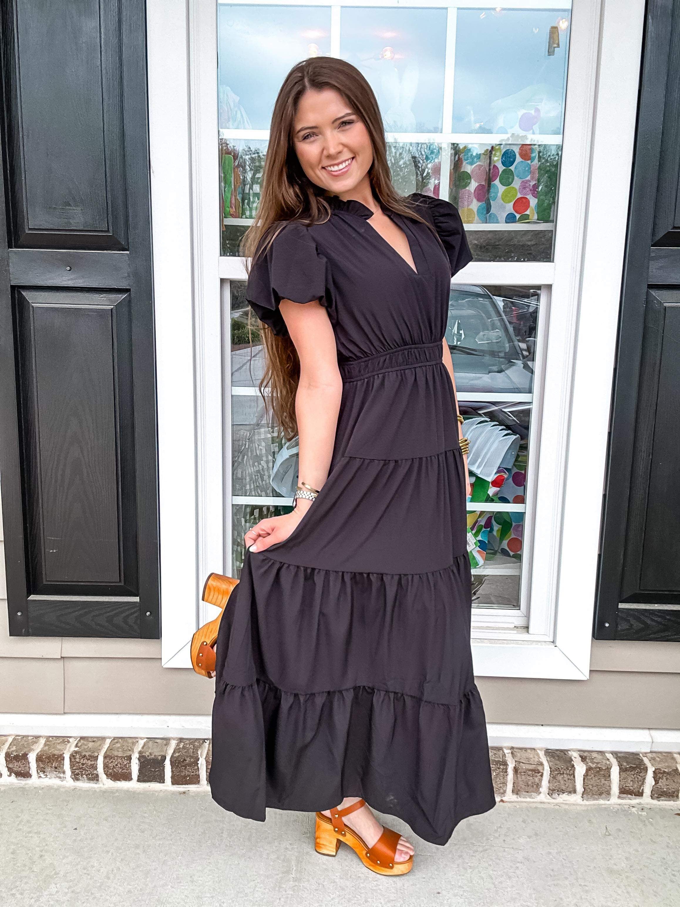 V-neck bubble sleeve tiered midi dress featuring elastic waistband. Ruffle neckline detail. Lined. Woven. Non-sheer. Lightweight.