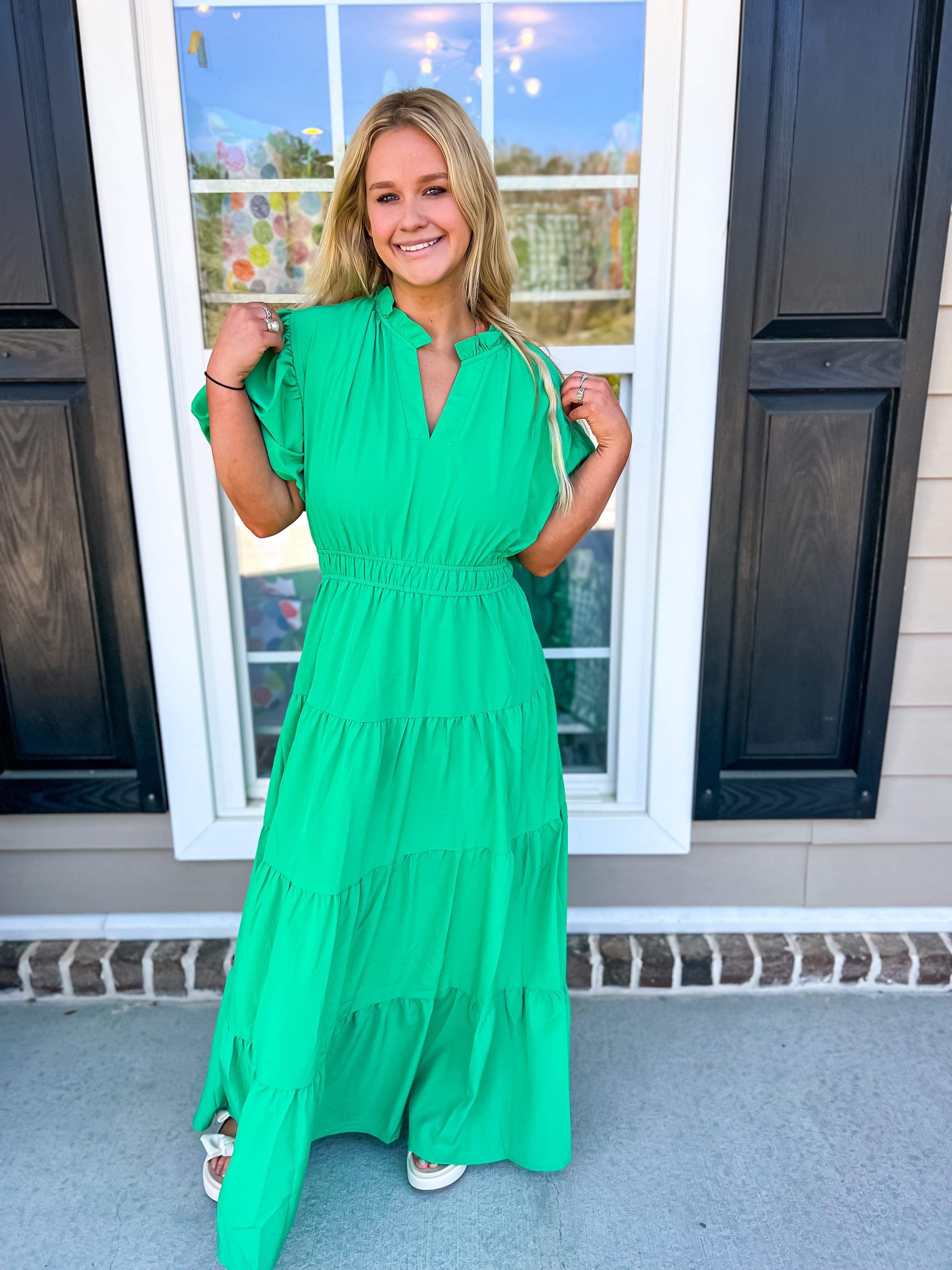 V-neck bubble sleeve tiered midi dress featuring elastic waistband. Ruffle neckline detail. Lined. Woven. Non-sheer. Lightweight.