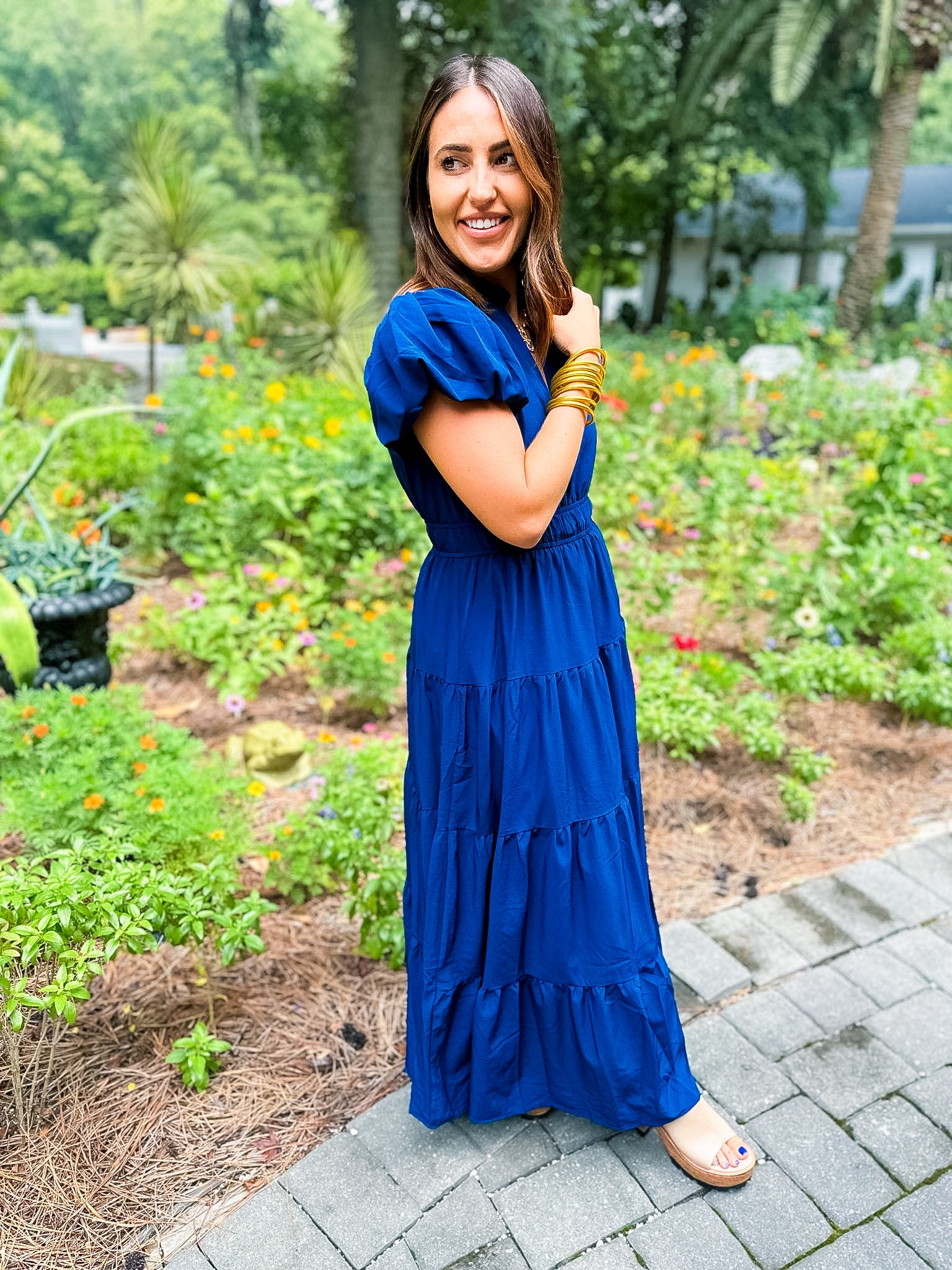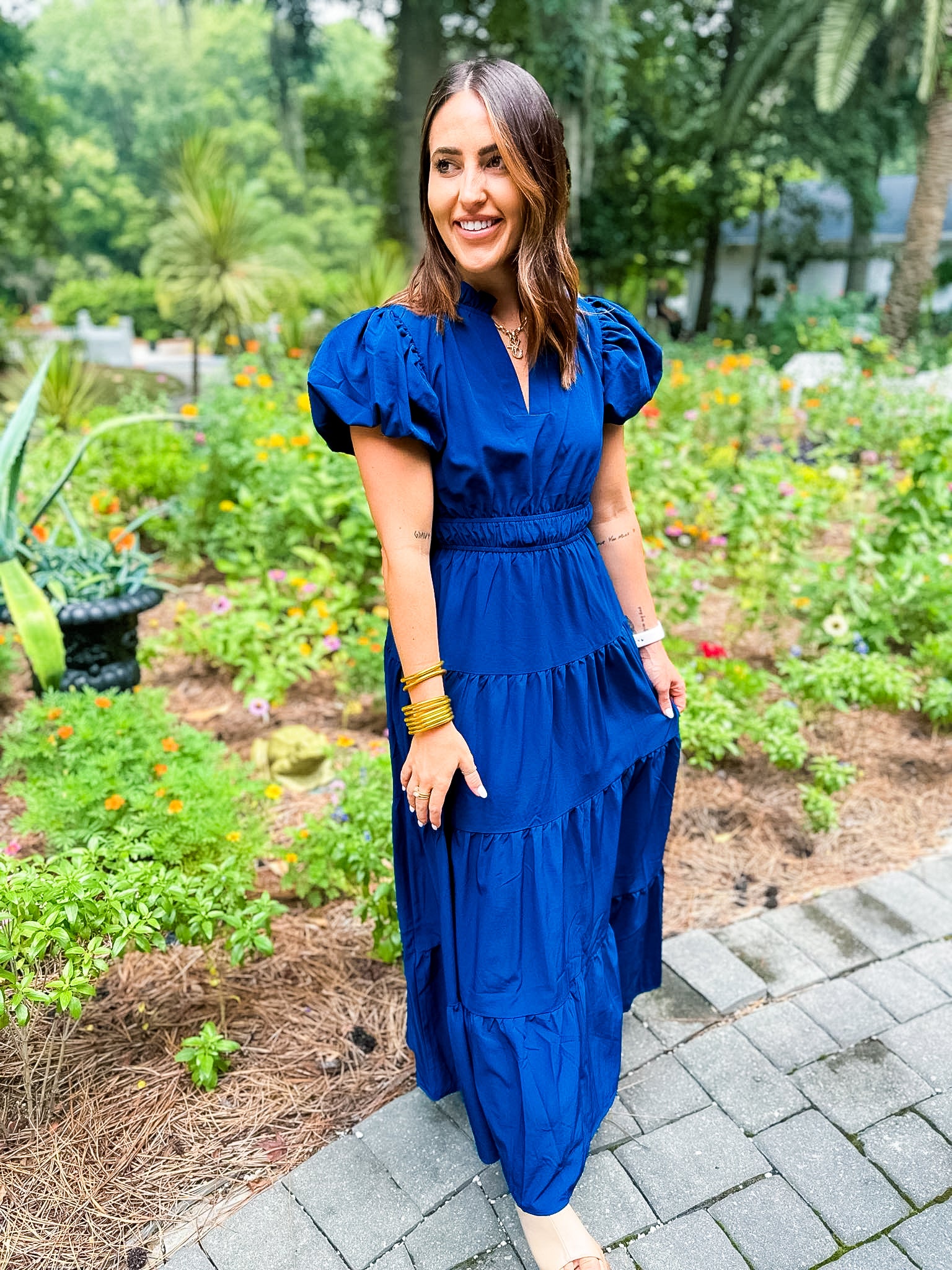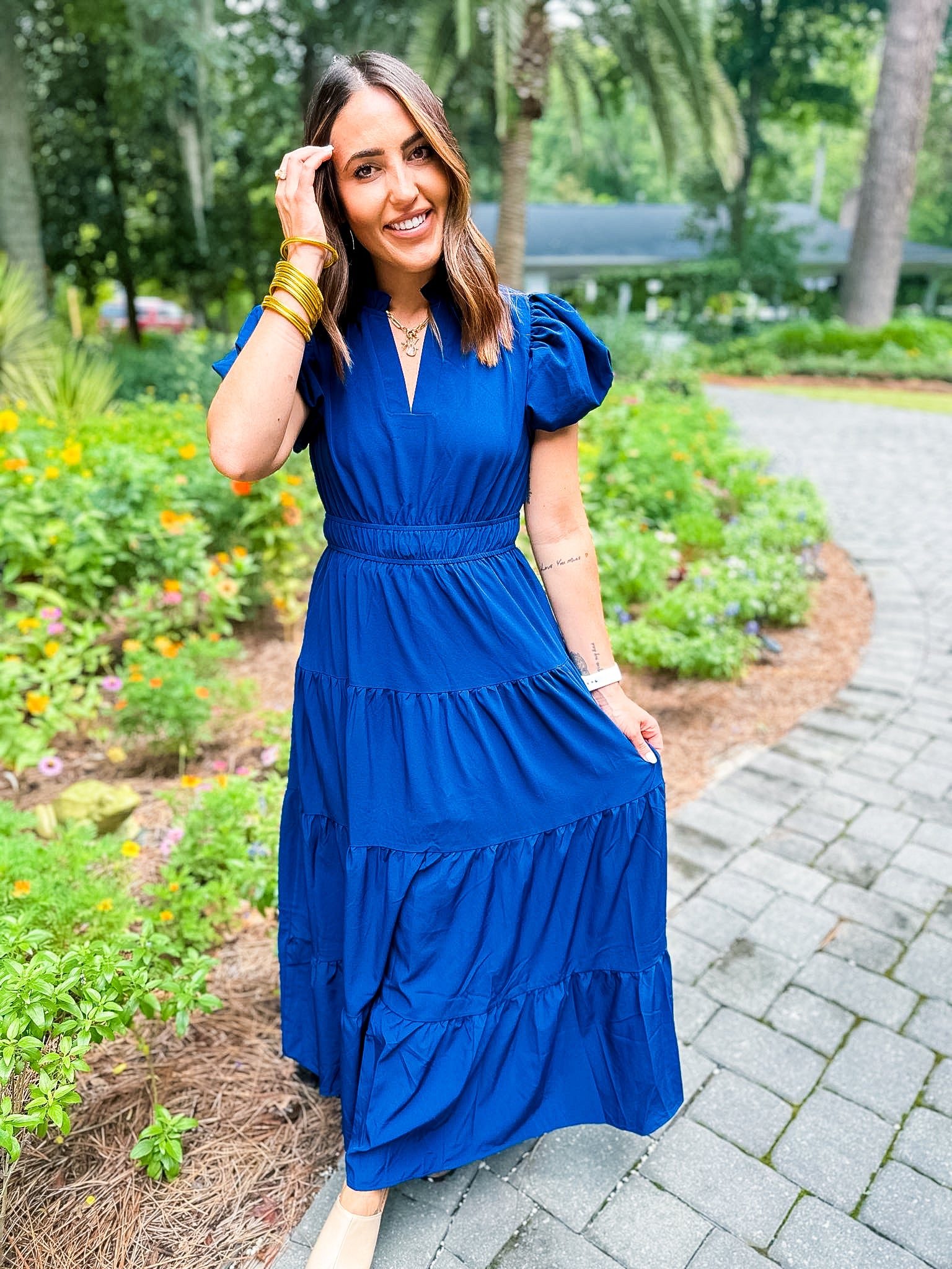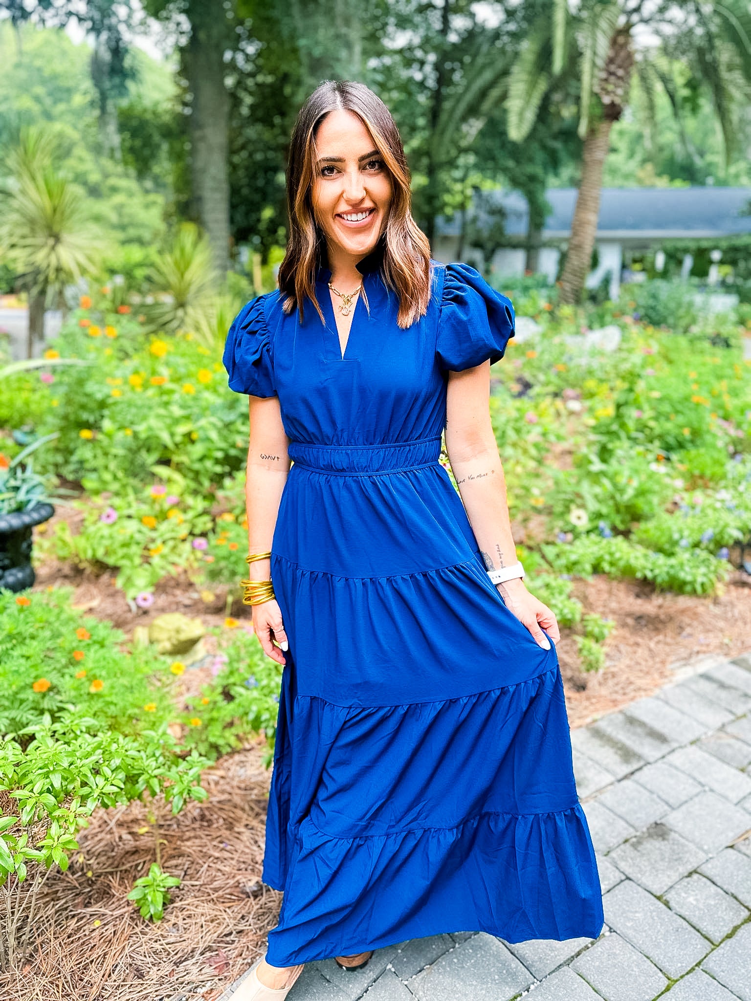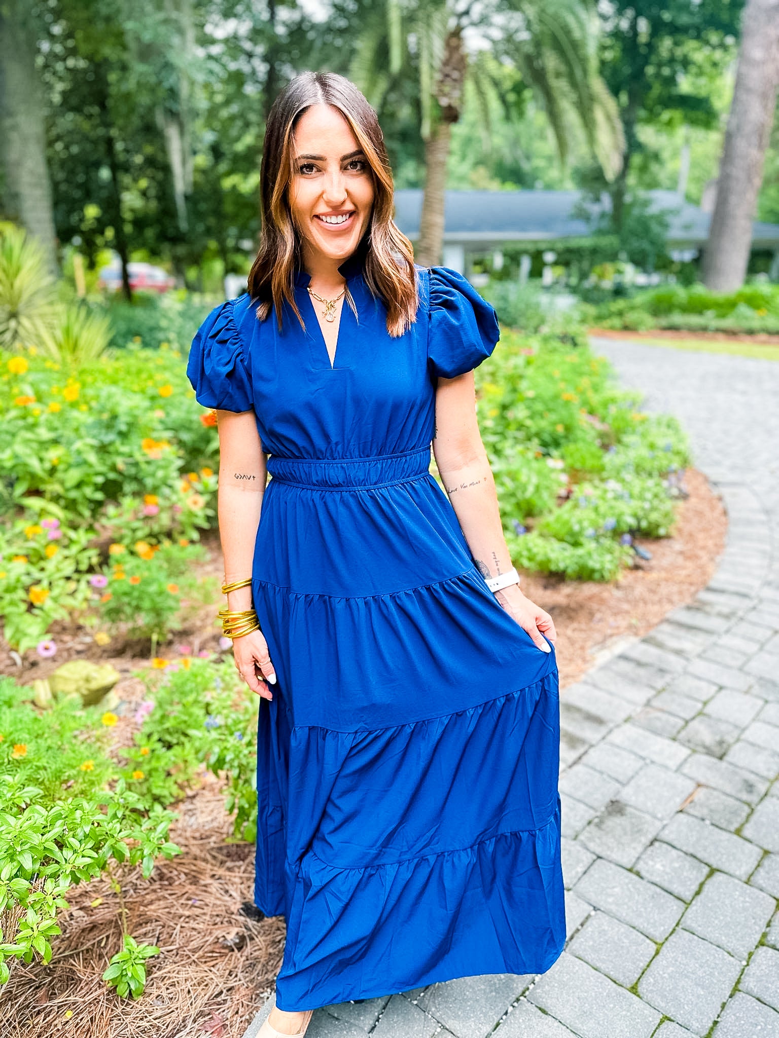 Solid v-neck bubble sleeve tiered midi dress featuring elastic waistband. Ruffle neckline detail. Lined. Woven. Non-sheer. Lightweight.