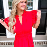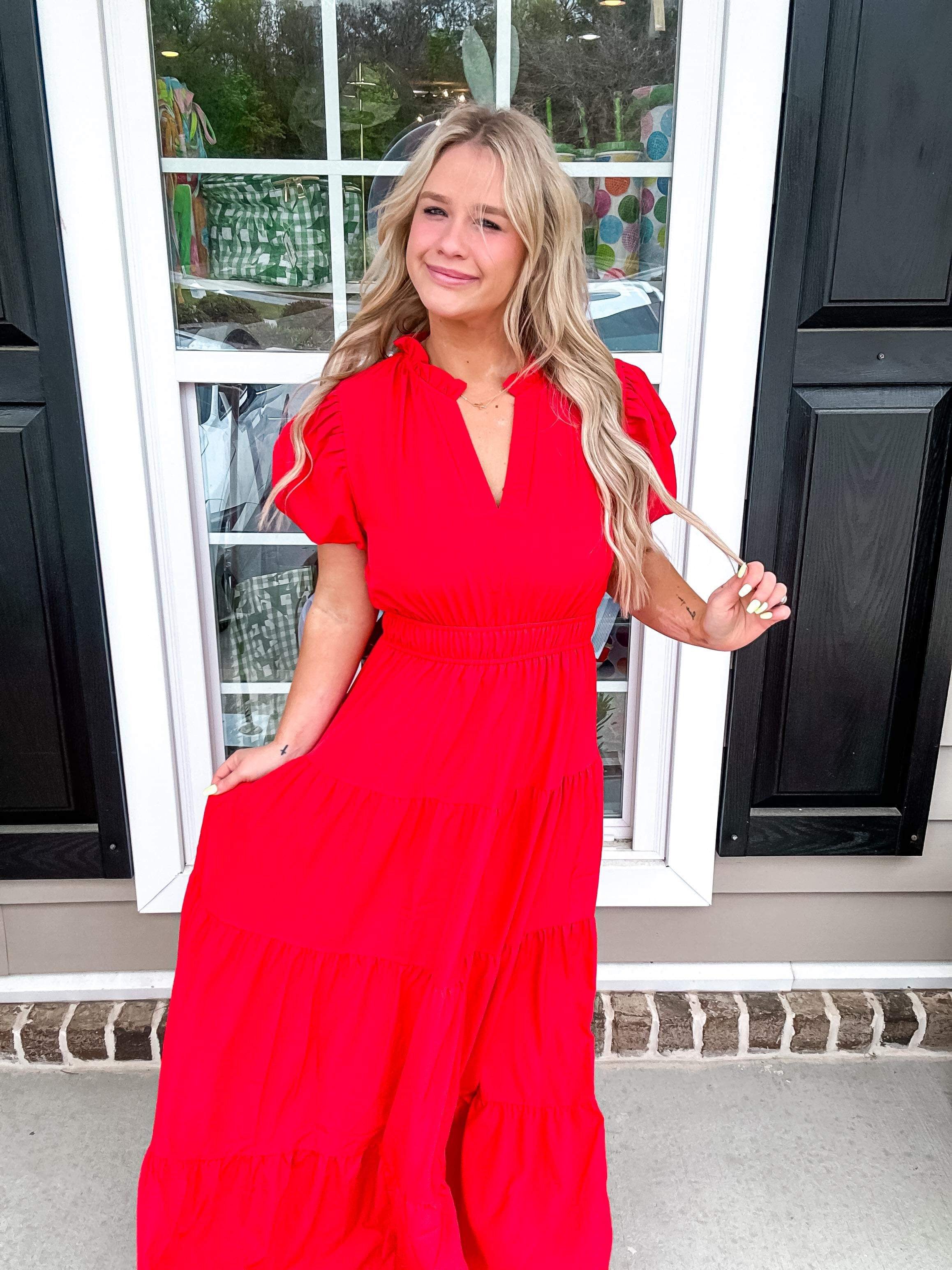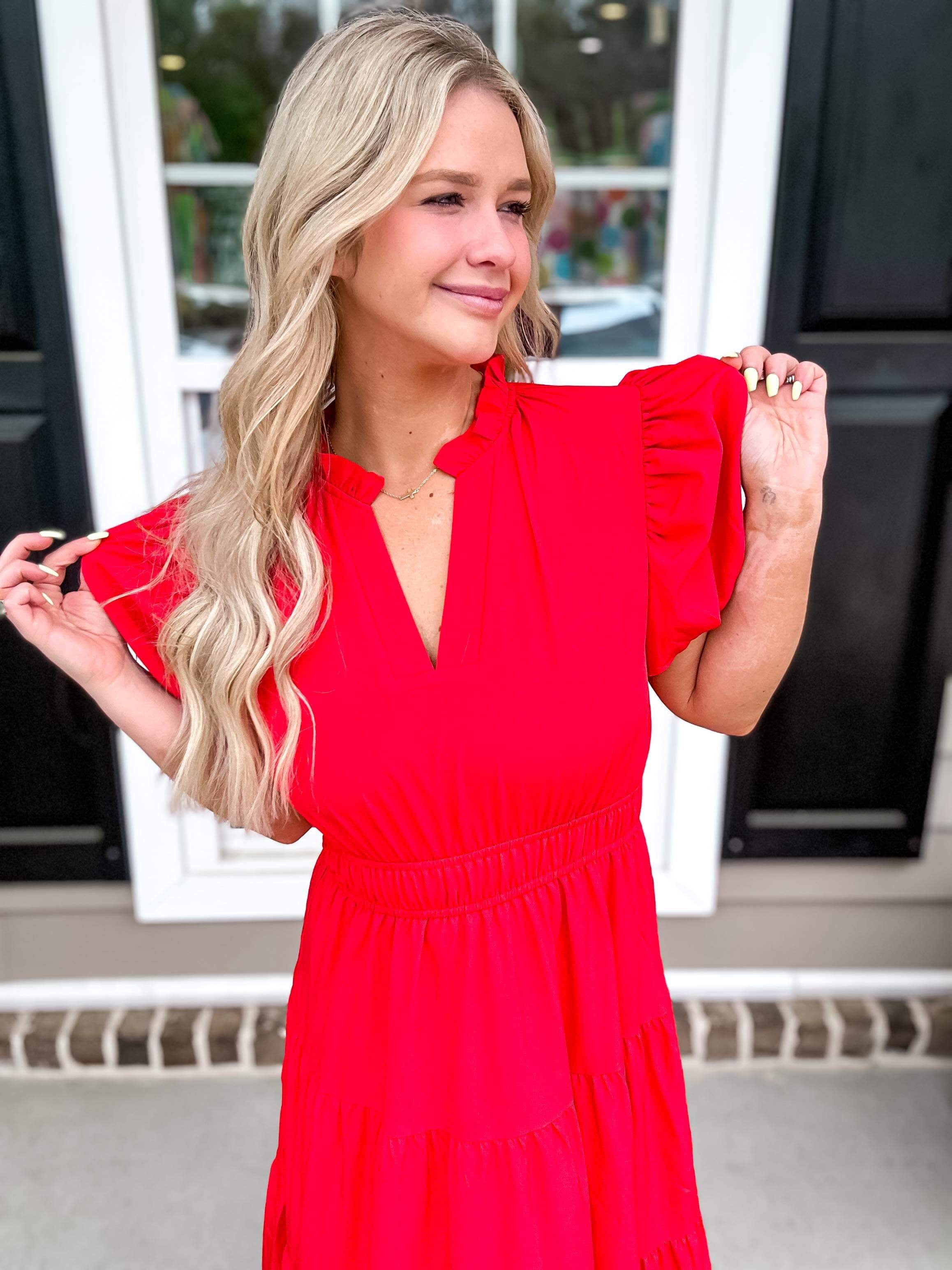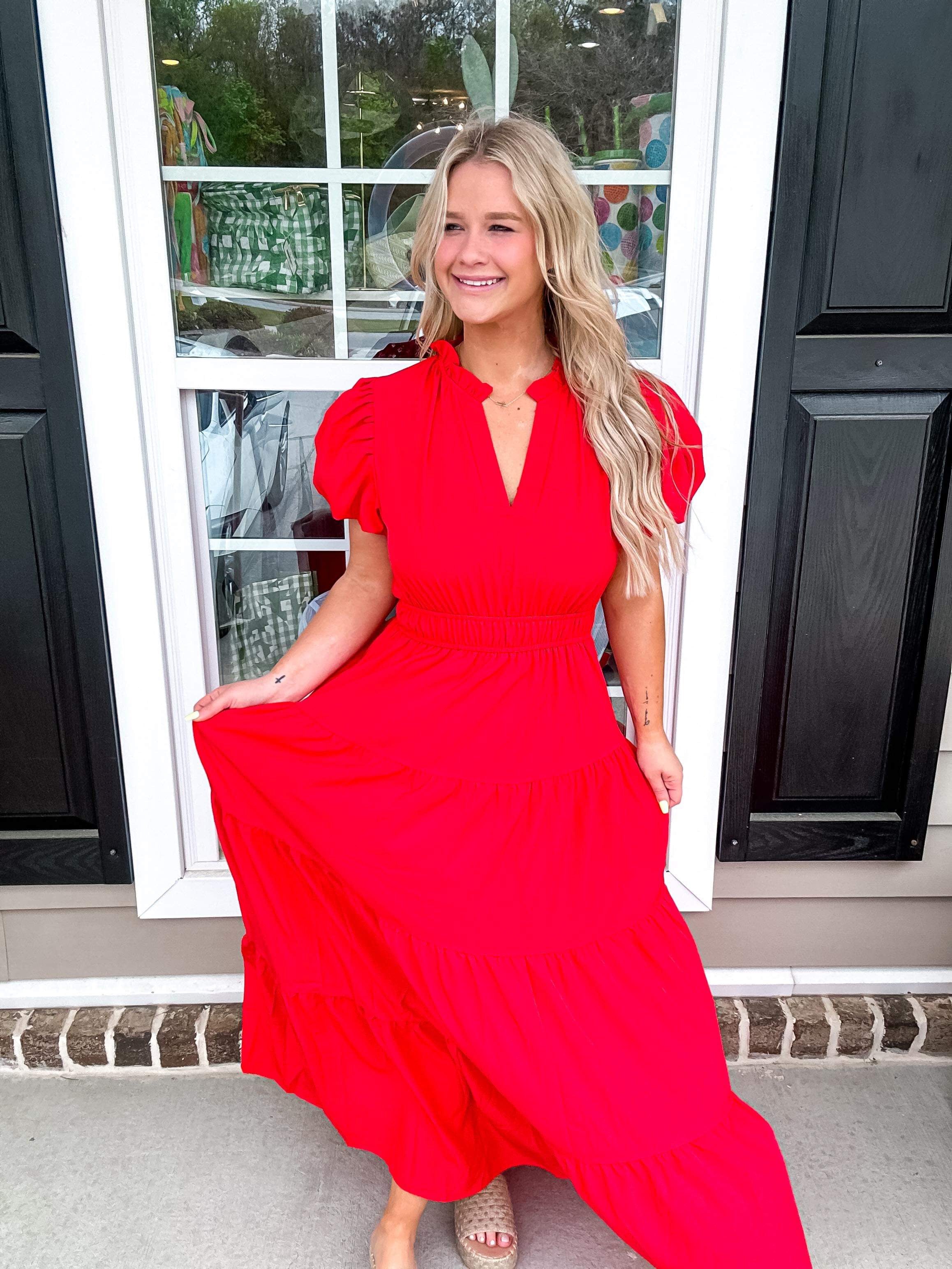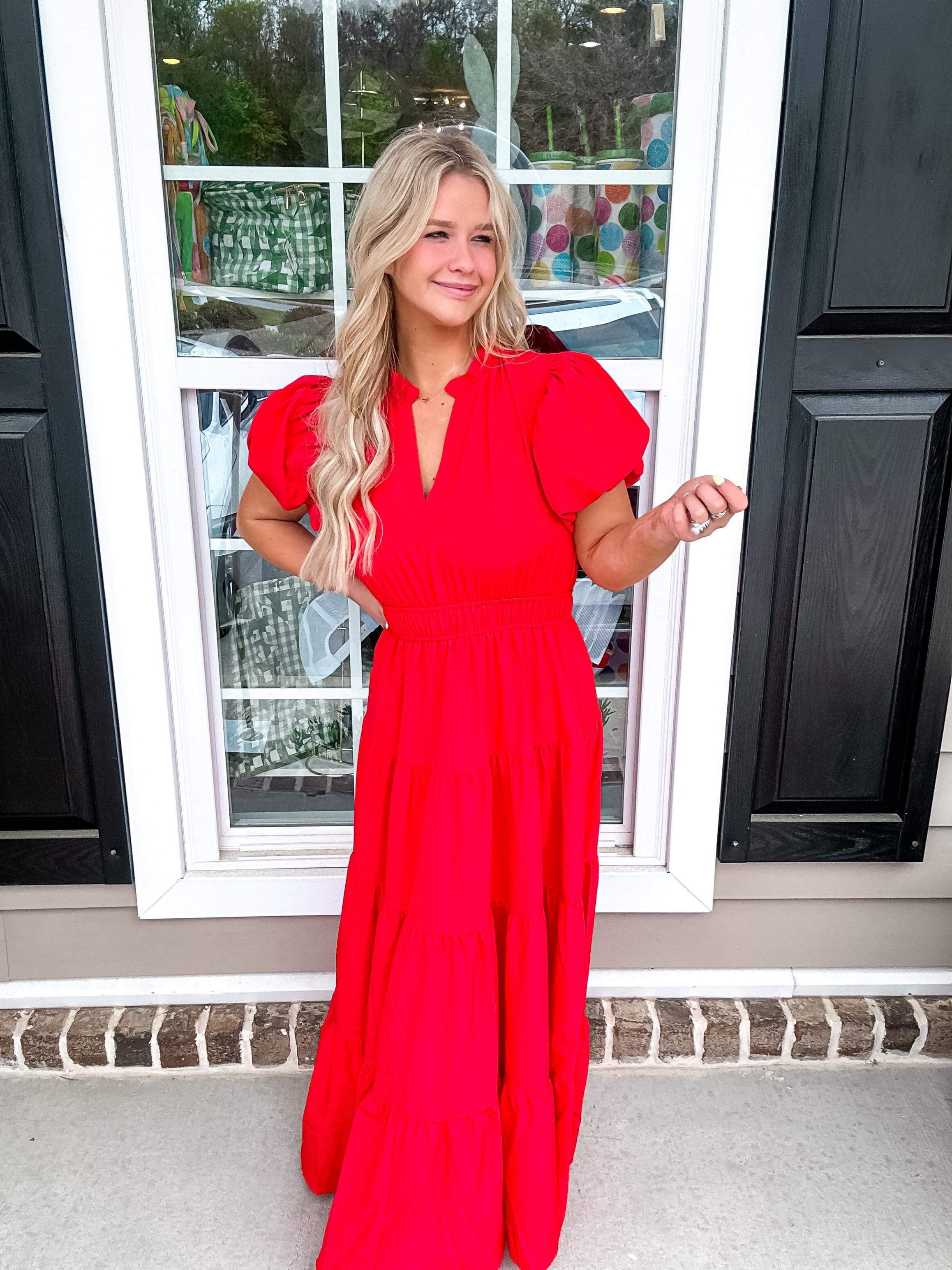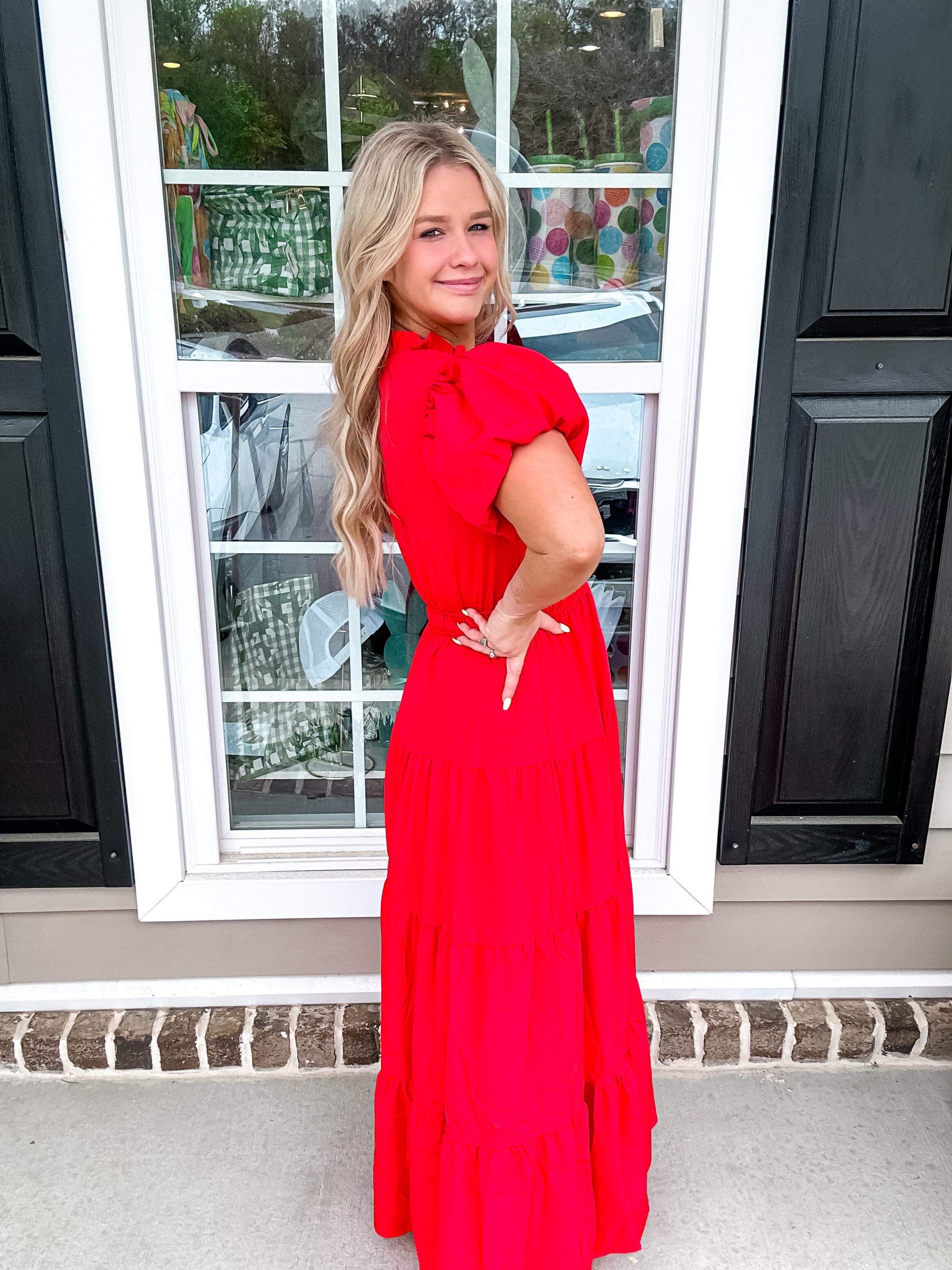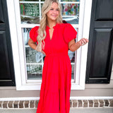 V-neck bubble sleeve tiered midi dress featuring elastic waistband. Ruffle neckline detail. Lined. Woven. Non-sheer. Lightweight.