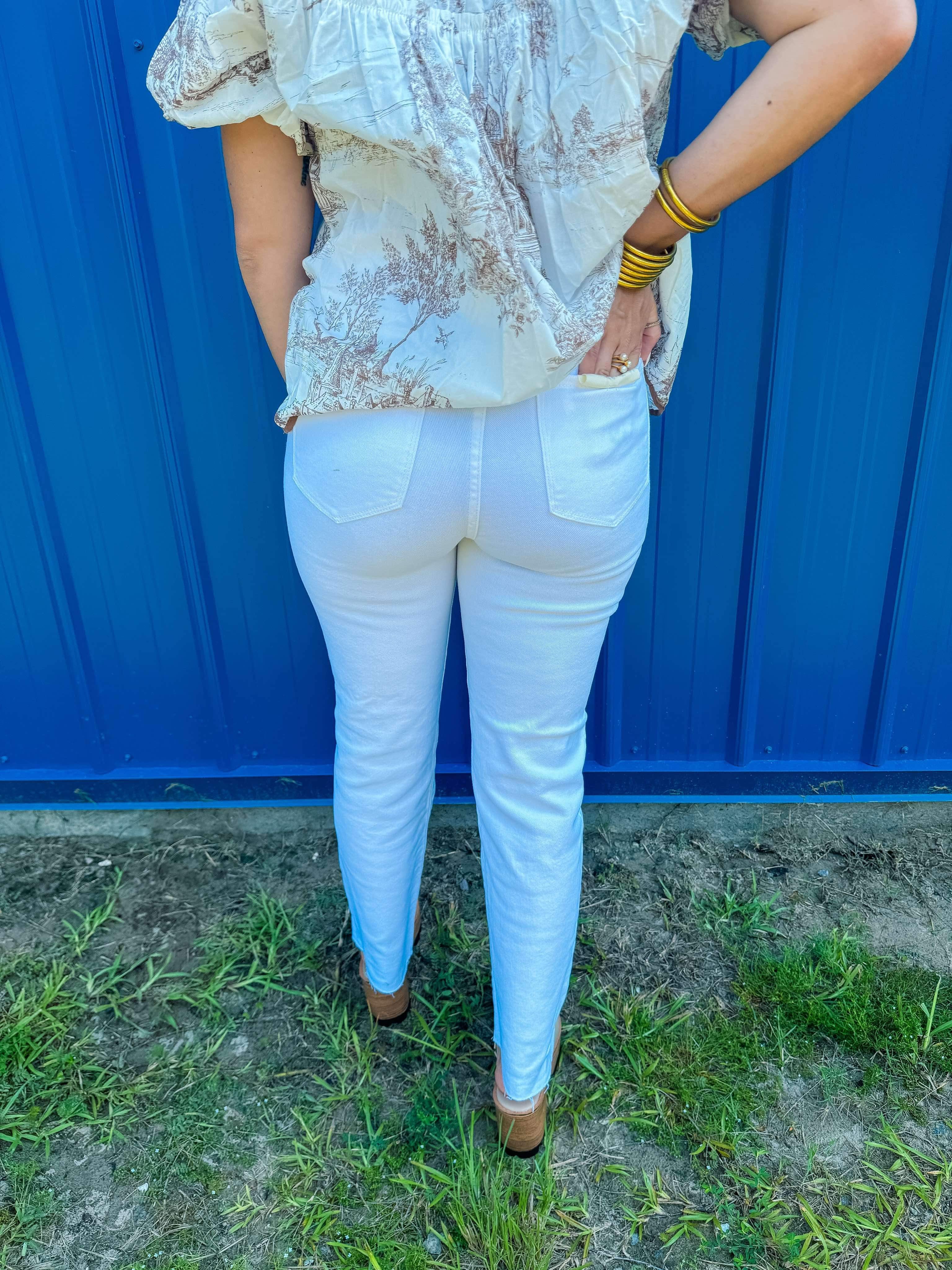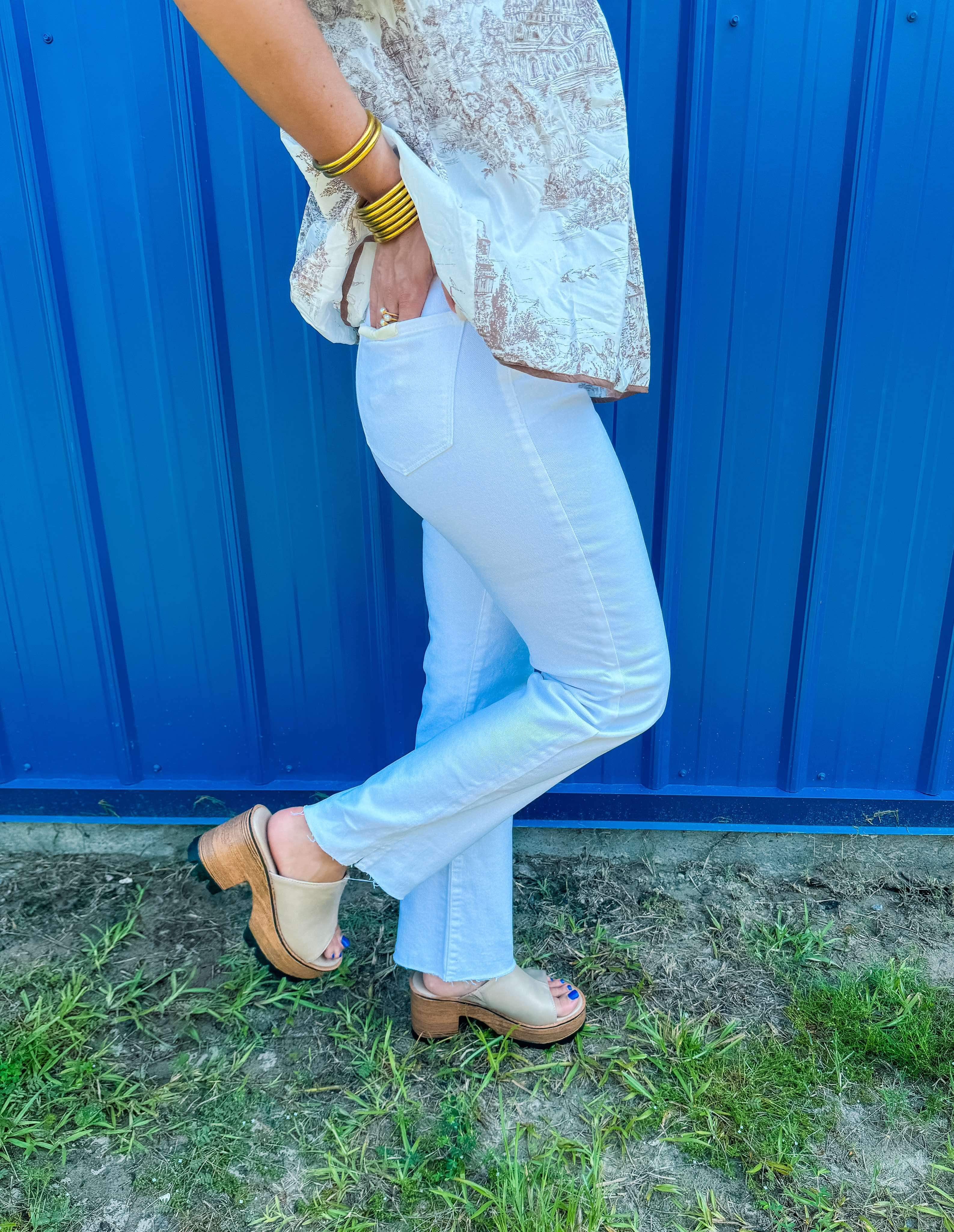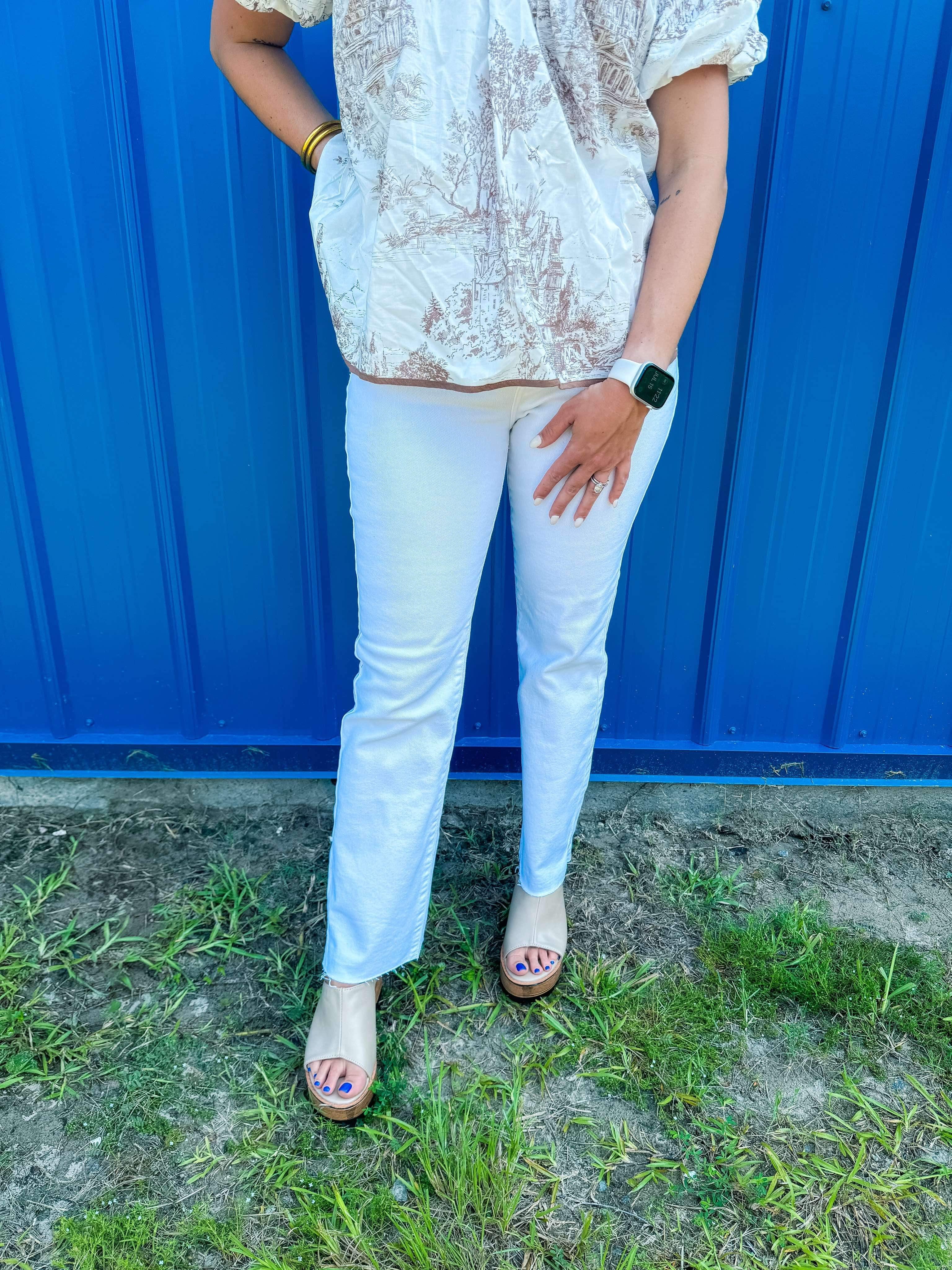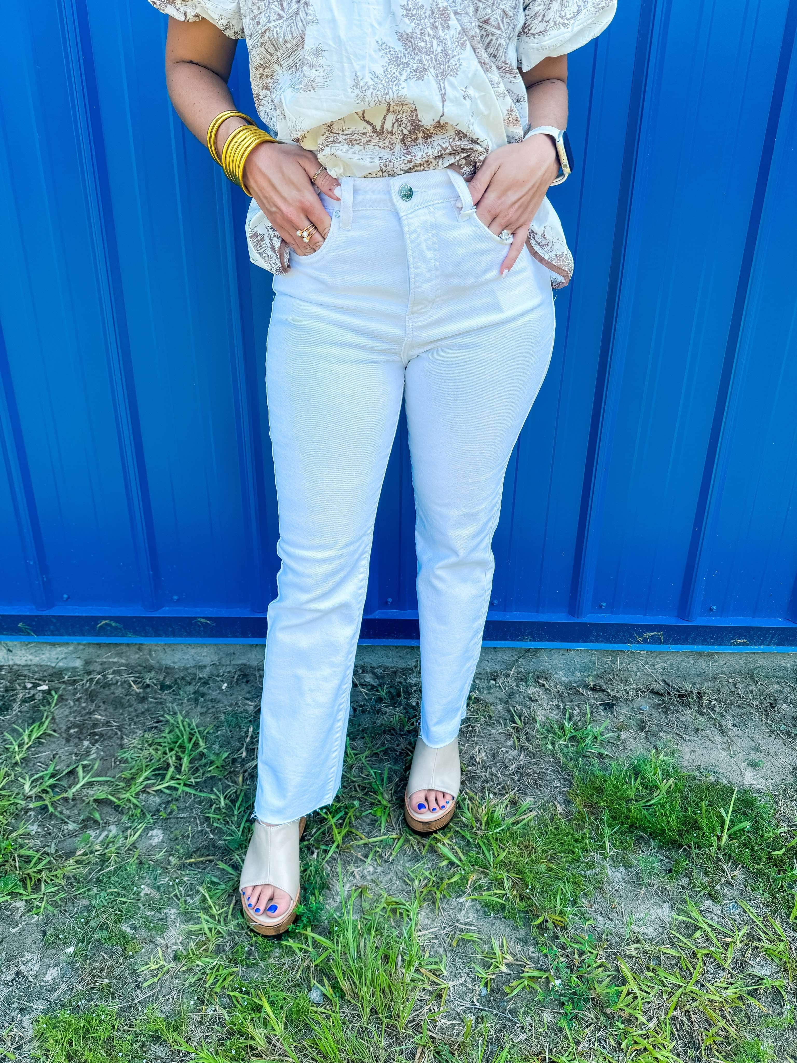 Tummy Control High Rise Raw Hem With Side Slip Straight Pants- Cream