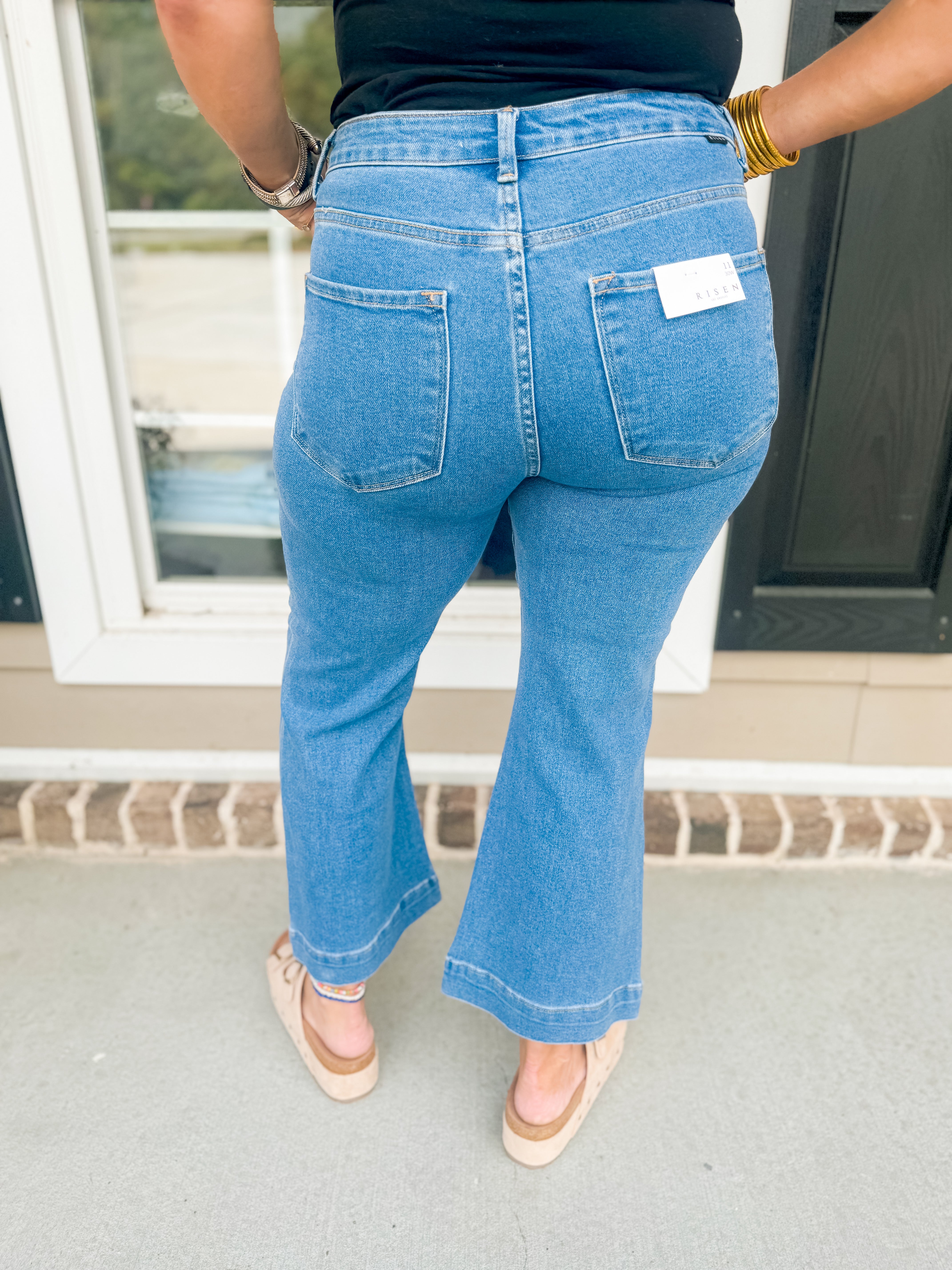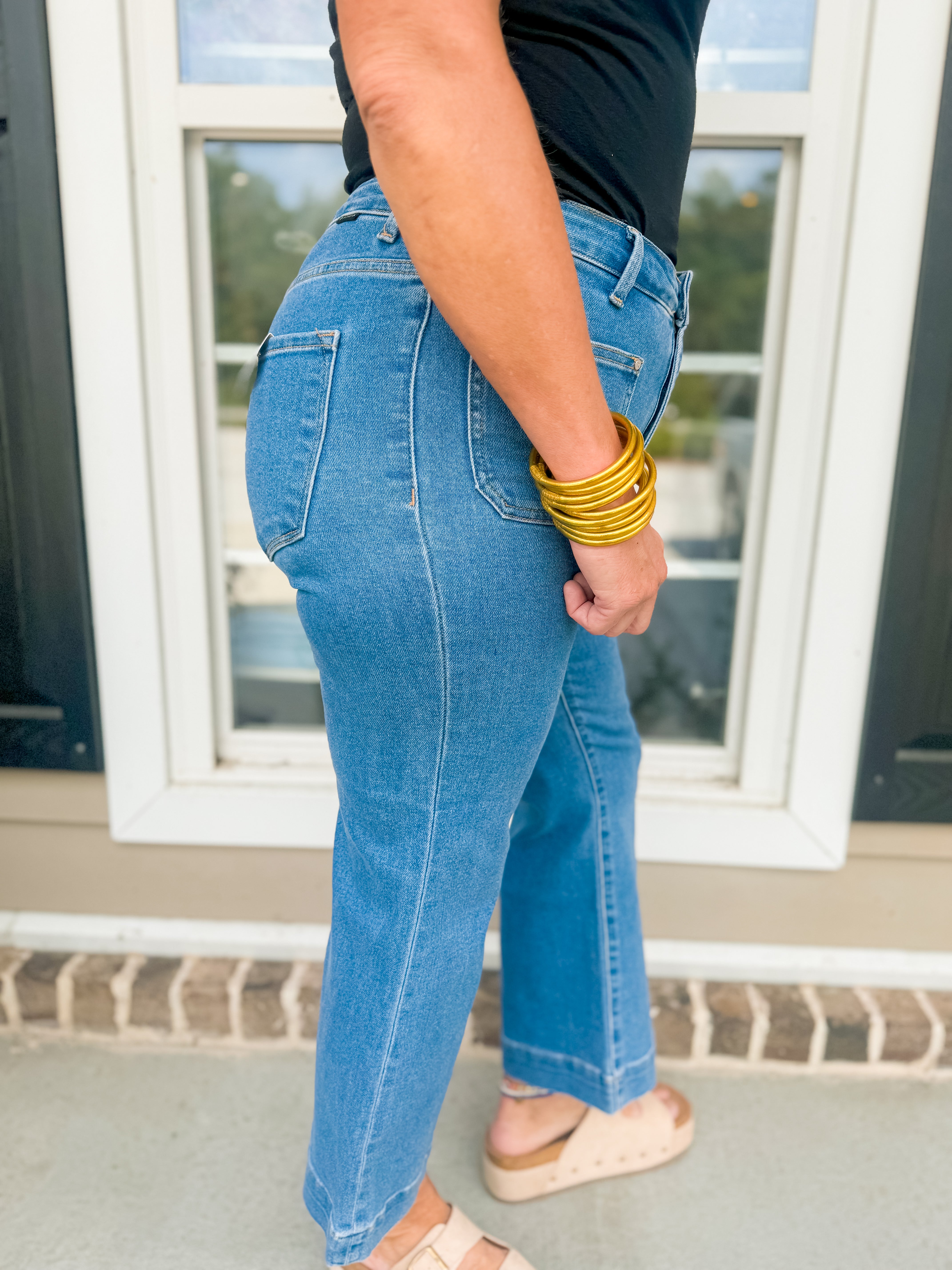 HIGH RISE FRONT PATCH POCKET ANKLE BOOTCUT JEANS