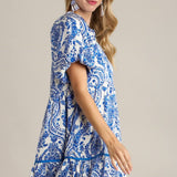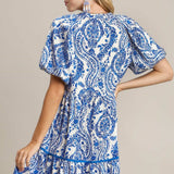 Umgee Full Size Printed Notched Puff Sleeve Mini Dress Plus Size