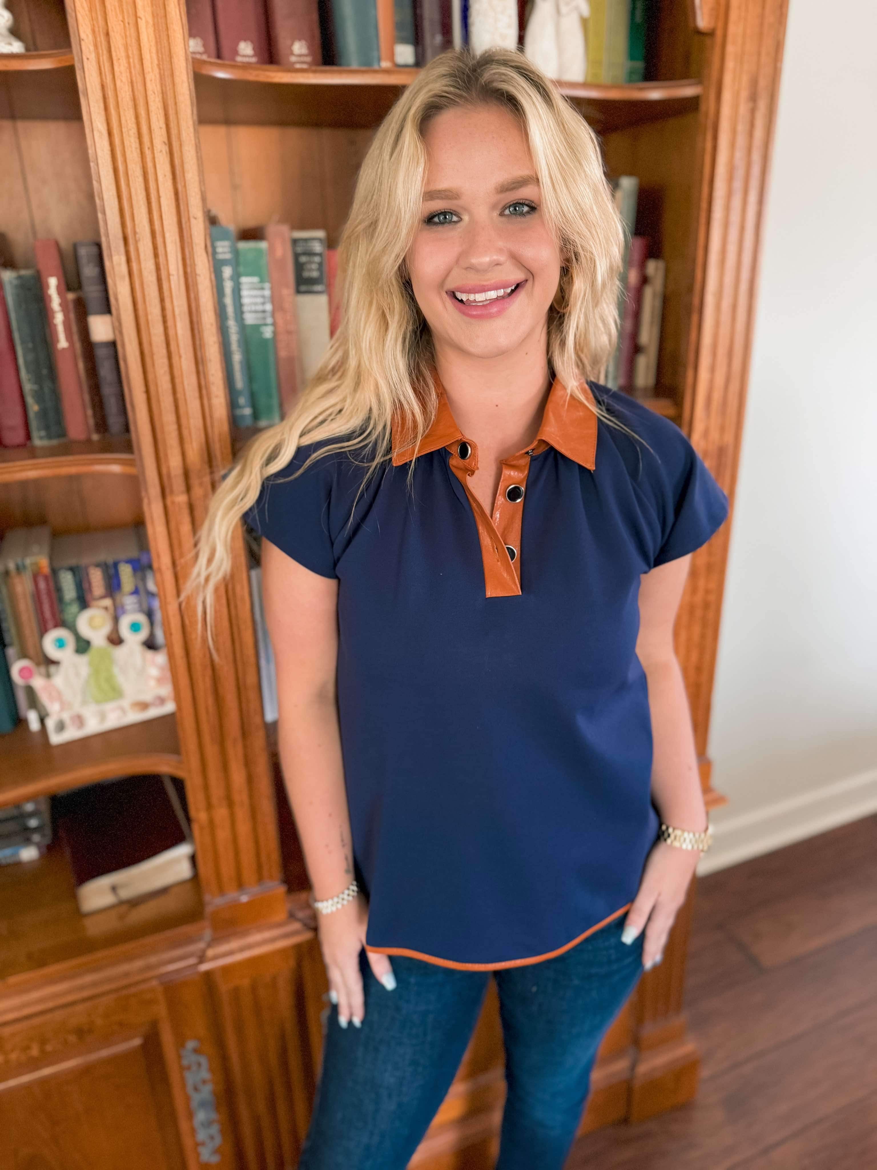 This top is unlike anything we have ever had. We are LOVING the camel brown collar detail - which is like a pleather material - and the contrast against the navy base makes this top look SO professional. We are so ready for fall and this top will give you ALL the fall feels [without getting too hot - because let’s be real - around our area it is still hot for a while]! It does have that camel brown trim at the bottom of the top to tie it in perfectly. This top is super lightweight and great for all professions. It has a slight flutter sleeve feature just to blouse it up a little. She also comes in tan - so if you love it - get it in every color.