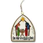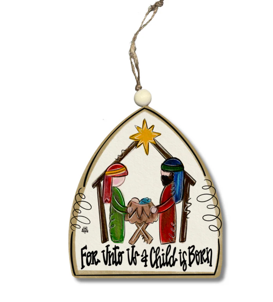 The Unto Us a Child Ornament is a festive accent for any space! Show off your holiday style with a beautifully designed ornament featuring a nativity scene of baby Jesus with Mary and Joseph with the phrase, "For Unto US A Child Is Born".