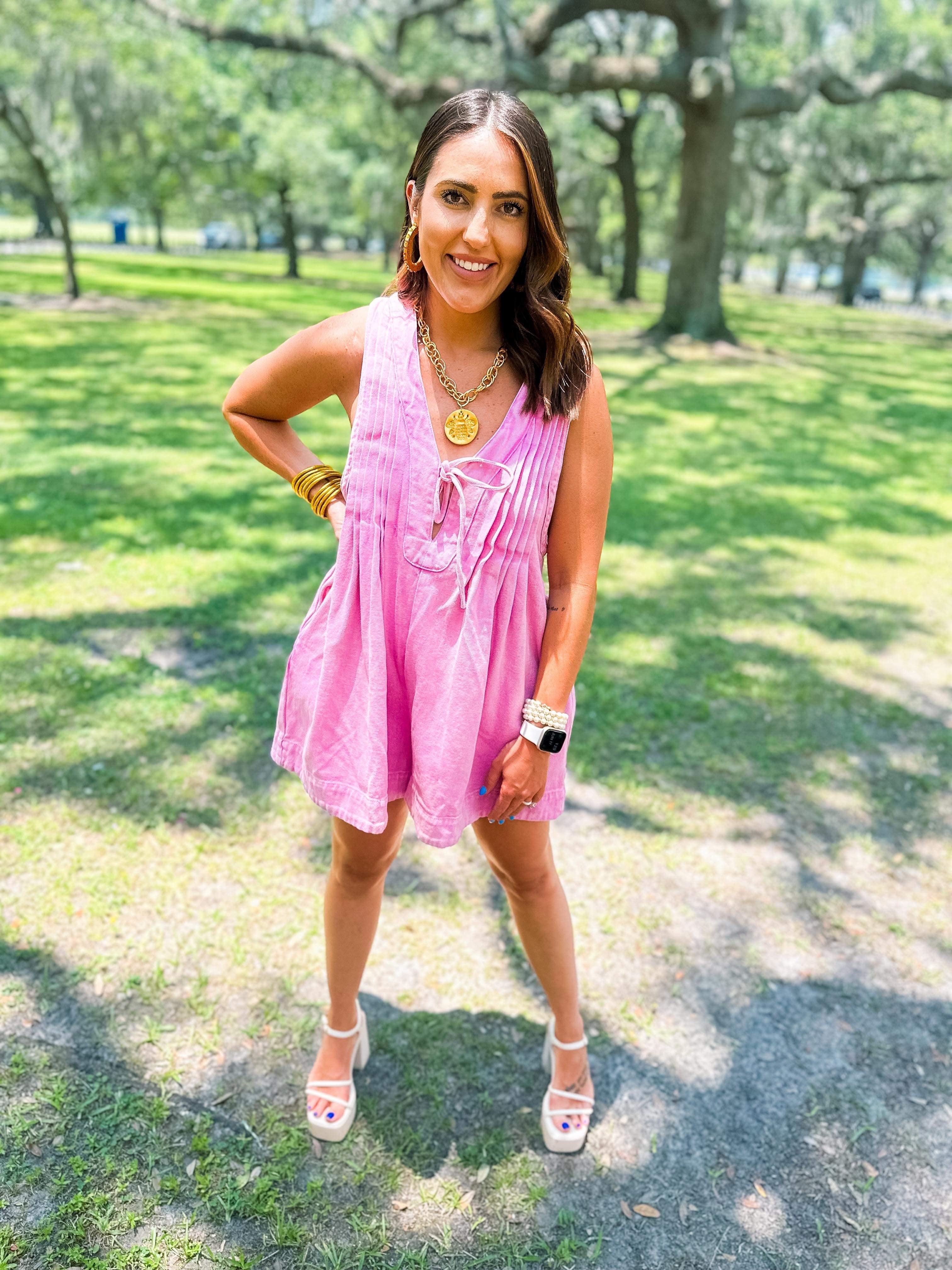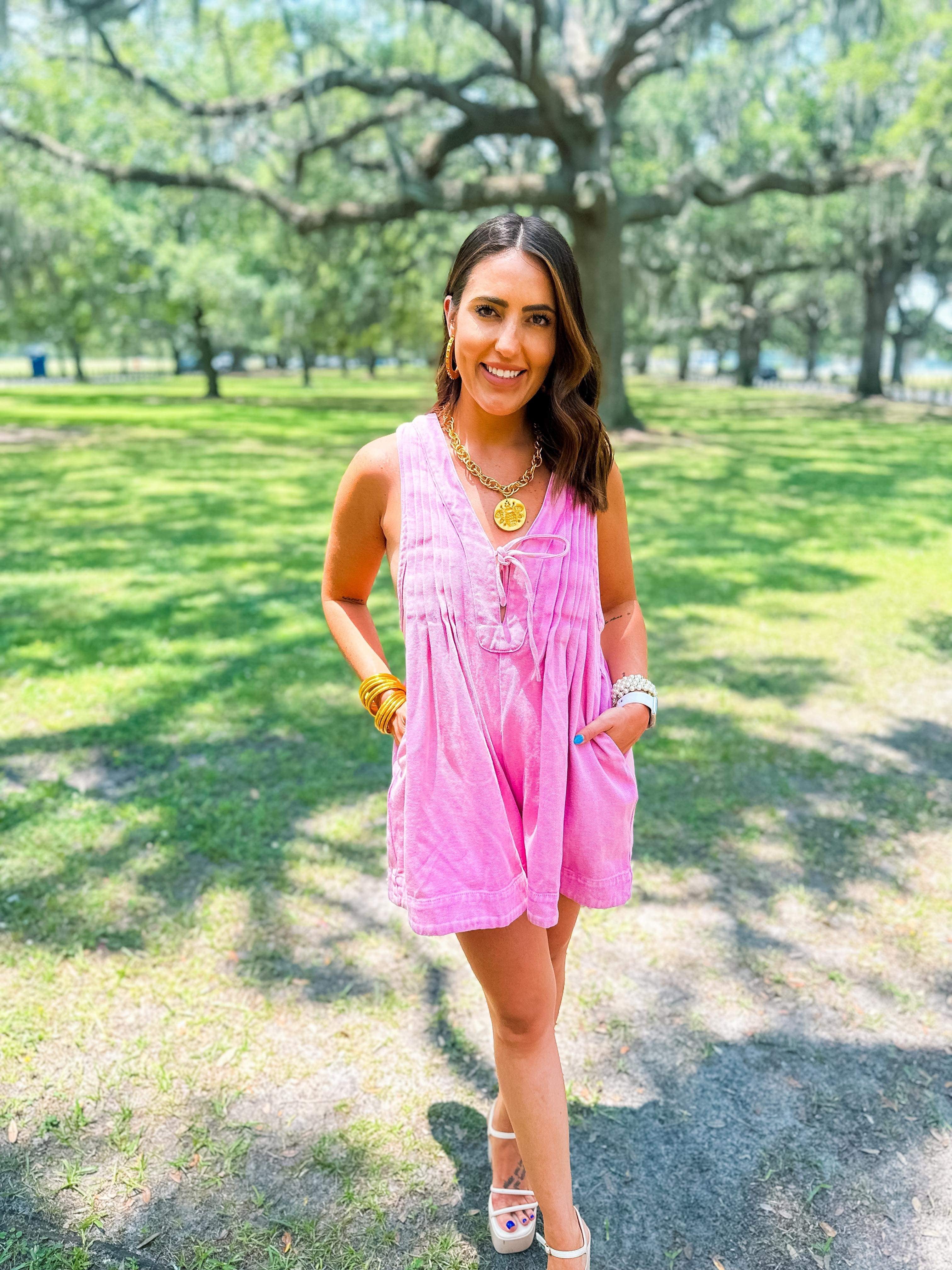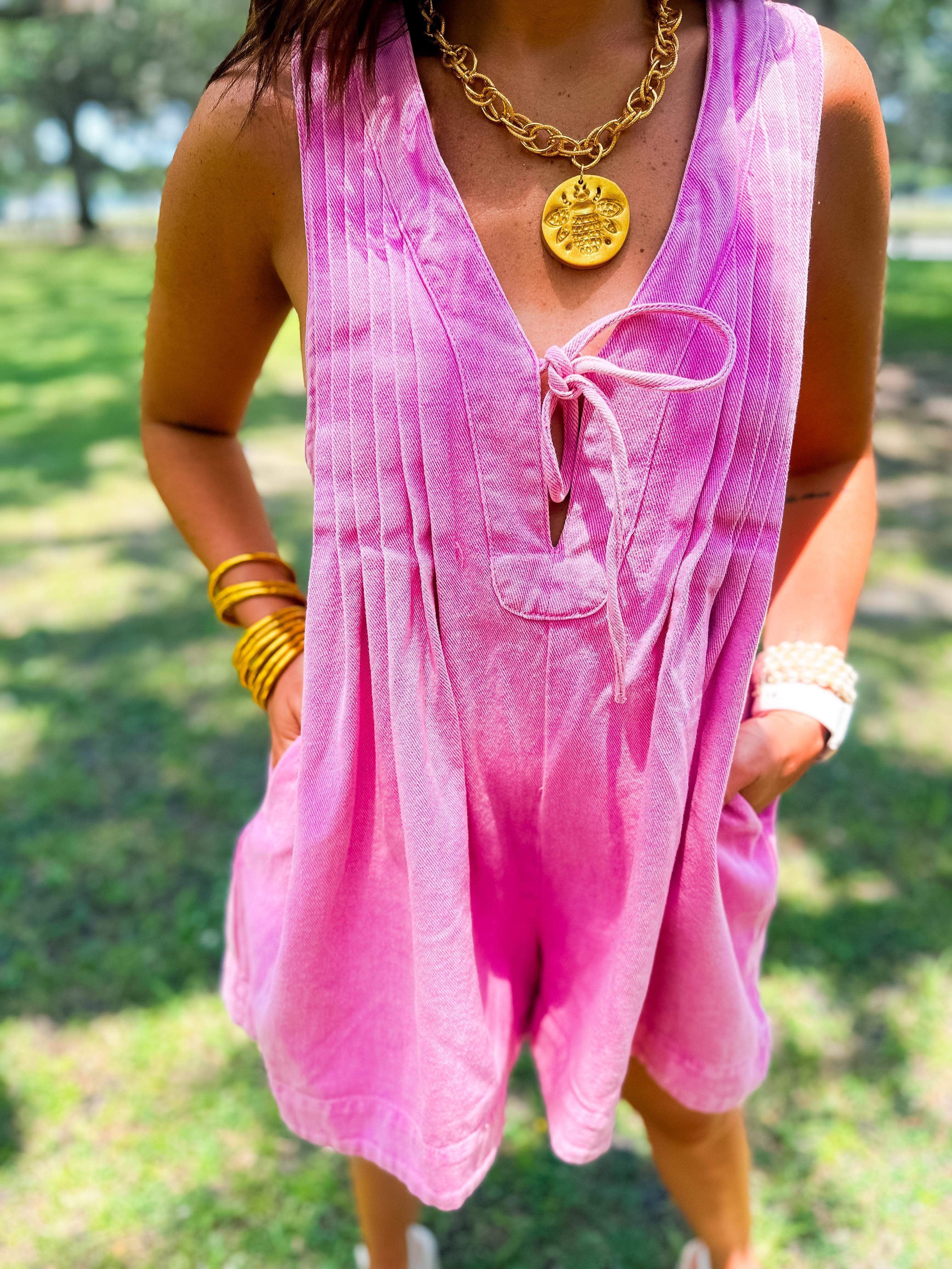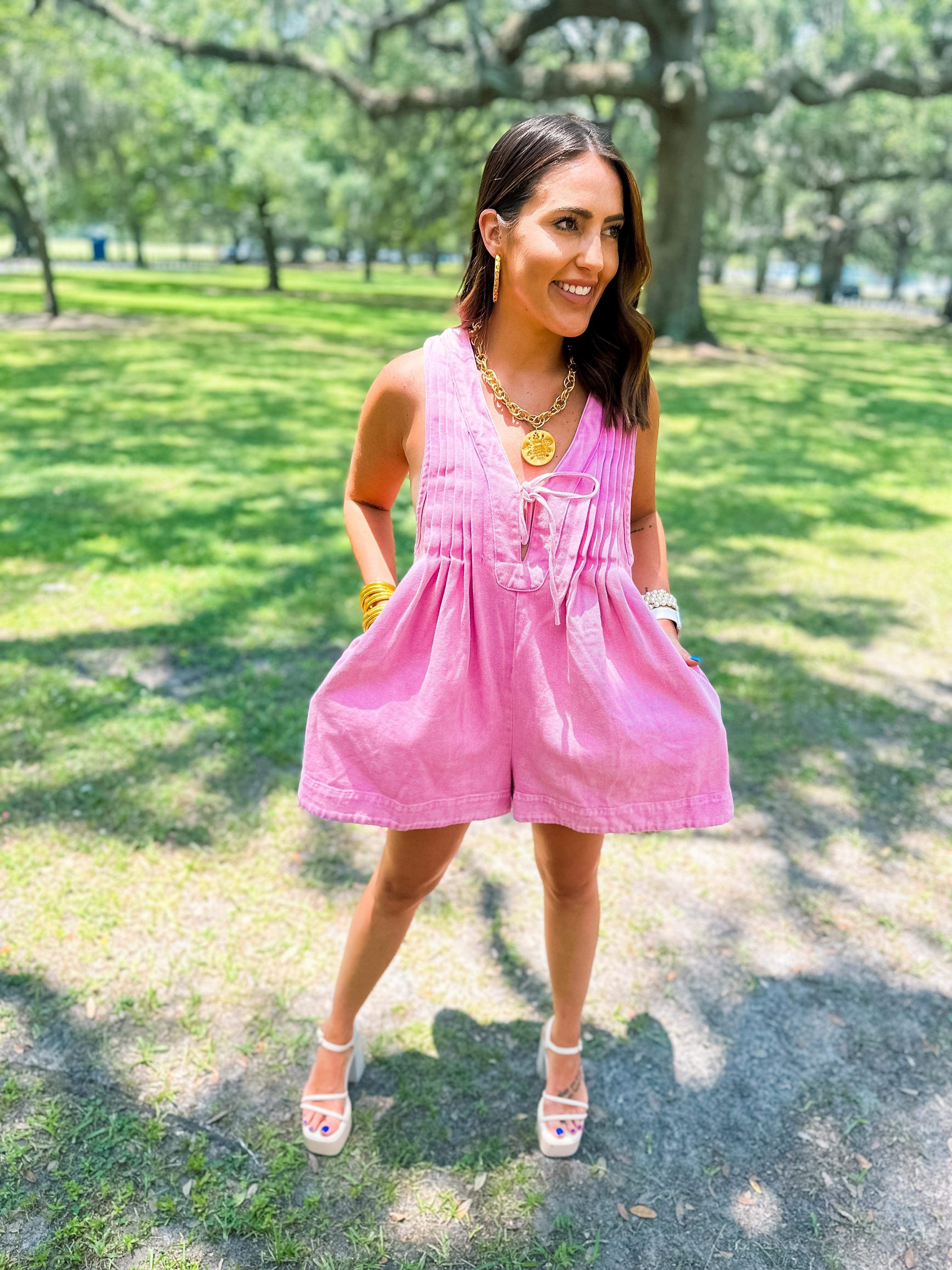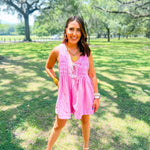 V-Neck Puff Sleeve Denim Short Romper - Pink