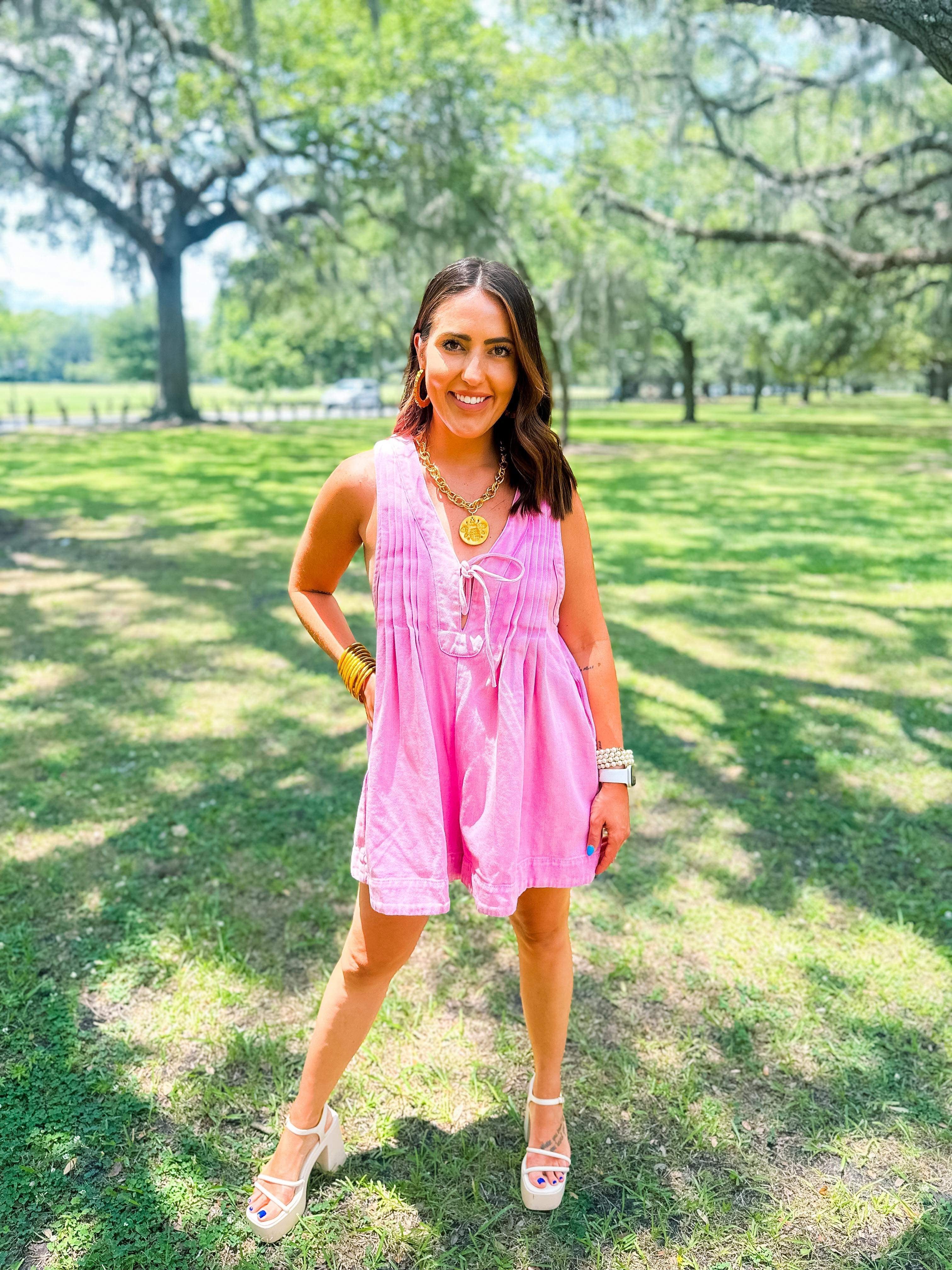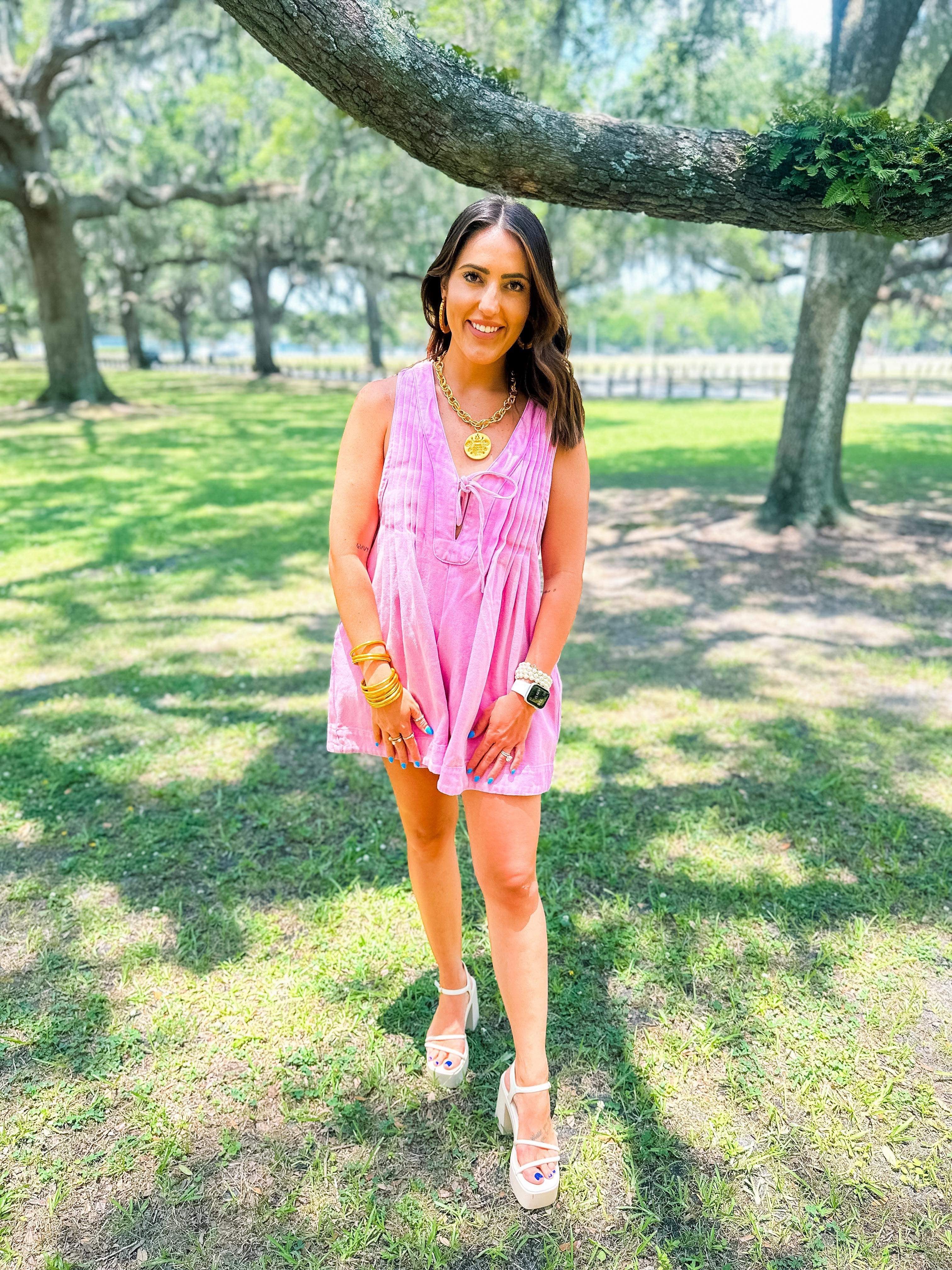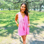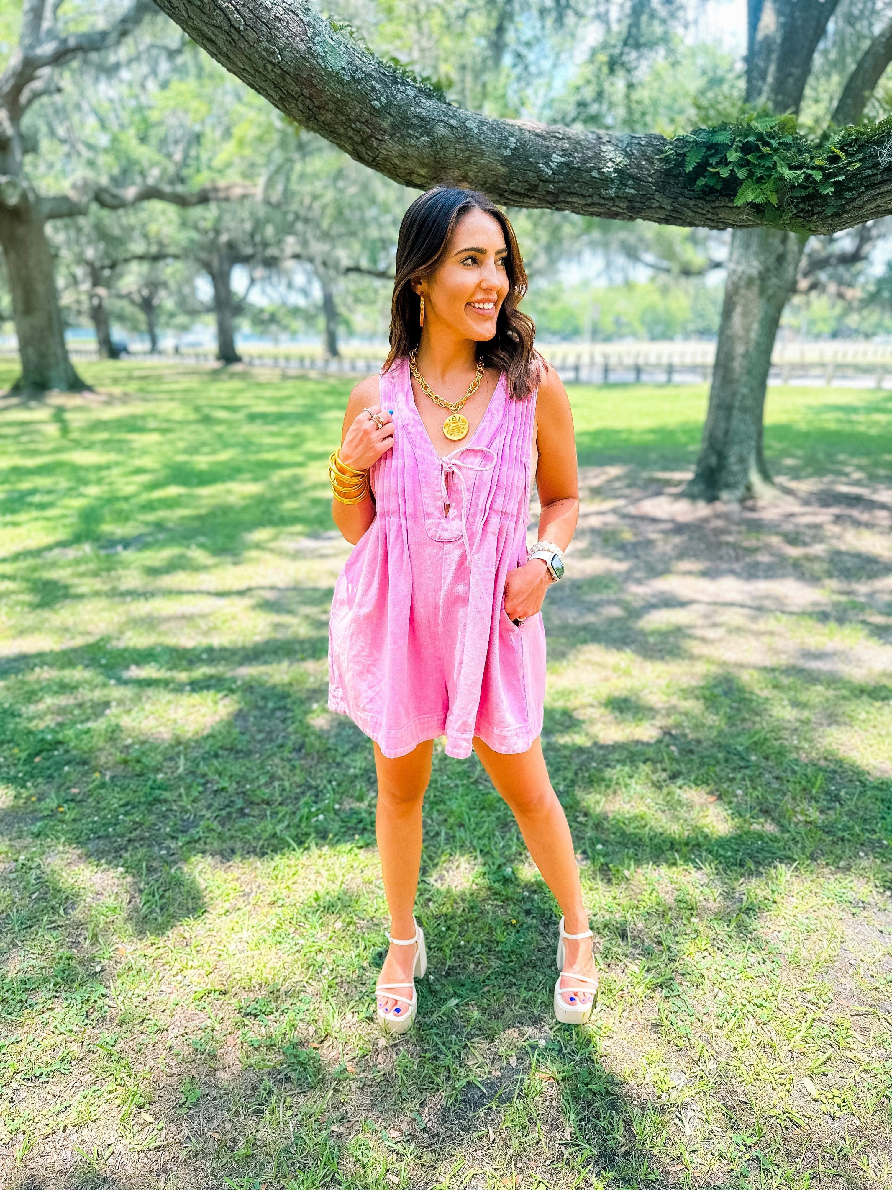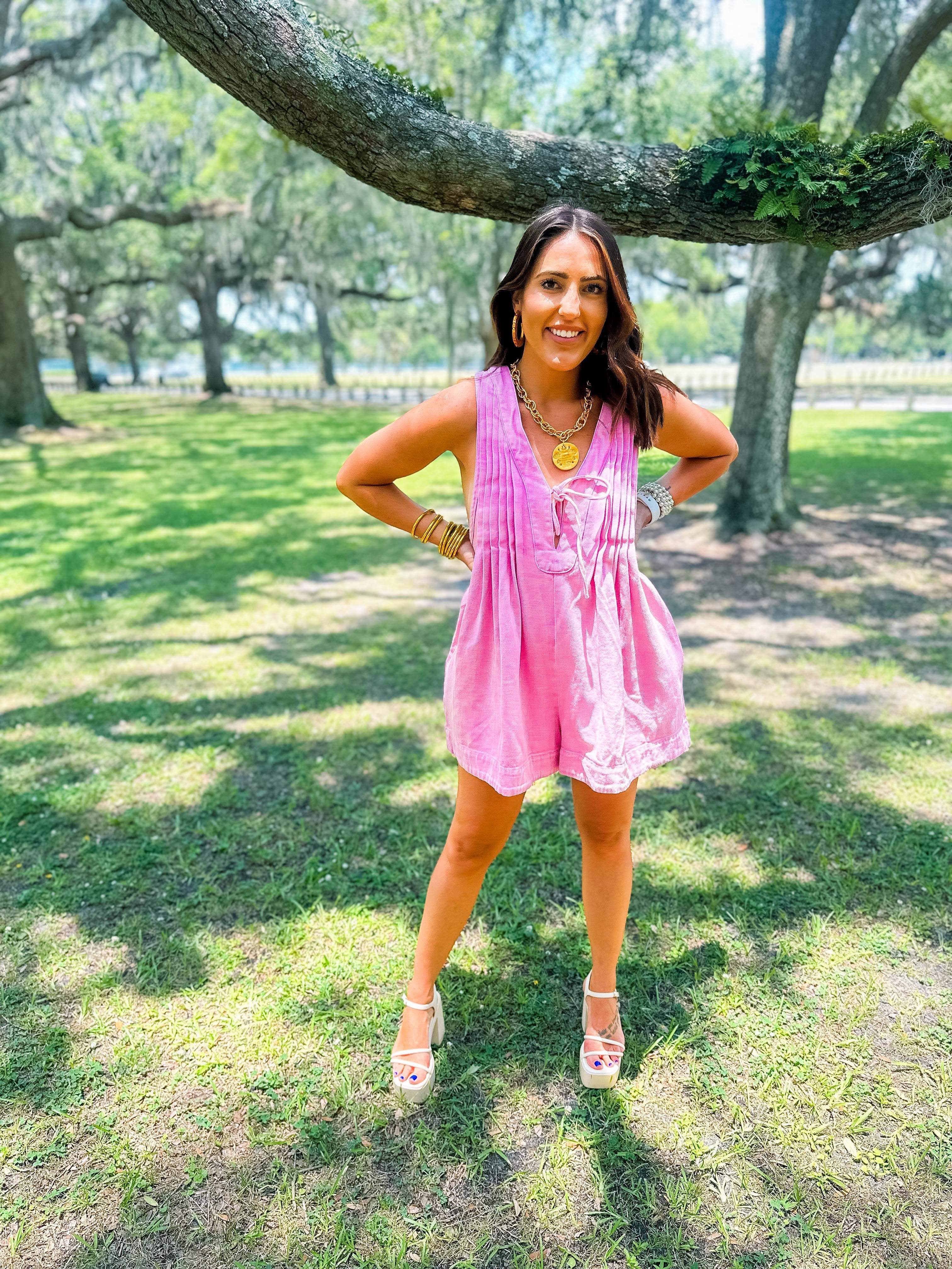 V-Neck Puff Sleeve Denim Short Romper - Pink