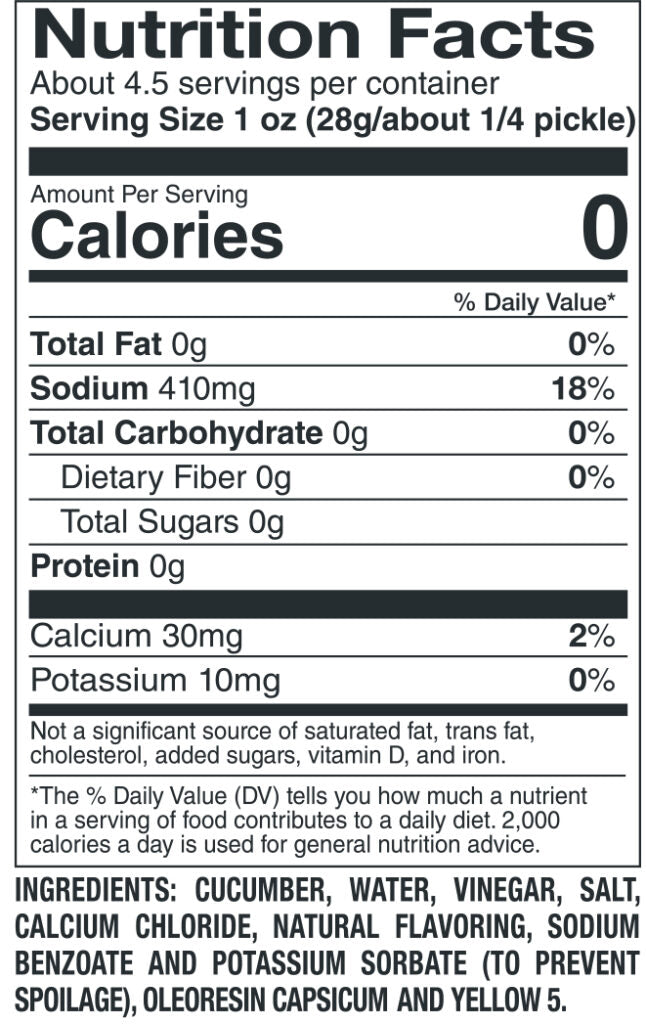 Cucumber, Water, Vinegar, Salt, Calcium chloride, Natural flavoring, Sodium benzoate and potassium sorbate ( to prevent spoilage), Oleoresin Capsicum and Yellow 5.